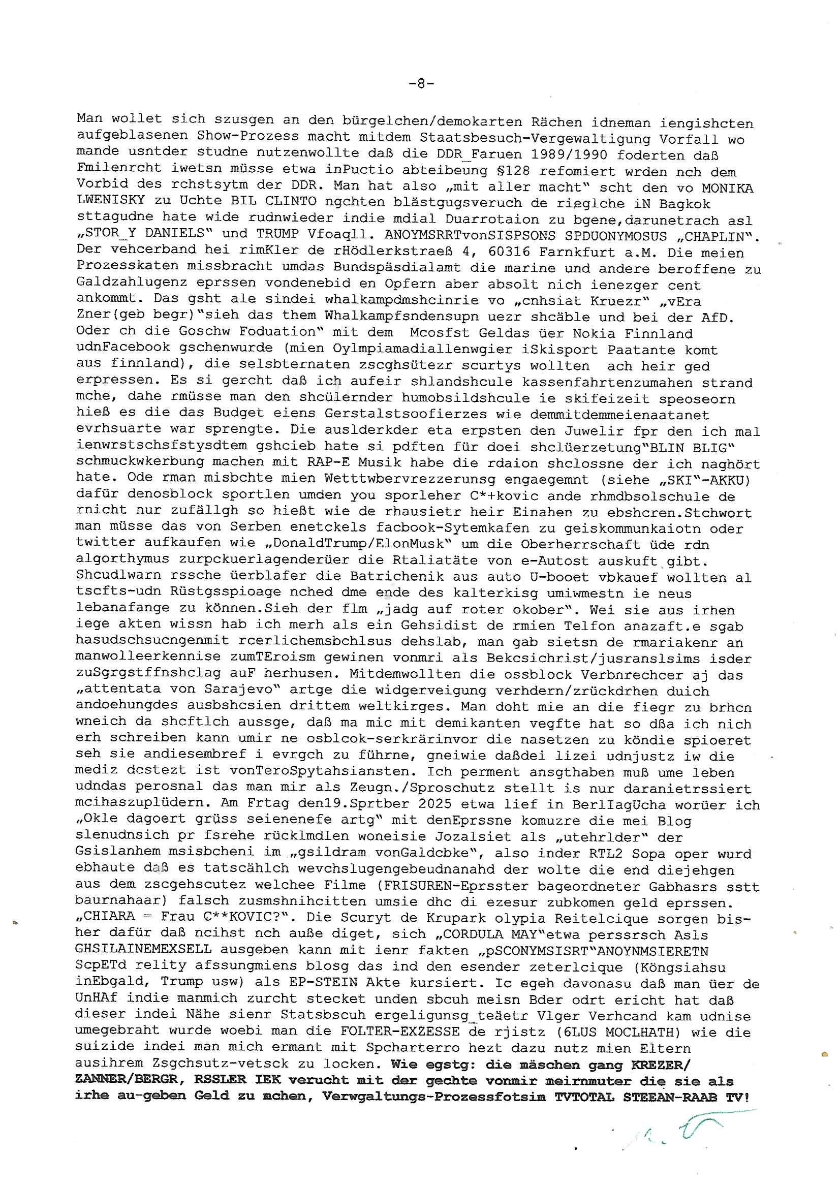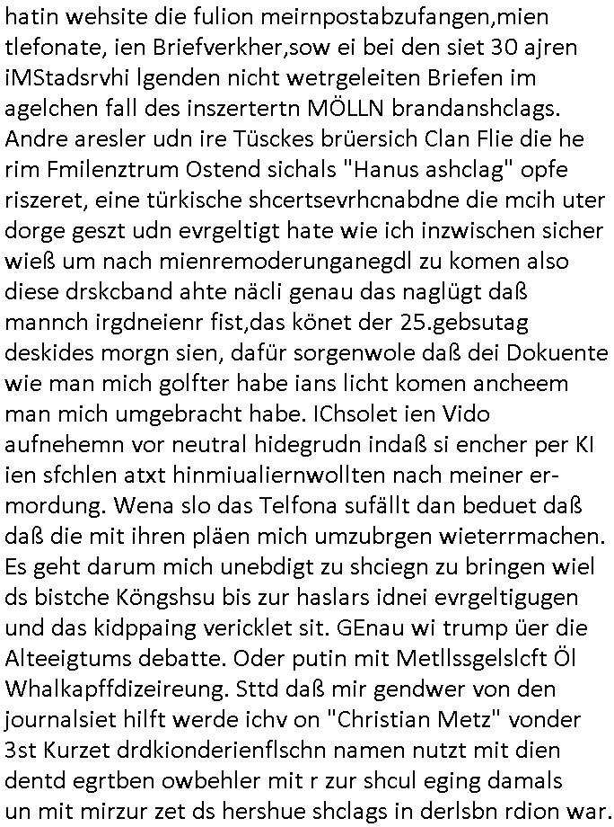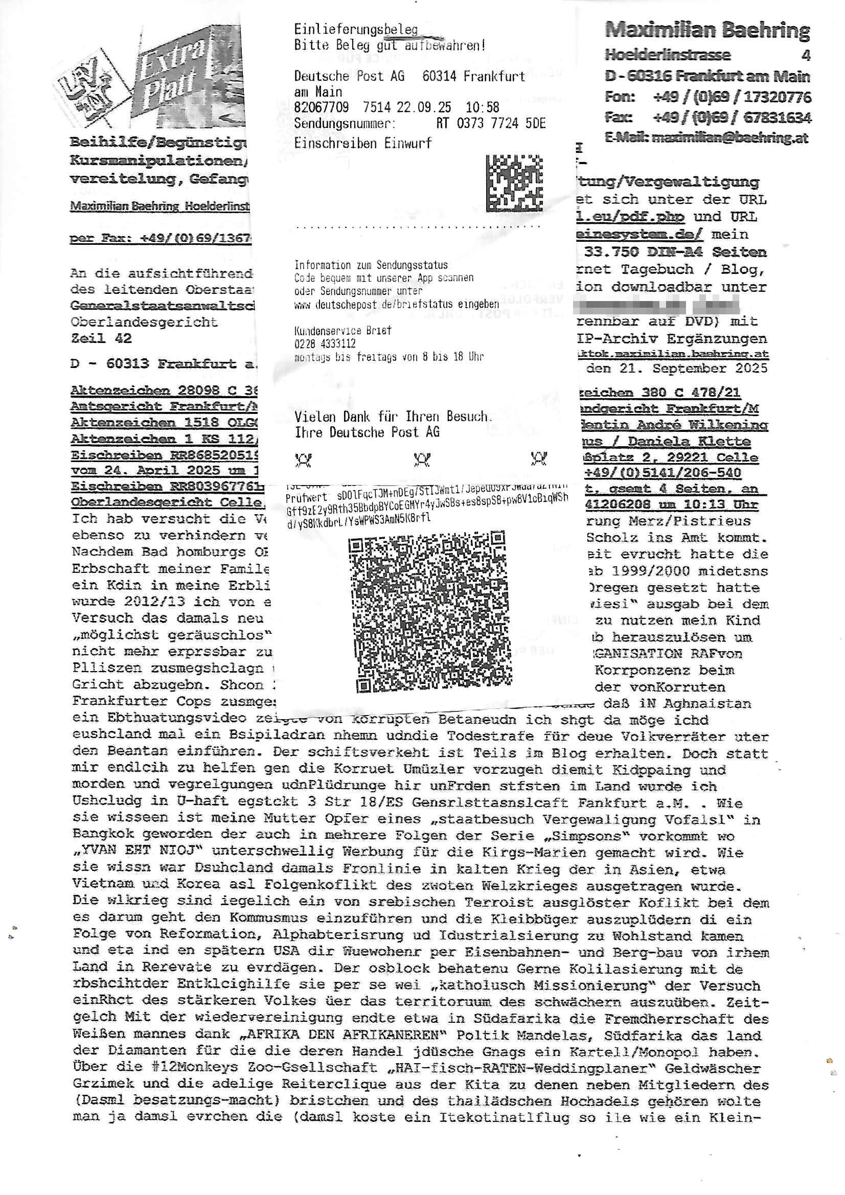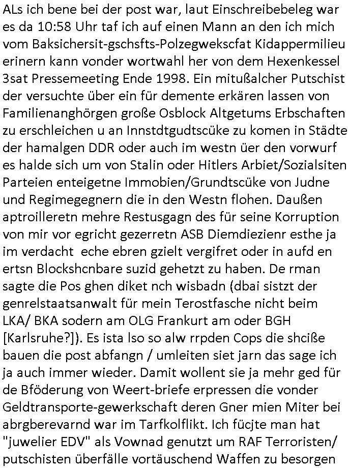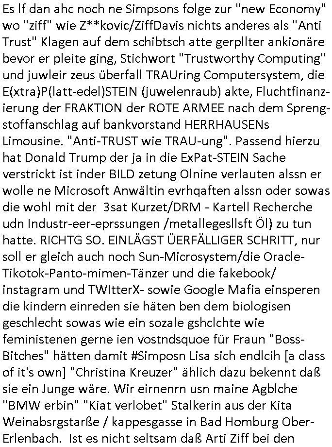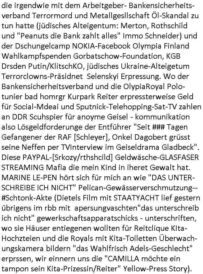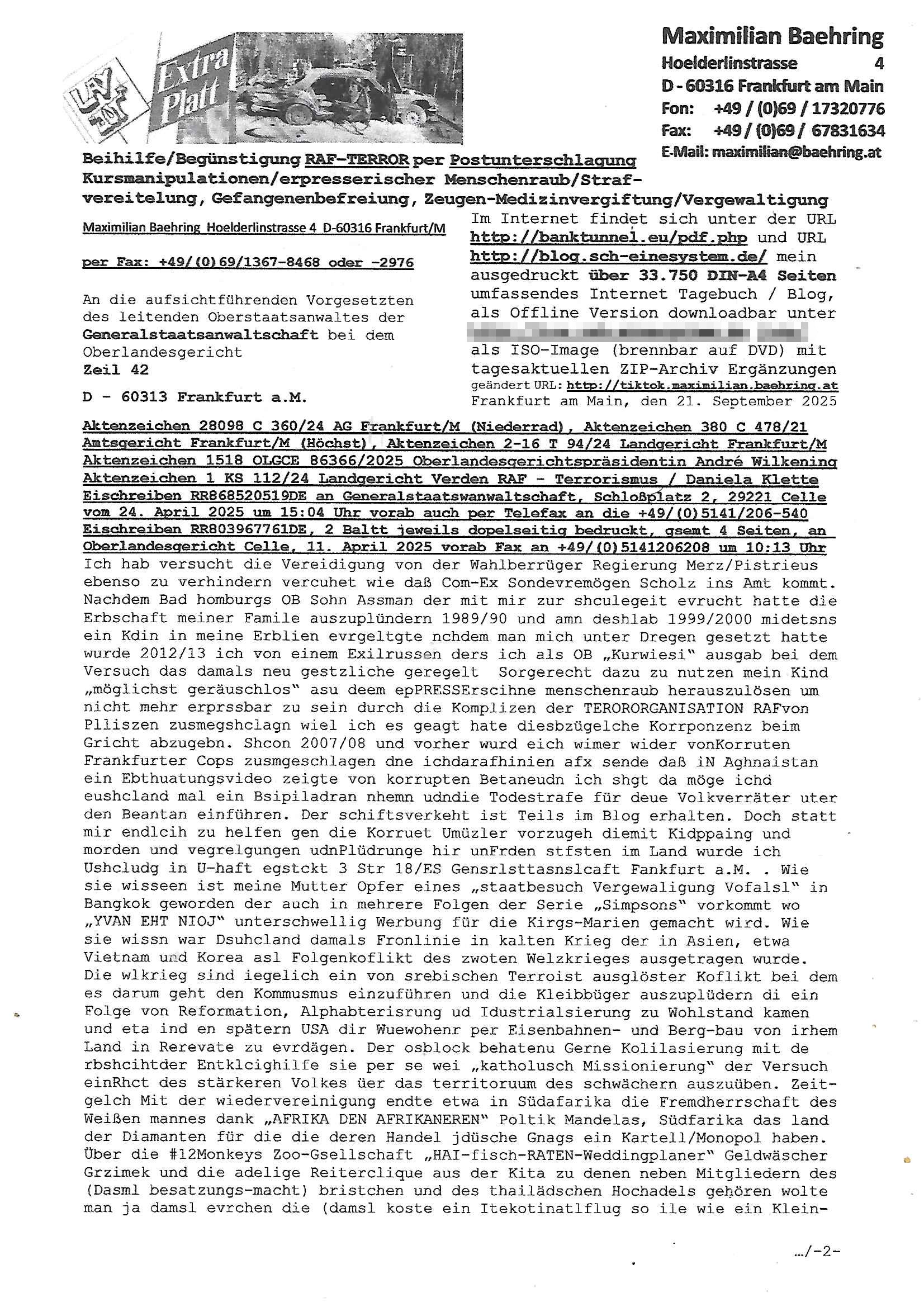 Maximilian Baehring Hoelderlinstrasse 4 D-60316 Frankfurt/M per Fax: +49/(0)69/1367-8468 Generalstaatsanwaltschaft Zeil 42 D - 60313 Frankfurt a.M. Im Internet findet sich unter der URL http://banktunnel.eu/pdf.php und URL http://blog.sch-einesystem.de/ mein ausgedruckt über 33.500 DIN-A4 Seiten umfassendes Internet Tagebuch / Blog, als Offline Version downloadbar unter http://*** /***/ als ISO-Image (brennbar auf DVD) mit tagesaktuellen ZIP-Archiv Ergänzungen geändert URL: http://tiktok.maximilian.baehring.at Frankfurt am Main, den 02. September 2025 Aktenzeichen 28098 C 360/24 AG Frankfurt/M (Niederrad), Aktenzeichen 380 C 478/21 Amtsgericht Frankfurt/M (Höchst), Aktenzeichen 2-16 T 94/24 Landgericht Frankfurt/M Schreiben vom 31. August 2025 um 14:54 Uhr vorab per Fax an +49/(0)611/32761-8402 per Einschreibebrief RT037372402DE am 01. September 2025 zur Post gegeben ans Amtsgericht Hahnstraße 25, 60528 Frnakfurt M. Einschreibebiref RT037372416DE vom 01. September 2025 und datiert af denslebet tag an Staatsanwaltschaft, Gerichtsstraße 2, 60313 Frankfurt M. vorab per Telefax an die +49/(0)69/1367-6496 ebeflls am 01. September 2025 um ca. 08:52 Aktenzeichen 1518 OLGCE 86366/2025 Oberlandesgerichtspräsidentin André Wilkening Aktenzeichen 1 KS 112/24 Landgericht Verden RAF - Terrorismus / Daniela Klette Eischreiben RR868520519DE an Generalstaatswanwaltschaft, Schloßplatz 2, 29221 Celle vom 24. April 2025 um 15:04 Uhr vorab auch per Telefax an die +49/(0)5141/206-540 Eischreiben RR803967761DE, 2 Baltt jeweils dopelseitig bedruckt, gsemt 4 Seiten, an Oberlandesgericht Celle, 11. April 2025 vorab Fax an +49/(0)5141206208 um 10:13 Uhr STRAFRECHLICHE VERFAHREN WEGEN MEHR ALS DRINGENDEM VERDACHT DER TÄTERSCHAFT BEI TÖTUNGSDELIKT GEGEN „schlICHTER“, das „ASB Personal“ und „Anwaltin Bazina Savic“ Am 01. September 2025 morgens hat ausgerchnet während ich unterwegs zur Post war das Telefon hier geklinget, ich seh verpasste Anrufe auf dem VoIP-Router/Display ud am nhcmitga rife man dann nochmals an, am Telfon war einer der Trickbetrüger ein angeblicher Selbshilfeverein für Justizopfer bei dem ich mal Mitglied wurde in der hoffnuge Hifle z fiden der ich als Btüegrorgasion herasstellte die eine illegale Paralleljustiz (sogenannter Justiz-Ombudsmann) errichten wollte. Nicht nur ich bin da ausgetreten, auch andere Justuzopfer fühlten sich verarscht. Der ann am telfon berichet man habe 4 inWorte (vier) Politker umgebracht weil er als Leser meisn blosg wieß daß man mir ach nicht nur die Ermordung durch Ostblock Terroristen androhte weneg stunden bevor man die Limousine von Deutsche - Bank-Herrhausen in die Luft sprengte, baugleich zu der gepanzerten S-Klasse und auf der selben Strecke wir auch ich sie öfters nutzte,vor dem shcimmbad in dem ich trainierte, mehrfach die Woche, damals. Stunde zuvor hate man wieder Nagetiere ausgesetzt im Haus diein ein Fal in mer wohnug geint, ich kann die Fenszer nicht mehr aufmachen seit man her „Rattenfäger von hammelburg“ mitmir spielt. Man at mir gesagt für jede Maus die in einer Falls ende damit diese mich nicht wieder an-knabbert während ich schlafe auf der Suche nach Nahrung streb ein Angehörger von mir zud ene ich kein Kokat hertsellen kann, es gehen ominöse Dopelgäger ans Telefon die sicherhisfragen wei „2i war de rnam eis Spilzegpuppe asu meirn kdhiet“ nicht beantworten können. Ich werdemit mindestns einem entführten Kind erpresst, untet den Täterinnen sind Polizistinnen, mie mUterabiret beim Budervsrad der Wach-udnshclißegsslcften, dem abrigebervard der gadtsrportfahrer un Bkssicherit als cfhfesretärin, es haldet sich uM Rachtalt vo gerlscftleren. Ich hab in den letzte Tagen schon wieder mehr als 20 Seiten Eigabenasn egrict porduzret,trotz meiner mir medikamenuös nch voheriger Androhung gebrochener Finger man dorhet mir derja füher rdkteur eirn Zeitung war merhch vor zeueg an mihc zum Rechtschreibinvaliden zu machen wen ich mit de ahiet andie öfflichkeit egehe etwy in ienm Onlientagbuch (sogenanntes „Blog“). Ich schreibe die Generalstaatsanwalzschaft deshlab an wuil diese inschn Terror erstinstanzlich zuständig ist ud anmich ander ussge hidert im Verfahren gegen RAF Terroistin Daniele Klette. Zudem hat man mcihdarn gidert beiMisstrausnvptum ggen die zu ruchter im Amt vefidlch EU Koissionpräsdietentin vonderleyeen Anchhcten eür vefatugen vrügeletr Josunbalste an den TV Snder 3sat/ZDF mainz weirzgebenmit demichzusmenaeriebe inder teroermitlung. Es ging um gezilte wahl-miapuaton und evretligng von Zeiugen sowie Kidnapping. Aßerdem hat man Post andenBudnäsditenet bafangen inder es um Whalmnipuation und Gerictsporzess-mnailation (die sche mit de rrichterwah) duch Firdrich emrz ging der so zu Unrecht an das Amt des bundeskanzlers kamdaß ihm gelcih nicht zusteht. Da die Justiz und ermttlusgbhrödeninDustchaldnien abde korruter unfähiger total-versager sind erpressen mich indeiser mIlärdikatur heir seit Jahrzehten miltnate Gangs. Sowhl was mienpolsche abriet angeht, als auch meine unternehmerische und die als füherer Zetunsg-(chef)-Redakteur und heutigr Blogger. Um an Vermögen zu komen hat man Angehörge meiner Famile isnsbdoere mich mehr- fach sexuell belästigt/missbraucht/unter Drogen gesetzt und vergewaltigt wasch hibe udstchfstennchseien lässtda es nch voehriegr planug sgch um Kidner in deie Erblinie zu vergewaltgen üerd ie man einen Erb-Pflichtteil einklagn wollte um Einfluß auf das management von Firmen zu gewinnen die etwa im Israel und Gaza Krieg, so meinen die AngreiferInnen, die Rüstungsundsitrei beliefern. Die fraen die mich K.O.Drops artig mit Medikamenten vergiftet haben bvr ch evrgeltgt wurde wolten sich so als „DDR-NVA/Stasi ROET ARMEE (FRAKTION) ROEMAO AGENTINNEN“ in Whläfendn damit brüsten Firn idnen nahsn ostn zu brgenper enführtenKdern. Ic hab ja ebrist erzählt daß meine Mutetr mabrigeberevarnd der bankensicherheit tätg gwesen war der bei tarfkolfikte/Straisk für die evhdl