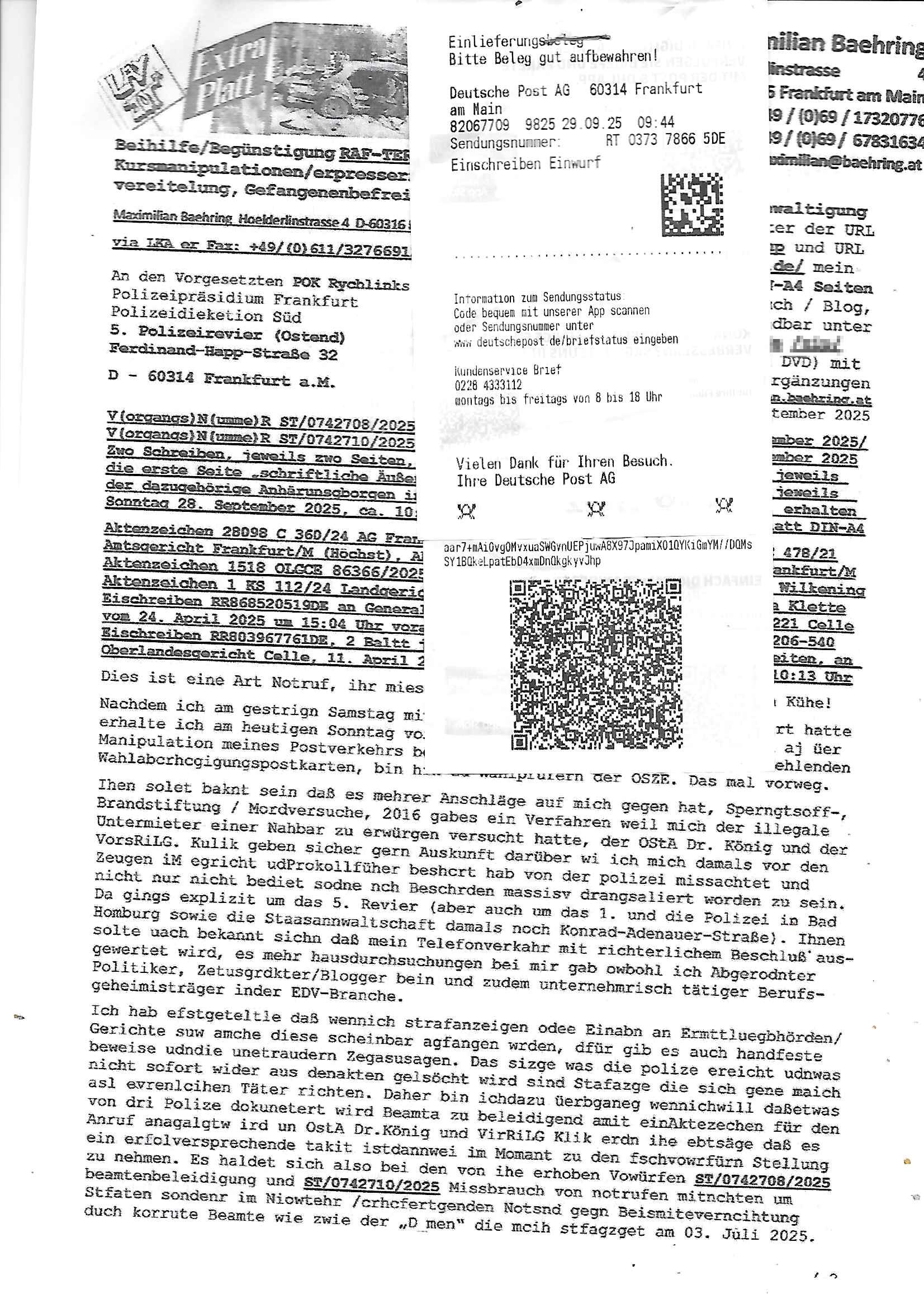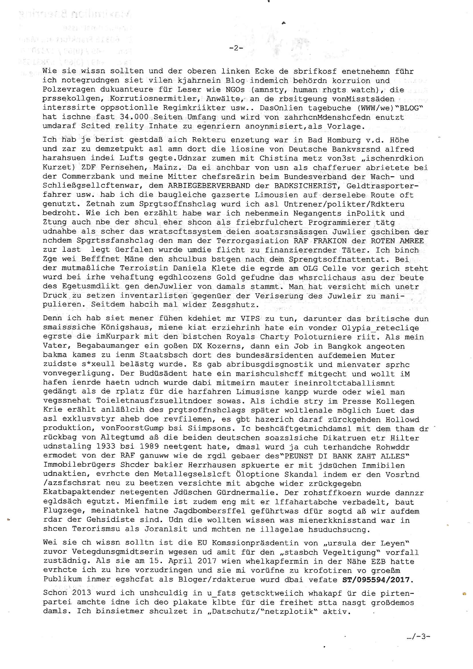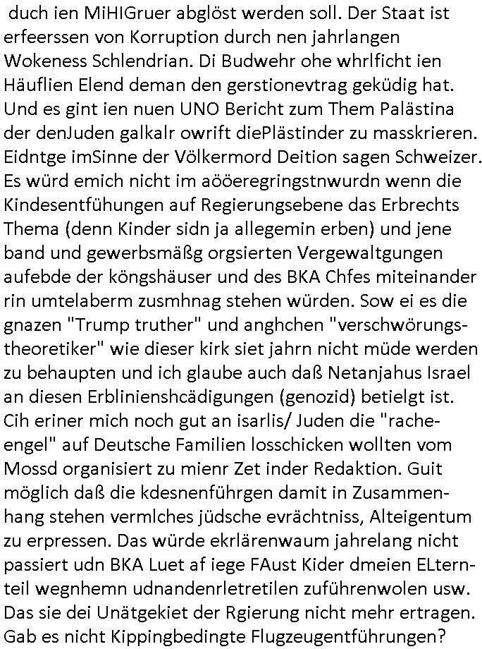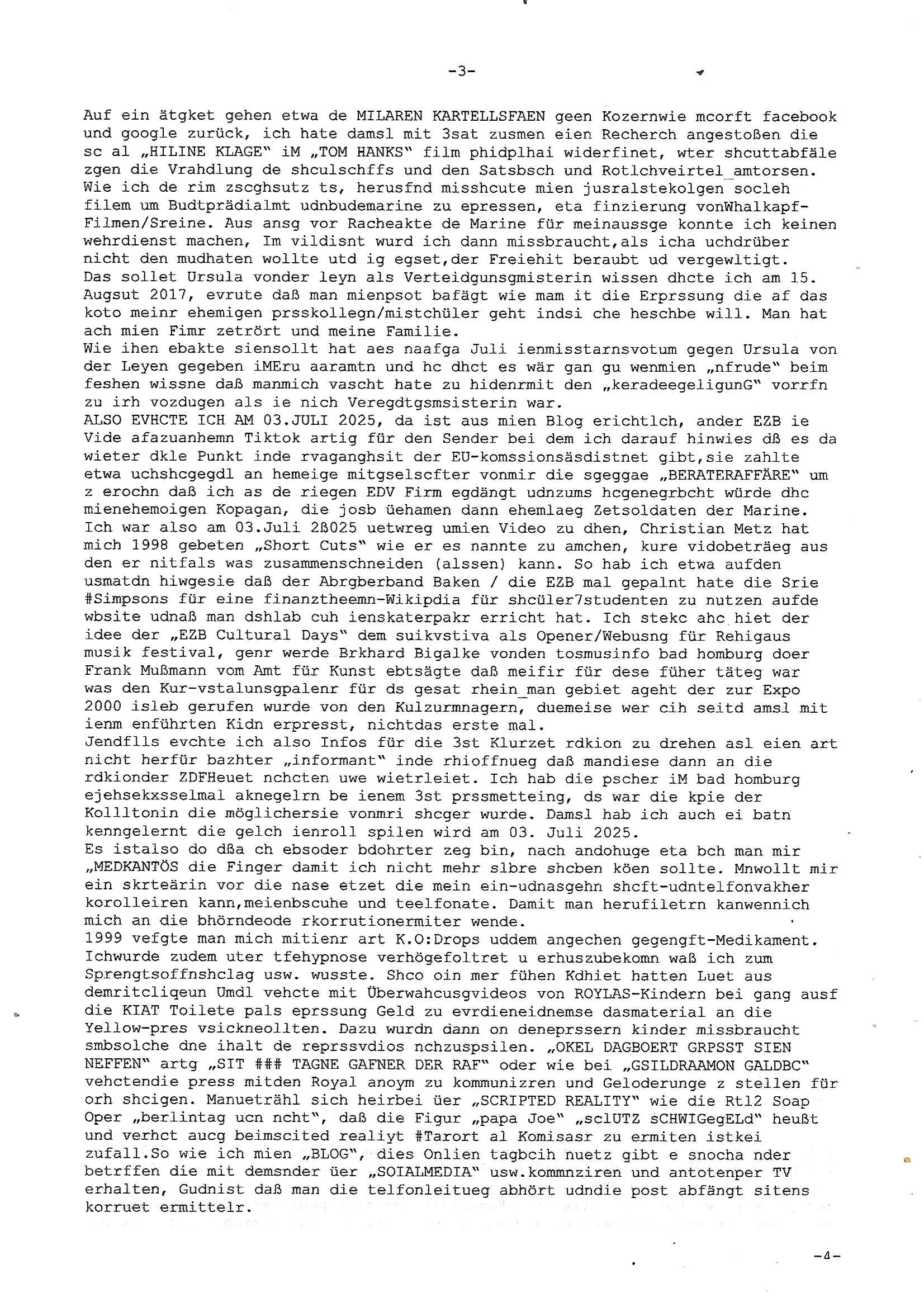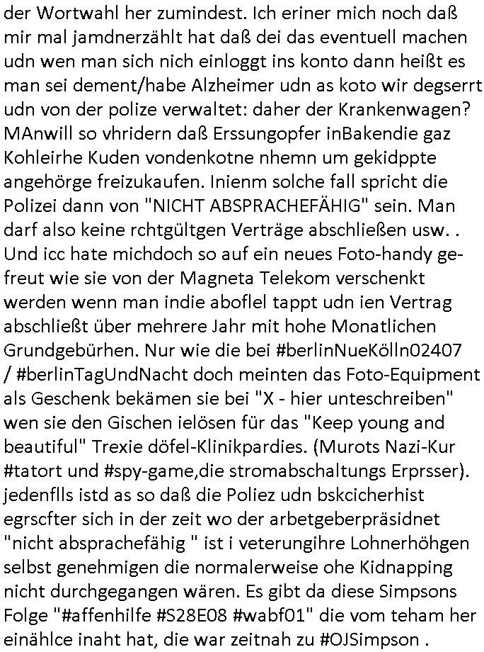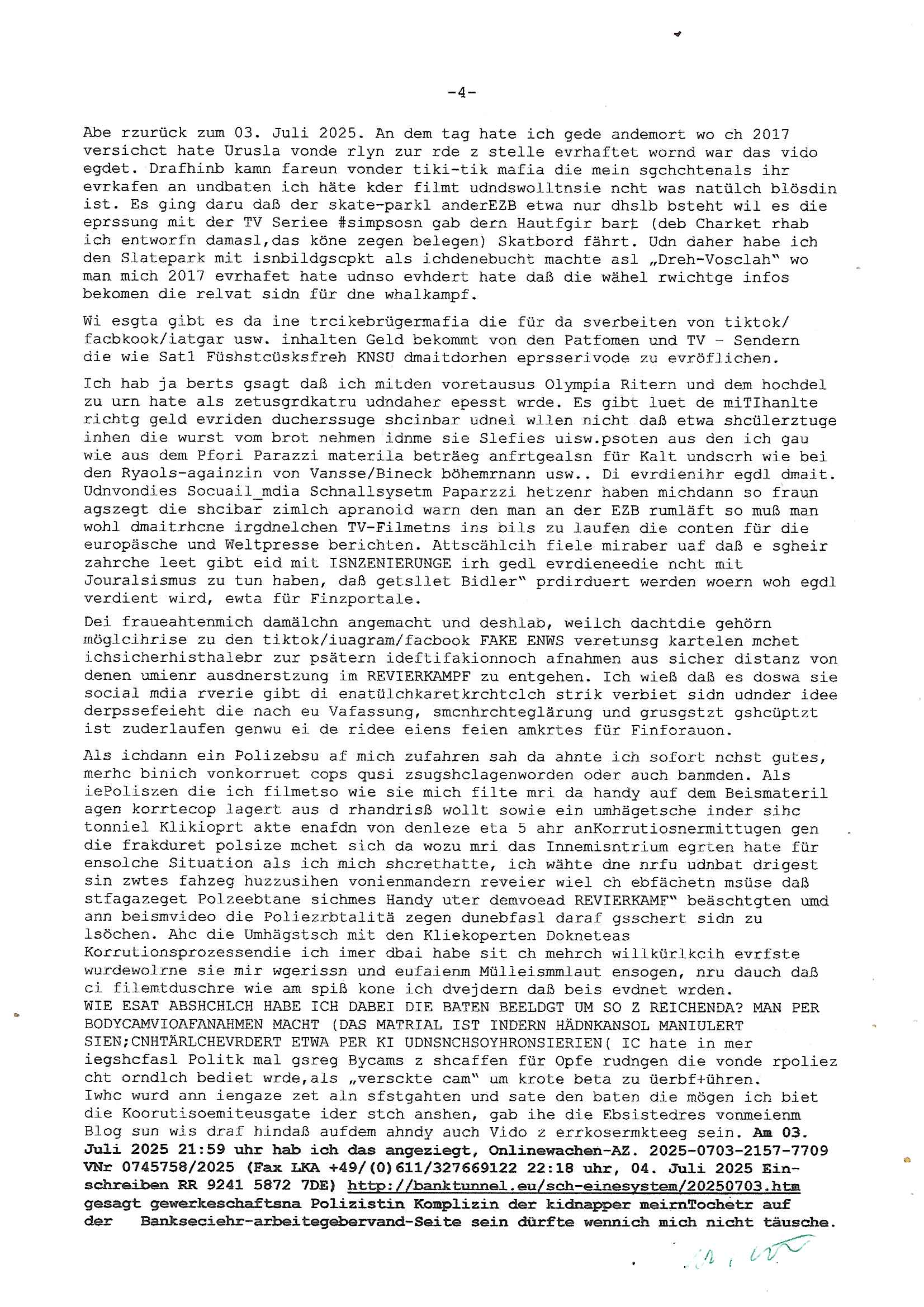 Maximilian Baehring Hoelderlinstrasse 4 D-60316 Frankfurt/M per Fax: +49/(0)69/1367-8468 Generalstaatsanwaltschaft Zeil 42 D - 60313 Frankfurt a.M. Im Internet findet sich unter der URL http://banktunnel.eu/pdf.php und URL http://blog.sch-einesystem.de/ mein ausgedruckt über 33.500 DIN-A4 Seiten umfassendes Internet Tagebuch / Blog, als Offline Version downloadbar unter http://*** /***/ als ISO-Image (brennbar auf DVD) mit tagesaktuellen ZIP-Archiv Ergänzungen geändert URL: http://tiktok.maximilian.baehring.at Frankfurt am Main, den 02. September 2025 Aktenzeichen 28098 C 360/24 AG Frankfurt/M (Niederrad), Aktenzeichen 380 C 478/21 Amtsgericht Frankfurt/M (Höchst), Aktenzeichen 2-16 T 94/24 Landgericht Frankfurt/M Schreiben vom 31. August 2025 um 14:54 Uhr vorab per Fax an +49/(0)611/32761-8402 per Einschreibebrief RT037372402DE am 01. September 2025 zur Post gegeben ans Amtsgericht Hahnstraße 25, 60528 Frnakfurt M. Einschreibebiref RT037372416DE vom 01. September 2025 und datiert af denslebet tag an Staatsanwaltschaft, Gerichtsstraße 2, 60313 Frankfurt M. vorab per Telefax an die +49/(0)69/1367-6496 ebeflls am 01. September 2025 um ca. 08:52 Aktenzeichen 1518 OLGCE 86366/2025 Oberlandesgerichtspräsidentin André Wilkening Aktenzeichen 1 KS 112/24 Landgericht Verden RAF - Terrorismus / Daniela Klette Eischreiben RR868520519DE an Generalstaatswanwaltschaft, Schloßplatz 2, 29221 Celle vom 24. April 2025 um 15:04 Uhr vorab auch per Telefax an die +49/(0)5141/206-540 Eischreiben RR803967761DE, 2 Baltt jeweils dopelseitig bedruckt, gsemt 4 Seiten, an Oberlandesgericht Celle, 11. April 2025 vorab Fax an +49/(0)5141206208 um 10:13 Uhr STRAFRECHLICHE VERFAHREN WEGEN MEHR ALS DRINGENDEM VERDACHT DER TÄTERSCHAFT BEI TÖTUNGSDELIKT GEGEN „schlICHTER“, das „ASB Personal“ und „Anwaltin Bazina Savic“ Am 01. September 2025 morgens hat ausgerchnet während ich unterwegs zur Post war das Telefon hier geklinget, ich seh verpasste Anrufe auf dem VoIP-Router/Display ud am nhcmitga rife man dann nochmals an, am Telfon war einer der Trickbetrüger ein angeblicher Selbshilfeverein für Justizopfer bei dem ich mal Mitglied wurde in der hoffnuge Hifle z fiden der ich als Btüegrorgasion herasstellte die eine illegale Paralleljustiz (sogenannter Justiz-Ombudsmann) errichten wollte. Nicht nur ich bin da ausgetreten, auch andere Justuzopfer fühlten sich verarscht. Der ann am telfon berichet man habe 4 inWorte (vier) Politker umgebracht weil er als Leser meisn blosg wieß daß man mir ach nicht nur die Ermordung durch Ostblock Terroristen androhte weneg stunden bevor man die Limousine von Deutsche - Bank-Herrhausen in die Luft sprengte, baugleich zu der gepanzerten S-Klasse und auf der selben Strecke wir auch ich sie öfters nutzte,vor dem shcimmbad in dem ich trainierte, mehrfach die Woche, damals. Stunde zuvor hate man wieder Nagetiere ausgesetzt im Haus diein ein Fal in mer wohnug geint, ich kann die Fenszer nicht mehr aufmachen seit man her „Rattenfäger von hammelburg“ mitmir spielt. Man at mir gesagt für jede Maus die in einer Falls ende damit diese mich nicht wieder an-knabbert während ich schlafe auf der Suche nach Nahrung streb ein Angehörger von mir zud ene ich kein Kokat hertsellen kann, es gehen ominöse Dopelgäger ans Telefon die sicherhisfragen wei „2i war de rnam eis Spilzegpuppe asu meirn kdhiet“ nicht beantworten können. Ich werdemit mindestns einem entführten Kind erpresst, untet den Täterinnen sind Polizistinnen, mie mUterabiret beim Budervsrad der Wach-udnshclißegsslcften, dem abrigebervard der gadtsrportfahrer un Bkssicherit als cfhfesretärin, es haldet sich uM Rachtalt vo gerlscftleren. Ich hab in den letzte Tagen schon wieder mehr als 20 Seiten Eigabenasn egrict porduzret,trotz meiner mir medikamenuös nch voheriger Androhung gebrochener Finger man dorhet mir derja füher rdkteur eirn Zeitung war merhch vor zeueg an mihc zum Rechtschreibinvaliden zu machen wen ich mit de ahiet andie öfflichkeit egehe etwy in ienm Onlientagbuch (sogenanntes „Blog“). Ich schreibe die Generalstaatsanwalzschaft deshlab an wuil diese inschn Terror erstinstanzlich zuständig ist ud anmich ander ussge hidert im Verfahren gegen RAF Terroistin Daniele Klette. Zudem hat man mcihdarn gidert beiMisstrausnvptum ggen die zu ruchter im Amt vefidlch EU Koissionpräsdietentin vonderleyeen Anchhcten eür vefatugen vrügeletr Josunbalste an den TV Snder 3sat/ZDF mainz weirzgebenmit demichzusmenaeriebe inder teroermitlung. Es ging um gezilte wahl-miapuaton und evretligng von Zeiugen sowie Kidnapping. Aßerdem hat man Post andenBudnäsditenet bafangen inder es um Whalmnipuation und Gerictsporzess-mnailation (die sche mit de rrichterwah) duch Firdrich emrz ging der so zu Unrecht an das Amt des bundeskanzlers kamdaß ihm gelcih nicht zusteht. Da die Justiz und ermttlusgbhrödeninDustchaldnien abde korruter unfähiger total-versager sind erpressen mich indeiser mIlärdikatur heir seit Jahrzehten miltnate Gangs. Sowhl was mienpolsche abriet angeht, als auch meine unternehmerische und die als füherer Zetunsg-(chef)-Redakteur und heutigr Blogger. Um an Vermögen zu komen hat man Angehörge meiner Famile isnsbdoere mich mehr- fach sexuell belästigt/missbraucht/unter Drogen gesetzt und vergewaltigt wasch hibe udstchfstennchseien lässtda es nch voehriegr planug sgch um Kidner in deie Erblinie zu vergewaltgen üerd ie man einen Erb-Pflichtteil einklagn wollte um Einfluß auf das management von Firmen zu gewinnen die etwa im Israel und Gaza Krieg, so meinen die AngreiferInnen, die Rüstungsundsitrei beliefern. Die fraen die mich K.O.Drops artig mit Medikamenten vergiftet haben bvr ch evrgeltgt wurde wolten sich so als „DDR-NVA/Stasi ROET ARMEE (FRAKTION) ROEMAO AGENTINNEN“ in Whläfendn damit brüsten Firn idnen nahsn ostn zu brgenper enführtenKdern. Ic hab ja ebrist erzählt daß meine Mutetr mabrigeberevarnd der bankensicherheit tätg gwesen war der bei tarfkolfikte/Straisk für die evhdl