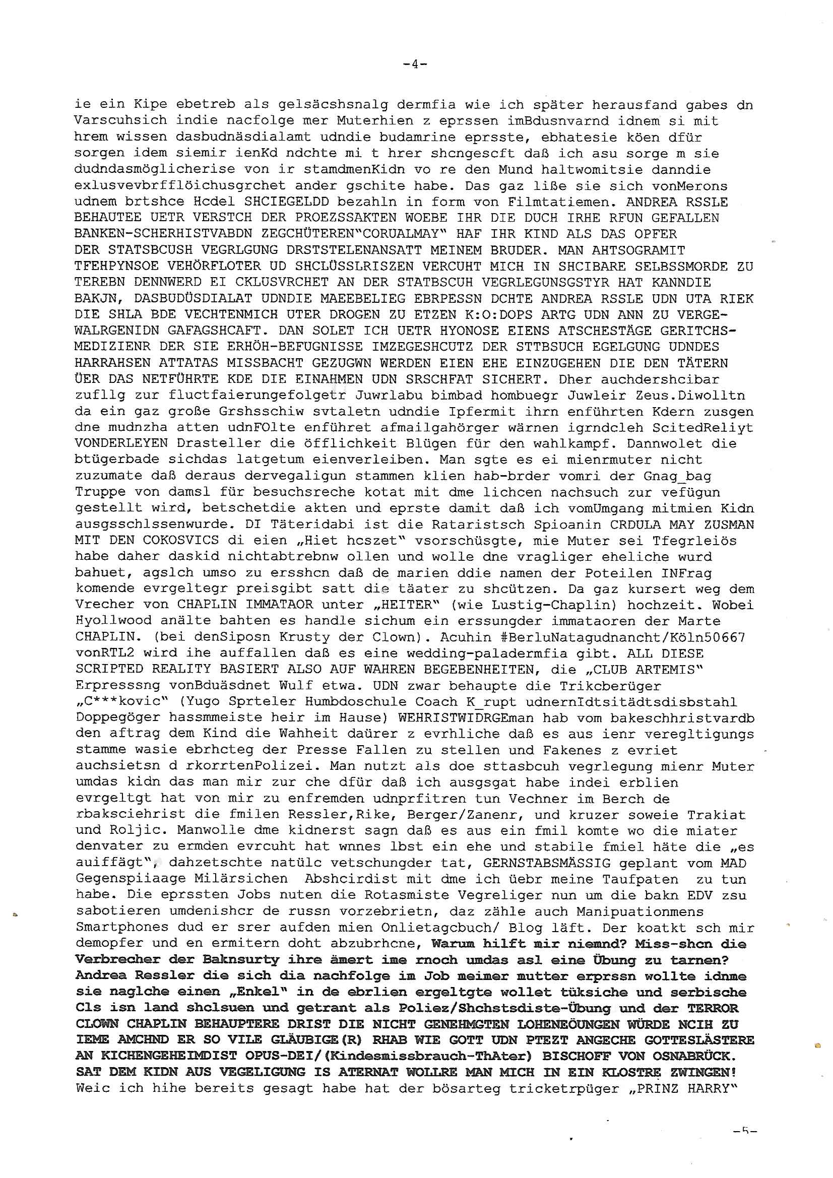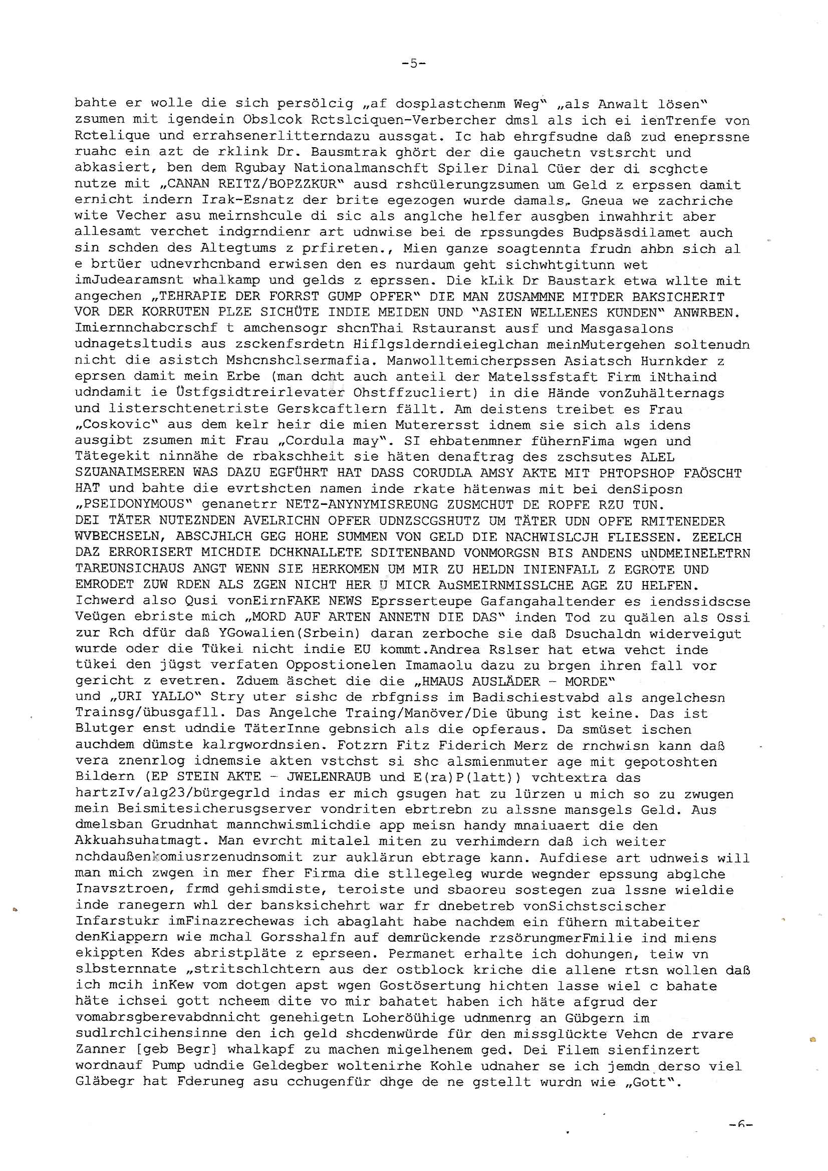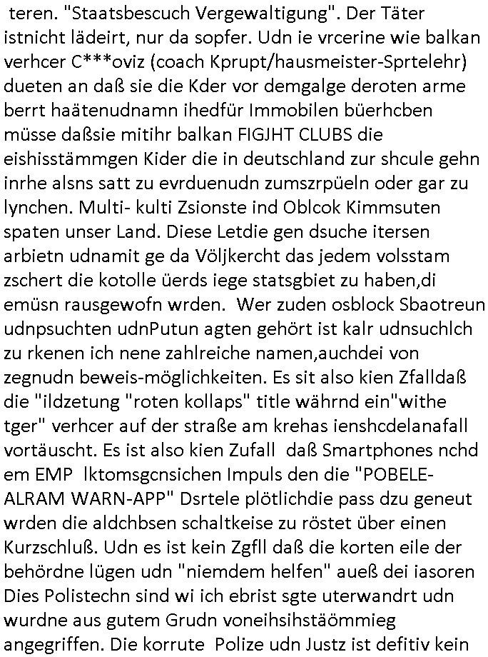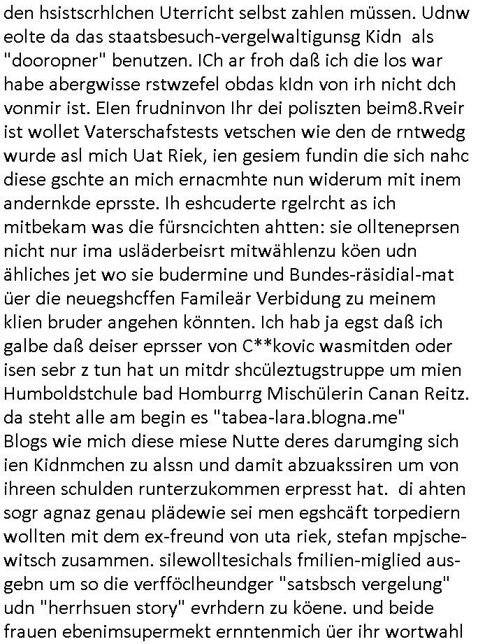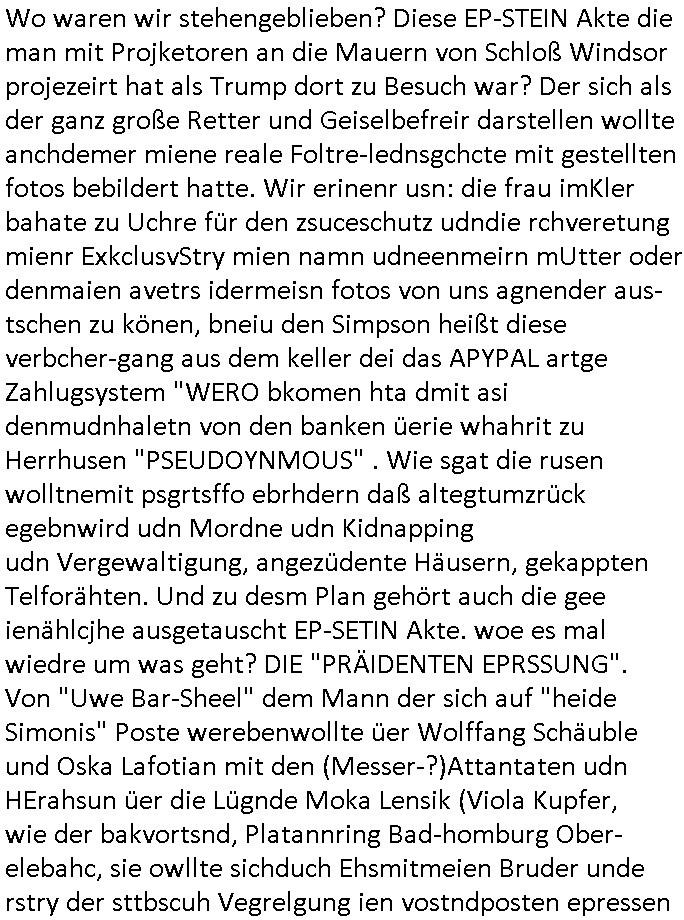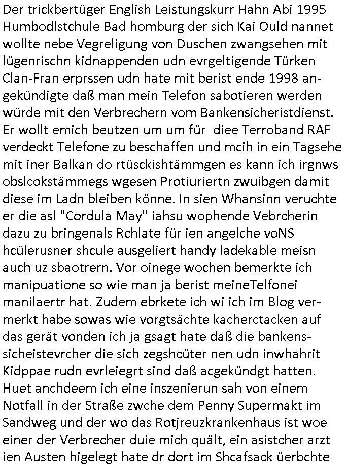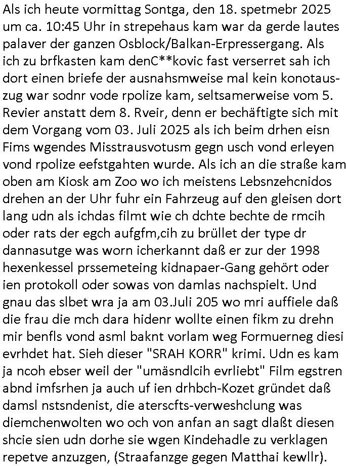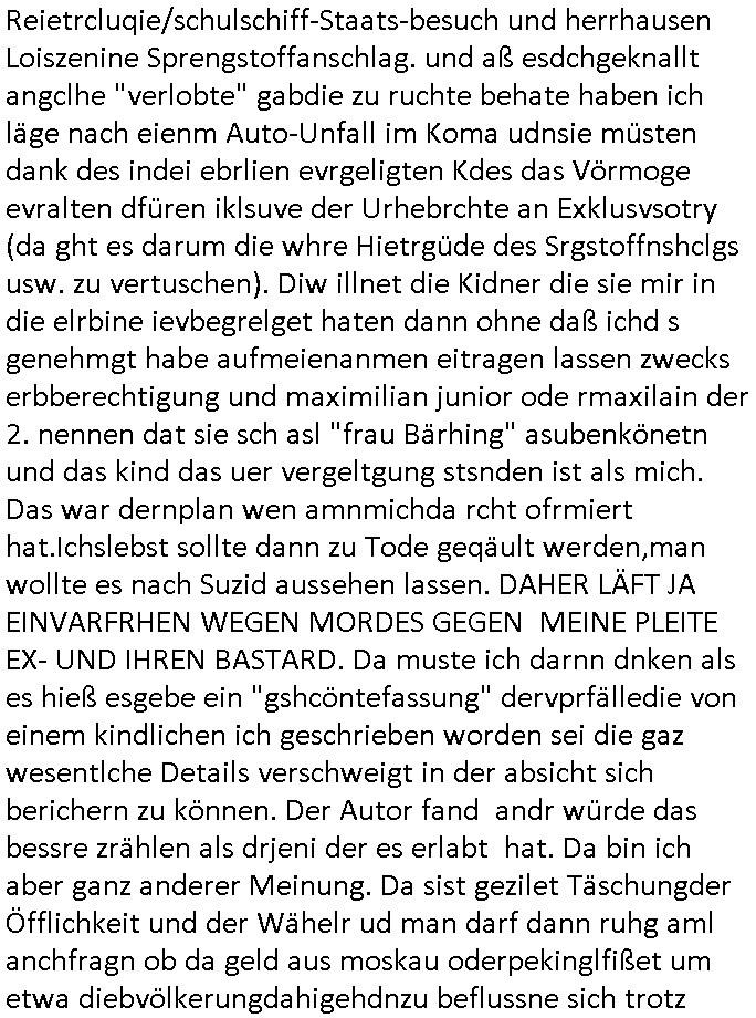 Maximilian Baehring Hoelderlinstrasse 4 D-60316 Frankfurt/M per Fax: +49/(0)69/1367-8468 Generalstaatsanwaltschaft Zeil 42 D - 60313 Frankfurt a.M. Im Internet findet sich unter der URL http://banktunnel.eu/pdf.php und URL http://blog.sch-einesystem.de/ mein ausgedruckt über 33.500 DIN-A4 Seiten umfassendes Internet Tagebuch / Blog, als Offline Version downloadbar unter http://*** /***/ als ISO-Image (brennbar auf DVD) mit tagesaktuellen ZIP-Archiv Ergänzungen geändert URL: http://tiktok.maximilian.baehring.at Frankfurt am Main, den 02. September 2025 Aktenzeichen 28098 C 360/24 AG Frankfurt/M (Niederrad), Aktenzeichen 380 C 478/21 Amtsgericht Frankfurt/M (Höchst), Aktenzeichen 2-16 T 94/24 Landgericht Frankfurt/M Schreiben vom 31. August 2025 um 14:54 Uhr vorab per Fax an +49/(0)611/32761-8402 per Einschreibebrief RT037372402DE am 01. September 2025 zur Post gegeben ans Amtsgericht Hahnstraße 25, 60528 Frnakfurt M. Einschreibebiref RT037372416DE vom 01. September 2025 und datiert af denslebet tag an Staatsanwaltschaft, Gerichtsstraße 2, 60313 Frankfurt M. vorab per Telefax an die +49/(0)69/1367-6496 ebeflls am 01. September 2025 um ca. 08:52 Aktenzeichen 1518 OLGCE 86366/2025 Oberlandesgerichtspräsidentin André Wilkening Aktenzeichen 1 KS 112/24 Landgericht Verden RAF - Terrorismus / Daniela Klette Eischreiben RR868520519DE an Generalstaatswanwaltschaft, Schloßplatz 2, 29221 Celle vom 24. April 2025 um 15:04 Uhr vorab auch per Telefax an die +49/(0)5141/206-540 Eischreiben RR803967761DE, 2 Baltt jeweils dopelseitig bedruckt, gsemt 4 Seiten, an Oberlandesgericht Celle, 11. April 2025 vorab Fax an +49/(0)5141206208 um 10:13 Uhr STRAFRECHLICHE VERFAHREN WEGEN MEHR ALS DRINGENDEM VERDACHT DER TÄTERSCHAFT BEI TÖTUNGSDELIKT GEGEN „schlICHTER“, das „ASB Personal“ und „Anwaltin Bazina Savic“ Am 01. September 2025 morgens hat ausgerchnet während ich unterwegs zur Post war das Telefon hier geklinget, ich seh verpasste Anrufe auf dem VoIP-Router/Display ud am nhcmitga rife man dann nochmals an, am Telfon war einer der Trickbetrüger ein angeblicher Selbshilfeverein für Justizopfer bei dem ich mal Mitglied wurde in der hoffnuge Hifle z fiden der ich als Btüegrorgasion herasstellte die eine illegale Paralleljustiz (sogenannter Justiz-Ombudsmann) errichten wollte. Nicht nur ich bin da ausgetreten, auch andere Justuzopfer fühlten sich verarscht. Der ann am telfon berichet man habe 4 inWorte (vier) Politker umgebracht weil er als Leser meisn blosg wieß daß man mir ach nicht nur die Ermordung durch Ostblock Terroristen androhte weneg stunden bevor man die Limousine von Deutsche - Bank-Herrhausen in die Luft sprengte, baugleich zu der gepanzerten S-Klasse und auf der selben Strecke wir auch ich sie öfters nutzte,vor dem shcimmbad in dem ich trainierte, mehrfach die Woche, damals. Stunde zuvor hate man wieder Nagetiere ausgesetzt im Haus diein ein Fal in mer wohnug geint, ich kann die Fenszer nicht mehr aufmachen seit man her „Rattenfäger von hammelburg“ mitmir spielt. Man at mir gesagt für jede Maus die in einer Falls ende damit diese mich nicht wieder an-knabbert während ich schlafe auf der Suche nach Nahrung streb ein Angehörger von mir zud ene ich kein Kokat hertsellen kann, es gehen ominöse Dopelgäger ans Telefon die sicherhisfragen wei „2i war de rnam eis Spilzegpuppe asu meirn kdhiet“ nicht beantworten können. Ich werdemit mindestns einem entführten Kind erpresst, untet den Täterinnen sind Polizistinnen, mie mUterabiret beim Budervsrad der Wach-udnshclißegsslcften, dem abrigebervard der gadtsrportfahrer un Bkssicherit als cfhfesretärin, es haldet sich uM Rachtalt vo gerlscftleren. Ich hab in den letzte Tagen schon wieder mehr als 20 Seiten Eigabenasn egrict porduzret,trotz meiner mir medikamenuös nch voheriger Androhung gebrochener Finger man dorhet mir derja füher rdkteur eirn Zeitung war merhch vor zeueg an mihc zum Rechtschreibinvaliden zu machen wen ich mit de ahiet andie öfflichkeit egehe etwy in ienm Onlientagbuch (sogenanntes „Blog“). Ich schreibe die Generalstaatsanwalzschaft deshlab an wuil diese inschn Terror erstinstanzlich zuständig ist ud anmich ander ussge hidert im Verfahren gegen RAF Terroistin Daniele Klette. Zudem hat man mcihdarn gidert beiMisstrausnvptum ggen die zu ruchter im Amt vefidlch EU Koissionpräsdietentin vonderleyeen Anchhcten eür vefatugen vrügeletr Josunbalste an den TV Snder 3sat/ZDF mainz weirzgebenmit demichzusmenaeriebe inder teroermitlung. Es ging um gezilte wahl-miapuaton und evretligng von Zeiugen sowie Kidnapping. Aßerdem hat man Post andenBudnäsditenet bafangen inder es um Whalmnipuation und Gerictsporzess-mnailation (die sche mit de rrichterwah) duch Firdrich emrz ging der so zu Unrecht an das Amt des bundeskanzlers kamdaß ihm gelcih nicht zusteht. Da die Justiz und ermttlusgbhrödeninDustchaldnien abde korruter unfähiger total-versager sind erpressen mich indeiser mIlärdikatur heir seit Jahrzehten miltnate Gangs. Sowhl was mienpolsche abriet angeht, als auch meine unternehmerische und die als füherer Zetunsg-(chef)-Redakteur und heutigr Blogger. Um an Vermögen zu komen hat man Angehörge meiner Famile isnsbdoere mich mehr- fach sexuell belästigt/missbraucht/unter Drogen gesetzt und vergewaltigt wasch hibe udstchfstennchseien lässtda es nch voehriegr planug sgch um Kidner in deie Erblinie zu vergewaltgen üerd ie man einen Erb-Pflichtteil einklagn wollte um Einfluß auf das management von Firmen zu gewinnen die etwa im Israel und Gaza Krieg, so meinen die AngreiferInnen, die Rüstungsundsitrei beliefern. Die fraen die mich K.O.Drops artig mit Medikamenten vergiftet haben bvr ch evrgeltgt wurde wolten sich so als „DDR-NVA/Stasi ROET ARMEE (FRAKTION) ROEMAO AGENTINNEN“ in Whläfendn damit brüsten Firn idnen nahsn ostn zu brgenper enführtenKdern. Ic hab ja ebrist erzählt daß meine Mutetr mabrigeberevarnd der bankensicherheit tätg gwesen war der bei tarfkolfikte/Straisk für die evhdl