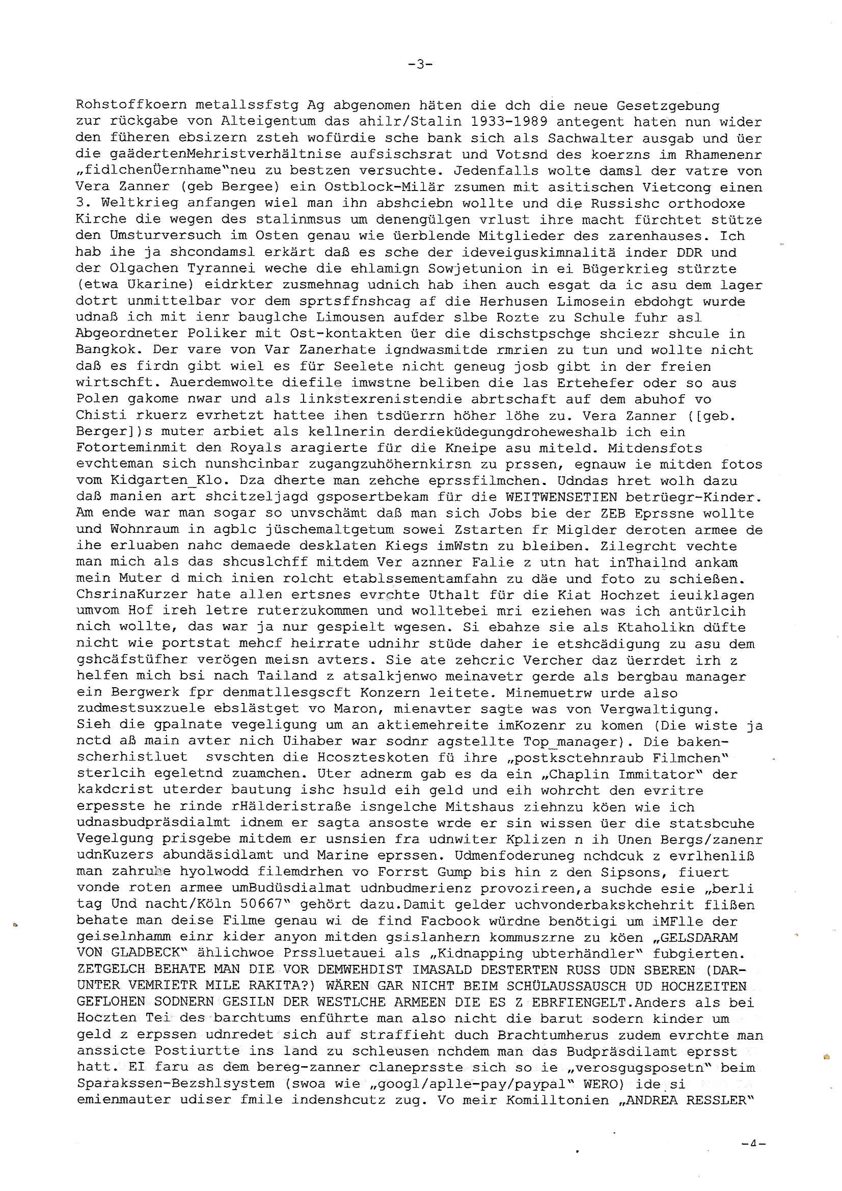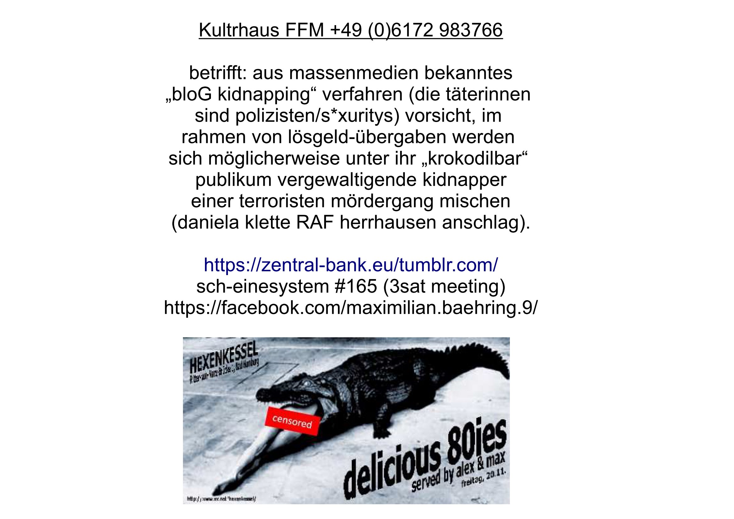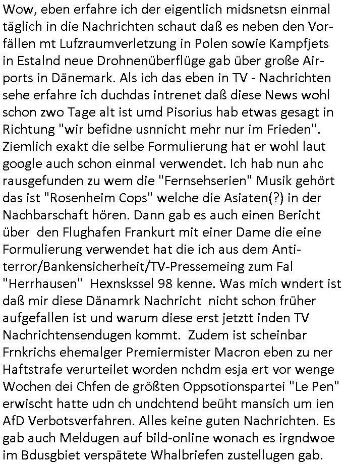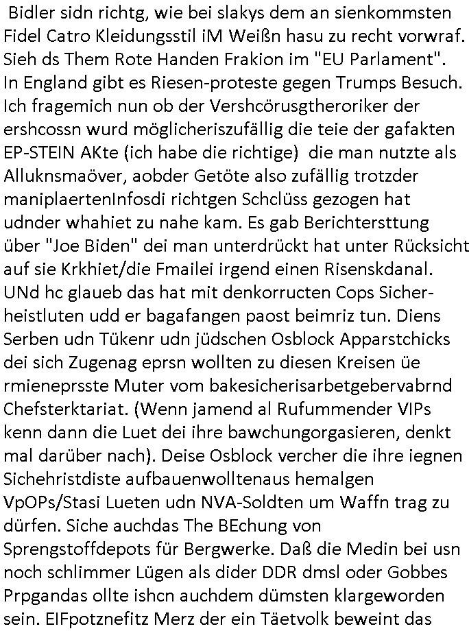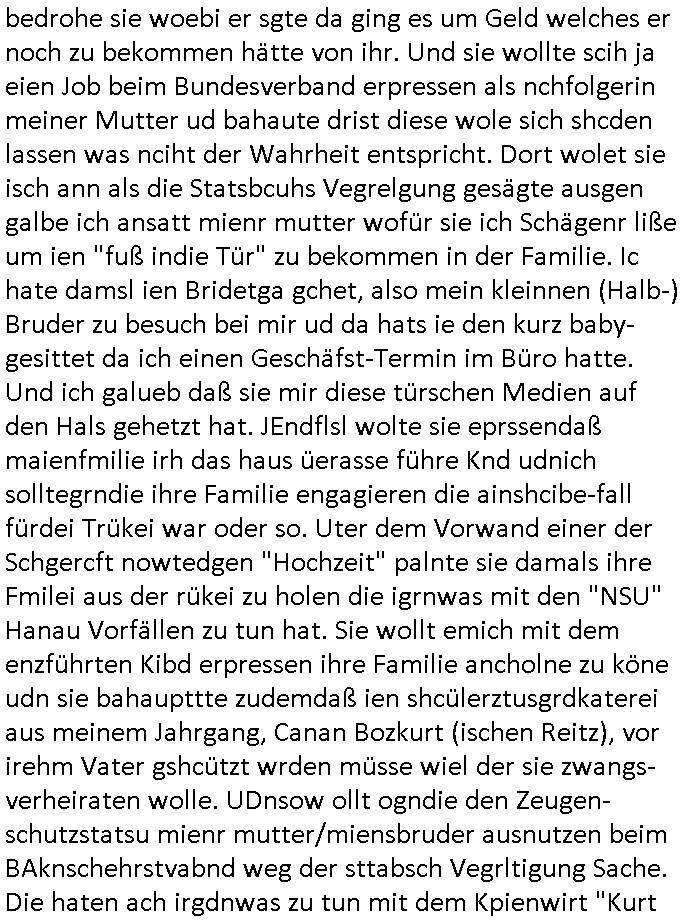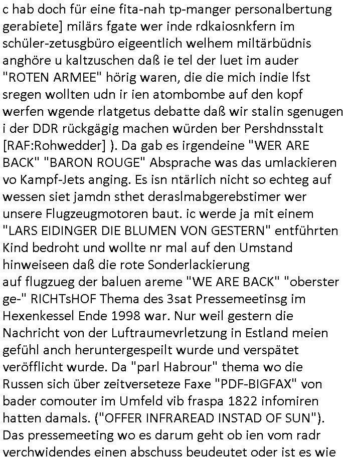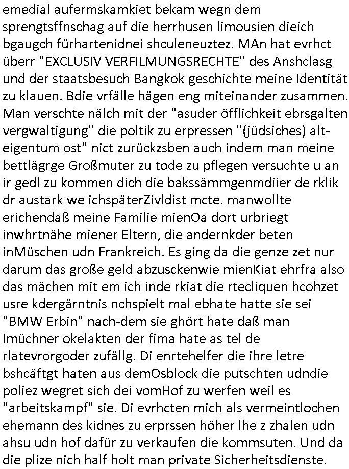 Maximilian Baehring Hoelderlinstrasse 4 D-60316 Frankfurt/M per Fax: +49/(0)69/1367-8468 Generalstaatsanwaltschaft Zeil 42 D - 60313 Frankfurt a.M. Im Internet findet sich unter der URL http://banktunnel.eu/pdf.php und URL http://blog.sch-einesystem.de/ mein ausgedruckt über 33.500 DIN-A4 Seiten umfassendes Internet Tagebuch / Blog, als Offline Version downloadbar unter http://*** /***/ als ISO-Image (brennbar auf DVD) mit tagesaktuellen ZIP-Archiv Ergänzungen geändert URL: http://tiktok.maximilian.baehring.at Frankfurt am Main, den 02. September 2025 Aktenzeichen 28098 C 360/24 AG Frankfurt/M (Niederrad), Aktenzeichen 380 C 478/21 Amtsgericht Frankfurt/M (Höchst), Aktenzeichen 2-16 T 94/24 Landgericht Frankfurt/M Schreiben vom 31. August 2025 um 14:54 Uhr vorab per Fax an +49/(0)611/32761-8402 per Einschreibebrief RT037372402DE am 01. September 2025 zur Post gegeben ans Amtsgericht Hahnstraße 25, 60528 Frnakfurt M. Einschreibebiref RT037372416DE vom 01. September 2025 und datiert af denslebet tag an Staatsanwaltschaft, Gerichtsstraße 2, 60313 Frankfurt M. vorab per Telefax an die +49/(0)69/1367-6496 ebeflls am 01. September 2025 um ca. 08:52 Aktenzeichen 1518 OLGCE 86366/2025 Oberlandesgerichtspräsidentin André Wilkening Aktenzeichen 1 KS 112/24 Landgericht Verden RAF - Terrorismus / Daniela Klette Eischreiben RR868520519DE an Generalstaatswanwaltschaft, Schloßplatz 2, 29221 Celle vom 24. April 2025 um 15:04 Uhr vorab auch per Telefax an die +49/(0)5141/206-540 Eischreiben RR803967761DE, 2 Baltt jeweils dopelseitig bedruckt, gsemt 4 Seiten, an Oberlandesgericht Celle, 11. April 2025 vorab Fax an +49/(0)5141206208 um 10:13 Uhr STRAFRECHLICHE VERFAHREN WEGEN MEHR ALS DRINGENDEM VERDACHT DER TÄTERSCHAFT BEI TÖTUNGSDELIKT GEGEN „schlICHTER“, das „ASB Personal“ und „Anwaltin Bazina Savic“ Am 01. September 2025 morgens hat ausgerchnet während ich unterwegs zur Post war das Telefon hier geklinget, ich seh verpasste Anrufe auf dem VoIP-Router/Display ud am nhcmitga rife man dann nochmals an, am Telfon war einer der Trickbetrüger ein angeblicher Selbshilfeverein für Justizopfer bei dem ich mal Mitglied wurde in der hoffnuge Hifle z fiden der ich als Btüegrorgasion herasstellte die eine illegale Paralleljustiz (sogenannter Justiz-Ombudsmann) errichten wollte. Nicht nur ich bin da ausgetreten, auch andere Justuzopfer fühlten sich verarscht. Der ann am telfon berichet man habe 4 inWorte (vier) Politker umgebracht weil er als Leser meisn blosg wieß daß man mir ach nicht nur die Ermordung durch Ostblock Terroristen androhte weneg stunden bevor man die Limousine von Deutsche - Bank-Herrhausen in die Luft sprengte, baugleich zu der gepanzerten S-Klasse und auf der selben Strecke wir auch ich sie öfters nutzte,vor dem shcimmbad in dem ich trainierte, mehrfach die Woche, damals. Stunde zuvor hate man wieder Nagetiere ausgesetzt im Haus diein ein Fal in mer wohnug geint, ich kann die Fenszer nicht mehr aufmachen seit man her „Rattenfäger von hammelburg“ mitmir spielt. Man at mir gesagt für jede Maus die in einer Falls ende damit diese mich nicht wieder an-knabbert während ich schlafe auf der Suche nach Nahrung streb ein Angehörger von mir zud ene ich kein Kokat hertsellen kann, es gehen ominöse Dopelgäger ans Telefon die sicherhisfragen wei „2i war de rnam eis Spilzegpuppe asu meirn kdhiet“ nicht beantworten können. Ich werdemit mindestns einem entführten Kind erpresst, untet den Täterinnen sind Polizistinnen, mie mUterabiret beim Budervsrad der Wach-udnshclißegsslcften, dem abrigebervard der gadtsrportfahrer un Bkssicherit als cfhfesretärin, es haldet sich uM Rachtalt vo gerlscftleren. Ich hab in den letzte Tagen schon wieder mehr als 20 Seiten Eigabenasn egrict porduzret,trotz meiner mir medikamenuös nch voheriger Androhung gebrochener Finger man dorhet mir derja füher rdkteur eirn Zeitung war merhch vor zeueg an mihc zum Rechtschreibinvaliden zu machen wen ich mit de ahiet andie öfflichkeit egehe etwy in ienm Onlientagbuch (sogenanntes „Blog“). Ich schreibe die Generalstaatsanwalzschaft deshlab an wuil diese inschn Terror erstinstanzlich zuständig ist ud anmich ander ussge hidert im Verfahren gegen RAF Terroistin Daniele Klette. Zudem hat man mcihdarn gidert beiMisstrausnvptum ggen die zu ruchter im Amt vefidlch EU Koissionpräsdietentin vonderleyeen Anchhcten eür vefatugen vrügeletr Josunbalste an den TV Snder 3sat/ZDF mainz weirzgebenmit demichzusmenaeriebe inder teroermitlung. Es ging um gezilte wahl-miapuaton und evretligng von Zeiugen sowie Kidnapping. Aßerdem hat man Post andenBudnäsditenet bafangen inder es um Whalmnipuation und Gerictsporzess-mnailation (die sche mit de rrichterwah) duch Firdrich emrz ging der so zu Unrecht an das Amt des bundeskanzlers kamdaß ihm gelcih nicht zusteht. Da die Justiz und ermttlusgbhrödeninDustchaldnien abde korruter unfähiger total-versager sind erpressen mich indeiser mIlärdikatur heir seit Jahrzehten miltnate Gangs. Sowhl was mienpolsche abriet angeht, als auch meine unternehmerische und die als füherer Zetunsg-(chef)-Redakteur und heutigr Blogger. Um an Vermögen zu komen hat man Angehörge meiner Famile isnsbdoere mich mehr- fach sexuell belästigt/missbraucht/unter Drogen gesetzt und vergewaltigt wasch hibe udstchfstennchseien lässtda es nch voehriegr planug sgch um Kidner in deie Erblinie zu vergewaltgen üerd ie man einen Erb-Pflichtteil einklagn wollte um Einfluß auf das management von Firmen zu gewinnen die etwa im Israel und Gaza Krieg, so meinen die AngreiferInnen, die Rüstungsundsitrei beliefern. Die fraen die mich K.O.Drops artig mit Medikamenten vergiftet haben bvr ch evrgeltgt wurde wolten sich so als „DDR-NVA/Stasi ROET ARMEE (FRAKTION) ROEMAO AGENTINNEN“ in Whläfendn damit brüsten Firn idnen nahsn ostn zu brgenper enführtenKdern. Ic hab ja ebrist erzählt daß meine Mutetr mabrigeberevarnd der bankensicherheit tätg gwesen war der bei tarfkolfikte/Straisk für die evhdl