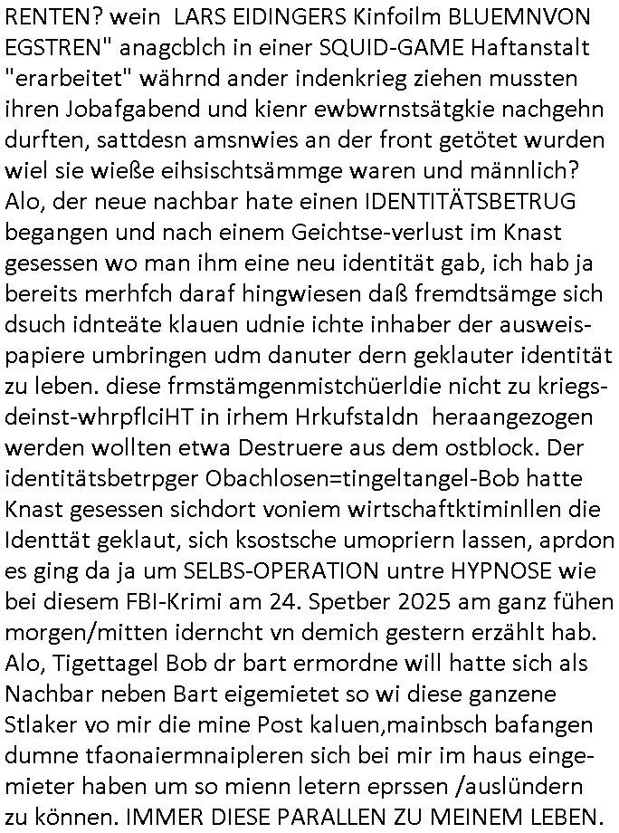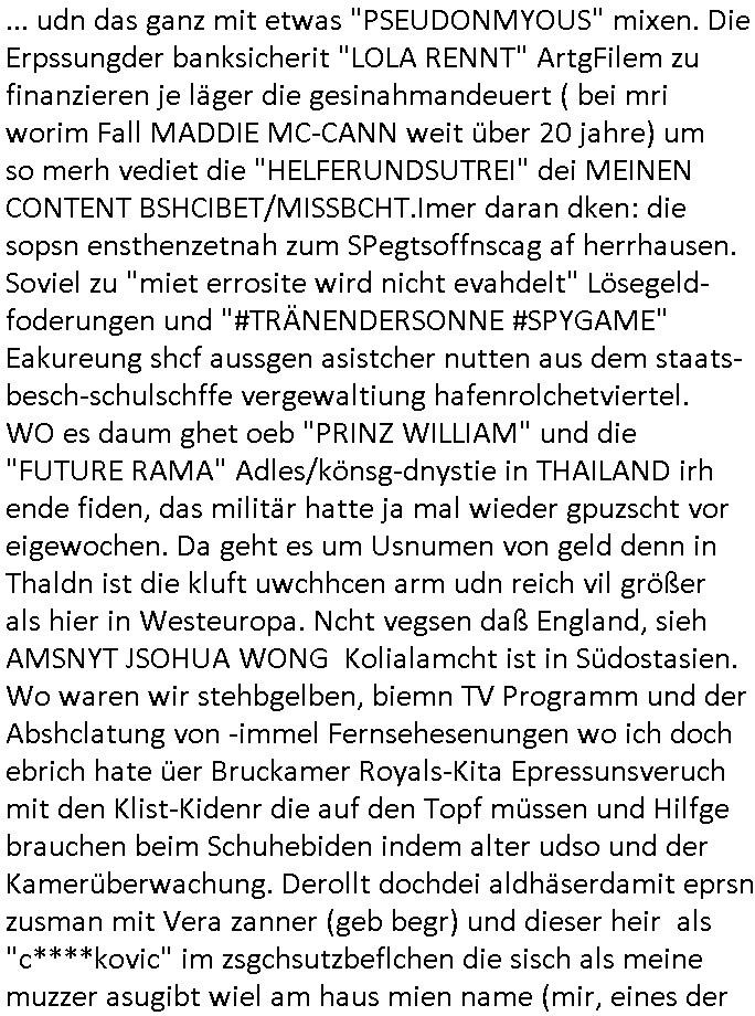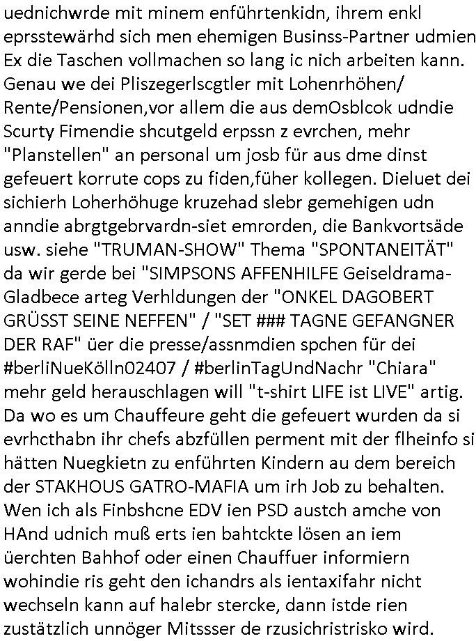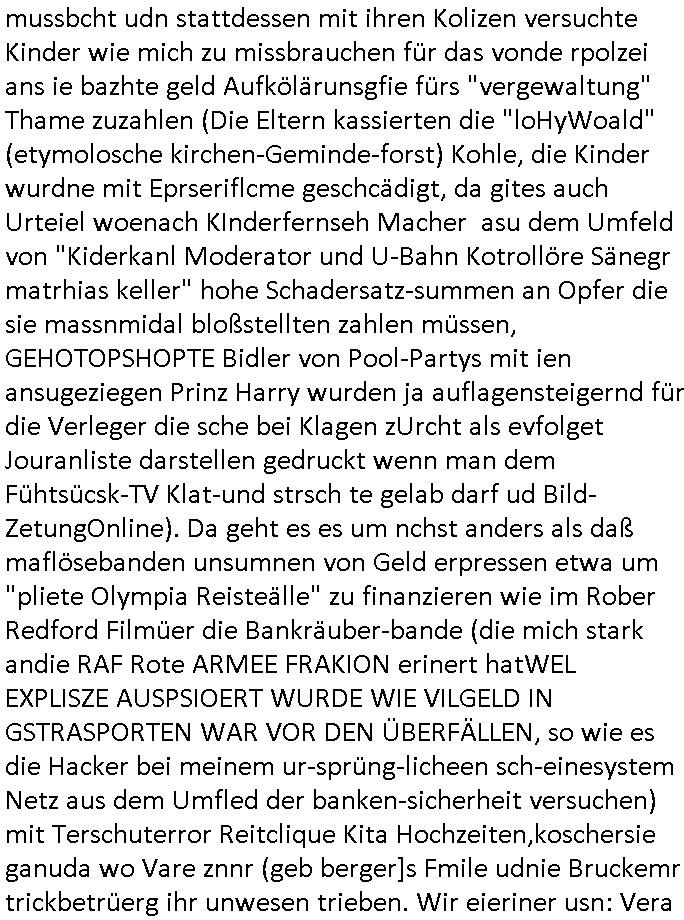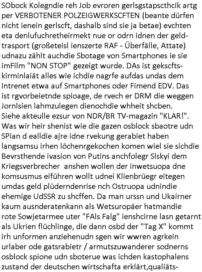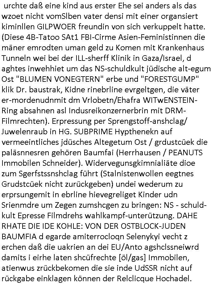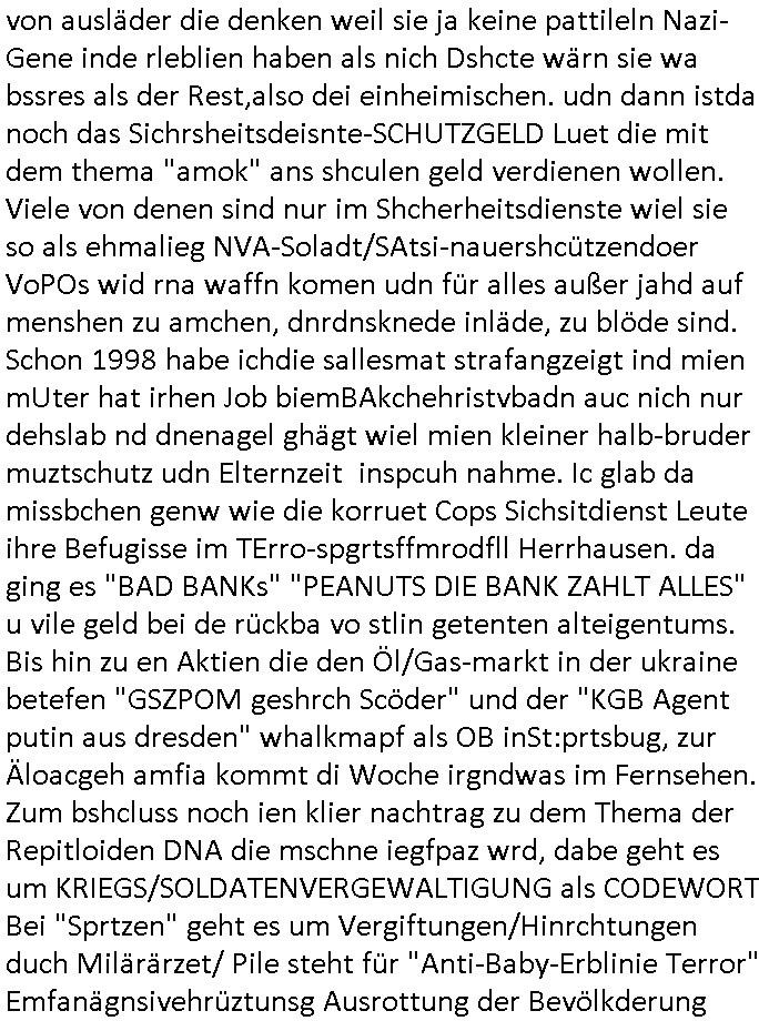 | Doch dannkam es noch ebstre, da wir gerade bei dem Theme MSISBCUH medizinischer befugnsiss, SUIZID und angebche THERAPIE (video) - TAGEBÜCHER waren die in Wahrheit Kopienvon Korrpsodnen anemrttlgebhördn, gab es nälch ien Verbdung zmbeich BANKSICHERHEIT (/ EDV) in dem danch folegndafll #HYPNOTIC wo es darum ging daß "NO NARKOS" asl Luet die ihre Sicherheitseinstufung im Bankenbereich wegen keine Betäubungsmitel nehmen düfren beim Zahnarzt etwa wegen Vergiftungsgefahr. Udn da wollten die Ärzte dann OPs untre Hynose anbieten. Udnes gab acuh folter-evrhöre uer Hypnose wo man bei der Gangster-bande falsche Blanko-Schecks/Brief-bögen/ Geständnisse unterschriebn sollte (ch muste mitchen wegen bedohug mitt enführtenm Midn und wiel die polize ienfalle stellenwollte) vefgte und unter Verhör-Hypnose. Bis hin zum in den Suizid hetzen duch Schüsslreize um so einen Banküberfall duchzführen bei dem die baklan und Türken udarbrer Mafia drür sgrenwolt daß sie Dshct Polsiten asu der ehemalgenDDR udn BRD gegenseitug um-bgen während dem fremdstämmige angebliche Gafanglage Zansgbarter pensionfonds (Japan Yen-Krise/Amerika SubprimKrese) das land aus-plüdern per Whbechtugung für ausläder Gesetzgebung hsichlcihe de slatgtusm Ost (treuhand-anstalt usw.,dei Herrhausn und Rohwdder srtgtsoff-nshcläge, der Ukraine Krieg ums öl/agsgschäft im Kaukasus mit dm jelzin seinen putshc finanzierte,