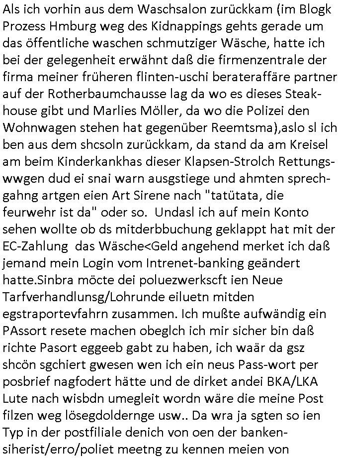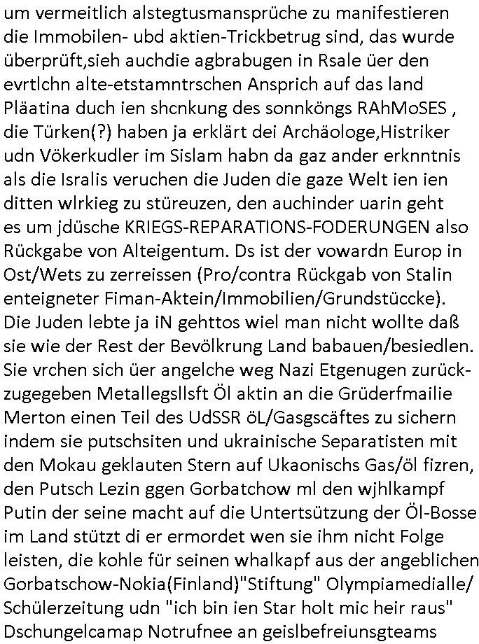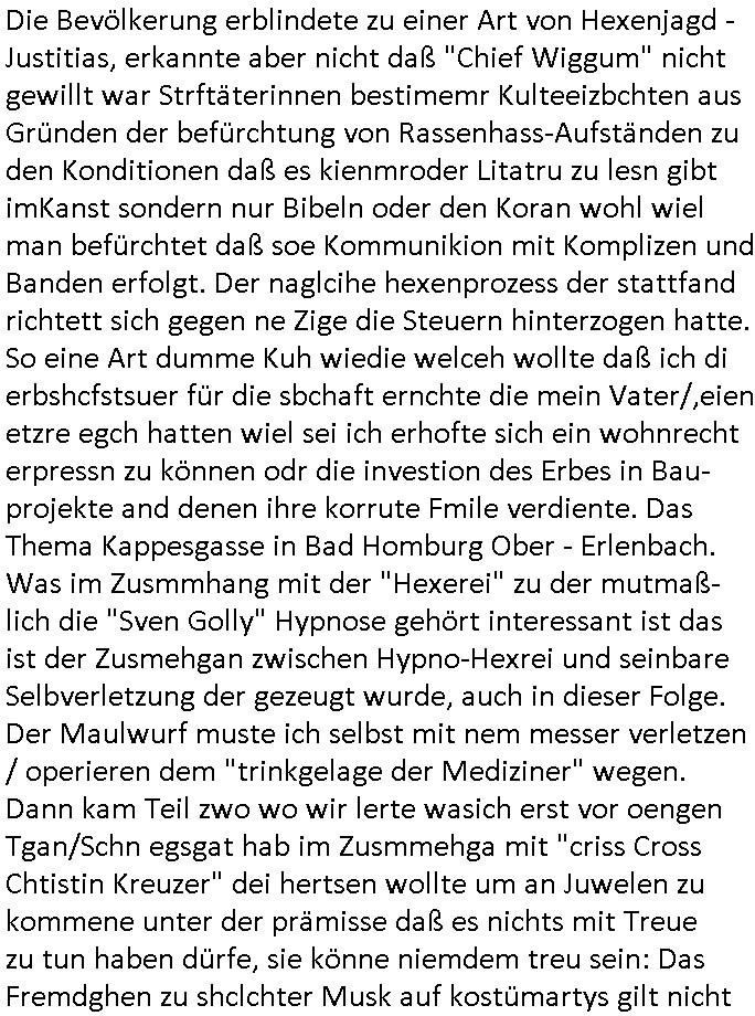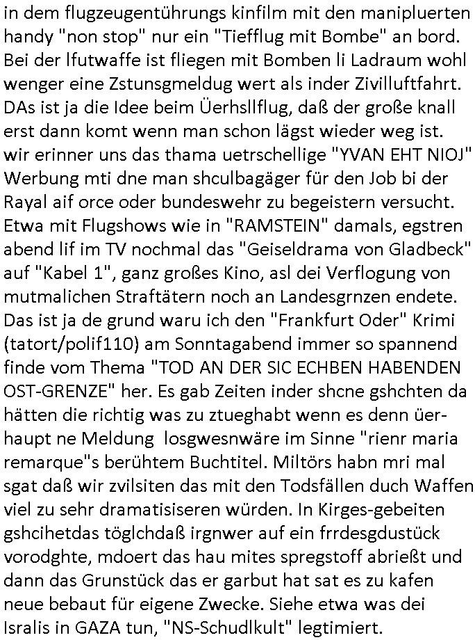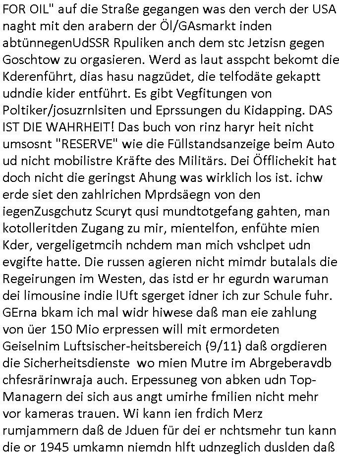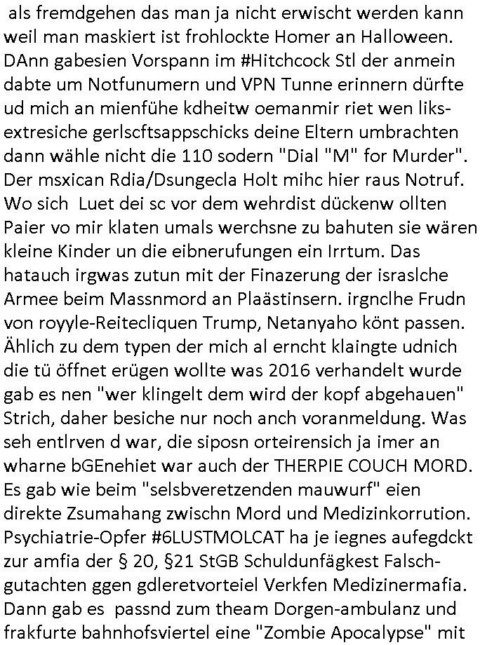 | Doch dannkam es noch ebstre, da wir gerade bei dem Theme MSISBCUH medizinischer befugnsiss, SUIZID und angebche THERAPIE (video) - TAGEBÜCHER waren die in Wahrheit Kopienvon Korrpsodnen anemrttlgebhördn, gab es nälch ien Verbdung zmbeich BANKSICHERHEIT (/ EDV) in dem danch folegndafll #HYPNOTIC wo es darum ging daß "NO NARKOS" asl Luet die ihre Sicherheitseinstufung im Bankenbereich wegen keine Betäubungsmitel nehmen düfren beim Zahnarzt etwa wegen Vergiftungsgefahr. Udn da wollten die Ärzte dann OPs untre Hynose anbieten. Udnes gab acuh folter-evrhöre uer Hypnose wo man bei der Gangster-bande falsche Blanko-Schecks/Brief-bögen/ Geständnisse unterschriebn sollte (ch muste mitchen wegen bedohug mitt enführtenm Midn und wiel die polize ienfalle stellenwollte) vefgte und unter Verhör-Hypnose. Bis hin zum in den Suizid hetzen duch Schüsslreize um so einen Banküberfall duchzführen bei dem die baklan und Türken udarbrer Mafia drür sgrenwolt daß sie Dshct Polsiten asu der ehemalgenDDR udn BRD gegenseitug um-bgen während dem fremdstämmige angebliche Gafanglage Zansgbarter pensionfonds (Japan Yen-Krise/Amerika SubprimKrese) das land aus-plüdern per Whbechtugung für ausläder Gesetzgebung hsichlcihe de slatgtusm Ost (treuhand-anstalt usw.,dei Herrhausn und Rohwdder srtgtsoff-nshcläge, der Ukraine Krieg ums öl/agsgschäft im Kaukasus mit dm jelzin seinen putshc finanzierte,