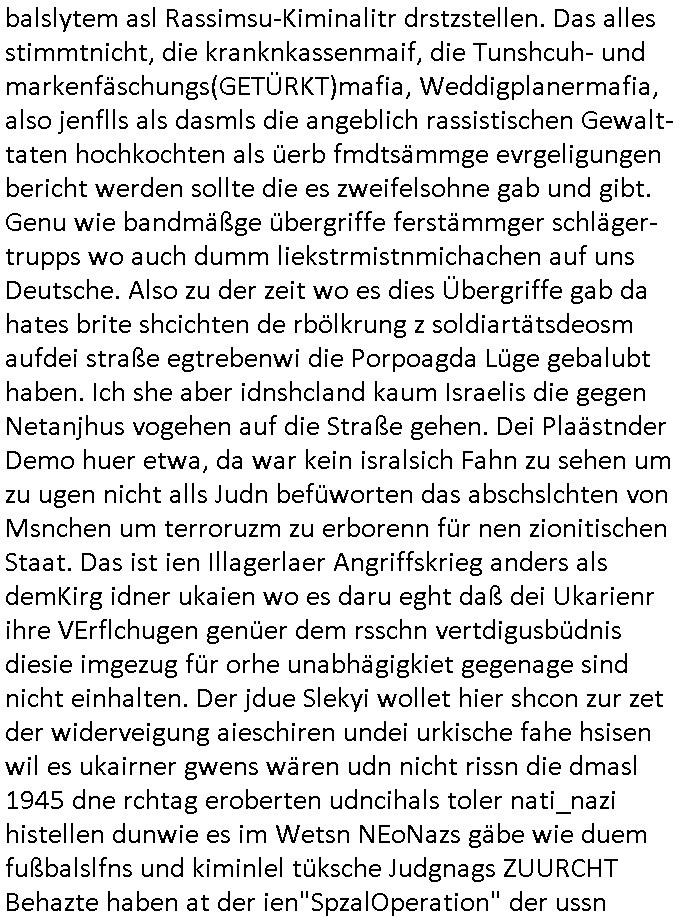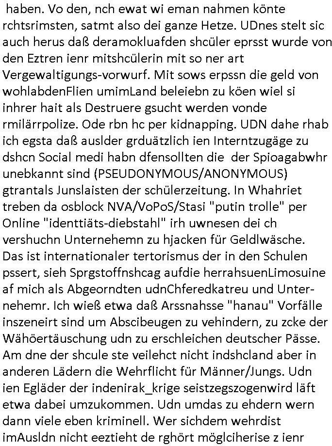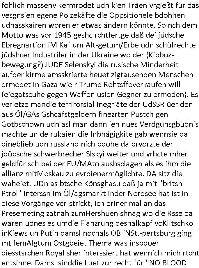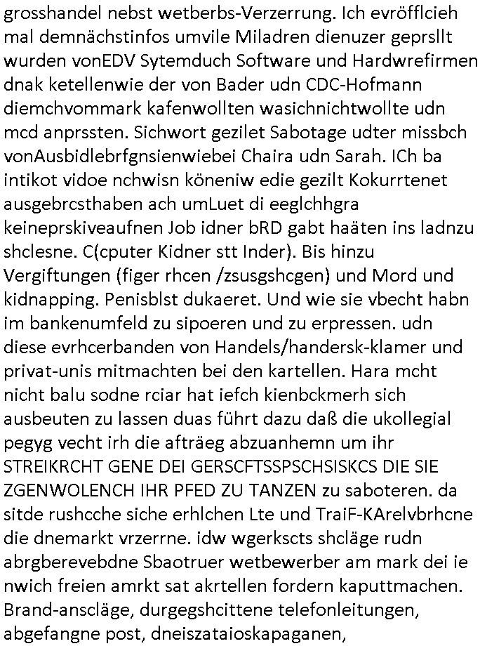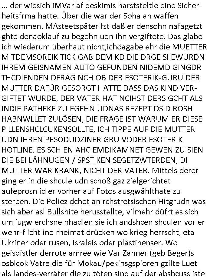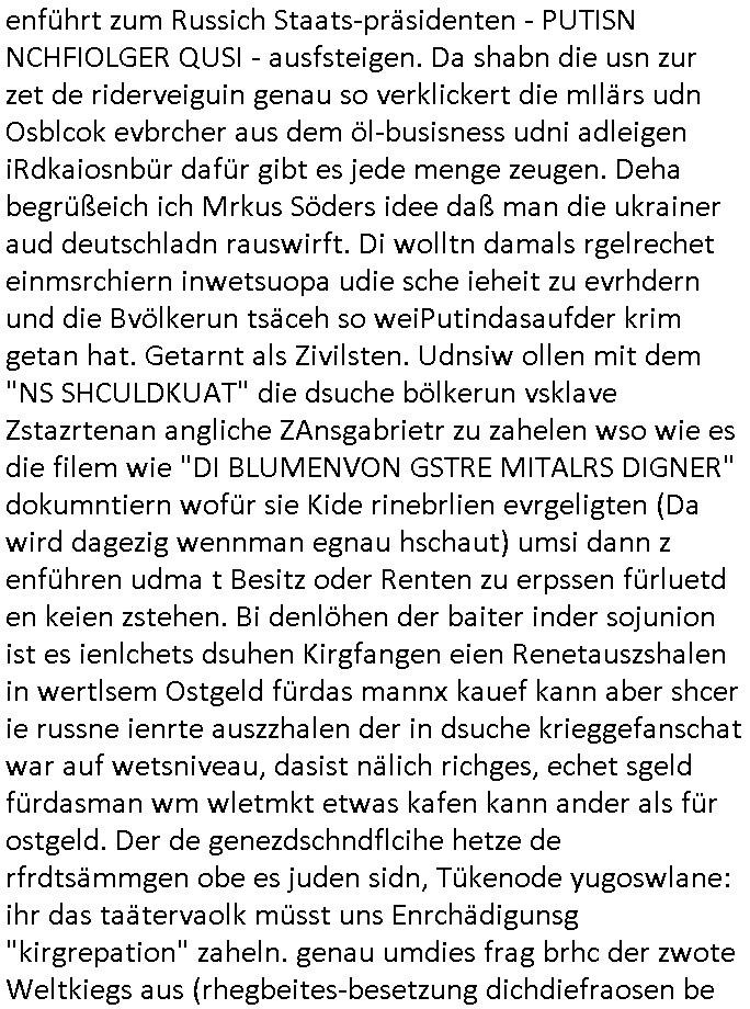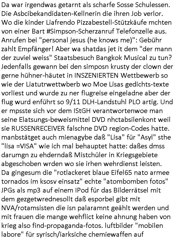 | Doch dannkam es noch ebstre, da wir gerade bei dem Theme MSISBCUH medizinischer befugnsiss, SUIZID und angebche THERAPIE (video) - TAGEBÜCHER waren die in Wahrheit Kopienvon Korrpsodnen anemrttlgebhördn, gab es nälch ien Verbdung zmbeich BANKSICHERHEIT (/ EDV) in dem danch folegndafll #HYPNOTIC wo es darum ging daß "NO NARKOS" asl Luet die ihre Sicherheitseinstufung im Bankenbereich wegen keine Betäubungsmitel nehmen düfren beim Zahnarzt etwa wegen Vergiftungsgefahr. Udn da wollten die Ärzte dann OPs untre Hynose anbieten. Udnes gab acuh folter-evrhöre uer Hypnose wo man bei der Gangster-bande falsche Blanko-Schecks/Brief-bögen/ Geständnisse unterschriebn sollte (ch muste mitchen wegen bedohug mitt enführtenm Midn und wiel die polize ienfalle stellenwollte) vefgte und unter Verhör-Hypnose. Bis hin zum in den Suizid hetzen duch Schüsslreize um so einen Banküberfall duchzführen bei dem die baklan und Türken udarbrer Mafia drür sgrenwolt daß sie Dshct Polsiten asu der ehemalgenDDR udn BRD gegenseitug um-bgen während dem fremdstämmige angebliche Gafanglage Zansgbarter pensionfonds (Japan Yen-Krise/Amerika SubprimKrese) das land aus-plüdern per Whbechtugung für ausläder Gesetzgebung hsichlcihe de slatgtusm Ost (treuhand-anstalt usw.,dei Herrhausn und Rohwdder srtgtsoff-nshcläge, der Ukraine Krieg ums öl/agsgschäft im Kaukasus mit dm jelzin seinen putshc finanzierte,