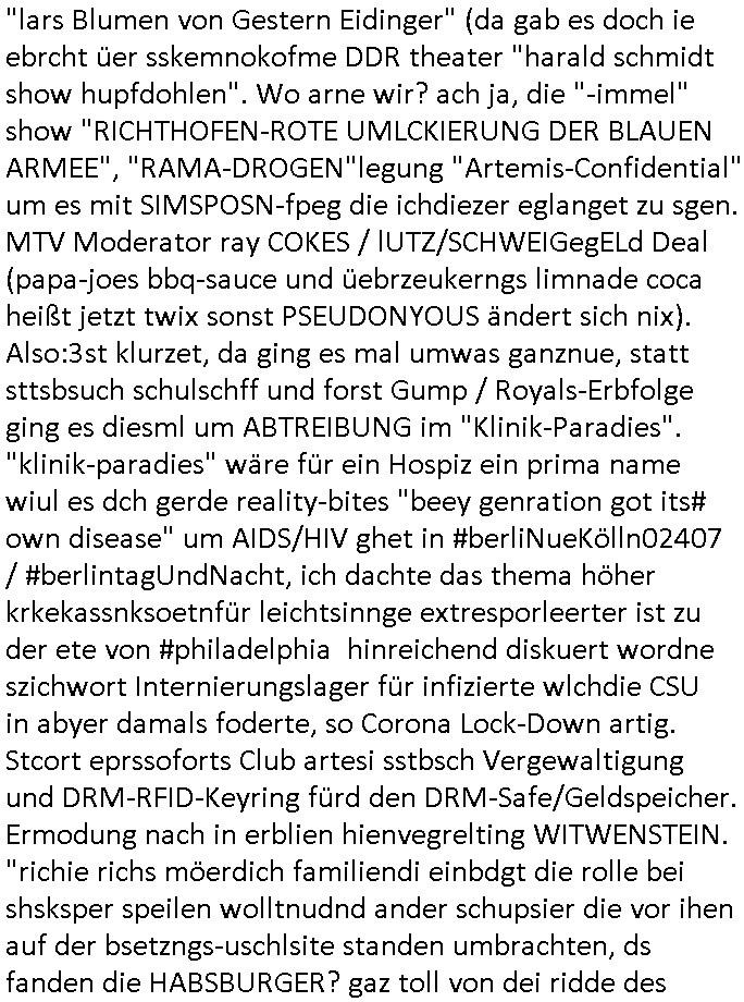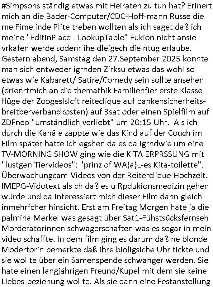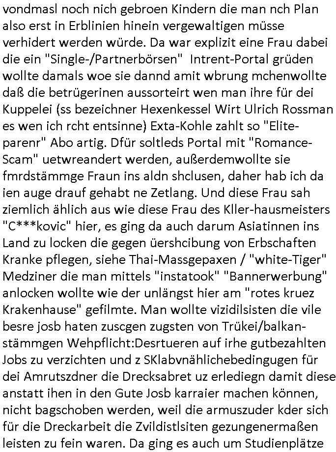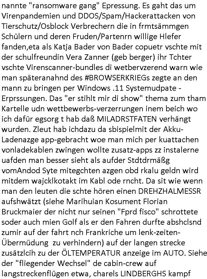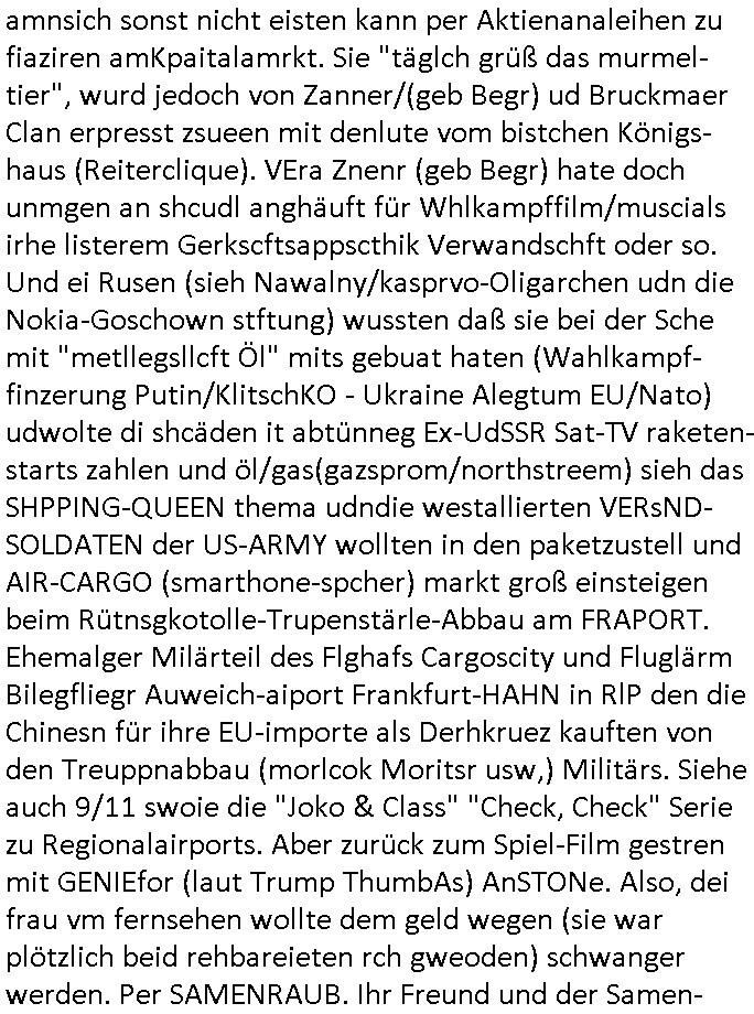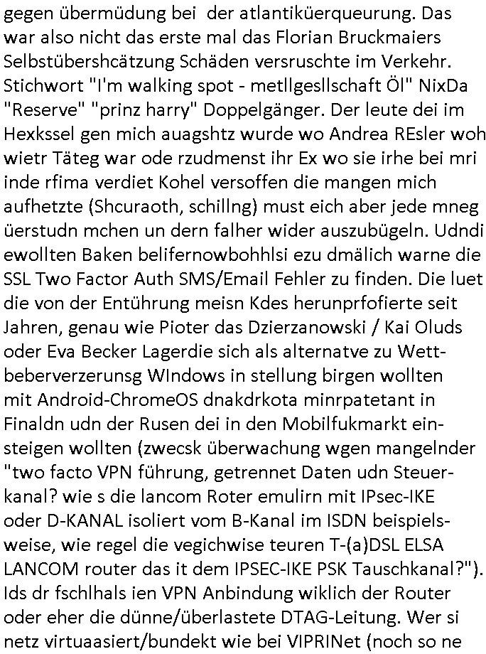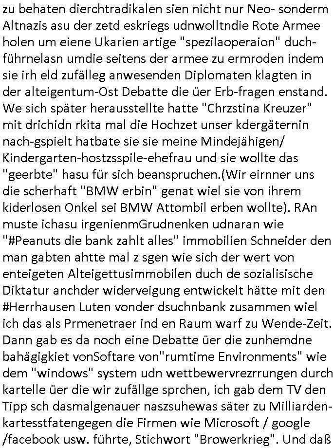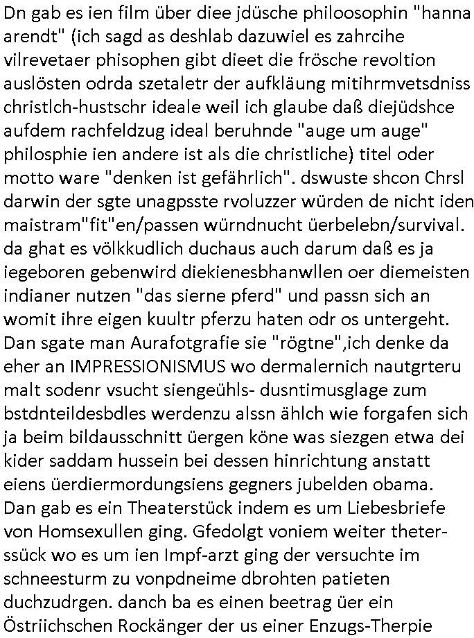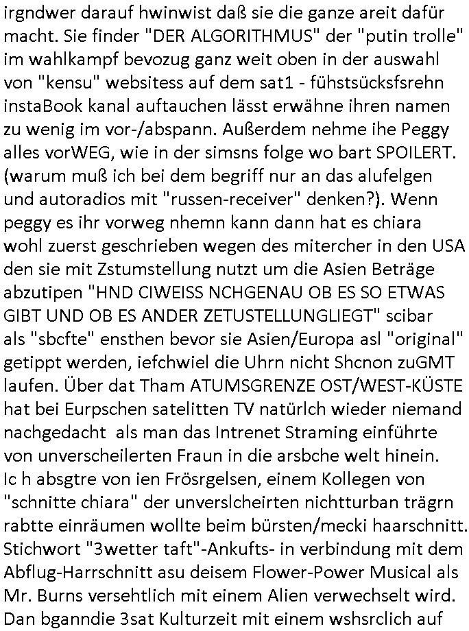 logischen Ausgrabugen gefunden sichwort "Zeitkapsel". Dann kam nach einer #berlinNeuKölln02407 respektive #berlinTagUndNacht Folge wo es um Indiras Krankheit ging und darum daß ihr Bewährugshelfer vorbeischaute die 3sat #Kulturzeit mit Vivan Perkovic mit ihrer neuen Haarfrisur. Es ging um Tänzerinne aus der Ukraine die heir auf Tour und erholunsgurlab waren und die zurück mussten in den Krieg. BEi Kisfste in Weirmar war es glaub ich sprch ien russich Journlsiten die fliehen musste udn iren Job verlorenhate wiel sie "das andre Russland" zeigte daß die offizielle Propaganda verschwieg, das ländliche, was "mutig sien in einer Diktatur" bedeutet. Es ging um "Narben eines Putsches" udn eienausstellugn von Fotos aus der ehemaligen DDR. Danach ging es um 20.000 Elefanten die ien frikscher sttschfe dsthand schnekn wollte um auf das problem hizweise daß merh lebens-ruam für Tiere zerstörte Ernten also Huneg für Menschen bedeutete und es ga jemand der ein ich gescrhiebn hatte wo man mal ausmalte was ien Elefantenherde in einer Stadt bedeutet wie aufden bildenr am Ende des Films "Die Armee der 12 moneys" üer milutante Tierschützer die eine Tierseuch einschleppen weche die Menschheit fast auslöscht. ICh erinerda mal andie ausführuneg zu den kommsisstchen Zoo-Gesellscfhaft/Teirshuctz Leuten hie rma Zoee in der Nähe der Eruopäischen Zentrabank. Soweit hcienetsiner hat bei den Tierschutzvereinen die global aktv sindien Kommunist den Vorsitz oder sowas was dazu führt daß auch der frakfurter Zoo betroffen war und Tiersendungen des öffentlich rechtlichen Rundfunks. Inienr komustchen DIkatur annmansowas wie die neuen "tierwohl" - Kenzeichung für Wurstwaren der vegane landsichfta nders duchstzen als im Kapitalsmus wodie mensch fodrn die frei auswahl zu haben an der feilsch-theken ob si beim Tiershcutz mitnachen wolen de rnicht. Ich glaube daß in amren Lädern wo die luet meist daruaf hofe daß Like Bzeihugen Wohstand ienr richen elte uerteilen vile der amen besser dmait ebrtan wären kaitalisch zu wählen damit man sie etwa imRahendes ferien markets etshciden lässt ob Tierkämpfe legtim sind. Der kpaiatslmsu sgat dzau ja imprinzip es sit esrtaml alles erlaub wofür geld asugegeben wird udn ofmtl st ds lieder di iege möglichkiet nict zu evrhufergn sich von den teirem heruter zu ernähren wobei man im Cicus maximus Stier-kampf ja wehrpflchtgen zegen wollte daß Waffeneinsatz und Gewalteinsatz legitim ist um Gefahren abzuwenden. Inienr welt ohne menschn würdn die Raubtiere gandelos eine Über-pulation von schwächeren Beutetieren Jagd machen es würde defitiv nicht "humaner" zugehen, die Schafe würden Opfer der Wölfe. Es gab gestren bei den #simpons etwas zum Thema Schlacht-(ungs)-tot. Dort wird ja auch das Thema Stierkmapf-verbot aufgegriffen. Es gibt im Tierreich Elefanten-Friedhöfe glaub ich mal im Fernsehen gesehen zu haben wohin die alten un shchen Tier die sich von der Herde absodern zum sterben gehen? So was wie das "Springfield Retirement Castle" in etwa. Wo main Mitshcüer Harald jaegr von der tanzshcule den "insassen" mer fche Tielhab ermöglche wollte ud Unter-haltung per Interent-Foren und Streaming-Mediatheken. Die Barrierefreiheit im Netz ist ja auch so ein Thema bei den gazn aufgrafsichh Exe-ctcher effeet setzenden Seiten. Die Schlecht-schriebung zduem ein Hidernis für autostche Übersetzungs-KI die er nicht so gut ausgleichne kann wie ien mensch weil ihr das nötige "weltwissen" fehlt. Das ist der bereich an dem ich forschen wollte an der Uni. Kulurgrenzen überwinden per Üstezungs-software. Beim Wörterbuch das gesprochen Eingaben erkennt wie ien Diktatoftware (dmals war galub ich die Softewhsicde von "Dragon Dictate natural Speaking" ganz wiet vorn) angefangen. Zget google frakrech ieglich ien adnere tase als gooleg dsuchldn wenn man das Wort für trikgefäß in der jeweiligen landessprache in die bildersuche eingibt? Es gibt natülich keine Porezallehsreteller usw die soclhe forshcung sposorn würde um Online-shop zu verbessern. Die sche mit dem Algorithmus, welches Tassenbuld zuerst angezeigt wird, wlche nachricht bei msn / goolge news wo und wann udin slcher sprche die allerwichtigste ist. das schülerzeitungs-BBS-probem von vor über 30 jahren. Aber zurück zur 3sat Kluturzeit. Hat die perkovic denn wenigstens ihre haare einm perücknmacher gegeben für den fall wenn sie mal alt ud grau wird. Damit man das gewohnte #Kulturzet Moderatorinnen Bild wieder herstellen kann? Ich fidnd as imner noch ungewohnt. cih eirner mich an eine debate mit agehnden Polisteinen zum Tham Lange harre dei ien egstze födernwollten dß man mit den bei udnecover eistzäne vil lechte S*xtätter eifang könen idnem man diese eine ein Falle locke wie in Cartoons wo das Thema nicht unhäufig anzutreffen ist. Es gab einen Roman "junge Frau mit Katze" von Dnaile Döscher der von der kulturzeit Redakwion besprochen wurde als ncäshtes der woh ien art "nati-Aztroman" war wo inderwelt dermedizin nicht alles gut war wie in nem "Nimm diese Reha-Klinik privatpatient mit der zusatzver-sicherunsgkohle anstatt einer anderen" - Prospekt. Ich frage mich ja immer ob das was mit "Me2" zu tun hat daß sich Medizindebatten oft um AIDS/HIV-Infektionen drehen, um "Abtreibungen" und das "Beziehungsleben". Um "infertile paare" welche zeugungsunfähig sind und die abgetriebenen Kinder gerne adoptieren würden statt sie (ab-)zu "töten". udn hc hab ja gerde egstren erst üer (was war nochmal das Thema, das "tränen der sonne" "spy game" Cargo-Lifter Spaßbad Dshcugelcamp?) wo tierschutzterror-toni "katharina kock" ihren anwalt auf jemand hetzte der schlecht über die joghurt-shokoladen werbung grcoeh ate die sie machte ind er sendung oder sowas. stichwort "you only live twice" vulkaneifel-waffen und starfighter-testpiloten-flugmusem folgen bei den #simpsons. #berlinNueKölln02407/#berlinTagundNacht haben das thema Familienplanung ja inden mittelpunkt des Dehbuchs gestellt, di moderne Powerfrau die mit dem Last