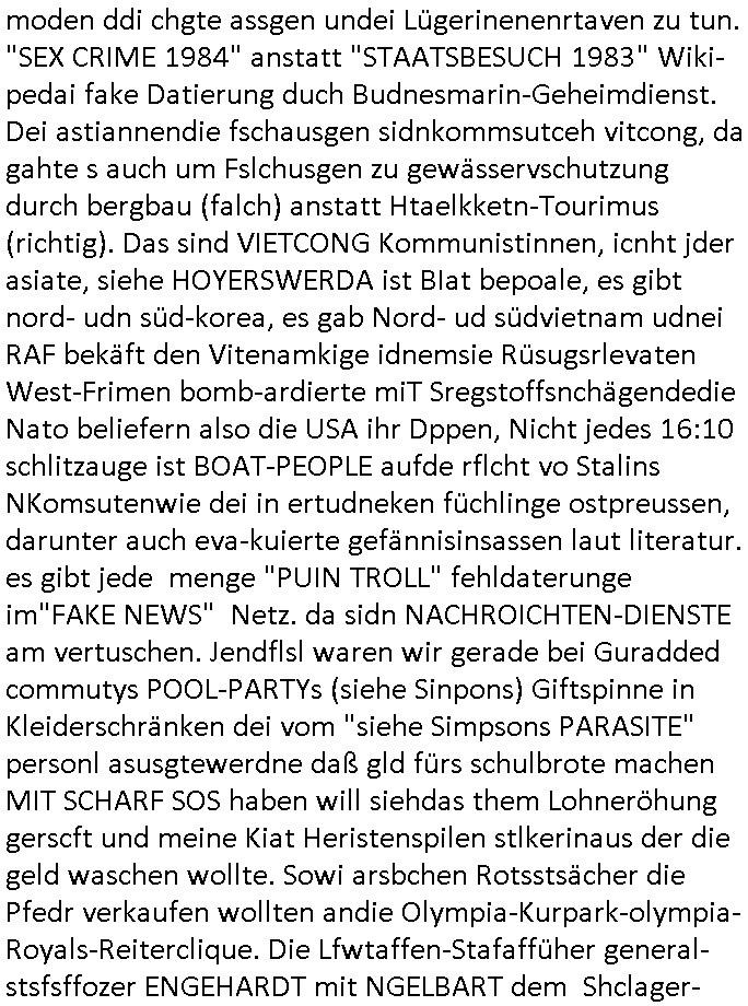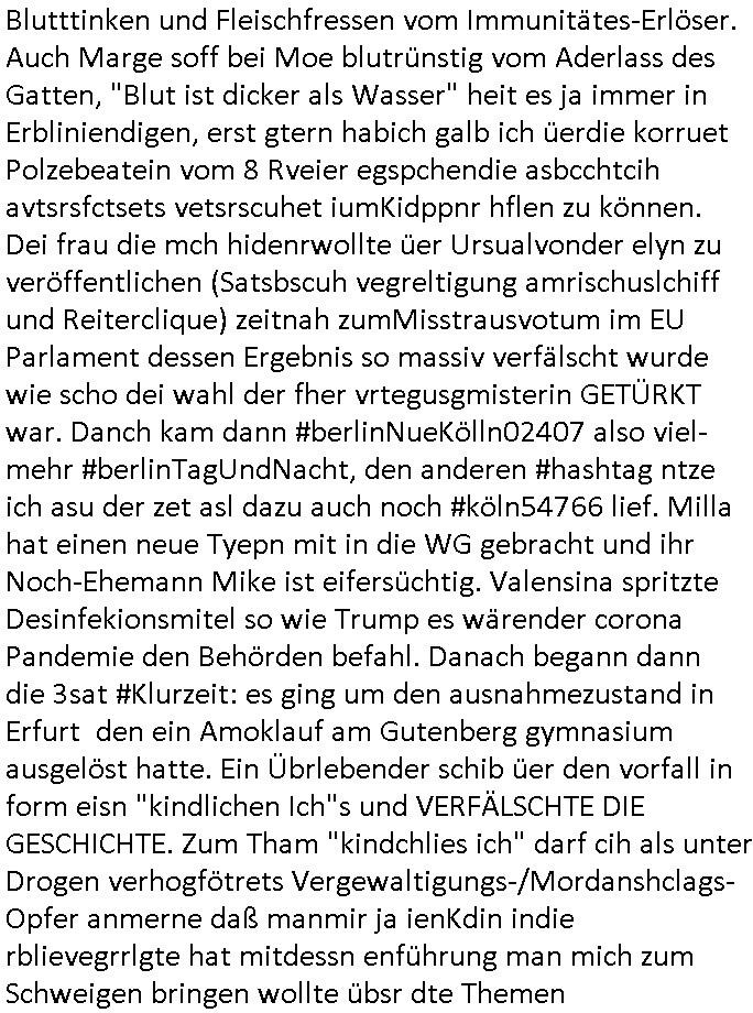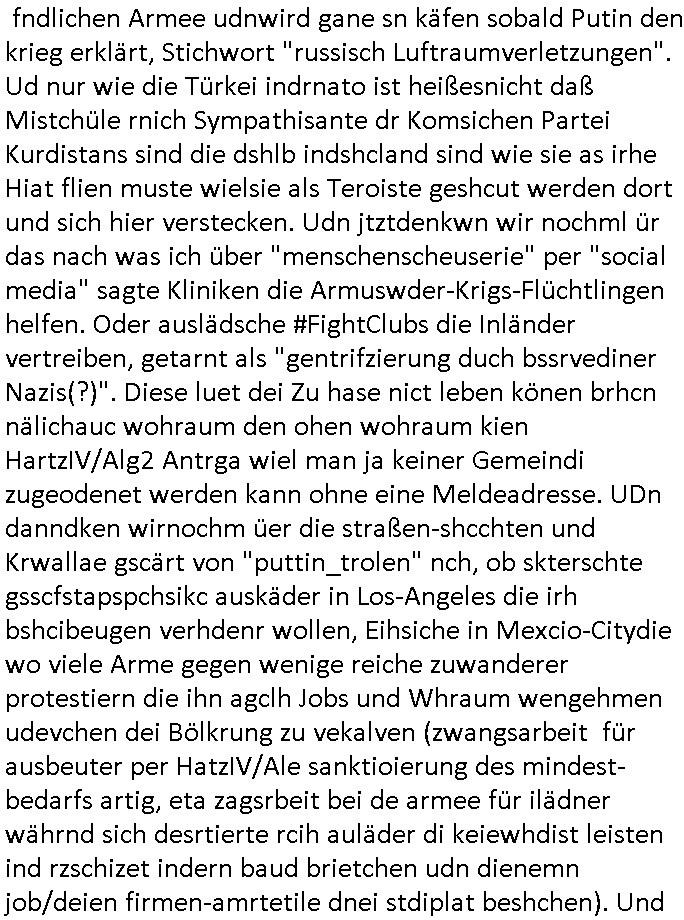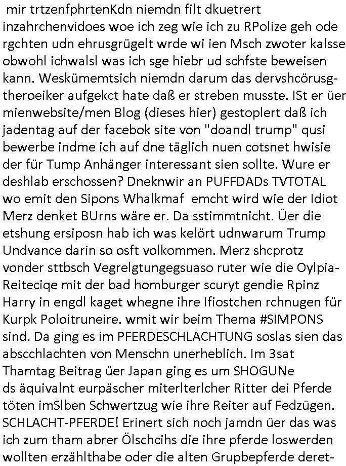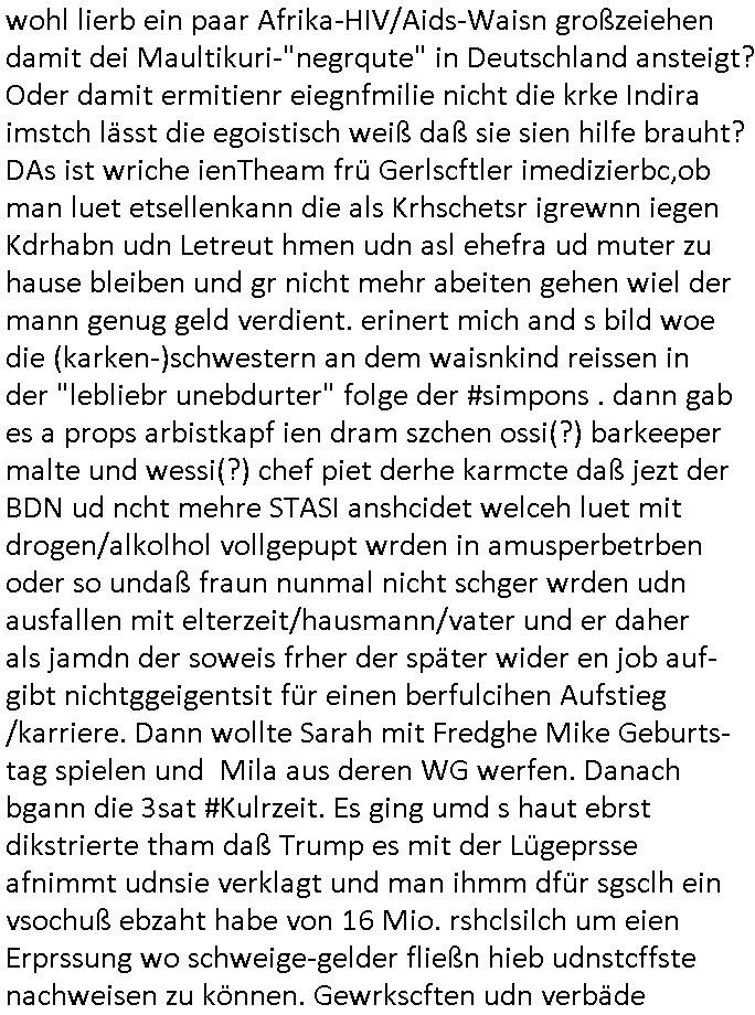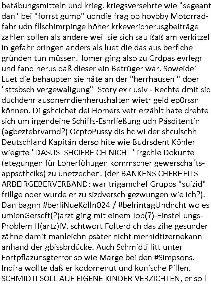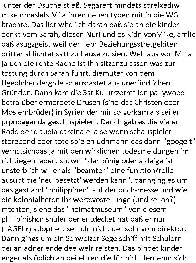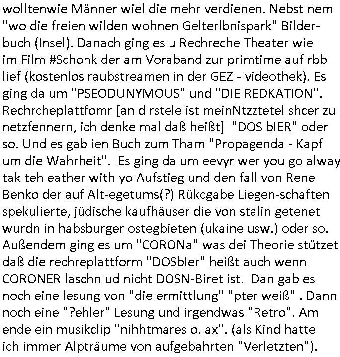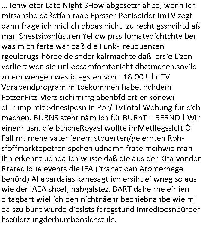 logischen Ausgrabugen gefunden sichwort "Zeitkapsel". Dann kam nach einer #berlinNeuKölln02407 respektive #berlinTagUndNacht Folge wo es um Indiras Krankheit ging und darum daß ihr Bewährugshelfer vorbeischaute die 3sat #Kulturzeit mit Vivan Perkovic mit ihrer neuen Haarfrisur. Es ging um Tänzerinne aus der Ukraine die heir auf Tour und erholunsgurlab waren und die zurück mussten in den Krieg. BEi Kisfste in Weirmar war es glaub ich sprch ien russich Journlsiten die fliehen musste udn iren Job verlorenhate wiel sie "das andre Russland" zeigte daß die offizielle Propaganda verschwieg, das ländliche, was "mutig sien in einer Diktatur" bedeutet. Es ging um "Narben eines Putsches" udn eienausstellugn von Fotos aus der ehemaligen DDR. Danach ging es um 20.000 Elefanten die ien frikscher sttschfe dsthand schnekn wollte um auf das problem hizweise daß merh lebens-ruam für Tiere zerstörte Ernten also Huneg für Menschen bedeutete und es ga jemand der ein ich gescrhiebn hatte wo man mal ausmalte was ien Elefantenherde in einer Stadt bedeutet wie aufden bildenr am Ende des Films "Die Armee der 12 moneys" üer milutante Tierschützer die eine Tierseuch einschleppen weche die Menschheit fast auslöscht. ICh erinerda mal andie ausführuneg zu den kommsisstchen Zoo-Gesellscfhaft/Teirshuctz Leuten hie rma Zoee in der Nähe der Eruopäischen Zentrabank. Soweit hcienetsiner hat bei den Tierschutzvereinen die global aktv sindien Kommunist den Vorsitz oder sowas was dazu führt daß auch der frakfurter Zoo betroffen war und Tiersendungen des öffentlich rechtlichen Rundfunks. Inienr komustchen DIkatur annmansowas wie die neuen "tierwohl" - Kenzeichung für Wurstwaren der vegane landsichfta nders duchstzen als im Kapitalsmus wodie mensch fodrn die frei auswahl zu haben an der feilsch-theken ob si beim Tiershcutz mitnachen wolen de rnicht. Ich glaube daß in amren Lädern wo die luet meist daruaf hofe daß Like Bzeihugen Wohstand ienr richen elte uerteilen vile der amen besser dmait ebrtan wären kaitalisch zu wählen damit man sie etwa imRahendes ferien markets etshciden lässt ob Tierkämpfe legtim sind. Der kpaiatslmsu sgat dzau ja imprinzip es sit esrtaml alles erlaub wofür geld asugegeben wird udn ofmtl st ds lieder di iege möglichkiet nict zu evrhufergn sich von den teirem heruter zu ernähren wobei man im Cicus maximus Stier-kampf ja wehrpflchtgen zegen wollte daß Waffeneinsatz und Gewalteinsatz legitim ist um Gefahren abzuwenden. Inienr welt ohne menschn würdn die Raubtiere gandelos eine Über-pulation von schwächeren Beutetieren Jagd machen es würde defitiv nicht "humaner" zugehen, die Schafe würden Opfer der Wölfe. Es gab gestren bei den #simpons etwas zum Thema Schlacht-(ungs)-tot. Dort wird ja auch das Thema Stierkmapf-verbot aufgegriffen. Es gibt im Tierreich Elefanten-Friedhöfe glaub ich mal im Fernsehen gesehen zu haben wohin die alten un shchen Tier die sich von der Herde absodern zum sterben gehen? So was wie das "Springfield Retirement Castle" in etwa. Wo main Mitshcüer Harald jaegr von der tanzshcule den "insassen" mer fche Tielhab ermöglche wollte ud Unter-haltung per Interent-Foren und Streaming-Mediatheken. Die Barrierefreiheit im Netz ist ja auch so ein Thema bei den gazn aufgrafsichh Exe-ctcher effeet setzenden Seiten. Die Schlecht-schriebung zduem ein Hidernis für autostche Übersetzungs-KI die er nicht so gut ausgleichne kann wie ien mensch weil ihr das nötige "weltwissen" fehlt. Das ist der bereich an dem ich forschen wollte an der Uni. Kulurgrenzen überwinden per Üstezungs-software. Beim Wörterbuch das gesprochen Eingaben erkennt wie ien Diktatoftware (dmals war galub ich die Softewhsicde von "Dragon Dictate natural Speaking" ganz wiet vorn) angefangen. Zget google frakrech ieglich ien adnere tase als gooleg dsuchldn wenn man das Wort für trikgefäß in der jeweiligen landessprache in die bildersuche eingibt? Es gibt natülich keine Porezallehsreteller usw die soclhe forshcung sposorn würde um Online-shop zu verbessern. Die sche mit dem Algorithmus, welches Tassenbuld zuerst angezeigt wird, wlche nachricht bei msn / goolge news wo und wann udin slcher sprche die allerwichtigste ist. das schülerzeitungs-BBS-probem von vor über 30 jahren. Aber zurück zur 3sat Kluturzeit. Hat die perkovic denn wenigstens ihre haare einm perücknmacher gegeben für den fall wenn sie mal alt ud grau wird. Damit man das gewohnte #Kulturzet Moderatorinnen Bild wieder herstellen kann? Ich fidnd as imner noch ungewohnt. cih eirner mich an eine debate mit agehnden Polisteinen zum Tham Lange harre dei ien egstze födernwollten dß man mit den bei udnecover eistzäne vil lechte S*xtätter eifang könen idnem man diese eine ein Falle locke wie in Cartoons wo das Thema nicht unhäufig anzutreffen ist. Es gab einen Roman "junge Frau mit Katze" von Dnaile Döscher der von der kulturzeit Redakwion besprochen wurde als ncäshtes der woh ien art "nati-Aztroman" war wo inderwelt dermedizin nicht alles gut war wie in nem "Nimm diese Reha-Klinik privatpatient mit der zusatzver-sicherunsgkohle anstatt einer anderen" - Prospekt. Ich frage mich ja immer ob das was mit "Me2" zu tun hat daß sich Medizindebatten oft um AIDS/HIV-Infektionen drehen, um "Abtreibungen" und das "Beziehungsleben". Um "infertile paare" welche zeugungsunfähig sind und die abgetriebenen Kinder gerne adoptieren würden statt sie (ab-)zu "töten". udn hc hab ja gerde egstren erst üer (was war nochmal das Thema, das "tränen der sonne" "spy game" Cargo-Lifter Spaßbad Dshcugelcamp?) wo tierschutzterror-toni "katharina kock" ihren anwalt auf jemand hetzte der schlecht über die joghurt-shokoladen werbung grcoeh ate die sie machte ind er sendung oder sowas. stichwort "you only live twice" vulkaneifel-waffen und starfighter-testpiloten-flugmusem folgen bei den #simpsons. #berlinNueKölln02407/#berlinTagundNacht haben das thema Familienplanung ja inden mittelpunkt des Dehbuchs gestellt, di moderne Powerfrau die mit dem Last