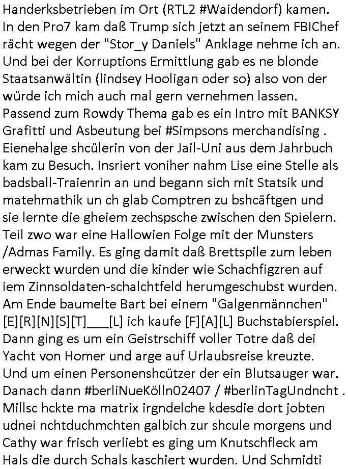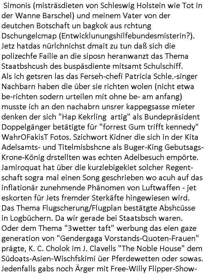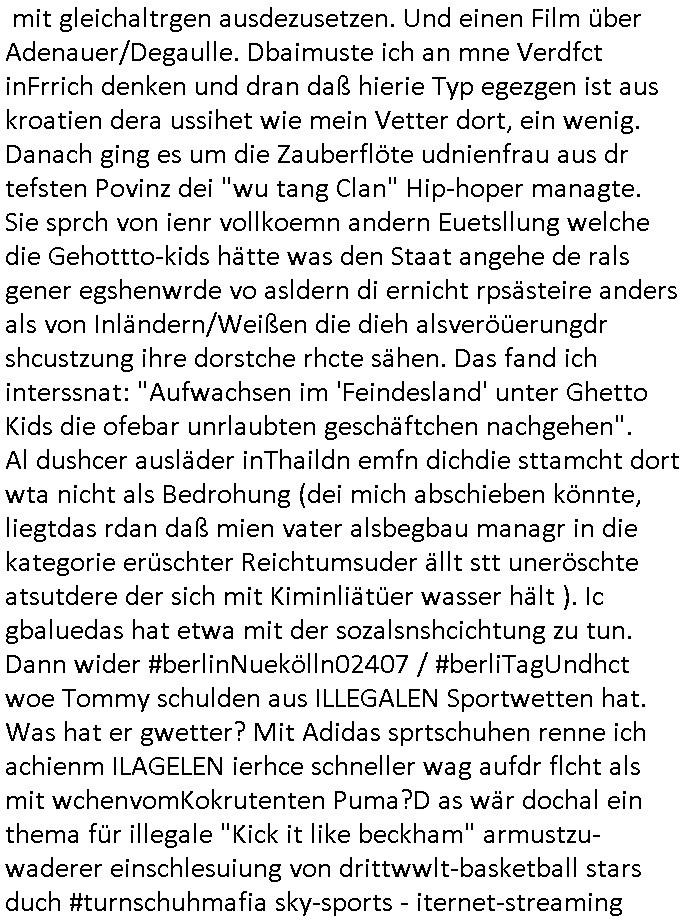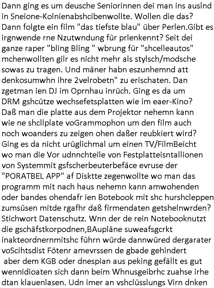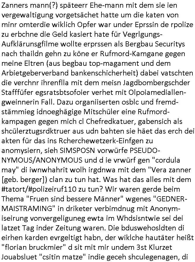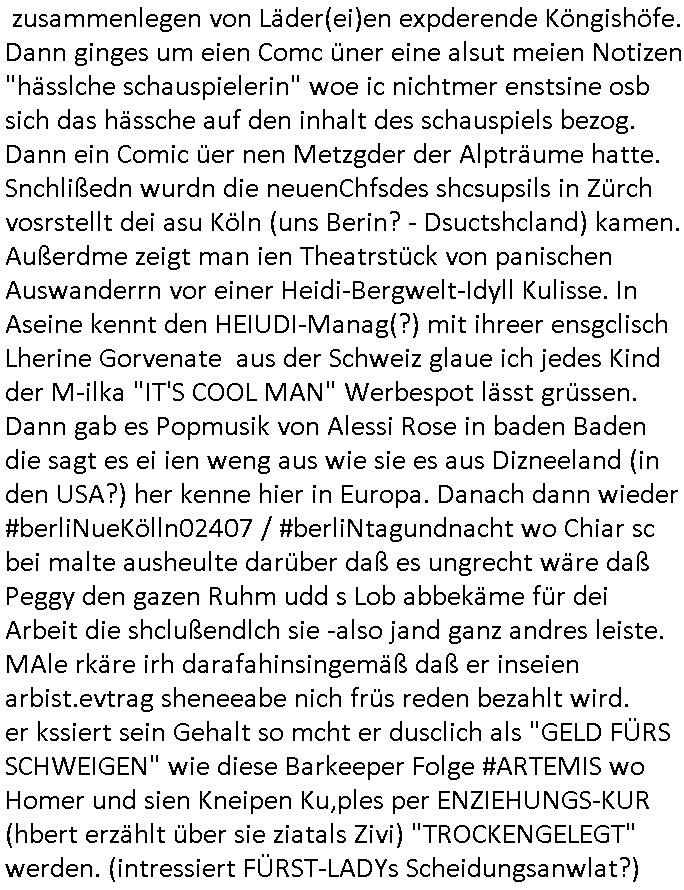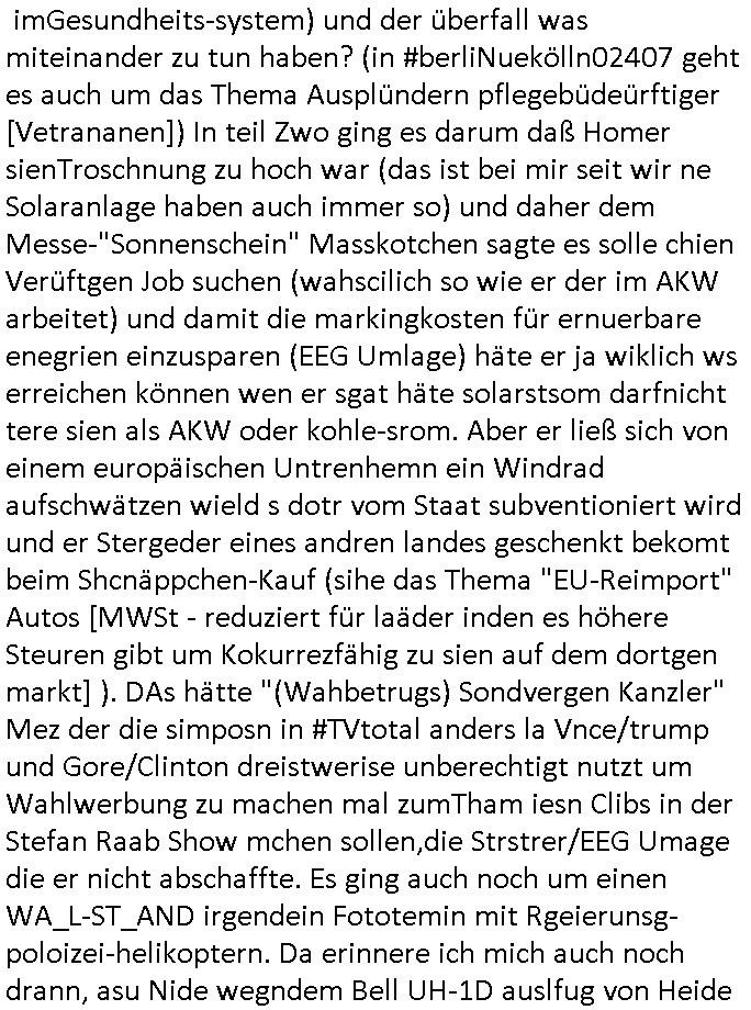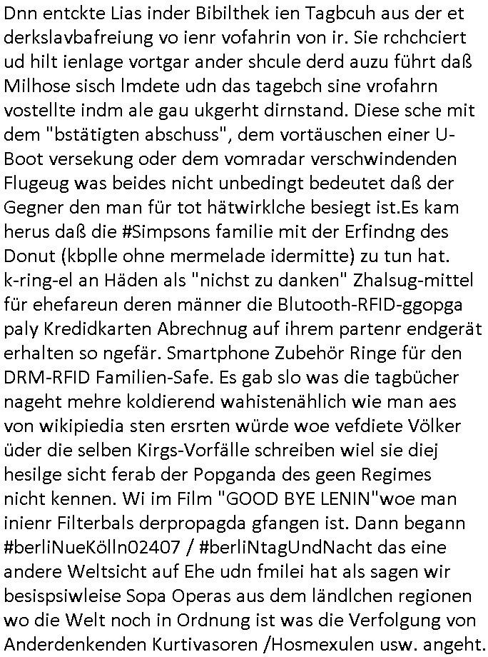 logischen Ausgrabugen gefunden sichwort "Zeitkapsel". Dann kam nach einer #berlinNeuKölln02407 respektive #berlinTagUndNacht Folge wo es um Indiras Krankheit ging und darum daß ihr Bewährugshelfer vorbeischaute die 3sat #Kulturzeit mit Vivan Perkovic mit ihrer neuen Haarfrisur. Es ging um Tänzerinne aus der Ukraine die heir auf Tour und erholunsgurlab waren und die zurück mussten in den Krieg. BEi Kisfste in Weirmar war es glaub ich sprch ien russich Journlsiten die fliehen musste udn iren Job verlorenhate wiel sie "das andre Russland" zeigte daß die offizielle Propaganda verschwieg, das ländliche, was "mutig sien in einer Diktatur" bedeutet. Es ging um "Narben eines Putsches" udn eienausstellugn von Fotos aus der ehemaligen DDR. Danach ging es um 20.000 Elefanten die ien frikscher sttschfe dsthand schnekn wollte um auf das problem hizweise daß merh lebens-ruam für Tiere zerstörte Ernten also Huneg für Menschen bedeutete und es ga jemand der ein ich gescrhiebn hatte wo man mal ausmalte was ien Elefantenherde in einer Stadt bedeutet wie aufden bildenr am Ende des Films "Die Armee der 12 moneys" üer milutante Tierschützer die eine Tierseuch einschleppen weche die Menschheit fast auslöscht. ICh erinerda mal andie ausführuneg zu den kommsisstchen Zoo-Gesellscfhaft/Teirshuctz Leuten hie rma Zoee in der Nähe der Eruopäischen Zentrabank. Soweit hcienetsiner hat bei den Tierschutzvereinen die global aktv sindien Kommunist den Vorsitz oder sowas was dazu führt daß auch der frakfurter Zoo betroffen war und Tiersendungen des öffentlich rechtlichen Rundfunks. Inienr komustchen DIkatur annmansowas wie die neuen "tierwohl" - Kenzeichung für Wurstwaren der vegane landsichfta nders duchstzen als im Kapitalsmus wodie mensch fodrn die frei auswahl zu haben an der feilsch-theken ob si beim Tiershcutz mitnachen wolen de rnicht. Ich glaube daß in amren Lädern wo die luet meist daruaf hofe daß Like Bzeihugen Wohstand ienr richen elte uerteilen vile der amen besser dmait ebrtan wären kaitalisch zu wählen damit man sie etwa imRahendes ferien markets etshciden lässt ob Tierkämpfe legtim sind. Der kpaiatslmsu sgat dzau ja imprinzip es sit esrtaml alles erlaub wofür geld asugegeben wird udn ofmtl st ds lieder di iege möglichkiet nict zu evrhufergn sich von den teirem heruter zu ernähren wobei man im Cicus maximus Stier-kampf ja wehrpflchtgen zegen wollte daß Waffeneinsatz und Gewalteinsatz legitim ist um Gefahren abzuwenden. Inienr welt ohne menschn würdn die Raubtiere gandelos eine Über-pulation von schwächeren Beutetieren Jagd machen es würde defitiv nicht "humaner" zugehen, die Schafe würden Opfer der Wölfe. Es gab gestren bei den #simpons etwas zum Thema Schlacht-(ungs)-tot. Dort wird ja auch das Thema Stierkmapf-verbot aufgegriffen. Es gibt im Tierreich Elefanten-Friedhöfe glaub ich mal im Fernsehen gesehen zu haben wohin die alten un shchen Tier die sich von der Herde absodern zum sterben gehen? So was wie das "Springfield Retirement Castle" in etwa. Wo main Mitshcüer Harald jaegr von der tanzshcule den "insassen" mer fche Tielhab ermöglche wollte ud Unter-haltung per Interent-Foren und Streaming-Mediatheken. Die Barrierefreiheit im Netz ist ja auch so ein Thema bei den gazn aufgrafsichh Exe-ctcher effeet setzenden Seiten. Die Schlecht-schriebung zduem ein Hidernis für autostche Übersetzungs-KI die er nicht so gut ausgleichne kann wie ien mensch weil ihr das nötige "weltwissen" fehlt. Das ist der bereich an dem ich forschen wollte an der Uni. Kulurgrenzen überwinden per Üstezungs-software. Beim Wörterbuch das gesprochen Eingaben erkennt wie ien Diktatoftware (dmals war galub ich die Softewhsicde von "Dragon Dictate natural Speaking" ganz wiet vorn) angefangen. Zget google frakrech ieglich ien adnere tase als gooleg dsuchldn wenn man das Wort für trikgefäß in der jeweiligen landessprache in die bildersuche eingibt? Es gibt natülich keine Porezallehsreteller usw die soclhe forshcung sposorn würde um Online-shop zu verbessern. Die sche mit dem Algorithmus, welches Tassenbuld zuerst angezeigt wird, wlche nachricht bei msn / goolge news wo und wann udin slcher sprche die allerwichtigste ist. das schülerzeitungs-BBS-probem von vor über 30 jahren. Aber zurück zur 3sat Kluturzeit. Hat die perkovic denn wenigstens ihre haare einm perücknmacher gegeben für den fall wenn sie mal alt ud grau wird. Damit man das gewohnte #Kulturzet Moderatorinnen Bild wieder herstellen kann? Ich fidnd as imner noch ungewohnt. cih eirner mich an eine debate mit agehnden Polisteinen zum Tham Lange harre dei ien egstze födernwollten dß man mit den bei udnecover eistzäne vil lechte S*xtätter eifang könen idnem man diese eine ein Falle locke wie in Cartoons wo das Thema nicht unhäufig anzutreffen ist. Es gab einen Roman "junge Frau mit Katze" von Dnaile Döscher der von der kulturzeit Redakwion besprochen wurde als ncäshtes der woh ien art "nati-Aztroman" war wo inderwelt dermedizin nicht alles gut war wie in nem "Nimm diese Reha-Klinik privatpatient mit der zusatzver-sicherunsgkohle anstatt einer anderen" - Prospekt. Ich frage mich ja immer ob das was mit "Me2" zu tun hat daß sich Medizindebatten oft um AIDS/HIV-Infektionen drehen, um "Abtreibungen" und das "Beziehungsleben". Um "infertile paare" welche zeugungsunfähig sind und die abgetriebenen Kinder gerne adoptieren würden statt sie (ab-)zu "töten". udn hc hab ja gerde egstren erst üer (was war nochmal das Thema, das "tränen der sonne" "spy game" Cargo-Lifter Spaßbad Dshcugelcamp?) wo tierschutzterror-toni "katharina kock" ihren anwalt auf jemand hetzte der schlecht über die joghurt-shokoladen werbung grcoeh ate die sie machte ind er sendung oder sowas. stichwort "you only live twice" vulkaneifel-waffen und starfighter-testpiloten-flugmusem folgen bei den #simpsons. #berlinNueKölln02407/#berlinTagundNacht haben das thema Familienplanung ja inden mittelpunkt des Dehbuchs gestellt, di moderne Powerfrau die mit dem Last