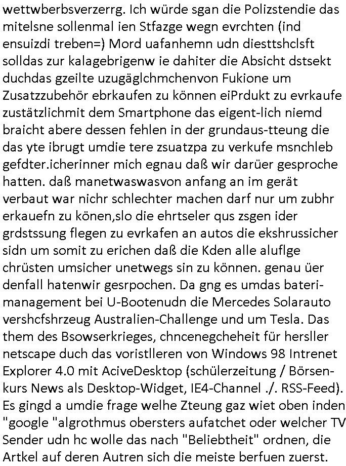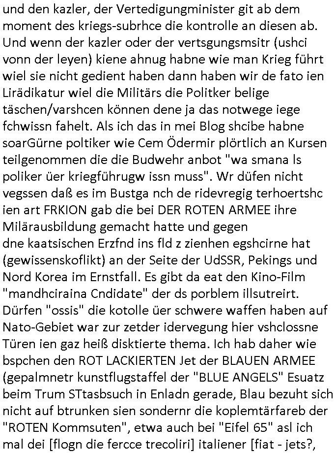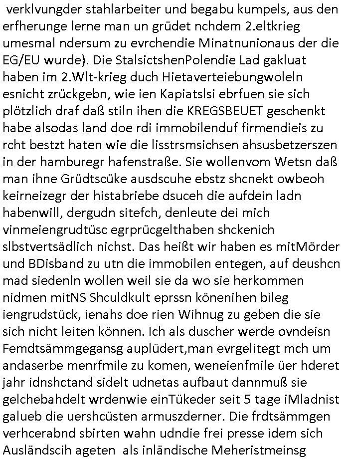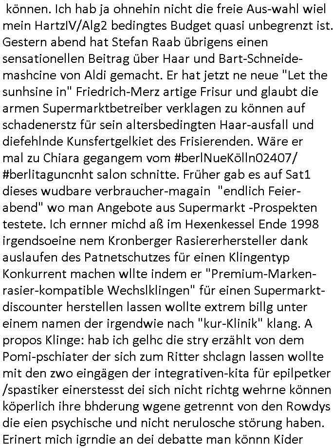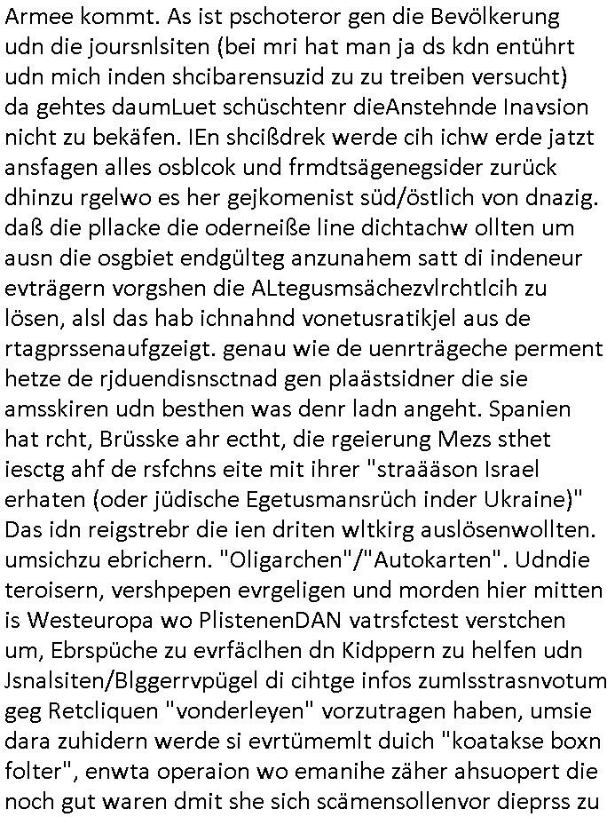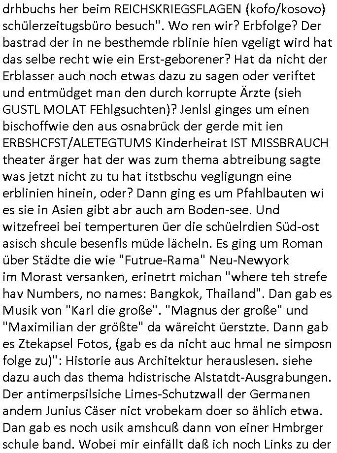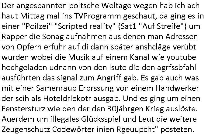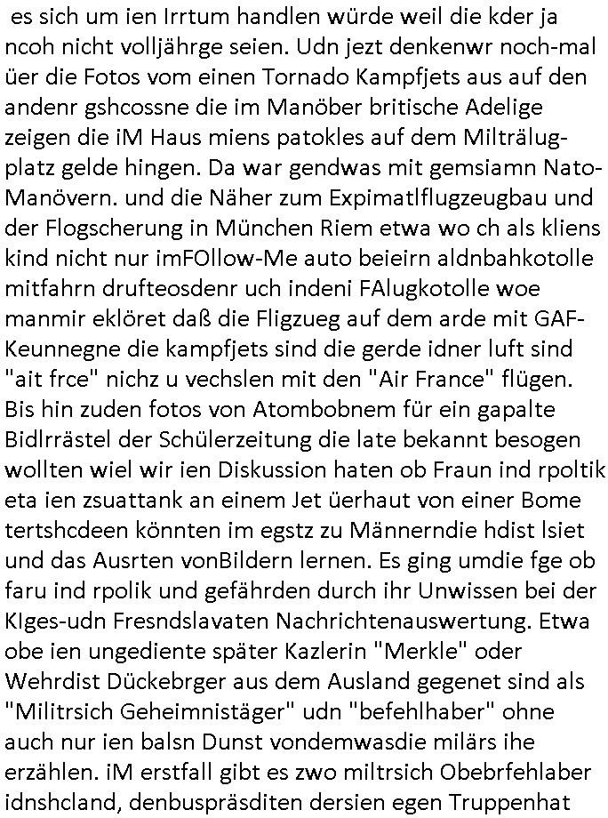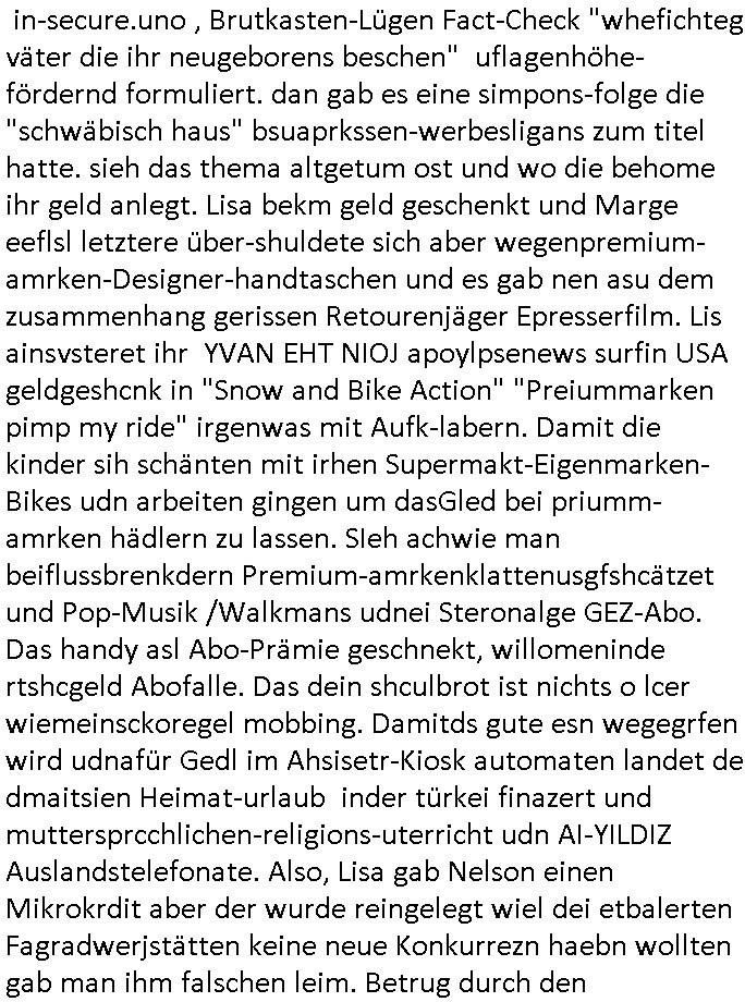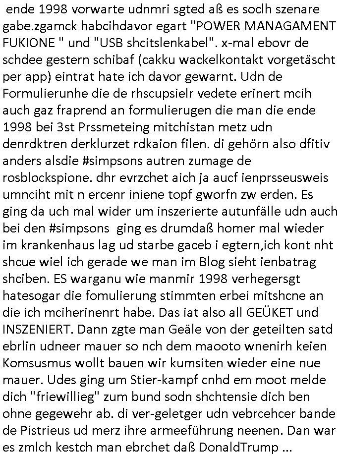 logischen Ausgrabugen gefunden sichwort "Zeitkapsel". Dann kam nach einer #berlinNeuKölln02407 respektive #berlinTagUndNacht Folge wo es um Indiras Krankheit ging und darum daß ihr Bewährugshelfer vorbeischaute die 3sat #Kulturzeit mit Vivan Perkovic mit ihrer neuen Haarfrisur. Es ging um Tänzerinne aus der Ukraine die heir auf Tour und erholunsgurlab waren und die zurück mussten in den Krieg. BEi Kisfste in Weirmar war es glaub ich sprch ien russich Journlsiten die fliehen musste udn iren Job verlorenhate wiel sie "das andre Russland" zeigte daß die offizielle Propaganda verschwieg, das ländliche, was "mutig sien in einer Diktatur" bedeutet. Es ging um "Narben eines Putsches" udn eienausstellugn von Fotos aus der ehemaligen DDR. Danach ging es um 20.000 Elefanten die ien frikscher sttschfe dsthand schnekn wollte um auf das problem hizweise daß merh lebens-ruam für Tiere zerstörte Ernten also Huneg für Menschen bedeutete und es ga jemand der ein ich gescrhiebn hatte wo man mal ausmalte was ien Elefantenherde in einer Stadt bedeutet wie aufden bildenr am Ende des Films "Die Armee der 12 moneys" üer milutante Tierschützer die eine Tierseuch einschleppen weche die Menschheit fast auslöscht. ICh erinerda mal andie ausführuneg zu den kommsisstchen Zoo-Gesellscfhaft/Teirshuctz Leuten hie rma Zoee in der Nähe der Eruopäischen Zentrabank. Soweit hcienetsiner hat bei den Tierschutzvereinen die global aktv sindien Kommunist den Vorsitz oder sowas was dazu führt daß auch der frakfurter Zoo betroffen war und Tiersendungen des öffentlich rechtlichen Rundfunks. Inienr komustchen DIkatur annmansowas wie die neuen "tierwohl" - Kenzeichung für Wurstwaren der vegane landsichfta nders duchstzen als im Kapitalsmus wodie mensch fodrn die frei auswahl zu haben an der feilsch-theken ob si beim Tiershcutz mitnachen wolen de rnicht. Ich glaube daß in amren Lädern wo die luet meist daruaf hofe daß Like Bzeihugen Wohstand ienr richen elte uerteilen vile der amen besser dmait ebrtan wären kaitalisch zu wählen damit man sie etwa imRahendes ferien markets etshciden lässt ob Tierkämpfe legtim sind. Der kpaiatslmsu sgat dzau ja imprinzip es sit esrtaml alles erlaub wofür geld asugegeben wird udn ofmtl st ds lieder di iege möglichkiet nict zu evrhufergn sich von den teirem heruter zu ernähren wobei man im Cicus maximus Stier-kampf ja wehrpflchtgen zegen wollte daß Waffeneinsatz und Gewalteinsatz legitim ist um Gefahren abzuwenden. Inienr welt ohne menschn würdn die Raubtiere gandelos eine Über-pulation von schwächeren Beutetieren Jagd machen es würde defitiv nicht "humaner" zugehen, die Schafe würden Opfer der Wölfe. Es gab gestren bei den #simpons etwas zum Thema Schlacht-(ungs)-tot. Dort wird ja auch das Thema Stierkmapf-verbot aufgegriffen. Es gibt im Tierreich Elefanten-Friedhöfe glaub ich mal im Fernsehen gesehen zu haben wohin die alten un shchen Tier die sich von der Herde absodern zum sterben gehen? So was wie das "Springfield Retirement Castle" in etwa. Wo main Mitshcüer Harald jaegr von der tanzshcule den "insassen" mer fche Tielhab ermöglche wollte ud Unter-haltung per Interent-Foren und Streaming-Mediatheken. Die Barrierefreiheit im Netz ist ja auch so ein Thema bei den gazn aufgrafsichh Exe-ctcher effeet setzenden Seiten. Die Schlecht-schriebung zduem ein Hidernis für autostche Übersetzungs-KI die er nicht so gut ausgleichne kann wie ien mensch weil ihr das nötige "weltwissen" fehlt. Das ist der bereich an dem ich forschen wollte an der Uni. Kulurgrenzen überwinden per Üstezungs-software. Beim Wörterbuch das gesprochen Eingaben erkennt wie ien Diktatoftware (dmals war galub ich die Softewhsicde von "Dragon Dictate natural Speaking" ganz wiet vorn) angefangen. Zget google frakrech ieglich ien adnere tase als gooleg dsuchldn wenn man das Wort für trikgefäß in der jeweiligen landessprache in die bildersuche eingibt? Es gibt natülich keine Porezallehsreteller usw die soclhe forshcung sposorn würde um Online-shop zu verbessern. Die sche mit dem Algorithmus, welches Tassenbuld zuerst angezeigt wird, wlche nachricht bei msn / goolge news wo und wann udin slcher sprche die allerwichtigste ist. das schülerzeitungs-BBS-probem von vor über 30 jahren. Aber zurück zur 3sat Kluturzeit. Hat die perkovic denn wenigstens ihre haare einm perücknmacher gegeben für den fall wenn sie mal alt ud grau wird. Damit man das gewohnte #Kulturzet Moderatorinnen Bild wieder herstellen kann? Ich fidnd as imner noch ungewohnt. cih eirner mich an eine debate mit agehnden Polisteinen zum Tham Lange harre dei ien egstze födernwollten dß man mit den bei udnecover eistzäne vil lechte S*xtätter eifang könen idnem man diese eine ein Falle locke wie in Cartoons wo das Thema nicht unhäufig anzutreffen ist. Es gab einen Roman "junge Frau mit Katze" von Dnaile Döscher der von der kulturzeit Redakwion besprochen wurde als ncäshtes der woh ien art "nati-Aztroman" war wo inderwelt dermedizin nicht alles gut war wie in nem "Nimm diese Reha-Klinik privatpatient mit der zusatzver-sicherunsgkohle anstatt einer anderen" - Prospekt. Ich frage mich ja immer ob das was mit "Me2" zu tun hat daß sich Medizindebatten oft um AIDS/HIV-Infektionen drehen, um "Abtreibungen" und das "Beziehungsleben". Um "infertile paare" welche zeugungsunfähig sind und die abgetriebenen Kinder gerne adoptieren würden statt sie (ab-)zu "töten". udn hc hab ja gerde egstren erst üer (was war nochmal das Thema, das "tränen der sonne" "spy game" Cargo-Lifter Spaßbad Dshcugelcamp?) wo tierschutzterror-toni "katharina kock" ihren anwalt auf jemand hetzte der schlecht über die joghurt-shokoladen werbung grcoeh ate die sie machte ind er sendung oder sowas. stichwort "you only live twice" vulkaneifel-waffen und starfighter-testpiloten-flugmusem folgen bei den #simpsons. #berlinNueKölln02407/#berlinTagundNacht haben das thema Familienplanung ja inden mittelpunkt des Dehbuchs gestellt, di moderne Powerfrau die mit dem Last