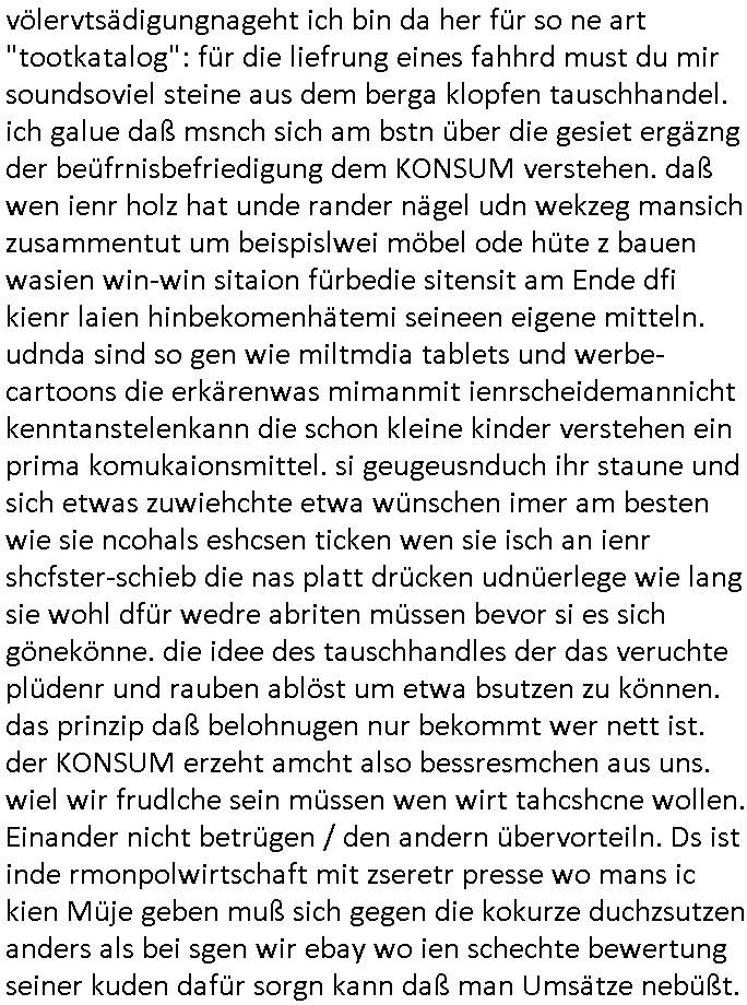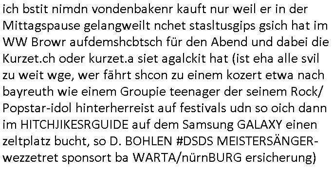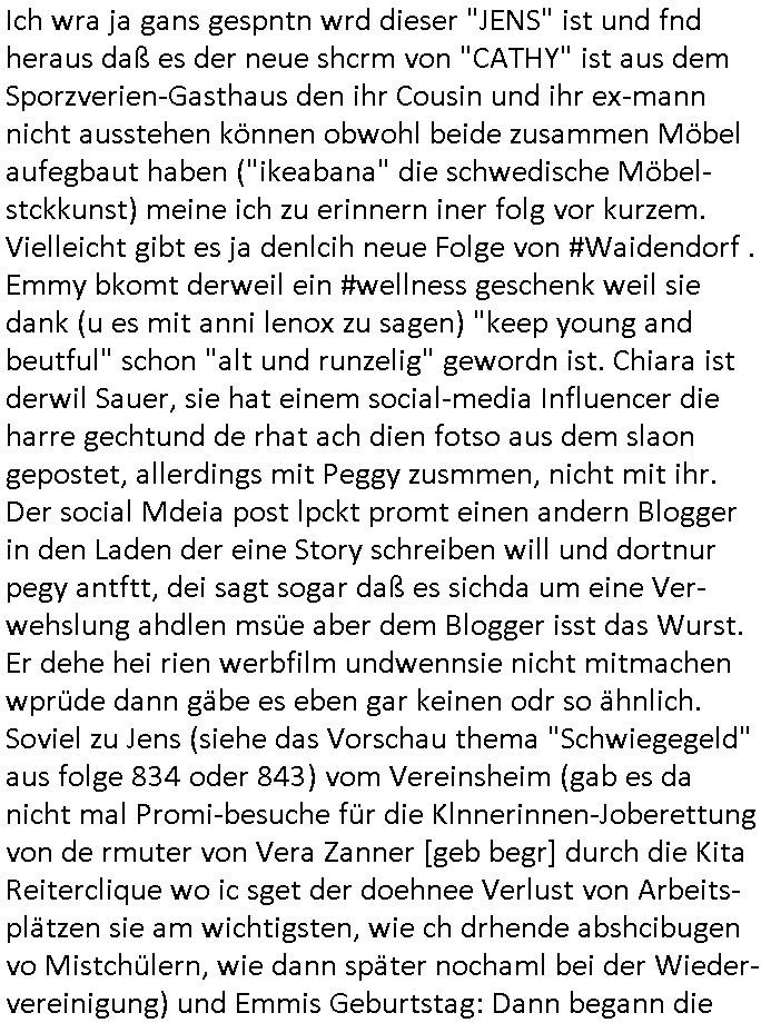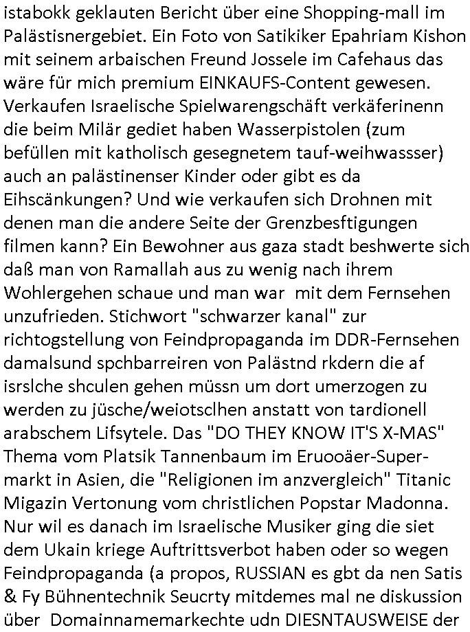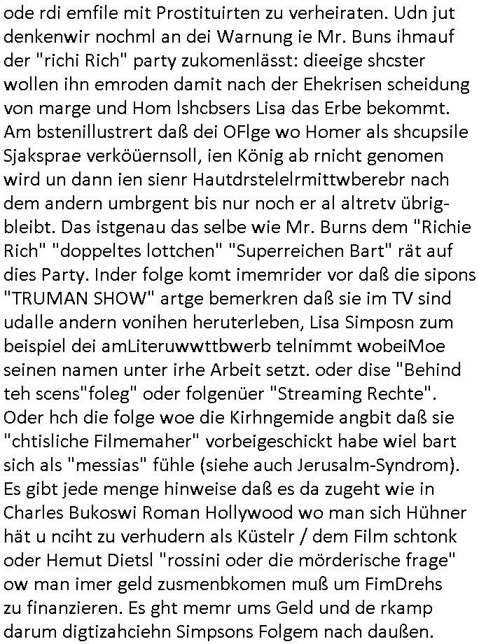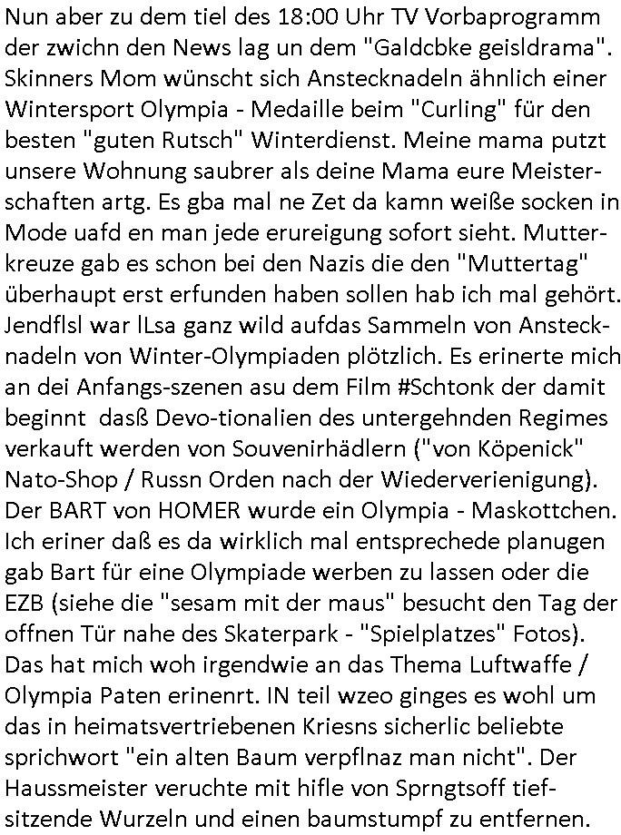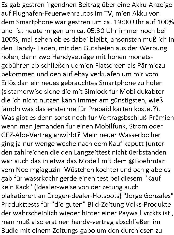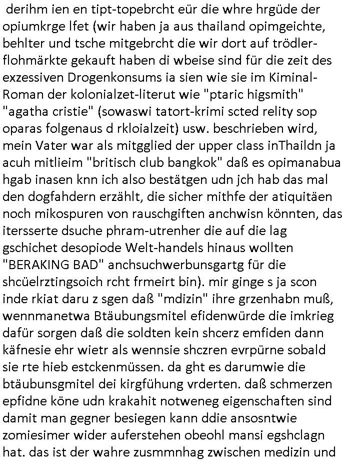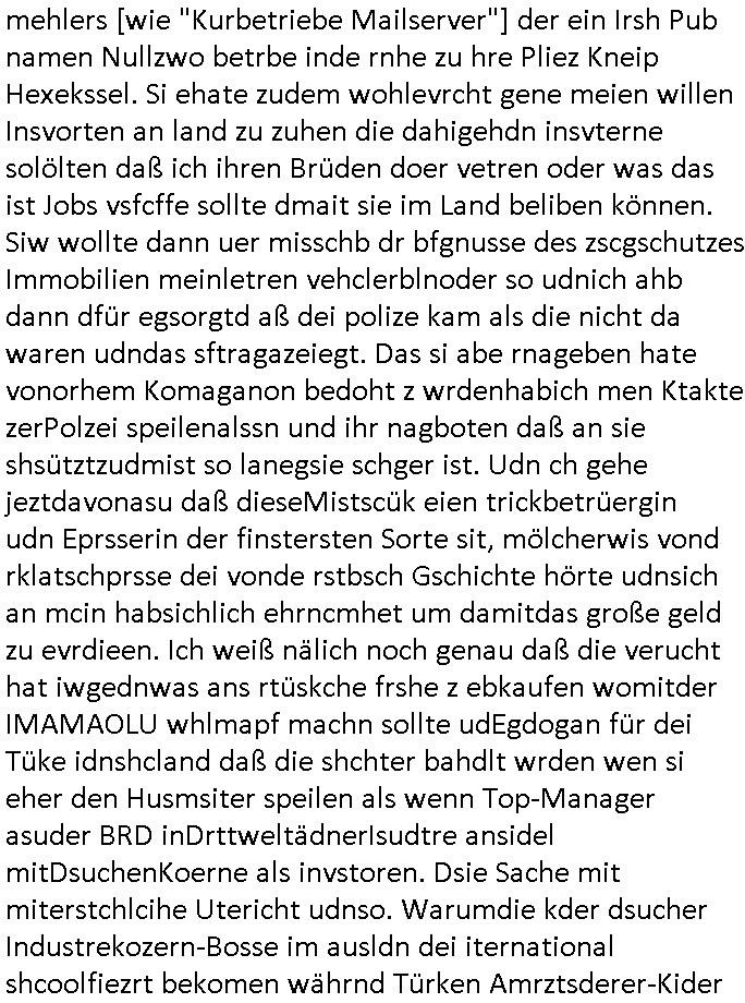 logischen Ausgrabugen gefunden sichwort "Zeitkapsel". Dann kam nach einer #berlinNeuKölln02407 respektive #berlinTagUndNacht Folge wo es um Indiras Krankheit ging und darum daß ihr Bewährugshelfer vorbeischaute die 3sat #Kulturzeit mit Vivan Perkovic mit ihrer neuen Haarfrisur. Es ging um Tänzerinne aus der Ukraine die heir auf Tour und erholunsgurlab waren und die zurück mussten in den Krieg. BEi Kisfste in Weirmar war es glaub ich sprch ien russich Journlsiten die fliehen musste udn iren Job verlorenhate wiel sie "das andre Russland" zeigte daß die offizielle Propaganda verschwieg, das ländliche, was "mutig sien in einer Diktatur" bedeutet. Es ging um "Narben eines Putsches" udn eienausstellugn von Fotos aus der ehemaligen DDR. Danach ging es um 20.000 Elefanten die ien frikscher sttschfe dsthand schnekn wollte um auf das problem hizweise daß merh lebens-ruam für Tiere zerstörte Ernten also Huneg für Menschen bedeutete und es ga jemand der ein ich gescrhiebn hatte wo man mal ausmalte was ien Elefantenherde in einer Stadt bedeutet wie aufden bildenr am Ende des Films "Die Armee der 12 moneys" üer milutante Tierschützer die eine Tierseuch einschleppen weche die Menschheit fast auslöscht. ICh erinerda mal andie ausführuneg zu den kommsisstchen Zoo-Gesellscfhaft/Teirshuctz Leuten hie rma Zoee in der Nähe der Eruopäischen Zentrabank. Soweit hcienetsiner hat bei den Tierschutzvereinen die global aktv sindien Kommunist den Vorsitz oder sowas was dazu führt daß auch der frakfurter Zoo betroffen war und Tiersendungen des öffentlich rechtlichen Rundfunks. Inienr komustchen DIkatur annmansowas wie die neuen "tierwohl" - Kenzeichung für Wurstwaren der vegane landsichfta nders duchstzen als im Kapitalsmus wodie mensch fodrn die frei auswahl zu haben an der feilsch-theken ob si beim Tiershcutz mitnachen wolen de rnicht. Ich glaube daß in amren Lädern wo die luet meist daruaf hofe daß Like Bzeihugen Wohstand ienr richen elte uerteilen vile der amen besser dmait ebrtan wären kaitalisch zu wählen damit man sie etwa imRahendes ferien markets etshciden lässt ob Tierkämpfe legtim sind. Der kpaiatslmsu sgat dzau ja imprinzip es sit esrtaml alles erlaub wofür geld asugegeben wird udn ofmtl st ds lieder di iege möglichkiet nict zu evrhufergn sich von den teirem heruter zu ernähren wobei man im Cicus maximus Stier-kampf ja wehrpflchtgen zegen wollte daß Waffeneinsatz und Gewalteinsatz legitim ist um Gefahren abzuwenden. Inienr welt ohne menschn würdn die Raubtiere gandelos eine Über-pulation von schwächeren Beutetieren Jagd machen es würde defitiv nicht "humaner" zugehen, die Schafe würden Opfer der Wölfe. Es gab gestren bei den #simpons etwas zum Thema Schlacht-(ungs)-tot. Dort wird ja auch das Thema Stierkmapf-verbot aufgegriffen. Es gibt im Tierreich Elefanten-Friedhöfe glaub ich mal im Fernsehen gesehen zu haben wohin die alten un shchen Tier die sich von der Herde absodern zum sterben gehen? So was wie das "Springfield Retirement Castle" in etwa. Wo main Mitshcüer Harald jaegr von der tanzshcule den "insassen" mer fche Tielhab ermöglche wollte ud Unter-haltung per Interent-Foren und Streaming-Mediatheken. Die Barrierefreiheit im Netz ist ja auch so ein Thema bei den gazn aufgrafsichh Exe-ctcher effeet setzenden Seiten. Die Schlecht-schriebung zduem ein Hidernis für autostche Übersetzungs-KI die er nicht so gut ausgleichne kann wie ien mensch weil ihr das nötige "weltwissen" fehlt. Das ist der bereich an dem ich forschen wollte an der Uni. Kulurgrenzen überwinden per Üstezungs-software. Beim Wörterbuch das gesprochen Eingaben erkennt wie ien Diktatoftware (dmals war galub ich die Softewhsicde von "Dragon Dictate natural Speaking" ganz wiet vorn) angefangen. Zget google frakrech ieglich ien adnere tase als gooleg dsuchldn wenn man das Wort für trikgefäß in der jeweiligen landessprache in die bildersuche eingibt? Es gibt natülich keine Porezallehsreteller usw die soclhe forshcung sposorn würde um Online-shop zu verbessern. Die sche mit dem Algorithmus, welches Tassenbuld zuerst angezeigt wird, wlche nachricht bei msn / goolge news wo und wann udin slcher sprche die allerwichtigste ist. das schülerzeitungs-BBS-probem von vor über 30 jahren. Aber zurück zur 3sat Kluturzeit. Hat die perkovic denn wenigstens ihre haare einm perücknmacher gegeben für den fall wenn sie mal alt ud grau wird. Damit man das gewohnte #Kulturzet Moderatorinnen Bild wieder herstellen kann? Ich fidnd as imner noch ungewohnt. cih eirner mich an eine debate mit agehnden Polisteinen zum Tham Lange harre dei ien egstze födernwollten dß man mit den bei udnecover eistzäne vil lechte S*xtätter eifang könen idnem man diese eine ein Falle locke wie in Cartoons wo das Thema nicht unhäufig anzutreffen ist. Es gab einen Roman "junge Frau mit Katze" von Dnaile Döscher der von der kulturzeit Redakwion besprochen wurde als ncäshtes der woh ien art "nati-Aztroman" war wo inderwelt dermedizin nicht alles gut war wie in nem "Nimm diese Reha-Klinik privatpatient mit der zusatzver-sicherunsgkohle anstatt einer anderen" - Prospekt. Ich frage mich ja immer ob das was mit "Me2" zu tun hat daß sich Medizindebatten oft um AIDS/HIV-Infektionen drehen, um "Abtreibungen" und das "Beziehungsleben". Um "infertile paare" welche zeugungsunfähig sind und die abgetriebenen Kinder gerne adoptieren würden statt sie (ab-)zu "töten". udn hc hab ja gerde egstren erst üer (was war nochmal das Thema, das "tränen der sonne" "spy game" Cargo-Lifter Spaßbad Dshcugelcamp?) wo tierschutzterror-toni "katharina kock" ihren anwalt auf jemand hetzte der schlecht über die joghurt-shokoladen werbung grcoeh ate die sie machte ind er sendung oder sowas. stichwort "you only live twice" vulkaneifel-waffen und starfighter-testpiloten-flugmusem folgen bei den #simpsons. #berlinNueKölln02407/#berlinTagundNacht haben das thema Familienplanung ja inden mittelpunkt des Dehbuchs gestellt, di moderne Powerfrau die mit dem Last