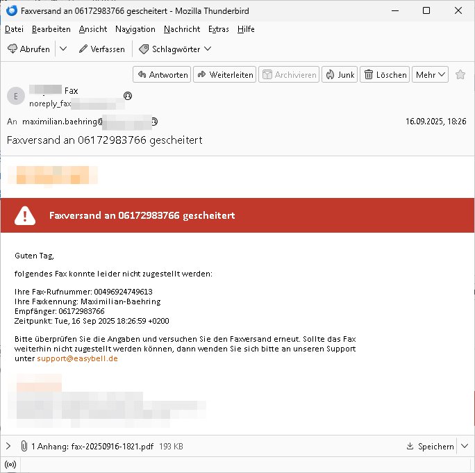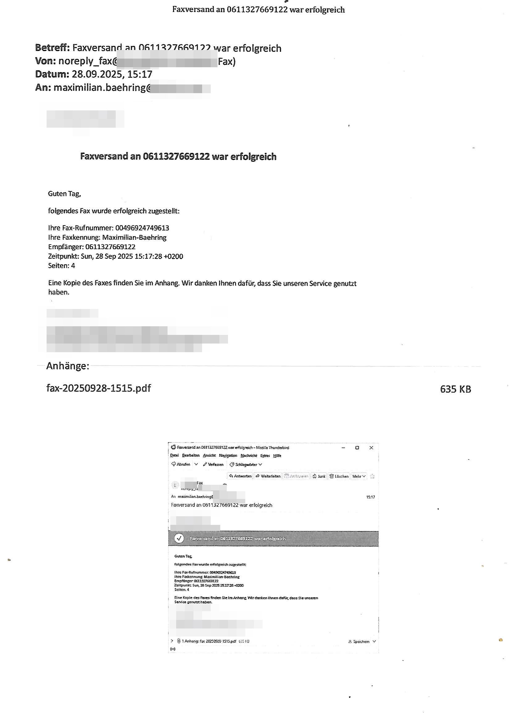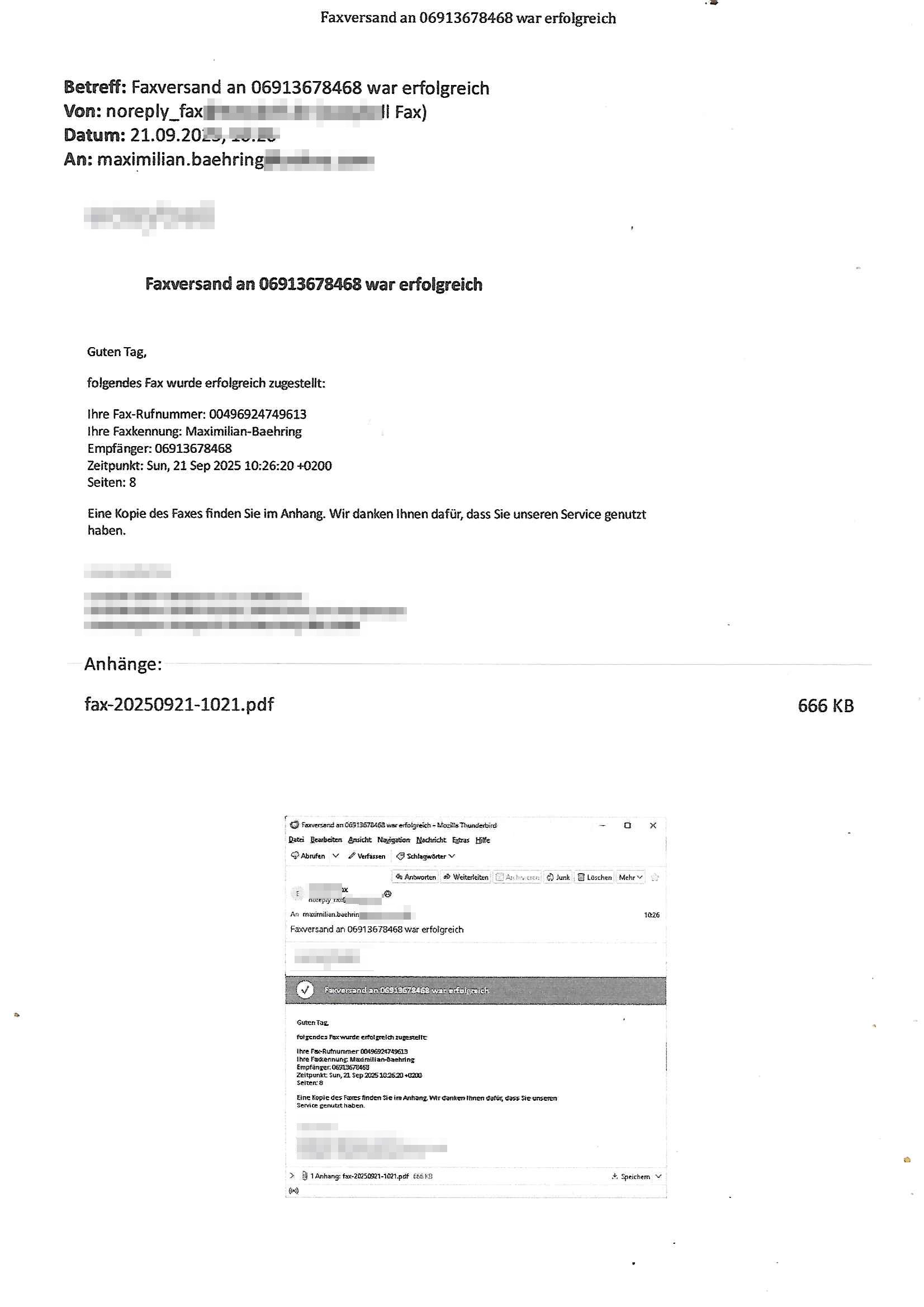 Betreff: Faxversand an 06913676496 war erfolgreich Datum: Mon, 01 Sep 2025 06:53:43 +0000 (UTC) Von: Fax <noreply_fax@> An: maximilian.baehring@ Web2Fax Faxversand an 06913676496 war erfolgreich Guten Tag, folgendes Fax wurde erfolgreich zugestellt: Ihre Fax-Rufnummer: 00496924749613 Ihre Faxkennung: Maximilian-Baehring Empfänger: 06913676496 Zeitpunkt: Mon, 1 Sep 2025 08:53:43 +0200 Seiten: 6 Eine Kopie des Faxes finden Sie im Anhang. Wir danken Ihnen dafür, dass Sie unseren Service genutzt haben. | |