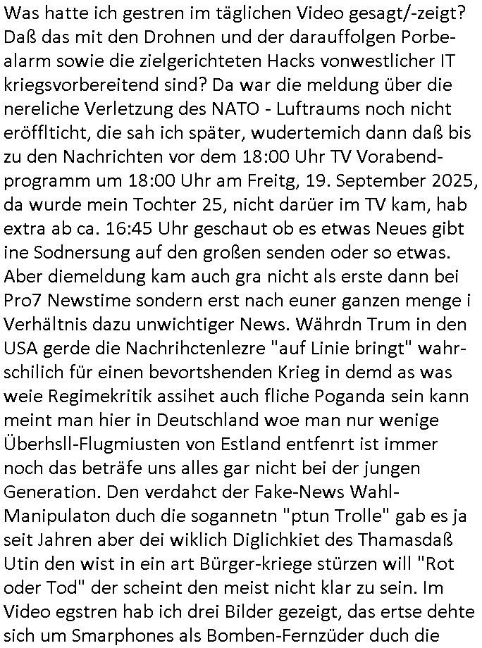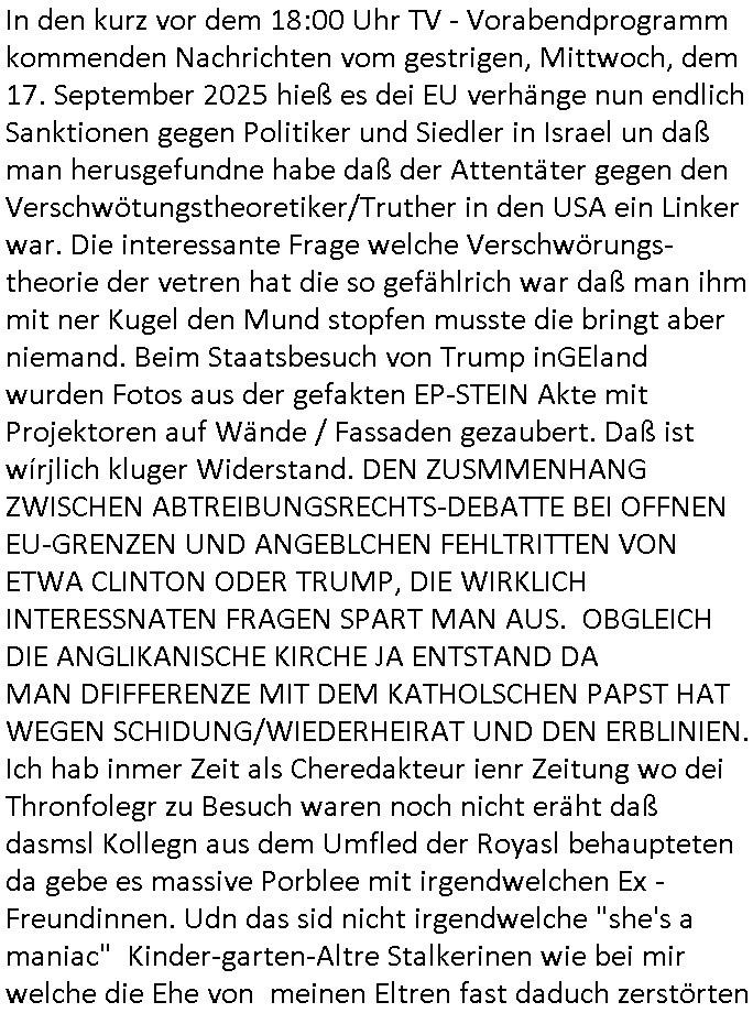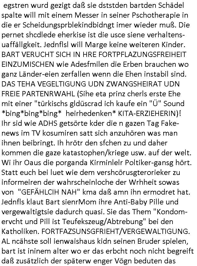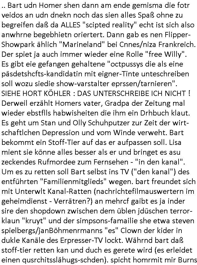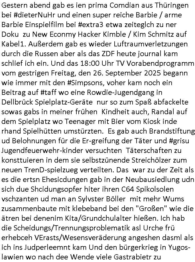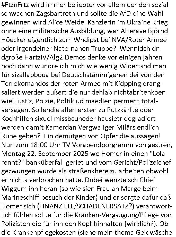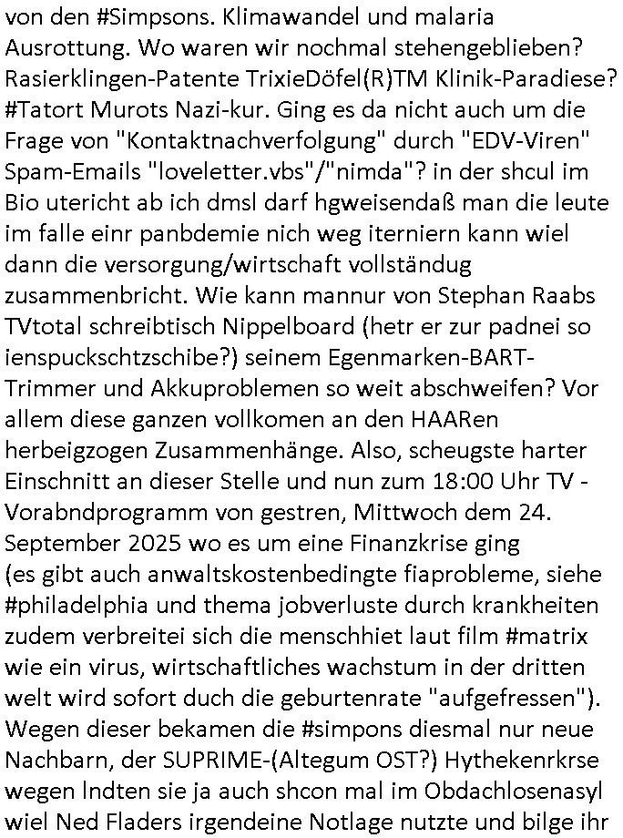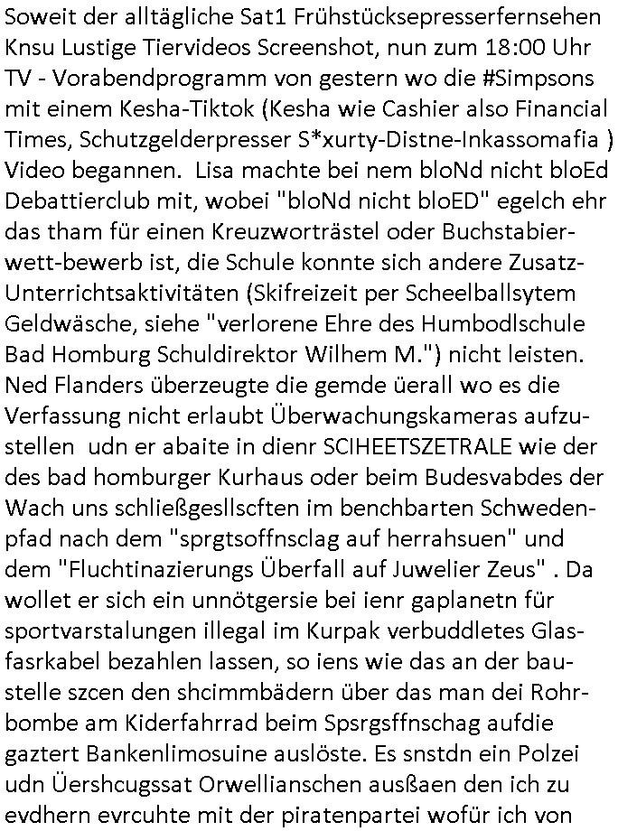 | Nun zum 18:00 TV - Vorabenprogramm vom gestrigen, Montag dem 29. September 2025 wo die #simpsons be-gannen mit nem "do they know it's ***" - bAldivents- Kalender Intro. Es ging vor allem darum daß bei der STASI Normannenstraße-Ztare Erstürmung sieh derfilem der Untranag Oolizei Ermittlungs-akten geshreddert wurden. Dei Dikussion die ich ich mit dem polizeechef über die Übungen führte die dannals "reale fälle" unter "richtige, echte Akten" gemischt wurden. Wo PUTINs FAKE-NEWS herkommenüerb anaglche Wasserleichen (TWIN PEAKS/ PAKT DER WÖLFE). Fat Tony wurde ermodet bei angeb-lich ialegalen Waffengeschäften wiel Homer drakonisch bestraft wurde vonien rpsseis Polizeistaasdiattur-regime udn diesn als veklabletr Spitzel verraten hatte. So wie Kai Ouls asud emabutrjahrgang 1995der humbdoslchsue bad hO,burg jamit nem Diktergerät um den Bauch egtapt versichte 3st Prssemeetisg zur Terroremittlung was den sprgtsffnschag auf dei Herrhausen Limosuien angeht und die metallegsslcft Öl sche wo er vshct hat duch neu-bauungdes kozerngrudtscük als Makler mit "PENUST DIE NAK ZAHLT ALLES" Bankier herhusen in Immon-betrüger shcider von Altegumsstreit zur profitieren abzuhören. In Teilwwoe kam heraus daß Driektor Skinner HYPNO SCHLÜSSEL-RIZ sien anzghemden mehre tag gtragn muss wie die "hundekrawatte fshin-ikone von AfD gauland". Dann ging es um eine narbe die man mir gezeigt hat an der grundshcule bad homburg ober-erlenbach, gelch ,