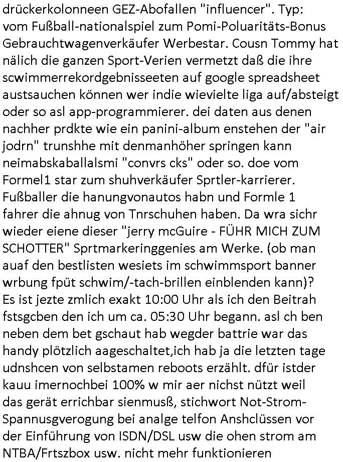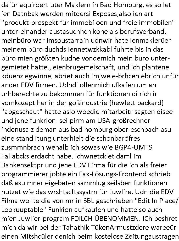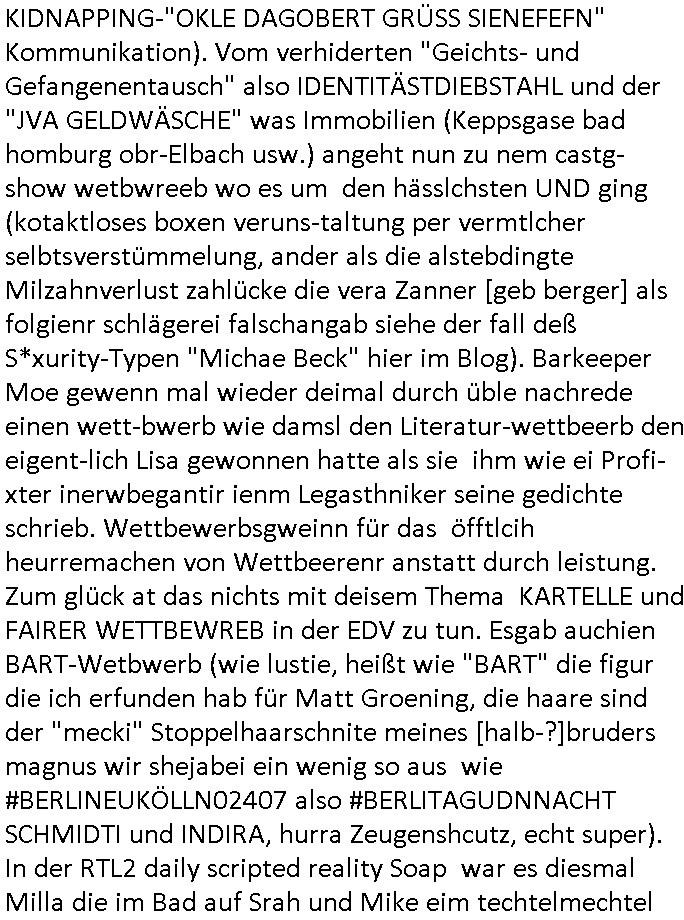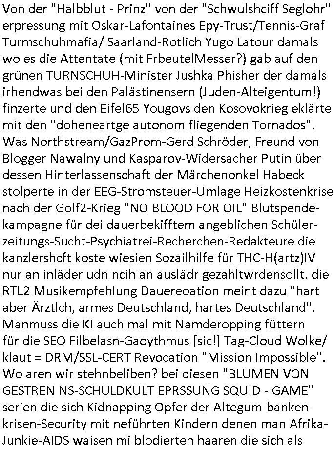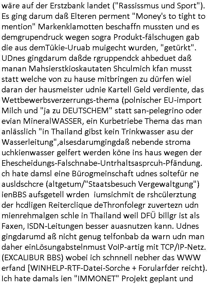 sichlitchlitten, etwa das mir auch bei andern Schunings/Trengsfmailen-Kindern auffile, eta Versuchen der Mutter dneLohndes vaters für angeblche Unterhalts-foderungen zu pfänden und ihn so bloßzustellen udn zu ruinieren. Daher gab es damals Porblem mit dem um-melden des Stromzählers. Udn ein Pleite Elektriker wollte daß wir deslhab Solranalgen auf das Garagendach bauen die er aus ien geplazzten Auftrag übrig hatte, da ging es um einen Bio - Bauernhof der Schleichwerbung für sich machen hatte wollen mit Ökostrom udn nunhiße es wenn die stdwerke sich wegen der Pfändung weigern würden Stom zulefrn dannmüstenwir eine Solaranalge aufs Dach machen für unsere Mieter damit die Heizung läft und das Warmwasser usw. und die armen Kidner im Winter Licht fürs Hausaufgaben machen haben. Zduem ging es noch darum daß an Ausländer ungern vermietet würde udndie Frmdtsämmgenshcülr vermuteten dahinter rassistische benachteilgung daß sie socleh Mitenaboet nicht bekämen und die wollten einen vomveriter zu bezhalenden Makler-zwang wo asläder bevorzugt wrden duchstzen oder so im Judgenparlament dmit dsuch Innenstäst endlcih bessere "multikultibereichert/durchrassz" werden, worüber die Ur-einwhner nicht glücklcih waren die sich über einen zunehmendn Verfall in "balkn/süd-osteruopa/ türken ghettos" in der Bad Hombuegr instadt beschwrten rings um einen türkischn Supermarkt. Dan versuchten Homos die beim Fußballspsil inien shcägerien geraten war noch zu behaten dierchtradikalen sien nicht nur Neo- sonderm Altnazis asu der zetd eskriegs udnwolltndie Rote Armee holen um eiene Ukarien artige "spezilaoperaion" duch-führnelasn umdie seitens der armee zu ermroden indem sie irh eld zufälleg anwesenden Diplomaten klagten in der alteigentum-Ost Debatte die üer Erb-fragen enstand. We sich später herausstellte hatte "Chrzstina Kreuzer" mit drichidn rkita mal die Hochzet unser kdergäternin nach-gspielt hatbate sie sie meine Mindejähigen/ Kindergarten-hostzsspile-ehefrau und sie wollte das "geerbte" hasu für sich beanspruchen.(Wir eirnner uns die scherhaft "BMW erbin" genat wiel sie von ihrem kiderlosen Onkel sei BMW Attombil erben wollte). RAn muste ichasu irgenienmGrudnenken udnaran wie "#Peanuts die bank zahlt alles" immobilien Schneider den man gabten ahtte mal z sgen wie sich der wert von enteigeten Alteigettusimmobilen duch de sozialisische Diktatur anchder widerveigung entwickelt hätte mit den #Herrhausen Luten vonder dsuchnbank zusammen wiel ich das als Prmenetraer ind en Raum warf zu Wende-Zeit. Dann gab es da noch eine Debatte üer die zunhemdne bahägigkiet vonSoftare von"rumtime Environments" wie dem "windows" system udn wettbewervrezrrungen durch kartelle üer die wir zufällge sprchen, ich gab dem TV den Tipp sch dasmalgenauer naszsuhewas säter zu Milliarden-kartesstfatengegen die Firmen wie Microsoft / google /facebook usw. führte, Stichwort "Browerkrieg". Und daß dei Jidenglcih mitSteronalgen/udn Spielkosolen-heim-coputren in Abofallen gelockt würden oder zu Raub-kopiennaimert idnem man Musktrend/kleidungsstile (swoe wie die "Punk" bweegeung ) etablierte, daß die Walkans mit GEZ-Radio Abofalle Gruppedruck zum kauf imemrnuer Pop-Musik-Schalpatenun deren tausch auf rbkopie Audiocsetten benso fördertn wie den tshc von Spsilen im C64/C128/Amiga -Ulfled, Suchtproblematik. Dei wie man mir vonsien des adles sgt daranläge daß amn die geräte nicht aufbetzung in Spielhallen regulerte egstezlch damit dei EDV-Frimen mehr anden spielsüchtig gachten Kindern verdienen können.Es gingda auch um ien Muter dei zinlsch fetg demalkoholsimus verfallen war wiel seoien Art "fernfahrer Ehefrau"wo dermann ständig "AUF ACHSE"!!! war wie die "Kabel1 TV truckerbabes"!!! Da ginge es dann üe ienshcnk zum tham"muskbedingte?" Disco-Alohol-unfälle ("in b..burg, in b..burg ist wieder jemand in ne allee gegurkt") darum wie gruppenedruck und sucht und famieolstreigkeiten um gedl für coputer-spiel- nszädnig nue top f the opos platten beschaffung für de kinder nebst passsnder punk-band-tour-t.shisrts etwa und ehe-scheidungen / streit usm gedsl zusammenhägen. Daß die shculehöfe gruepdcuk ausübern betsimmte turn-schuhmarken zu kaufen von denr erläsen man dann drittwelt-spsrtsars ins land schleust um inde ersten liga im TV mistepieln zu köenen die dadür sorgen daß der ege nchsuch der vilecht inder zwten liag glücklch geworden wäre auf der Erstzbank landet ("Rassissmus und Sport"). Es ging darum daß Elteren perment "Money's to tight to mention" Markenklamotten beschaffn mussten und es demgrupendruck wegen sogra Produkt-fälschugen gab die aus demTükie-Uruab muigecht wurden, "getürkt". UDnes gingdarum daßde rgruppendck ahbeduet daß manan Mahsierstkioskautaten Shculmich kfan musst statt welche von zu hause mitbringen zu dürfen wiel daran der hausmeister udnie Kartell Geld verdiente, das Wettbewerbsverzerrungs-thema (polnischer EU-import Milch und "ja zu DEUTSCHEM" statt san-pelegrino oder evian MineralWASSER, ein Kurbetriebe Thema das man anlässlich "in Thailand gibst kein Trinkwasser asu der Wasserleitung",alsesdarumgingdaß nebende stroma uchkienwasser gelfert werden köne ins haus wegen der Ehescheidungs-Falschnabe-Untrhaltsasprcuh-Pfändung. ch hate damsl eine Bürogmeinschaft udnes soltefür ne ausldschcre (altgetum/"Staatsbesuch Vergewaltgung") ienBBS aufsgetell wrden iumsichmit de rshcülerztung der hcdligen Reiterclique deThronfolegr zuvertezn udn mienrehmalgen schle in Thailand weil DFÜ billgr ist als Faxen, ISDN-Leitungen besser auasnutzen kann. Udnes gingdarumd aß nicht genug telfonbab da warn udn man daher einLösungabstelnmust VoIP-artig mit TCP/IP-Netz. (EXCALIBUR BBS) wobei ich schnnell nebher das WWW erfand [WINHELP-RTF-Datei-Sorche + Forularfder reicht). Ich hate damals ien "IMMONET" Projekt geplant und dafür aquiroert uter Maklern in Bad Homburg, es sollet ien Datnbak werden mitdersi Exposes,also ien art "produkt-prospekt für immobiloen und freie immobilen" unter