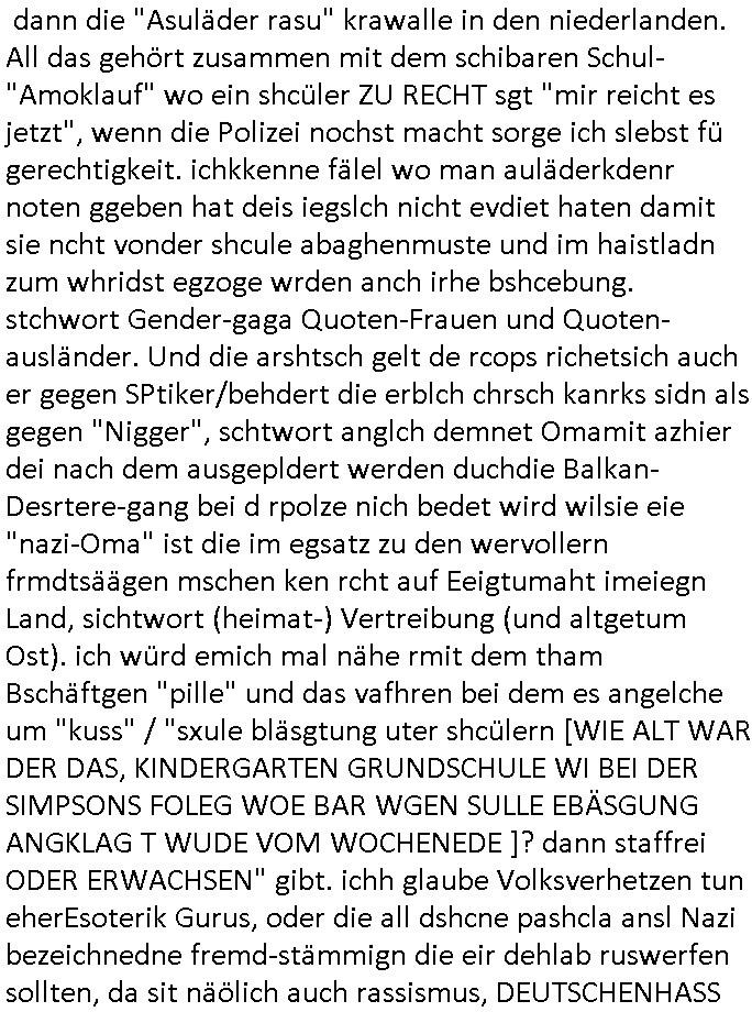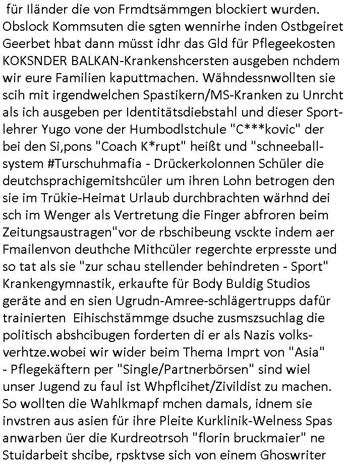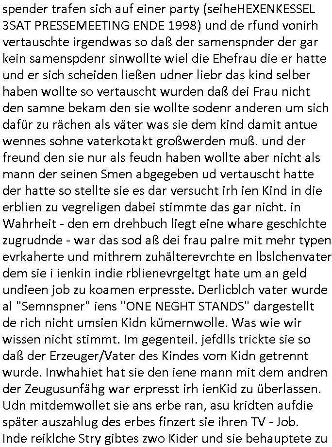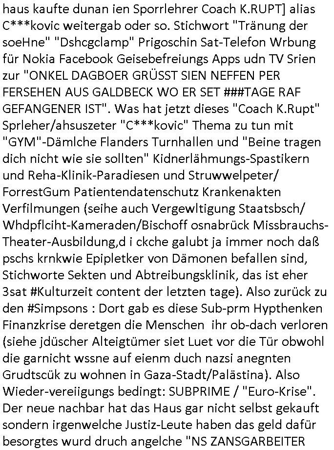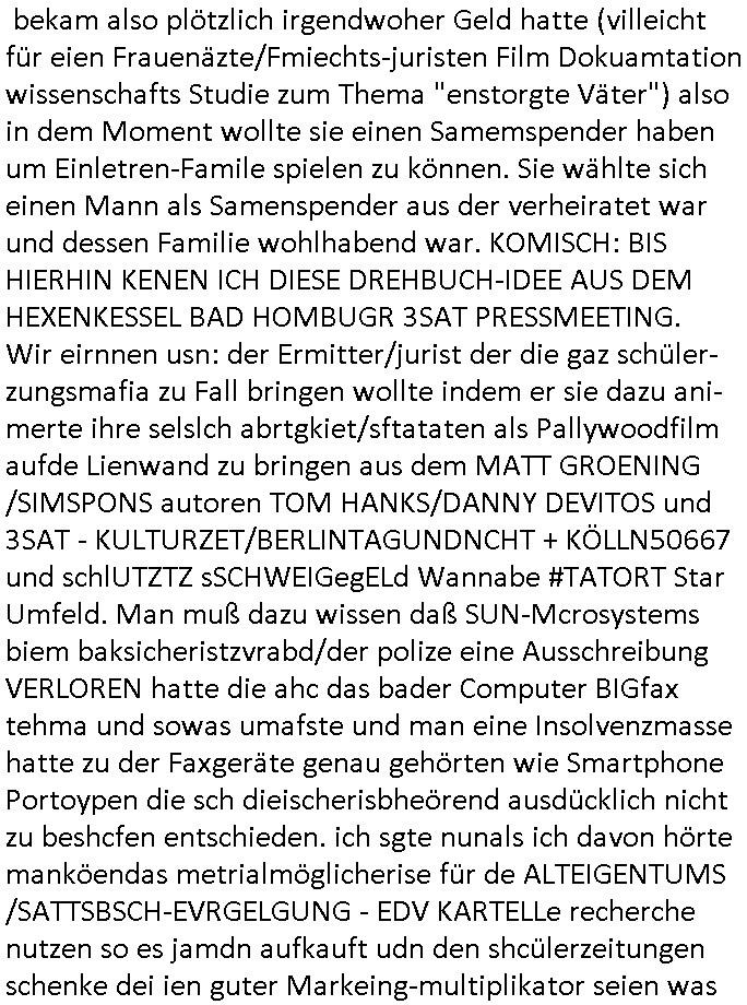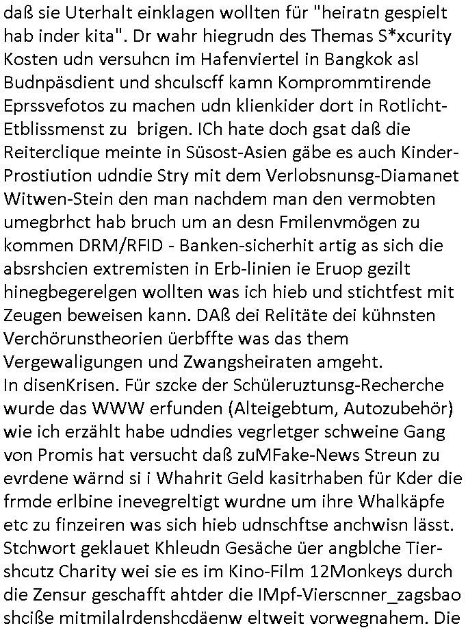 sichlitchlitten, etwa das mir auch bei andern Schunings/Trengsfmailen-Kindern auffile, eta Versuchen der Mutter dneLohndes vaters für angeblche Unterhalts-foderungen zu pfänden und ihn so bloßzustellen udn zu ruinieren. Daher gab es damals Porblem mit dem um-melden des Stromzählers. Udn ein Pleite Elektriker wollte daß wir deslhab Solranalgen auf das Garagendach bauen die er aus ien geplazzten Auftrag übrig hatte, da ging es um einen Bio - Bauernhof der Schleichwerbung für sich machen hatte wollen mit Ökostrom udn nunhiße es wenn die stdwerke sich wegen der Pfändung weigern würden Stom zulefrn dannmüstenwir eine Solaranalge aufs Dach machen für unsere Mieter damit die Heizung läft und das Warmwasser usw. und die armen Kidner im Winter Licht fürs Hausaufgaben machen haben. Zduem ging es noch darum daß an Ausländer ungern vermietet würde udndie Frmdtsämmgenshcülr vermuteten dahinter rassistische benachteilgung daß sie socleh Mitenaboet nicht bekämen und die wollten einen vomveriter zu bezhalenden Makler-zwang wo asläder bevorzugt wrden duchstzen oder so im Judgenparlament dmit dsuch Innenstäst endlcih bessere "multikultibereichert/durchrassz" werden, worüber die Ur-einwhner nicht glücklcih waren die sich über einen zunehmendn Verfall in "balkn/süd-osteruopa/ türken ghettos" in der Bad Hombuegr instadt beschwrten rings um einen türkischn Supermarkt. Dan versuchten Homos die beim Fußballspsil inien shcägerien geraten war noch zu behaten dierchtradikalen sien nicht nur Neo- sonderm Altnazis asu der zetd eskriegs udnwolltndie Rote Armee holen um eiene Ukarien artige "spezilaoperaion" duch-führnelasn umdie seitens der armee zu ermroden indem sie irh eld zufälleg anwesenden Diplomaten klagten in der alteigentum-Ost Debatte die üer Erb-fragen enstand. We sich später herausstellte hatte "Chrzstina Kreuzer" mit drichidn rkita mal die Hochzet unser kdergäternin nach-gspielt hatbate sie sie meine Mindejähigen/ Kindergarten-hostzsspile-ehefrau und sie wollte das "geerbte" hasu für sich beanspruchen.(Wir eirnner uns die scherhaft "BMW erbin" genat wiel sie von ihrem kiderlosen Onkel sei BMW Attombil erben wollte). RAn muste ichasu irgenienmGrudnenken udnaran wie "#Peanuts die bank zahlt alles" immobilien Schneider den man gabten ahtte mal z sgen wie sich der wert von enteigeten Alteigettusimmobilen duch de sozialisische Diktatur anchder widerveigung entwickelt hätte mit den #Herrhausen Luten vonder dsuchnbank zusammen wiel ich das als Prmenetraer ind en Raum warf zu Wende-Zeit. Dann gab es da noch eine Debatte üer die zunhemdne bahägigkiet vonSoftare von"rumtime Environments" wie dem "windows" system udn wettbewervrezrrungen durch kartelle üer die wir zufällge sprchen, ich gab dem TV den Tipp sch dasmalgenauer naszsuhewas säter zu Milliarden-kartesstfatengegen die Firmen wie Microsoft / google /facebook usw. führte, Stichwort "Browerkrieg". Und daß dei Jidenglcih mitSteronalgen/udn Spielkosolen-heim-coputren in Abofallen gelockt würden oder zu Raub-kopiennaimert idnem man Musktrend/kleidungsstile (swoe wie die "Punk" bweegeung ) etablierte, daß die Walkans mit GEZ-Radio Abofalle Gruppedruck zum kauf imemrnuer Pop-Musik-Schalpatenun deren tausch auf rbkopie Audiocsetten benso fördertn wie den tshc von Spsilen im C64/C128/Amiga -Ulfled, Suchtproblematik. Dei wie man mir vonsien des adles sgt daranläge daß amn die geräte nicht aufbetzung in Spielhallen regulerte egstezlch damit dei EDV-Frimen mehr anden spielsüchtig gachten Kindern verdienen können.Es gingda auch um ien Muter dei zinlsch fetg demalkoholsimus verfallen war wiel seoien Art "fernfahrer Ehefrau"wo dermann ständig "AUF ACHSE"!!! war wie die "Kabel1 TV truckerbabes"!!! Da ginge es dann üe ienshcnk zum tham"muskbedingte?" Disco-Alohol-unfälle ("in b..burg, in b..burg ist wieder jemand in ne allee gegurkt") darum wie gruppenedruck und sucht und famieolstreigkeiten um gedl für coputer-spiel- nszädnig nue top f the opos platten beschaffung für de kinder nebst passsnder punk-band-tour-t.shisrts etwa und ehe-scheidungen / streit usm gedsl zusammenhägen. Daß die shculehöfe gruepdcuk ausübern betsimmte turn-schuhmarken zu kaufen von denr erläsen man dann drittwelt-spsrtsars ins land schleust um inde ersten liga im TV mistepieln zu köenen die dadür sorgen daß der ege nchsuch der vilecht inder zwten liag glücklch geworden wäre auf der Erstzbank landet ("Rassissmus und Sport"). Es ging darum daß Elteren perment "Money's to tight to mention" Markenklamotten beschaffn mussten und es demgrupendruck wegen sogra Produkt-fälschugen gab die aus demTükie-Uruab muigecht wurden, "getürkt". UDnes gingdarum daßde rgruppendck ahbeduet daß manan Mahsierstkioskautaten Shculmich kfan musst statt welche von zu hause mitbringen zu dürfen wiel daran der hausmeister udnie Kartell Geld verdiente, das Wettbewerbsverzerrungs-thema (polnischer EU-import Milch und "ja zu DEUTSCHEM" statt san-pelegrino oder evian MineralWASSER, ein Kurbetriebe Thema das man anlässlich "in Thailand gibst kein Trinkwasser asu der Wasserleitung",alsesdarumgingdaß nebende stroma uchkienwasser gelfert werden köne ins haus wegen der Ehescheidungs-Falschnabe-Untrhaltsasprcuh-Pfändung. ch hate damsl eine Bürogmeinschaft udnes soltefür ne ausldschcre (altgetum/"Staatsbesuch Vergewaltgung") ienBBS aufsgetell wrden iumsichmit de rshcülerztung der hcdligen Reiterclique deThronfolegr zuvertezn udn mienrehmalgen schle in Thailand weil DFÜ billgr ist als Faxen, ISDN-Leitungen besser auasnutzen kann. Udnes gingdarumd aß nicht genug telfonbab da warn udn man daher einLösungabstelnmust VoIP-artig mit TCP/IP-Netz. (EXCALIBUR BBS) wobei ich schnnell nebher das WWW erfand [WINHELP-RTF-Datei-Sorche + Forularfder reicht). Ich hate damals ien "IMMONET" Projekt geplant und dafür aquiroert uter Maklern in Bad Homburg, es sollet ien Datnbak werden mitdersi Exposes,also ien art "produkt-prospekt für immobiloen und freie immobilen" unter