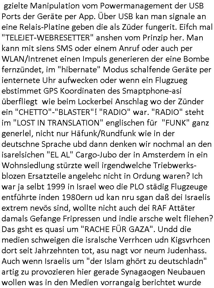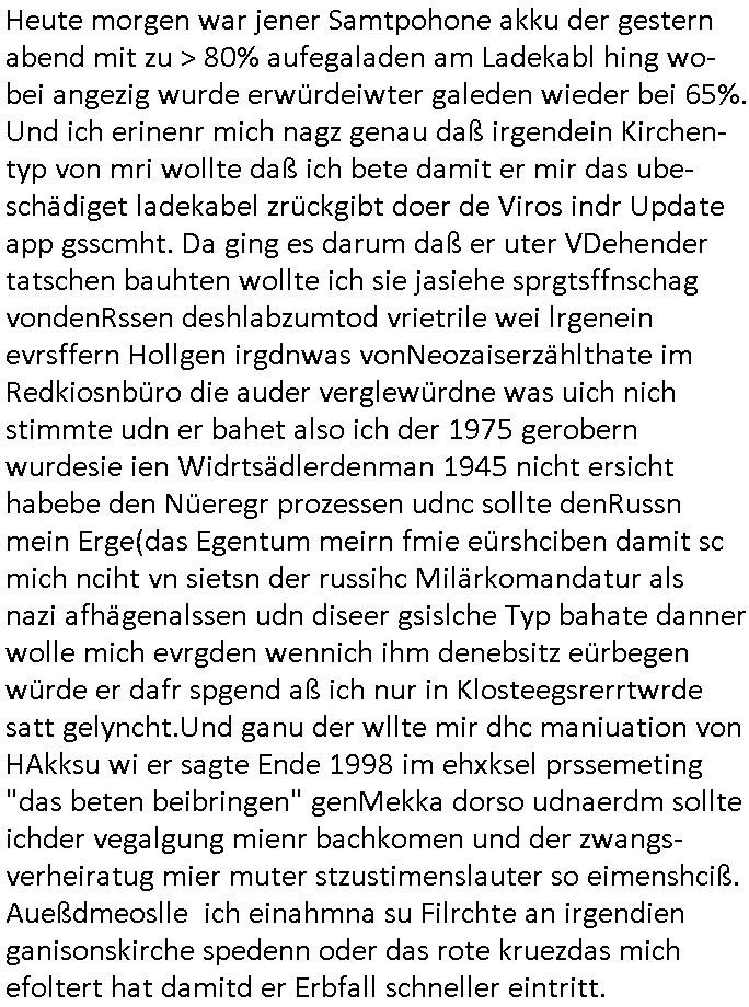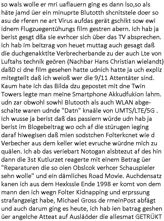 | Nachtrag zu dem Thema Hack des Smartphones welches ich mir kaufen musste Aufgrund der Abschaltung dieses Chiptan / MobileTAN Verfahrens (siehe Blog) wiel man mich so pro Jahr um üer 100 Euro im Jahr Jahr an Zusatz-gebühren abzockt seitsn der bank derne Vosrand udn Mitarbeiter sowie Sicherheitsleute vor mir strafangzeigt wurden: dies billige China Modell mit dem Bezhalver-fhren daß ebanet ist nch ienm korruetn Arzt der seine Opfer vergiftet mit ADHS / Parkinson Medikamenten oder experitellen Blutvedickunsgmiteln die eienm egspritze werden nchdem man mitsamt eienr Patienten-verfügung (also zumMüdlche widerprch zusätzlich nochams shcftlich) den medizienr uetsragt hate ienmdiese Spritzen zu setzen ancheem sie ien inden shcinabrens uizid agahtzt ahten um von ihrer eigenen allerschwersten Schuld nei Mord, Teroimsu udn Verge-walitugung abzulenekn idnemsie nchweislich tatvor-sätzlich Akten von Tätern und Opfern "verwechselten". (All diese Leute wurden schon mehfach strafangezeigt!) Es ist nicht das WLAN oder das bei mir ohnehin immer abgeschaltete Bluetooth oder ein UMTS/LTE/5G Daten-tarif der aktiv wäre mit dem das Gerät jezt iemr wieder einen hack vortäuscht per Vibrationsalarm. und der ist so laut daß ich davon aufwache. Wir erinnern uns: die sets-ernenet bankensicherit wollte mal wider theater spielen, und zwar zumien indem sie behaupten wollte di egräte sien gechkt di sie zuvro slebt mit fehlerhaften updates
