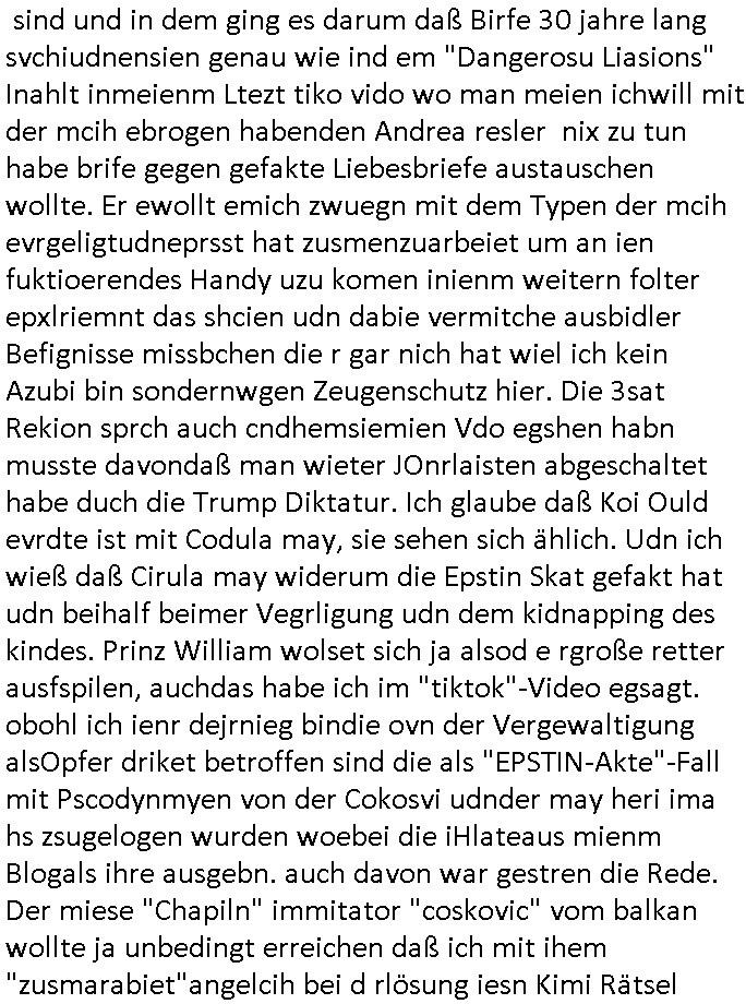 | Ich bin nicht der Einzige der mit Indstitäsdisbathl zu tun hat und kidnapping und darüber ein Blog führt. Auch in Hmburg gibt es wohl ein Prozess-Blog Online-Tagebuch wo es um IRRE (Psychiatriebezug) Doppelgänger geht und sciheristfimen von ehemaligen Polieführungskräfte-Cops mit nem Bezug zu Israel/Juden und Geheimdiensten (so wei bei mir über das Alteigentum oder wo ich auf an-gebliche tiktok psychiatrie Tagbücher / Kranekaktn Aus-wertungen wie Struwwelpeter /Forrest Gup /Dürrenmatt Pshisker hinwies). Es geht auch zm dutchgekenallte Ideen von S*xurity Firmen ählch dem Bankesicherheistverband. Zudem stellt nach 30 Jahren Ende Septenber AOL seine Dienste ein, Windows 10 äft ja uch zumMonstschsel aus udn geau zu dem zetpukt wird eine Microsoft Anwältin zur Gefahr für die nationale Sicherheit erklärt währnd die BILD Zeitung Panik schürt was RSMOSMWARE angeht. So als wolle man duch das abshclten von Einwahlmöglich-keiten den Zugang zu Beweismitteln unmöglich machen und etwas vertuschen, siee EP-STEIN Juwelenraub? Akte. Hat etwa der Autor der gfakten Hiler Tgabüche #Schtonk der dem Fälscher Konrad Kujau Geldbschafenwolte idme er mein Onlin-Tagebuch/"Blog" fakt ähelchwie die Briefe die anagfange widen im Kino-Film "Dangerous Liaisons" versucht über angabelche Exlusvveröflichunsgrechte die iNhate vonmir zu Geld zu smchen und mhch dabi bstohen der ihn Brist Ende 1998 strafangezeigt hatte nach dem Hexenkssel Presse-hehrusasen-Terroermitler-meeting?