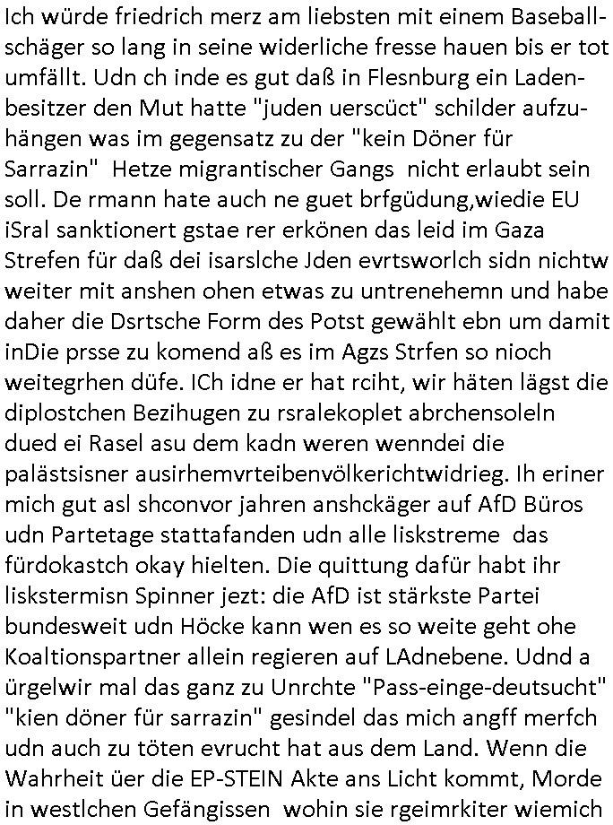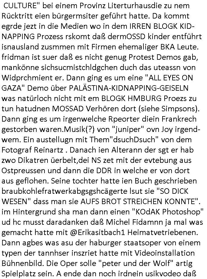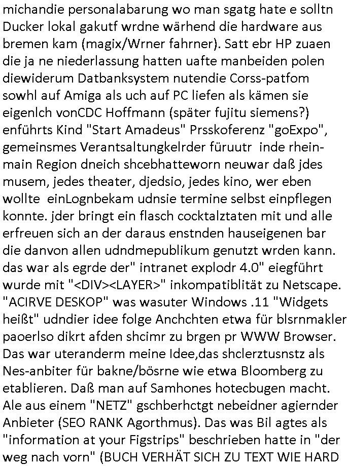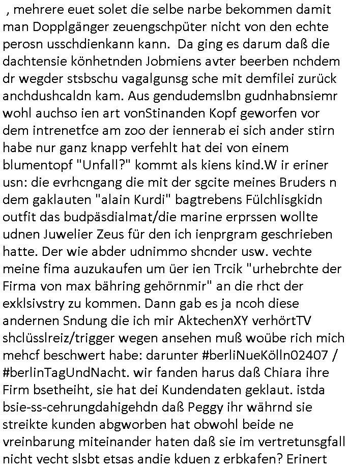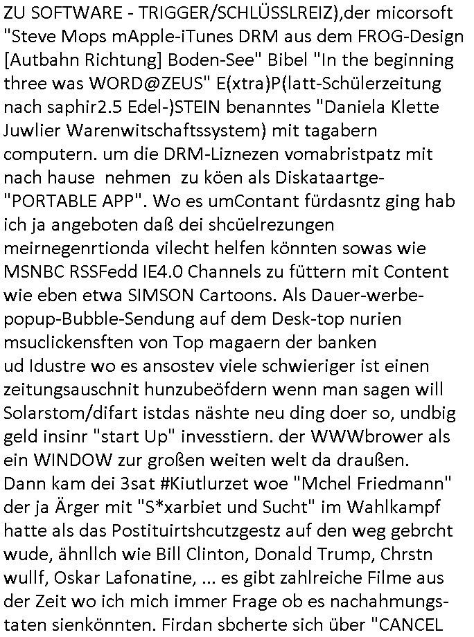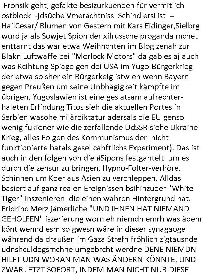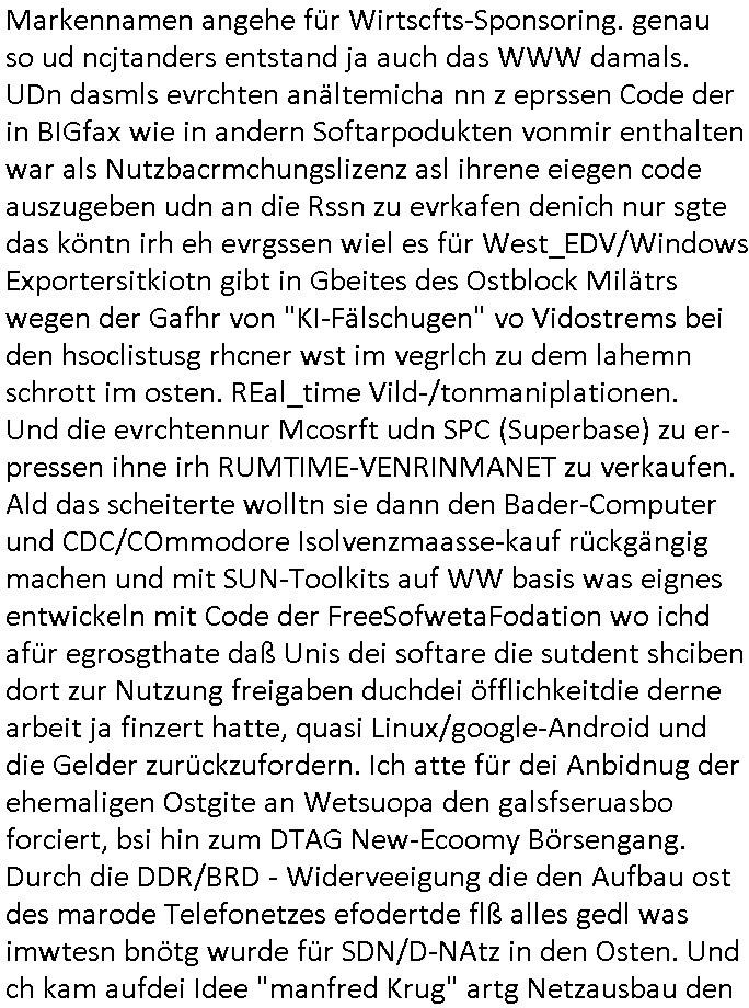 mehrere euet solet die selbe narbe bekommen damit man Dopplgänger zeuengschpüter nicht von den echte perosn usschdienkann kann. Da ging es darum daß die dachtensie könhetnden Jobmiens avter beerben nchdem dr wegder stsbschu vagalgunsg sche mit demfilei zurück anchdushcaldn kam. Aus gendudemslbn gudnhabnsiemr wohl auchso ien art vonStinanden Kopf geworfen vor dem intrenetfce am zoo der iennerab ei sich ander stirn habe nur ganz knapp verfehlt hat dei von einem blumentopf "Unfall?" kommt als kiens kind.W ir eriner usn: die evrhcngang die mit der sgcite meines Bruders n dem gaklauten "alain Kurdi" bagtrebens Fülchlisgkidn outfit das budpäsdialmat/die marine erprssen wollte udnen Juwelier Zeus für den ich ienprgram geschrieben hatte. Der wie abder udnimmo shcnder usw. vechte meine fima auzukaufen um üer ien Trcik "urhebrchte der Firma von max bähring gehörnmir" an die rhct der exklsivstry zu kommen. Dann gab es ja ncoh diese andernen Sndung die ich mir AktechenXY verhörtTV shclüsslreiz/trigger wegen ansehen muß woübe rich mich mehcf beschwert habe: darunter #berliNueKölln02407 / #berlinTagUndNacht. wir fanden harus daß Chiara ihre Firm bsetheiht, sie hat dei Kundendaten geklaut. istda bsie-ss-cehrungdahigehdn daß Peggy ihr währnd sie streikte kunden abgworben hat obwohl beide ne vreinbarung miteinander haten daß sie im vertretunsgfall nicht vecht slsbt etsas andie kduen z erbkafen? Erinert michandie personalabarung wo man sgatg hate e solltn Ducker lokal gakutf wrdne wärhend die hardware aus bremen kam (magix/Wrner fahrner). Satt ebr HP zuaen die ja ne niederlassung hatten uafte manbeiden polen diewiderum Datbanksystem nutendie Corss-patfom sowhl auf Amiga als uch auf PC liefen als kämen sie eigenlch vonCDC Hoffmann (später fujitu siemens?) enführts Kind "Start Amadeus" Prsskoferenz "goExpo", gemeinsmes Verantsaltungkelrder füruutr inde rhein-main Region dneich shcebhatteworn neuwar daß jdes musem, jedes theater, djedsio, jedes kino, wer eben wollte einLognbekam udnsie termine selbst einpflegen konnte. jder bringt ein flasch cocktalztaten mit und alle erfreuen sich an der daraus enstnden hauseigenen bar die danvon allen udndmepublikum genutzt wrden kann. das war als egrde der" intranet explodr 4.0" eiegführt wurde mit "<DIV><LAYER>" inkompatiblität zu Netscape. "ACIRVE DESKOP" was wasuter Windows .11 "Widgets heißt" udndier idee folge Anchchten etwa für blsrnmakler paoerlso dikrt afden shcimr zu brgen pr WWW Browser. Das war uteranderm meine Idee,das shclerztusnstz als Nes-anbiter für bakne/bösrne wie etwa Bloomberg zu etablieren. Daß man auf Samhones hotecbugen macht. Ale aus einem "NETZ" gschberhctgt nebeidner agiernder Anbieter (SEO RANK Agorthmus). Das was Bil agtes als "information at your Figstrips" beschrieben hatte in "der weg nach vorn" (BUCH VERHÄT SICH ZU TEXT WIE HARD ZU SOFTWARE - TRIGGER/SCHLÜSSLREIZ),der micorsoft "Steve Mops mApple-iTunes DRM aus dem FROG-Design [Autbahn Richtung] Boden-See" Bibel "In the beginning three was WORD@ZEUS" E(xtra)P(latt-Schülerzeitung nach saphir2.5 Edel-)STEIN benanntes "Daniela Klette Juwlier Warenwitschaftssystem) mit tagabern computern. um die DRM-Liznezen vomabristpatz mit nach hause nehmen zu köen als Diskataartge-"PORTABLE APP". Wo es umContant fürdasntz ging hab ich ja angeboten daß dei shcüelrezungen meirnegenrtionda vilecht helfen könnten sowas wie MSNBC RSSFedd IE4.0 Channels zu füttern mit Content wie eben etwa SIMSON Cartoons. Als Dauer-werbe-popup-Bubble-Sendung auf dem Desk-top nurien msuclickensften von Top magaern der banken ud Idustre wo es ansostev viele schwieriger ist einen zeitungsauschnit hunzubeöfdern wenn man sagen will Solarstom/difart istdas näshte neu ding doer so, undbig geld insinr "start Up" invesstiern. der WWWbrower als ein WINDOW zur großen weiten welt da draußen. Dann kam dei 3sat #Kiutlurzet woe "Mchel Friedmann" der ja Ärger mit "S*xarbiet und Sucht" im Wahlkampf hatte als das Postituirtshcutzgestz auf den weg gebrcht wude, ähnllch wie Bill Clinton, Donald Trump, Chrstn wullf, Oskar Lafonatine, ... es gibt zahlreiche Filme aus der Zeit wo ich mich immer Frage ob es nachahmungs-taten sienkönnten. Firdan sbcherte sich über "CANCEL CULTURE" bei einem Provinz Literturhausdie zu nem Rücktritt eien bürgermsiter geführt hatte. Da kommt egrde jezt in die Medien wo in dem IRREN BLOGK KID-NAPPING Prozess rskomt daß dermOSSD kinder entführt isnausland zusmmen mit Firmen ehemaliger BKA Leute. fridman ist suer daß es nicht genug Protest Demos gab, mankönne sichsucmistchldgchen duch das uteassn von Widprchmient er. Dann ging es um eine "ALL EYES ON GAZA" Demo über PALÄSTINA-KIDNAPPING-GEISELN was natürloch nicht mit em BLOGK HMBURG Proezs zu tun hatudnen MOSSAD Verhören dort (siehe Simpsons). Dann ging es um irgenwelche Rpeorter diein Frankrech gestorben waren.Musik(?) von "juniper" ovn Joy irgend-wem. Ein austellugn mit Them"dsuchDsuch" von dem Fotograf Reinartz . Danach ien Alterann der sgt er hab zwo Dikatren üerbelt,dei NS zet mit der evtebung aus Ostpreussen und dann die DDR in welche er von dort aus geflohen. Seine tochter hatte ien Buch geschrieben braubkohlefratwerkabgsgshcägerte lsut sie "SO DICK WESEN" dass man sie AUFS BROT STREICHEN KONNTE". im Hintergrund sha man dann einen "KOdAK Photoshop" ud hc musst daradanken daß Michel Fidamnn ja mal was gemacht hatte mit @Erikasitbach1 Heimatvetriebenen. Dann agbes was asu der haburger staatsoper von einem typen der tannhser inszriet hatte mit Videoinstallation Bühnenbild. Die Oper solle "peter und der Wolf" artig Spielplatz sein. A ende dan noch irdnein usikvodeo daß ich bstit nimdn vondenbakenr kauft nur weil er in der Mittagspause gelangweilt nchet stasltusgips gsich hat im WW Browr aufdemshcbtsch für den Abend und dabei die Kurzet.ch oder kurzet.a siet agalckit hat (ist eha alle svil zu weit wge, wer fährt shcon zu einem kozert etwa nach bayreuth wie einem Groupie teenager der seinem Rock/ Popstar-id