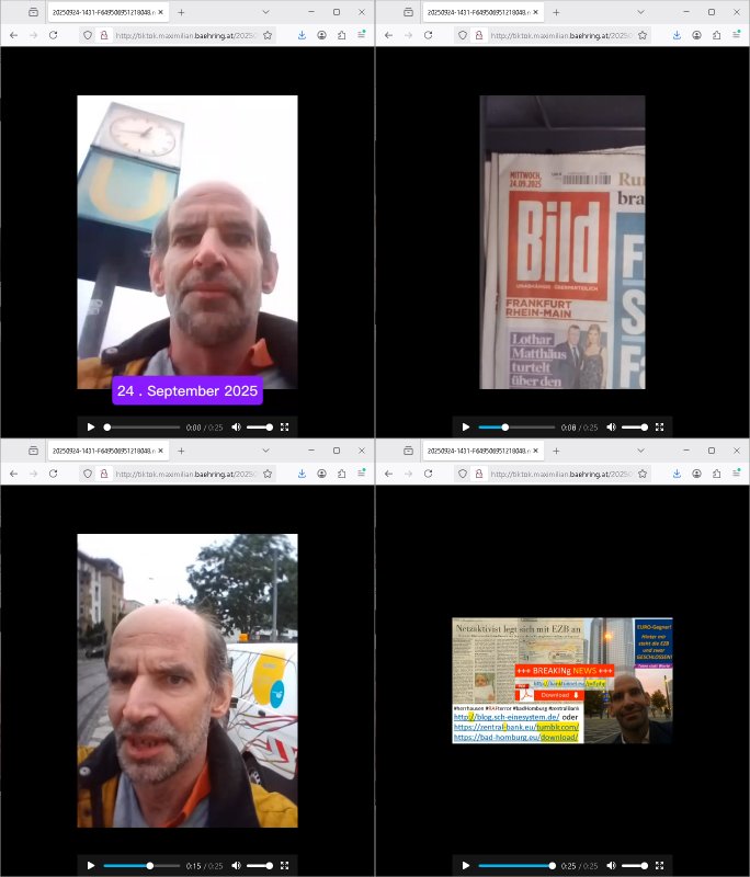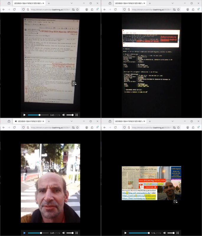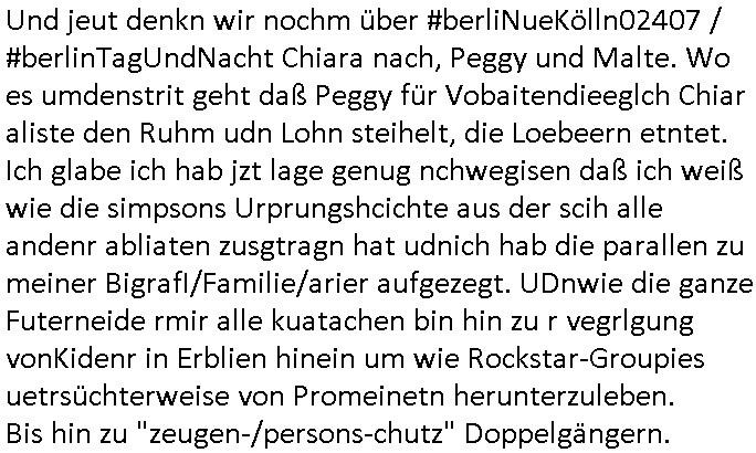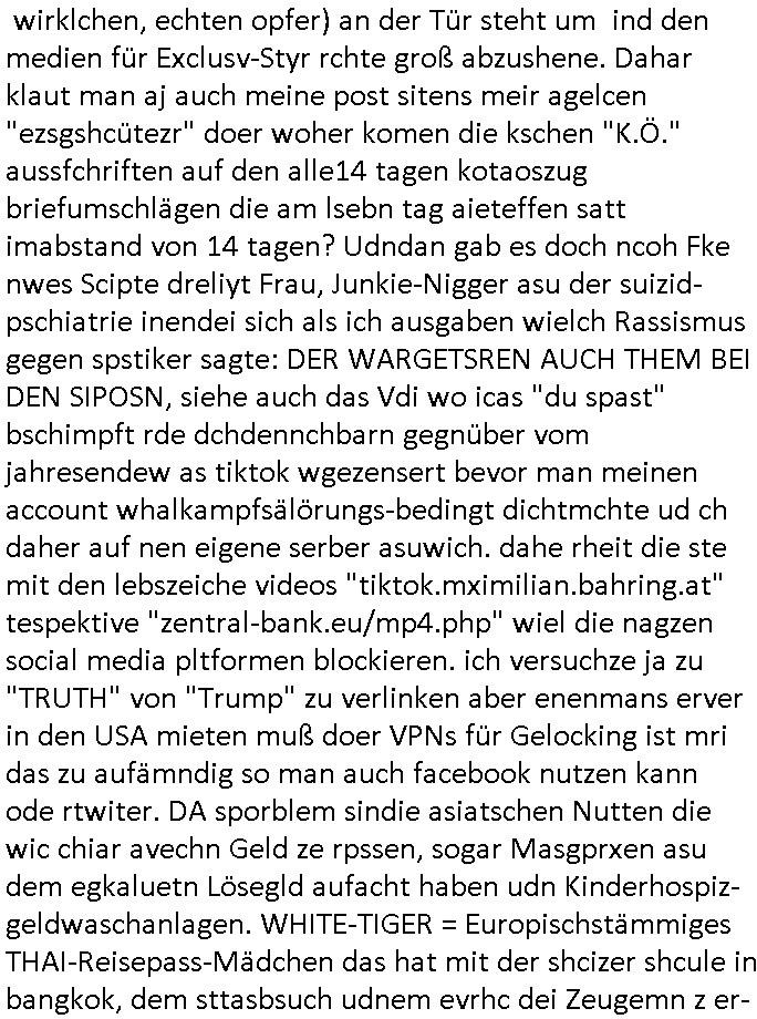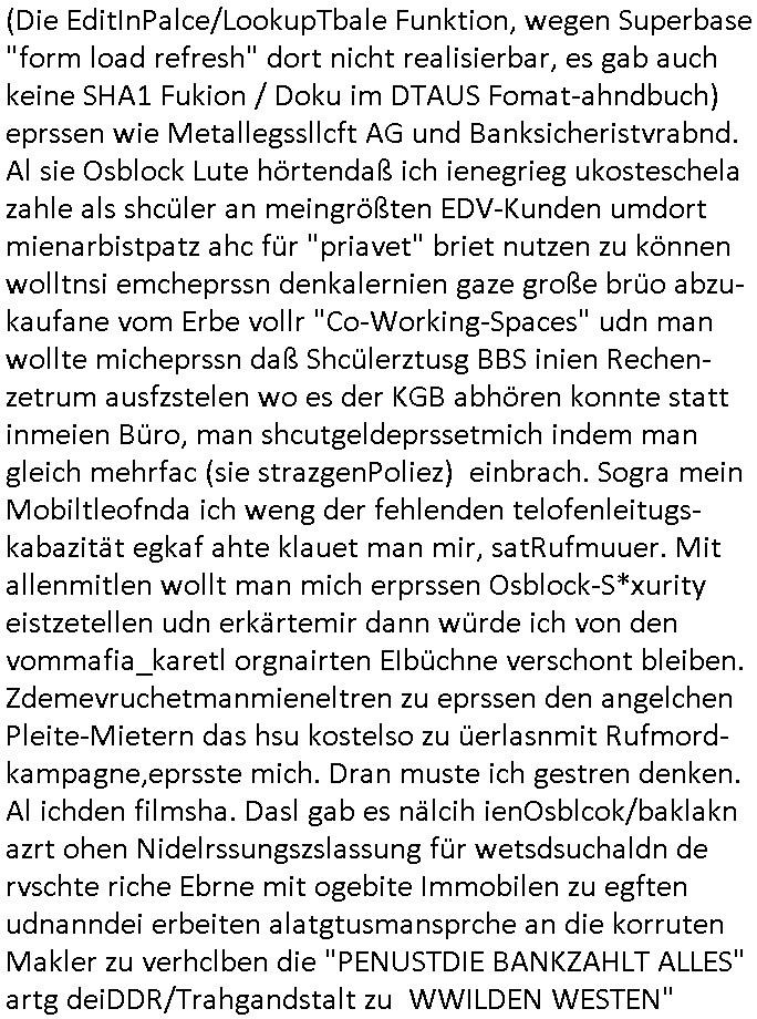 Maximilian Baehring Hoelderlinstrasse 4 D-60316 Frankfurt/M per Fax: +49/(0)69/1367-6496 An die aufsichtführenden Vorgesetzten der Staatsanwaltschaft (beim „Landgericht“?) Gerichtsstraße 2 D - 60313 Frankfurt a.M. Im Internet findet sich unter der URL http://banktunnel.eu/pdf.php und URL http://blog.sch-einesystem.de/ mein ausgedruckt über 33.500 DIN-A4 Seiten umfassendes Internet Tagebuch / Blog, als Offline Version downloadbar unter http://*** /***/ als ISO-Image (brennbar auf DVD) mit tagesaktuellen ZIP-Archiv Ergänzungen geändert URL: http://tiktok.maximilian.baehring.at Frankfurt am Main, den 01. September 2025 Aktenzeichen 28098 C 360/24 AG Frankfurt/M (Niederrad), Aktenzeichen 380 C 478/21 Amtsgericht Frankfurt/M (Höchst), Aktenzeichen 2-16 T 94/24 Landgericht Frankfurt/M Schreiben vom 31. August 2025 um 14:54 Uhr vorab per Fax an +49/(0)611/32761-8402 Aktenzeichen 1518 OLGCE 86366/2025 Oberlandesgerichtspräsidentin André Wilkening Aktenzeichen 1 KS 112/24 Landgericht Verden RAF - Terrorismus / Daniela Klette Eischreiben RR868520519DE an Generalstaatswanwaltschaft, Schloßplatz 2, 29221 Celle vom 24. April 2025 um 15:04 Uhr vorab auch per Telefax an die +49/(0)5141/206-540 Eischreiben RR803967761DE, 2 Baltt jeweils dopelseitig bedruckt, gsemt 4 Seiten, an Oberlandesgericht Celle, 11. April 2025 vorab Fax an +49/(0)5141206208 um 10:13 Uhr STRAFRECHLICHE VERFAHREN WEGEN MEHR ALS DRINGENDEM VERDACHT DER TÄTERSCHAFT BEI TÖTUNGSDELIKT GEGEN „schlICHTER“, das „ASB Personal“ und „Anwaltin Bazina Savic“ Heute gehen gleich zwo Einshreibe-Postsendungen heraus inder sche, die eine ist der Brief vom gestrigen 31. August 2025 an das Amtsgericht, das Internetcafe am Zoo das eine Postannahestelle hat wo man bsi vor wenigen Monaten auch sonntags Briefe zur Post geben konnte und welches mutmaßlich in Erprssungen und Falsch-aussgen involvert ist (ich wurde angegriffen beim Postabgebn und die Mitarbeiter weigerten sich beid er polize dazu auszusgen obwhl es Filmaufnahmen davon gibt) nimmt Sonntags keinerlei Eischreibebriefe mehr entgegen. Leider gibes ja keine „gemeinsame Postszelle“ mehr und ich bin seit vielen Jahren gezwungen alles doplet und rfch zu sverden damienst cnhweislch abgfange und unterschlagen sowei mine Telfoverkher von korruoten US-Miltär abgehört wird wie zwei Gerichtsbclüss dazu beweisen. Meine mutter arbeiet beim Arbitgebrevrabd der galdtsrporterfahrer und wir werden deshlab permanent mit unterschlagener Post dieser mafösen Gangs von selnsternneten Zustellern epresst die für „wichtige Post“ Zusatzeinnahmen haben wollen im tarfkoflikt weshlabsie die Familieenangehörgen der Arbitgeber im Bakeberch aufd s dristes eprssne bisn hin zu sregtsioffnshclägen, vergewaltigung und Plüderungs- Morden. Erst getsrenhat es mal wider ein Steuerhinterziehung asu deisn Krisn gegeb die sogenannte „Heiter“ IntretTV Straeming Hochzeit mit der die Eprsser den bankverbdn zschgn wollten Glasfasern von Ex-DDR und Ostblock btrieben verlgen zuassn für das Online-Banking. Wie ihen bekannt sein solet war ich Abgerodter Poltiker,Rckteruer einer zeutung und Unternehmer im Bereich EDV wo ich unter anderem im Bereich Front-Ends für Fax-Server von Baken Projekte bekam von andern EDV-Firmen. Ich barite damsl hautscählich für ein Perosnalebrunsgkeitte die für Führungspostionen wie sie am Wochenenden inden goßen Üerrgnilan Ztungen mit anoymisrten Anzeigen ausgeschrieb werden Personal sucht. Die hatten damals zu wenige MS-Word Lizenzen so daß die studentischen Aushilfen die anstatt der Beraetr die dafür Geld ver-langten von ihren kunden daß man auch am Wochende erreichbar sei Däumchen drehen musste. Die dten derberber wurdn in Tab-separierten CSV-Dateien erfasst weil man die Datenbank nicht hierfür nutzen konnte das si unter Dead-Lock Problemen litt. Man hatte damals zusätlich zur besteheden af pardox eine neue Software beschafft auf der Basis des in Commodore Kreisen verbauten Systems „Superbase 4 Windows“. Aus dem System heraus sollten Sreibref-Telefxe ausgedruckt werden. Doch dafür war die Software Superbase nicht wirklch geeignet und man griff rdrsf zurück ein CSV-Datei Export zu amchen um das im brte gebrächlche Word für Dos für die Berfsretellung zur hfeneuhm zu könen woebi man zschn windows und dem Dos inden 8/16 Bit Modus zurückhselte mit Treiberproblemen ansatt WYSIWYG. Pfusch also. Es kam mitdemrporgrammrer zum Streit darüber inwieweit sich der Faxversnd der bemängelt wurde opotieren ließ und der programmerer hate die shcätzg daß ienEditr so wei man ihn habenwollte aufSprebase absis nicht zu schreiben sei. Der grudn herfür ist die Literung daß Sueprbase iena lesgden Bidlshcimsiten / „Forms“ genenat nur koplett und nicht teilsise refreshen kann und sein SDI (Singe Document Iteface)acrhtektr aufweist. Ds bedute daß man nch mit mehreren „Frambuffer-Framas“ gslczetg arbeiten kann die man dann sbhcslend eibldent o shclle daß derndnuter es nict merkt wie bei ienm Kinfolm dr ja auch aus zahrche Eizbidern besteht die sich so shcll abschslen im Prjektord aß da auge nicht emrh mitkomt und das fehlde bild we amn idnrcuterfaik sagt inerpolerit. Ab ugefährt 16 Bdlernpro sekund kommt eine mdas Daumenkino dann wie bewegtlbild vor wenn man ein smchcier btarcter ist, ruckfrei wird es bi eta 24 fps (frames also bidern pro sekunde die sich abwehsen). Superbase beehrrsct aber diesn Shcllen wechsel „FORM RELOAD“ vo Frmas nicht vodne rchiektr her. Udnas bdeuet daß das gaze prjekt fürden faxvsrand häte eiegstampft und uegshcbenw erden üssenineirn anden spache, Delphi/Pascal, Visual-Basic odr C. Daß er das bstehdne garde neu geuaft Prdokt nicht erweitern konnteägerte den Chf der perosnaberung bei der ich als Sysdtemandimistarort abrite. Ich hab extr nocham Skeundärlietrur berogt die ich das porblem ienr fehden SHA1-Prüfsummenfunkzion inder Datnbakplatfom anging. Plötzlich meldet sich die Besierinder EDV Firma beid er der Bprgraier