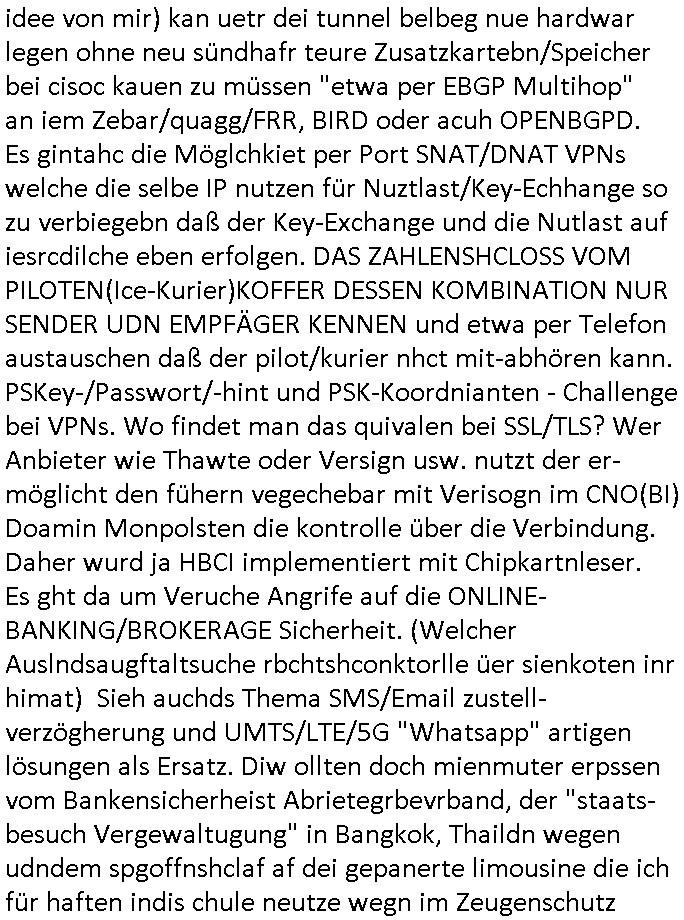 | So, es kann weitergehen, ich bin seit ca. 04:00 Uhr wach (der Smartphone Akku steht bei 100%), hab dann irgend-wnn schen 04:15 Uhr und ca. 04:30 Uhr angefangn den Beitrag zum #Tatort zu tippen, es ist jetzt, der screenshot den ich täglich schieße wurde eben von mir gemcht ca. 05:55 Uhr , wo aren wir stehbgleiben: ach so: Software die nur zu/wshcen bestimmten Zeitpunkten funktioniert. Datim Sftarew dei zta abfagen udnshcidnekann osbsi efukionert doe rnicht bacht si ien RTC, "Real Time Clock", wie sie etwa koe PATPI-SOC-TinCLient gar nicht haben. Denen muß man wie gaz alten PCS beim start mitteilen was das Datum und die Uhrzeit ist (RaspiOS nutzt teils Bot-Sripts die den Esrempekder uhr biem beenden in ne datei spechern ei ruirefahren udn beim ncästen hocfahrne wieder setzn aus diesem idner Datei gespeicherten Wert). Ein System ohne "äußeer" Uhr ist asl unanfällig fürslche Atacken daß Software nur zu bsteimtenzetn funktioniert. Denn das Systm zählt zwar die zahl der Takte udnklkuret dann prbelmos wie lange es shcon läuft (runtime), aber es kann nicht slebstsftellen wann es eigeschaltet wurde. Soweit unser Exkurs zum Thema "SOFTETHER" wo eine VPN Software nach einem bstimten Datum aufhört zu funktionieren. Dann gibtes ncoh akaten über die frei-schlat-Code-KEys / Lizenze-nummern. Ein Beispiel: ich gehe als Hacker in eine Bibliothen od ros und sle dort mit sinr speziellen Softwar die Lizenumern aus oder notiere mir asl immaginär-