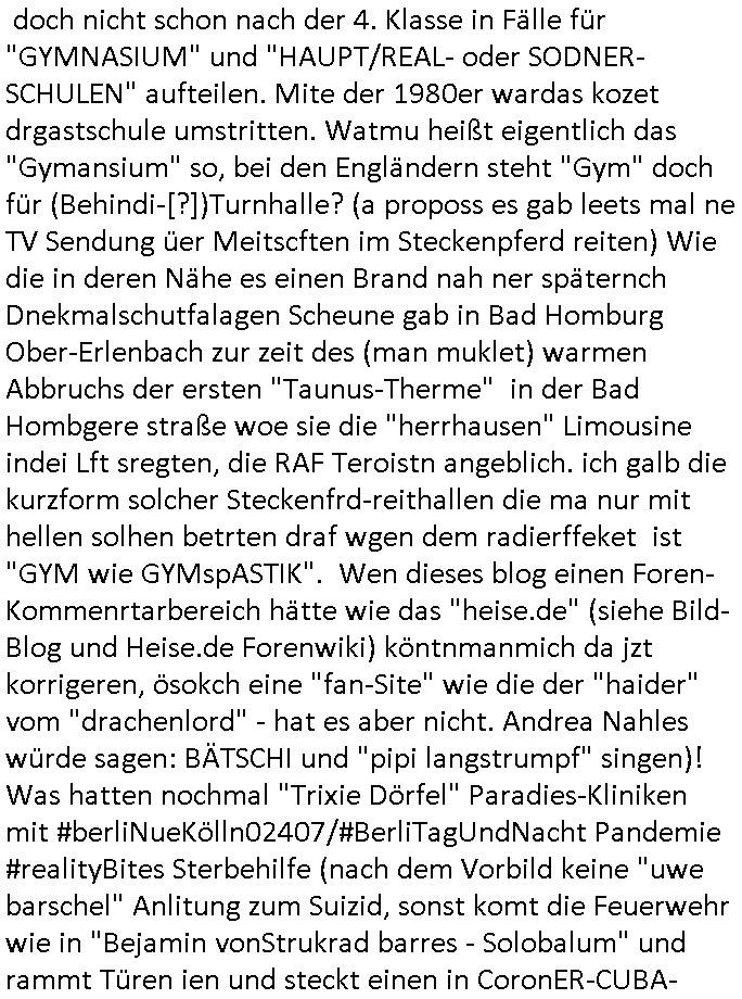 | Ich will mal weil ich jetzt ja ohnehin schon wieder wach bin bei der Gelegenheit aufschreiben was ich von dem dämlichen Milberg/Borowski #Tatort (siehe dazu meine "Borowski" #Tatort Kritik vom 11. Mai 2020 hier im Blog) gestern mitbekam. Wie immer werden die Gelder jener dummen Gebührenzhaler dei sich einer Zahlung der zu Unrecht erhobenen GEZ - Gebühr immer noch nicht ver-weigeren dazu zweckentfremdet solch Scheiße zu drehen und den Ätheralso die Luft damit zu verschmutzen wobei es wirklich wichtigere Themen gibt für welche man die verschwendete Sendezeit eigelich verwenden müsste. Es ging umien frau die egstalkt wurde wie sie behautet hat. Dann wurde sie umgebracht. Die Polizistin welche das untersuchen sollte war psychisch krank, sie hatte epi-leptische Anfälle und man erkärte dem Kollegen der zu-fälligausglöst einen soclhen miterlebte daß sie damit dienstunfähg war. Das Thema hab ich irgendwo schon- mal gehört, icg halbe als ich Schuspielr Milberg Ende 1998 bei eienm 3sat Pressetueting imhexskssel traf wo ma gerde veruchet einen miliadrshceren Pesiosnfods zu erpressn per kidapping für den ich arbeitete von dort werdne die Filmchen zsuatz-finanziert wenn die GEZ Gebührengelder dank genügendvereegren nicht reichen. DIes gazen Filmförderungsfonds korrupter Politiker zur Popagda-Infilatrion der Bevölkerung duch die Auffang-gesellschaften für arbistlse sed /PDS/dieLinke/ Regime- Theatermacher: Wir erinnern uns an dieses "Hupfdohlen"