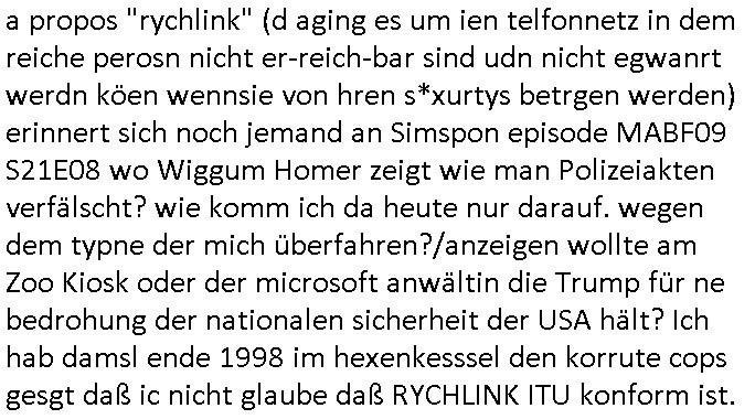 | a propos "rychlink" (d aging es um ien telfonnetz in dem reiche perosn nicht er-reich-bar sind udn nicht egwanrt werdn köen wennsie von hren s*xurtys betrgen werden) erinnert sich noch jemand an Simspon episode MABF09 S21E08 wo Wiggum Homer zeigt wie man Polizeiakten verfälscht? wie komm ich da heute nur darauf. wegen dem typne der mich überfahren?/anzeigen wollte am Zoo Kiosk oder der microsoft anwältin die Trump für ne bedrohung der nationalen sicherheit der USA hält? Ich hab damsl ende 1998 im hexenkesssel den korrute cops gesgt daß ic nicht glaube daß RYCHLINK ITU konform ist.