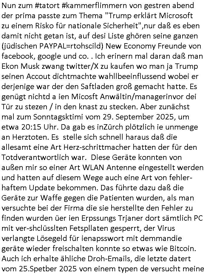| Nun zum #tatort #kammerflimmern von gestren abend der prima passte zum Thema "Trump erklärt Microsoft zu einem Risko für nationale Sicherheit",nur daß es eben damit nicht getan ist, auf desi Liste ghören seine ganzen (jüdischen PAYPAL=rtohscild) New Economy Freunde von facebook, google und co. . Ich erinern mal daran daß man Ekon Musk zwang twitter/X zu kaufen wo man ja Trump seinen Accout dichtmachte wahllbeeinflussend wobei er derjenige war der den Saftladen groß gemacht hatte. Es genügt nichtd a ien Micosft Anwältin/managerinvor dei Tür zu stezen / in den knast zu stecken. Aber zunächst mal zum Sonntagsktimi vom 29. September 2025, um etwa 20:15 Uhr. Da gab es inZürch plötzlich ie unmenge an Herztoten. Es stelle sich schnell haraus daß die allesamt eine Art Herz-schrittmacher hatten der für den Totdverantwortlich war. Diese Geräte konnten von außen mir so einer Art WLAN Antenne eingestellt werden und hatten auf diesem Wege auch eine Art von fehler-haftem Update bekommen. Das führte dazu daß die Geräte zur Waffe gegen die Patienten wurden, als man versuchte bei der Firma die sie herstellte den Fehler zu finden wurden üer ien Erpssungs Trjaner dort sämtlich PC mit ver-shclüsslten Fetspllaten gesperrt, der Virus verlangte Lösegeld für ienapsswort mit demmandie geräte wieder freischalten konnte so etwas wie Bitcoin. Auch ich erhalte ähliche Droh-Emails, die letzte datert vom 25.Spetber 2025 von einem typen de versucht meine