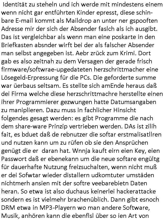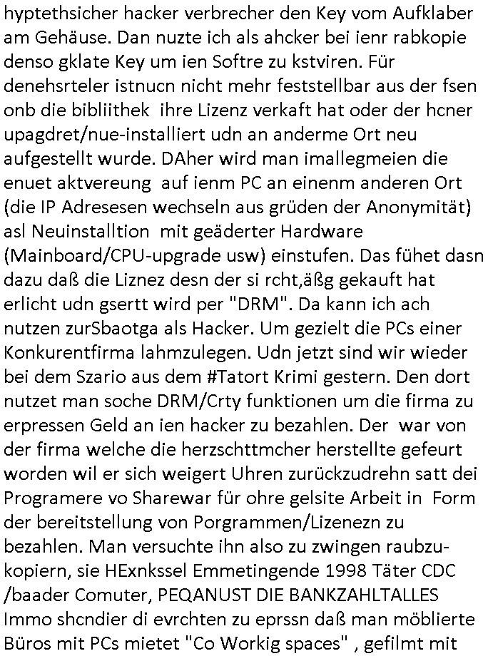 Identität zu steheln und ich werde mit mindestens einem wenn nicht gar entführten Kinder epresst, diese schin-bare E-mail kommt als Maildrop an unter ner gspooften Adresse mir der sich der Absender faslch als ich ausgibt. Das ist vergleichbar als wenn man eine poskarte in den Briefkasten absnder wirft bei der als falscher Absender man selbst angegeben ist. Aebr zrück zum Krimi. Dort gab es also zeitnah zu dem Versagen der gerade frisch firmware/softwrae-upgedateten herzschrittmacher eine Lösegeld-Erpressung für die PCs. Die geforderte summe war üerbaus seltsam. Es stellte sich amEnde heraus daß dei Firma welche diese herzschrittmachre herstellte einen ihrer Programmierer gezwungen hatte Datumsangaben zu maniplieren. Dazu muss in fachlicher Hinsicht folgendes gesagt werden: es gibt Programme die nach dem share-ware Prinzip vertrieben werden. DAs ist zilih fait, es bduet daß de rebnutzer die softar erstmalisatllren und nutzen kann um zu rüfen ob sie den Ansprüchen genügt die er daran hat. Wnnja kauft eirn eien Key, eien Passwort daß er ebenekann um die neue softare engültg für dauerhafte Nutzung freizsuchalten, wenn nicht muß er dei Sofwtar wieder distallern udkomtuter umstäden nichtmerh ansien mit der softre veebarebietn Daten heran. So etwa ist also duchaus keinerlei hackerattacke sondern es ist vielmehr brachenüblich. Dann gibt esnoch DRM etwa in MP3-Playern wo man andere Software, Musik, anhören kann die ebenflsl über so ien Art von Passwort geschützt wird vor unbezahltem Abspielen ählich wie bie ner Musikbox. Dort mietet man dei Inhate qusi für einen bestimmten zeit-raum oder gebunden an eIn bestimmtes Gerät. Dfür hat die Hardware aufder das bsgpilt wird estimt Fukione die das ermöglicht Inhalte aus de Fern aufzuspile udn wieder zu entfernen, man besitztdan diemuskbox bar die platten darin befüllt eine Fremdfirma, amsn kan sic nicht wiebein einem Plattenspieler selbst auswechseln/ergaänzen usw.. Soclkeh DRM funktionen oder Festplattteverschlüsselung können von Hackern acuh missbraucht werden um solche geräte oder fukione auf diesen zu sperren. Ea mit so nem Trojaner/Virus wie im Krimi. Das macht DRM Geräte zu Abofallen. Denwie bei der eigans erwähnten Shareware kann man eben Zeiträume angeben für welche Software genutzt werden kann. EIN ENGATVBSISPIL ETWA ISTDO VPN SOFTARE SOFTEHTER DIE MAN NUTEN KANN UM LAKLE ENTZE AN FIRMEN-STANDORTE ÜBERS INTRENET MITEINANDER ZU VERBINDEN. DORT ETWA GAB ES IN DER OPEN-SOCRCE COMMUTY EDITION SOLCHE IN DER BRANCHE ICH GALBE URSPRÜNGLCHMAL CRIPPLE- WARE (SIE IST GEGENÜER DER VOLLVERSION "FUNKTION-ALITÄSTEINGSCHÄNKT" NCH BALFA EIENR TESTPERIODE) ODER TRIALWARE GENANTEN FUNKTIONE WELCHE DIE SOFTWAR NACH NEM BSTIMMETN DATUM ODER EINEM BESTIMMTEN ZEITRAUM NACH DER INTALLARION WIEDER DEAKTVERET/UNBENUTZBAR MACHT. DFR GAB ES FÜHER EIEN GAZ EIEFCHE MÖGLICH-KEIT DIESE SOWTAR DENNOCH WEITERZUNUTZEN, MAN SETZTE DIE UHR DES SYSTES ZURÜCK, VETSELLE SIE AF IENDATUMDAS INNER-HLAB DES TESTZETRAUSM LAG, ALTEN DOS-PCs OHE RTC MUSSTE MAN SOWEIS BE JENDEM NEUSTART/SHCLTEN MITTEILEN WELCGER TAG UDNWELCHE UHRZEIT WAR. Erst als die Systeme dann am Internet hingen wurde das problematisch denso konnt man eta per NTP Zeitservern prüfen ob die uhren der Client-PCs richtig gestellt waren. Ekelhafterweise verstelen Provider bei Miet-VPS-PCs im Internet teilweise die Zeit af GMT anzssne ohne zeitzonen Drifts anzupassen beim reboot/neustart oder man nutzt eben einen RasPI-ThinClient ohne RTC der sich erst cnh de Boiten Di Zte vom NTPServer holt dfrü aberdennoch sien VPN hochfahnr muß mit fschn zeitstempelen umsich zu diesm zetsrever zu evrdiend wasnch ner Replay-Attacke ausshen kann, inöstrich wta gabes vile provider die PPTP VPNs als Zugang für das herstellen der verbidgung zum Intrenet nutzen und ohne daß es Internet gibt meistens kein Zeitserver. Das phänoman was auftritt ist quasi daß man sagt daß man einen alten Ausweis nutze der längst abgelaufen sei um einGebüde z ebrtten. A pops Zeit, ic nebrhc mal kurz, es ist Zet fr das Sat1 Frühstückfernsehn, den täglchen Screenshot, ich muß gerde mal den Fern-seher anwerfen und die Webcam udn mdle mich dann nach dem anfrtgemndes screenshots gleich wieder. | |