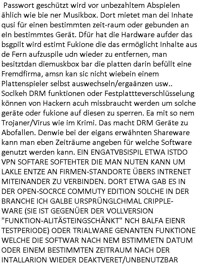 | Zur Zeit des Herrhausen Attentats als das WWW erfunden wurde wegen der Frage der Alufelgen / Autoradios nur aus der Prodzktion vom Fahrzegersteller oder auch von Dritt-anbietern wude windows ja noch ohe Netzwerk-software ausglferte so daß man die frei Wahl hatte was man nutzt. Damls lief windows auch noch nur wenn man es von DOS aus startete. Das änderte sich erst nach Windows ME. Es hat grüde warum es e Preinstallion Ebvironments namens BART-PE gibt wie der Name der Figur von den #Simpsons. Bei den Spielkonsolen istes ja jwie beiden Iphines: nur der herstelrder hardware enschdiet was aufden Markt kommt da die Cartridge-Schnitstellen quasi "closed source" sind, nicht jeder der will kann mitmachen als Entwickler und das beduet anders als bei etwa DOS PCs wo es totz der tatsche daß manvonMicsosft nicht douknetret Betriebs-geheimnis fuktionen emuliren muß sogar altertaven gibt (Dr Dos ode Freeedos) daß man die leuet erpresne kann. Eisher gutes beispilfürEprssung ist der Microchannel-BUS mitdem sich IBM slesbtasu dem PC Rennen gekegelt hat. DAs sind alles Kartelle wo man dann nachher ritrungen nur bei steimmtenherstellrn kaufkann triebrproblem hat. Als ich nun das ciheistlöchrge BigFAX Projkt entwickeln sollte wollte man mich erpssen all meinen Code zu vre.-kuafe andie Kokurenz damit die die verteilugn meiner Softare übrewachen kann statt mit. Man muß sichd as so vorstellen wie wenn man ienschiner ist dr Shcibn verdete