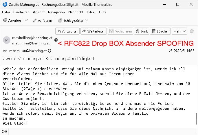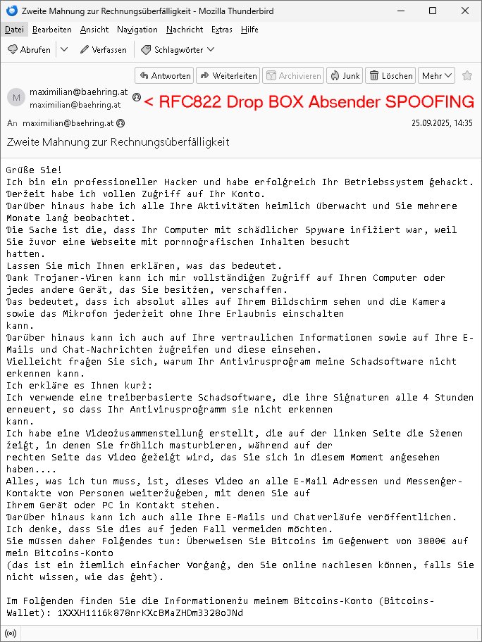 Zeitpunkt: 25 Sep 2025 15:359 Orstzeit MESZ Drop über einen forward/Mail-Address-Masq oder so etwas Absender: envelope-from <june30@ftc-i.net> IPv4: [112.169.152.37] Received: from 193.109.132.133 (EHLO frankfurt.dynip.name) by with SMTPs (version=TLS1_2 cipher=TLS_ECDHE_RSA_WITH_AES_128_GCM_SHA256); Thu, 25 Sep 2025 13:35:24 +0000 Received: from omr02.pc3.atmailcloud.com (omr02.pc3.atmailcloud.com [3.225.135.164]) by frankfurt.dynip.name (8.14.4/8.14.4/Debian-8+deb8u2) with ESMTP id 58PCZTu3019673 for <maximilian@baehring.at>; Thu, 25 Sep 2025 12:35:30 GMT DKIM-Signature: v=1; a=rsa-sha256; q=dns/txt; c=relaxed/relaxed; d=us-east.atmailcloud.com; s=201911; h=Content-Type:MIME-Version:Message-ID: Date:Subject:To:From; bh=u5***QQ==; Received: from cmr.internal.pc3.atmailcloud.com (cmr.internal.pc3.atmailcloud.com [192.168.1.1]) by omr.internal.pc3.atmailcloud.com (Exim/cmr.i-0fdd2974ec38944fd) with ESMTPS (envelope-from <june30@ftc-i.net>) id 1v1lC0-000000005vo-1iDY for <maximilian@baehring.at>; Thu, 25 Sep 2025 12:35:24 +0000 Received: from ([112.169.152.37] [112.169.152.47]) by cmr.internal.pc3.atmailcloud.com (Exim/[112.169.152.37]) with ESMTPSA (envelope-from <june30@ftc-i.net>) id 1v1lBz-000000006Ev-2IoK for <maximilian@baehring.at>; Thu, 25 Sep 2025 12:35:24 +0000 From: <maximilian@baehring.at> To: maximilian@baehring.at Subject: Zweite Mahnung zur Rechnungs=?UTF-8?B?w7xiZXJmw6RsbGlna2VpdA==?= Date: 25 Sep 2025 15:35:19 +0300 Message-ID: <20250925153519.383B536FED24D6BD@baehring.at> -------- Nachricht -------- Betreff: Zweite Mahnung zur Rechnungsüberfälligkeit Datum: 25 Sep 2025 15:35:19 +0300 Von: maximilian@baehring.at < RFC822 Drop BOX Absender SPOOFING An: maximilian@baehring.at Grüße Sie! Ich bin ein professioneller Hacker und habe erfol?reich Ihr Betriebssystem ?ehackt. ?eržeit habe ich vollen Zu?riff auf Ihr Konto. ?arüber hinaus habe ich alle Ihre Aktivitäten heimlich überwacht und Sie mehrere Monate lan? beobachtet. ?ie Sache ist die, dass Ihr Computer mit schädlicher Spyware infižiert war, weil Sie žuvor eine Webseite mit pornno?rafischen Inhalten besucht hatten. Lassen Sie mich Ihnen erklären, was das bedeutet. ?ank Trojaner-Viren kann ich mir vollständi?en Zu?riff auf Ihren Computer oder jedes andere Gerät, das Sie besitžen, verschaffen. ?as bedeutet, dass ich absolut alles auf Ihrem Bildschirm sehen und die Kamera sowie das Mikrofon jederžeit ohne Ihre Erlaubnis einschalten kann. ?arüber hinaus kann ich auch auf Ihre vertraulichen Informationen sowie auf Ihre E-Mails und Chat-Nachrichten žu?reifen und diese einsehen. Vielleicht fra?en Sie sich, warum Ihr Antiviruspro?ram meine Schadsoftware nicht erkennen kann. Ich erkläre es Ihnen kurž: Ich verwende eine treiberbasierte Schadsoftware, die ihre Si?naturen alle 4 Stunden erneuert, so dass Ihr Antiviruspro?ramm sie nicht erkennen kann. Ich habe eine Videožusammenstellun? erstellt, die auf der linken Seite die Sženen žei?t, in denen Sie fröhlich masturbieren, während auf der rechten Seite das Video ?ežei?t wird, das Sie sich in diesem Moment an?esehen haben.... Alles, was ich tun muss, ist, dieses Video an alle E-Mail Adressen und Messen?er-Kontakte von Personen weiteržu?eben, mit denen Sie auf Ihrem Gerät oder PC in Kontakt stehen. ?arüber hinaus kann ich auch alle Ihre E-Mails und Chatverläufe veröffentlichen. Ich denke, dass Sie dies auf jeden Fall vermeiden möchten. Sie müssen daher Fol?endes tun: Überweisen Sie Bitcoins im Ge?enwert von 3800€ auf mein Bitcoins-Konto (das ist ein žiemlich einfacher Vor?an?, den Sie online nachlesen können, falls Sie nicht wissen, wie das ?eht). Im Fol?enden finden Sie die Informationenžu meinem Bitcoins-Konto (Bitcoins-Wallet): 1XXXH1116k878nrKXcBMaZHDm3328oJNd Sobald der erforderliche Betra? auf meinem Konto ein?e?an?en ist, werde ich all diese Videos löschen und ein für alle Mal aus Ihrem Leben verschwinden. Bitte stellen Sie sicher, dass Sie die oben ?enannte Überweisun? innerhalb von 50 Stunden (2Ta?e +) durchführen. Ich werde eine Benachrichti?un? erhalten, sobald Sie diese E-Mail öffnen, und der Countdown be?innt. Glauben Sie mir, ich bin sehr vorsichti?, berechnend und mache nie Fehler. Sollte ich feststellen, dass Sie diese Nachricht an andere weiter?e?eben haben, werde ich sofort damit be?innen, Ihre privaten Videos öffentlich žu machen. Viel Glück! --- Am 29. September 2025 um 07:58:43 Uhr MESZ zeigt die Serveruhr root@***:~# ip -4 ad sh | grep 193.109.132.133 inet 193.109.132.133/32 scope global br80 root@***:~# uptime && date 05:58:43 up 45 days, 22:04, 1 user, load average: *** Mon Sep 29 05:58:43 *** 2025 root@***:~# Abweichunegen sind Hosclock (beim Provider) bedingt. --- # ENGLISH KRNIC is not an ISP but a National Internet Registry similar to APNIC. [ Network Information ] IPv4 Address : 112.160.0.0 - 112.191.255.255 (/11) Organization Name : Korea Telecom Service Name : KORNET Address : Gyeonggi-do Bundang-gu, Seongnam-si Buljeong-ro 90 Zip Code : 13606 Registration Date : 20090210 Name : IP Manager Phone : +82-2-500-6630 E-Mail : kornet_ip@kt.com -------------------------------------------------------------------------------- More specific assignment information is as follows. [ Network Information ] IPv4 Address : 112.169.152.0 - 112.169.152.127 (/25) Organization Name : (ju)aiosiseu Network Type : CUSTOMER Address : 90 Buljeongro Bundang-Gu Seongnam-Si Gyeonggi-Do Zip Code : 13606 Registration Date : 20220324 Name : IP Manager Phone : +82-2-500-6630 E-Mail : kornet_ip@kt.com - KISA/KRNIC WHOIS Service - root@home:~# #whois 112.169.152.37 Hier sieht man daß jemd der am (lokaal deusche MESZ ortsZeit) Freitag den 25. September 2025 15:35 Uhr üer die laut Howis koreanische IP 112.169.152.37 nutzte und eine absenderadresse namens <june30@ftc-i.net> mir dies mail mittesl seinm mailserver gedropt hat über nen forward oder absender-email-masq, oder sowas. Iterssant ist daß dabei die zeitzone für Korea +0300 nicht stimmt