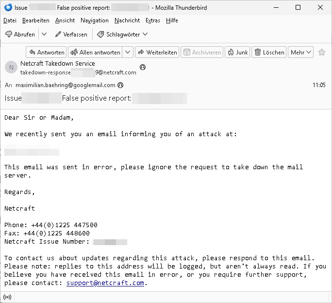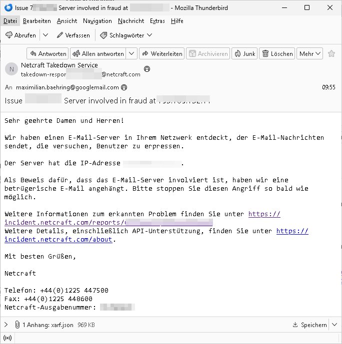 Betreff: Issue ***: False positive report: 193.109.132.11 Datum: Mon, 29 Sep 2025 09:05:32 +0000 Von: Netcraft Takedown Service <takedown-response+***@netcraft.com> An: maximilian.baehring@googlemail.com Dear Sir or Madam, We recently sent you an email informing you of an attack at: *** This email was sent in error, please ignore the request to take down the mail server. Regards, Netcraft Phone: +44(0)1225 447500 Fax: +44(0)1225 448600 Netcraft Issue Number: *** To contact us about updates regarding this attack, please respond to this email. Please note: replies to this address will be logged, but aren't always read. If you believe you have received this email in error, or you require further support, please contact: support@netcraft.com. -------- Nachricht -------- Betreff: Issue ***: Server involved in fraud at *** Datum: Mon, 29 Sep 2025 07:55:06 +0000 Von: Netcraft Takedown Service <takedown-response+***@netcraft.com> An: maximilian.baehring@googlemail.com Sehr geehrte Damen und Herren! Wir haben einen E-Mail-Server in Ihrem Netzwerk entdeckt, der E-Mail-Nachrichten sendet, die versuchen, Benutzer zu erpressen. Der Server hat die IP-Adresse ***. Als Beweis dafür, dass das E-Mail-Server involviert ist, haben wir eine betrügerische E-Mail angehängt. Bitte stoppen Sie diesen Angriff so bald wie möglich. Weitere Informationen zum erkannten Problem finden Sie unter https://incident.netcraft.com/reports/*** Weitere Details, einschließlich API-Unterstützung, finden Sie unter https://incident.netcraft.com/about . Mit besten Grüßen, Netcraft Telefon: +44(0)1225 447500 Fax: +44(0)1225 448600 Netcraft-Ausgabenummer: *** Um Aktualisierungen über diesen Angriff zu erhalten, antworten Sie bitte auf diese E-Mail. Bitte beachten Sie: Antworten auf diese Adresse werden zwar protokolliert, aber nicht immer gelesen. Wenn Sie mehr Unterstützung benötigen, oder glauben, Sie haben diese E-Mail irrtümlich erhalten, kontaktieren Sie bitte: support@netcraft.com. Diese E-Mail kann mit X-ARF-Tools geparsed werden. Weitere Informationen über X-ARF-Tools finden Sie unter http://www.xarf.org/ ------------------- Dear Sir or Madam, We have discovered an email server on your network that is sending e-mail messages that are attempting to extort users. The server has the IP address ***. We have attached an example fraudulent e-mail demonstrating the e-mail server's involvement. Please close down this attack as soon as possible. More information about the detected issue is provided at https://incident.netcraft.com/reports/*** See https://incident.netcraft.com/about for more details including API support. Regards, Netcraft Phone: +44(0)1225 447500 Fax: +44(0)1225 448600 Netcraft Issue Number: *** To contact us about updates regarding this attack, please respond to this email. Please note: replies to this address will be logged, but aren't always read. If you believe you have received this email in error, or you require further support, please contact: support@netcraft.com. This mail can be parsed with x-arf tools. Visit http://www.xarf.org/ for more information about x-arf. | |