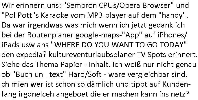 | Wir erinnern uns: "Sempron CPUs/Opera Browser" und "Pol Pott"s Karaoke vom MP3 player auf dem "handy". Da war irgendwas was mich wenn ich jetzt gedanklich bei der Routenplaner google-maps-"App" auf iPhones/ iPads usw ans "WHERE DO YOU WANT TO GO TODAY" den expedia? kultureventurlaubsplaner TV Spots erinnert. Siehe das Thema Papier - Inhalt. Ich weiß nur nicht genau ob "Buch un_ text" Hard/Soft - ware vergleichbar sind. ch mien wer ist schon so dämlich und tippt auf Kunden-fang irgdnelceh angeboet die er machen kann ins netz?