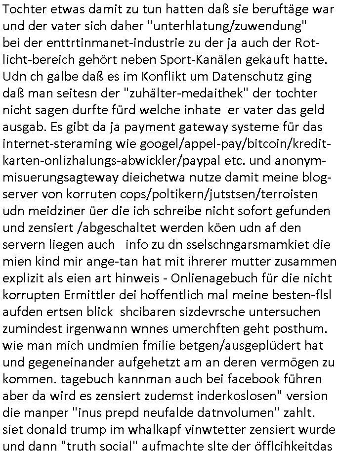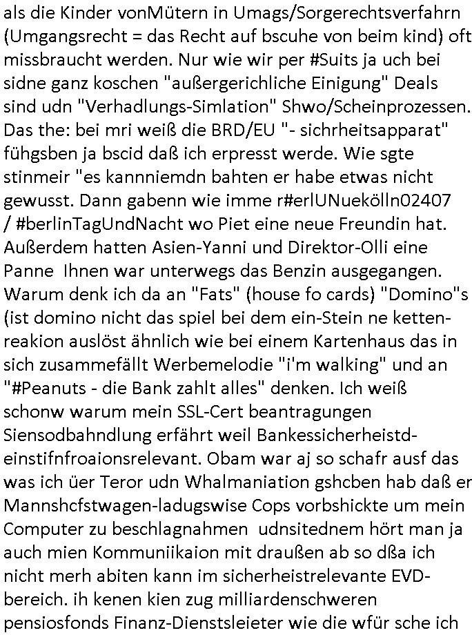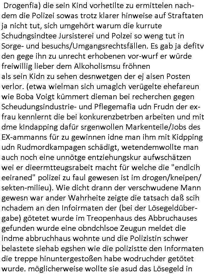| Ich bin ben um 05:30 Uhr (ich bin siet kurz vor 04:00 Uhr wach) duch sn Screnhsot uetbrochen worden. jedenfalls: Denunziation/Kidpping führte zu Jobverlust/Invalidität. Wobei diese seltsam Sckte es scheinbar auf das Geld des Ex-mannes udn kindesvaters abgesehen hatte genu wie der neue Ehe-mann. Man nutzte quis die not des Kindes-vatrs der umsien Umags-/sorgecht kämpfen musste von allen Seiten her shcmalos aus, acuh von Kollgen welche die Gelegenhiet nutzen daß er im Umgangs-/Sorge-rechtsverfahen denunzieert wurde und von der Mutter mit deren Schdungs-Beute-"Kind" erpsst um an seiner stelle karreire zu machen an ihm vorbei anstatt ihm ion sienr Notsiuation zu helfen. Die Kudesmuterwar mit gezogener waffe inien kidergebusrtag gestürmt nachdem sie eien Tipp von der obdhsclosn frau aus dem Abbruch-haus woder ifmrent getöte wurd ruchterpsuzr erhalten hatte. Man hatte irh gesaht daß das kind möglcherise auf dieser Feier sei. ich entsinne mich nicht richtig ob das richtg war vom tipp her aber es brachte - wohl auch weil es öffentlichkeitswirkug erzeilte - bewegung in die Sache. Übehuat fehte mir im Film die Info isnwiet die gut dortert Josb etwas mit "scoauil-amda / streaming" zu tun hatten, aslo dei jobs umdie der kdiesvatre gebrcht wurde vonsien koleg mit de rneführung. obdi de sienld abschlich ver-filmten um so ine art "TREU CRIEM FOLTER Pr0N" netflix Gassfasermfasi abos verkaufen zu können, als Exklisvtsry! Daß seine intriganten Kollege nur deshalb gutdotierte
