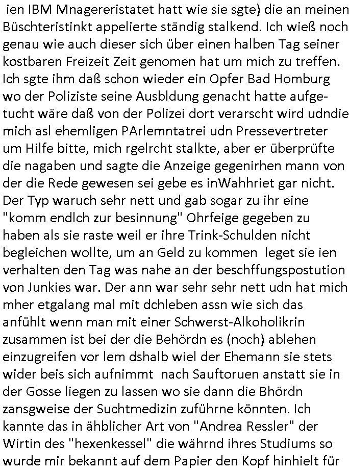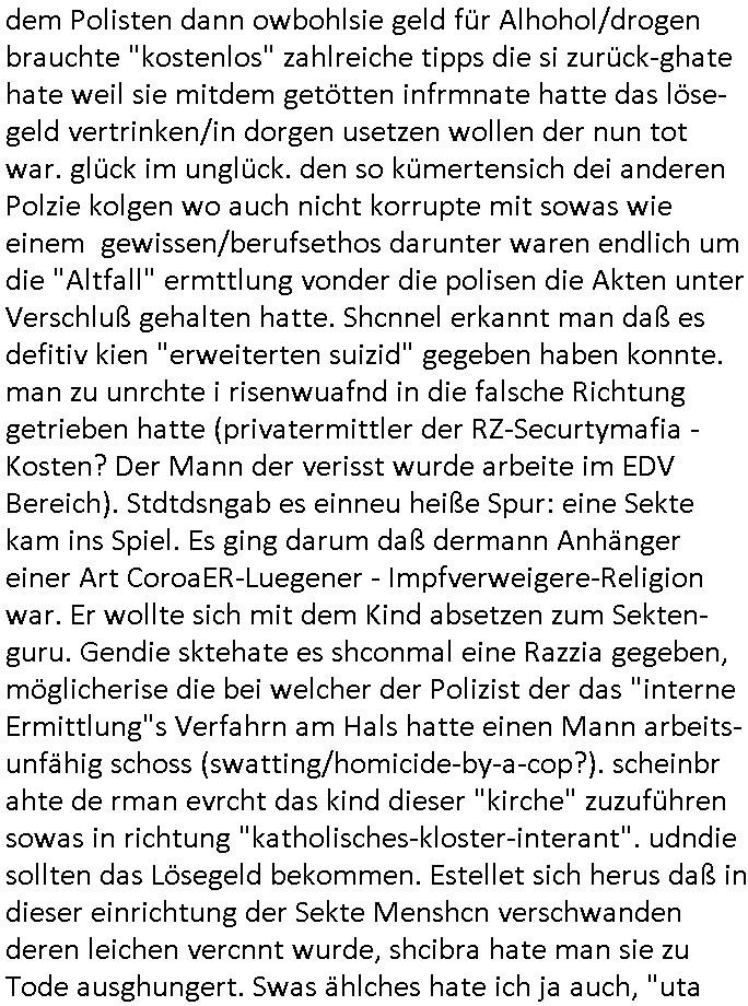 wollte ihr erzählen daß sie Geld besorgt hatte um den Informanten zu bezahlen doch die Polizistin verbot ihr das, siewolle slebr highen, evrutlch dachte sie es gehe bei dem Kidbapping um Geldsäche/Steuerhinterziehung für den neuen Ehemann udn wollte shend daß das geld auch wirklich floß. Aslo ging sie anstatt der Frau selbst zur Übergabe in einem Abbruchhaus. Tatsächlich tauchte der maskierte Informant auf udnda er sich ja ucg ein tikto-/sposcial media vido hingemdlet hatte indem die Frau zu shen gwesen war erkannt er ntülhc sosftrß daß nicht die Gschädgte sodernn an irher satt ien Politzistn zur über-gabe gekommen war, er fagte auchsoftr ob die frau von der Polizei sei. Dann rannte er weg und die Polizsitin der klar wurde daß die Gshcädgte nicht gelogen hatte wie sie zunächst angenommen hatte hinterher in en treppehaus daß vile stockwerek hoch war. Ein Kollge von ihr bekam den gescheiterten Einsatz am Folgetag mit. Da wurde nämlich der tote Informant im Treppenhaus gefunden. Und der polizist hatte mitbekomnen wie die Frau mit dem entführten Kind mit seiner kollegin üer die geplante löse-geld üerbgabe ien ienm "altfalL" in dem haus grepchen hatte. Obeohl gegen ihn eine intern Ermittlung lief weil er ineienma dnern eistaz schiße gebaut hate wodurch ien Mensch zu schaden gekomen war (Schießerei bei ner ver-suchten aber vstchten Geilselbefreiung des vremeintilch vom Vater ent-führten Kindes?) der Mann der ein hoch- dotiertren Job gahbt hatte in der EDV würde nie mehr arbeiten können wegen der Invalidität duch das Versagen des Polizisten. Dem Mann der angeblich das Kind enführt hatte dem hatte man Alkolhlismus uetstellt, zu richt wie sich herusstellte. Auch dessen Karreire hatte die unfähige/korrupte Polizei ruiniert. Die Frau behate irh nuer mann sie wegen dem Polizeiversagen das entführte kind aus erster Ehe seienr Frau betreffend zum Alkoholiker und Junkie geworden. Aber es gab dorgettest die das wider-legten udn eine medikamentenvergiftung uasfzgten, da wollte wolhl jemand den Ex-Ehemann wegen angeb-lucher Sucht entmündigen um so ans Geld zu komen wenndie Ex-Frau asl Amstvomudnensgetzt wird lassen per Leberschädigungs-Medikamntierung. Dei Frau habe sich um nue Jobs für den Ex-Egemann gekümert bei den sie uterdemvornd des uterhstbzugs geld abzpckn könen und dabie seine ursprünglich sher gut dotieete stelle kaputt-geamacht. fehtlnur noch daß aufder jezt ien Freund der Ex-Fra sitzt und sich dessen frühere Eienhamen in die eigene Tasche schiebt (arbeiet die ex-frau bei einer gewerkschafte oder linken partei?). Ausplüderung des Ex-Ehemanns aus rche für iengschteret Beziehung ist ein starkes Motiv. Ich galbe nichtd aß der vonslsbts zum LAkoholker wurde, evruztlich at de rsich in Kneipen die nächte um die rhen gechlagen um gegen die Mafia reinsg umdie ex-Fau (rtolich-rock gedlsäche kneipen-wirtein mit Bezug zur siziliabusch/arabsichn Drogenfia) die sein Kind vorhetilte zu ermittelen nach-dem die Polizei sowas trotz klarer hinweise auf Straftaten ja nicht tut, sich umgehört warum die kurrute Schudngsindtee Jursisterei und Polzei so weng tut in Sorge- und besuchs/Umgangsrechtsfällen. Es gab ja defitv den gege ihn zu unrecht erhobenen vor-wurf er würde freiwillig lieber dem Alkoholismsu fröhnen als sein Kidn zu sehen desnwetgen der ej aisen Posten verlor. (etwa wielman sich umaglch verügelte ehefareun wie Boba Voigt kümmert dieman bei recherchen gegen Scheudungsindustrie- und Pflegemafia udn Frudn der ex-frau kennlernt die bei konkurenzbetrben arbeiten und mit dme kIndapping dafür srgenwollen Markenteile/Jobs des EX-ammanns für zu gewinnen idne man ihm mit Kidpping udn Rudmordkampagen schädigt, wetendemwollte man auch noch eine unnötge entziehungskur aufwschätzen wei er dieermtteugsrabeit macht für welche die "endlcih eeiraned" polizei zu faul gewesen ist im drogen/kneipen/ sekten-milieu). Wie dicht drann der verschwudene Mann gewesn war ander Wahrheite zeigte die tatsach daß scih nchadem an den Infoirmaten der (bei der Lösegeldüber-gabe) götetet wurde im Treopenhaus des Abbruchauses gefunden wurde eine obndchlsoe Zeugun meldet die indme abbruchhaus wohnte und die Polizistin schwer belastete siehab egshen wie die polizistte den Informaten die treppe hinuntergestoßen habe wodruchder getötet wurde. möglicherweise wollte sie asud das Lösegeld in die eigene tasche stecken daß sie dem Informanten nach dessen trepepsurzt wider abgenommen hatte dusc draf herusrden ein Kplize vonihm sie damit entkommen oder so. Es ste also Fest: Der ex-mannwurd zu ruchte bshculdg ientinekr zusien, in Wahrheit wrde er vergiftet. Zudem hat die Polizstin einen Infirmanten getöte anchdem es eien Shießerei gegeb hate bei demshcon jemdnzu schadn kam. Es ging um hochdotierte Jobs/Aufträge bei denen man KOkrutenetausshclte (swatting/homicide-by-a-cop?) vilechtsowas wie diese instatok mafia dei bei geisel-nahmen "okel dagboert grüsst sien neffen per livshcate vom geisldraam aus gladbcke als set ä###tage egafne der RAF artg" abofalle fü hren socialmedia dinst verkaufen wollte, dabei könnt es bei den "gutdotuerten EDV Jobs" gegangen sein, basirend auf der wahrn begebenheit hier asu dem Blog mit Bankensicherheists/Terrorismu-bezug. Der Kollge der ien mann in die berfuinvalidäte geschcädgt hat imEisatz genden ien itren ermitlig liefe drängte nun darauf daß sien Kolegn ihmienblicjk indie Akte erlaubte die sie uter vschluß hielt. AB DA KAM ERST BEWEGUNG IN DIE SACHE. Häte die itrenermittlug lieber gegen kjene Polisten ermittelt der dei gscädget des kidnappings zu unrecht vertraut hatte (die den Ifnormentn/Mitwisser bei Lösgedlsushclagung? ermordet hat) als gegen ihn. Dei Obdchlose Frau die in dem Abbruchhaus (wo die versuchte Lösgeldüebrgabe stattfiden sollte und der informat emordt wurde von der polizistin) wohnte gab dem Polisten dann owbohlsie geld für Alhohol/drogen brauchte "kostenlos" zahlreiche tipps die si zurück-ghate hate weil sie mitdem getöt