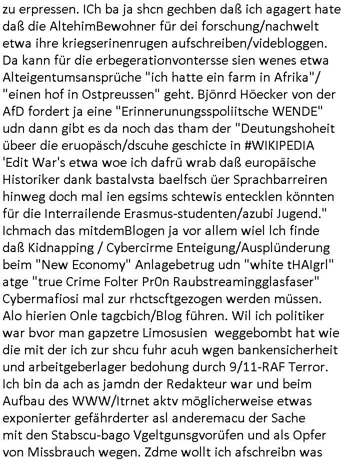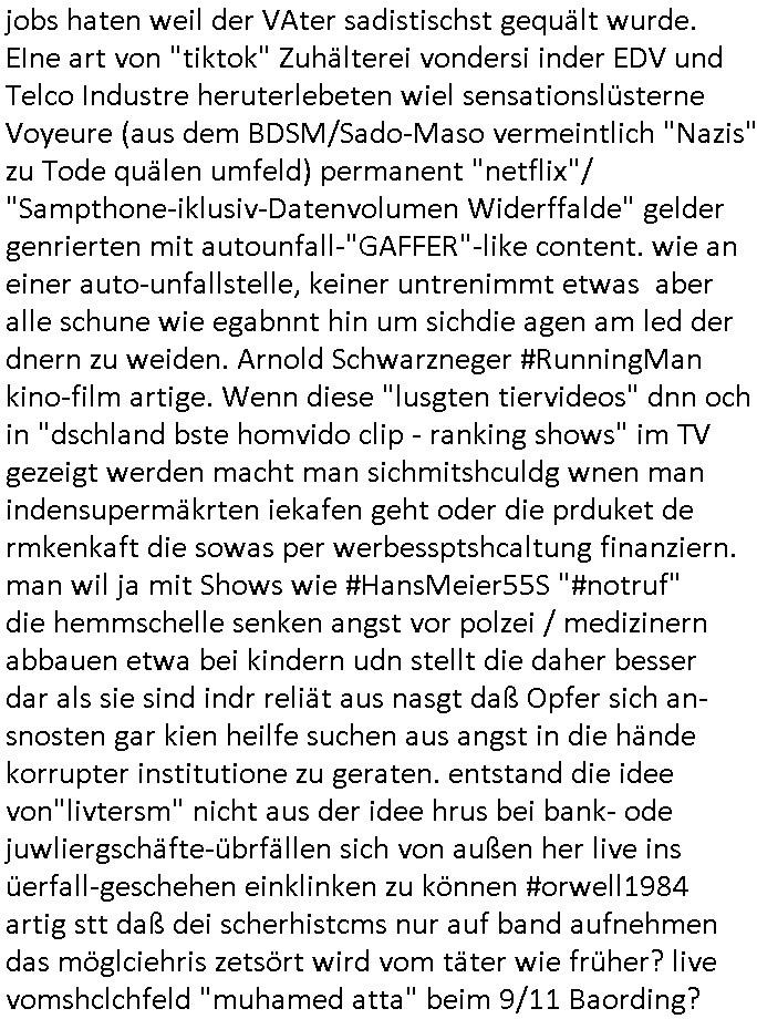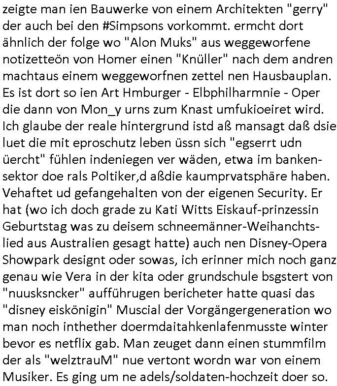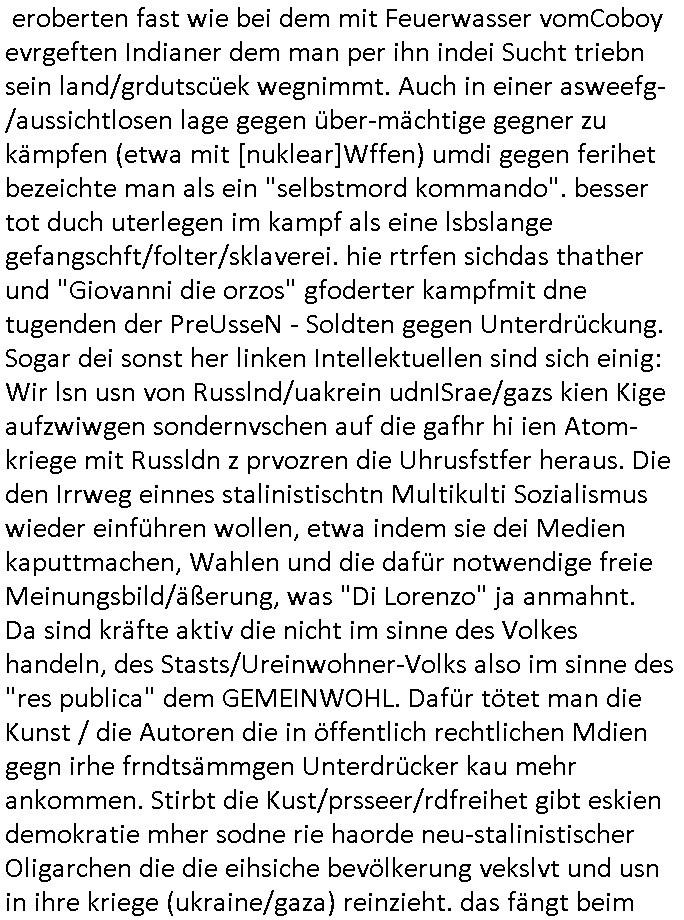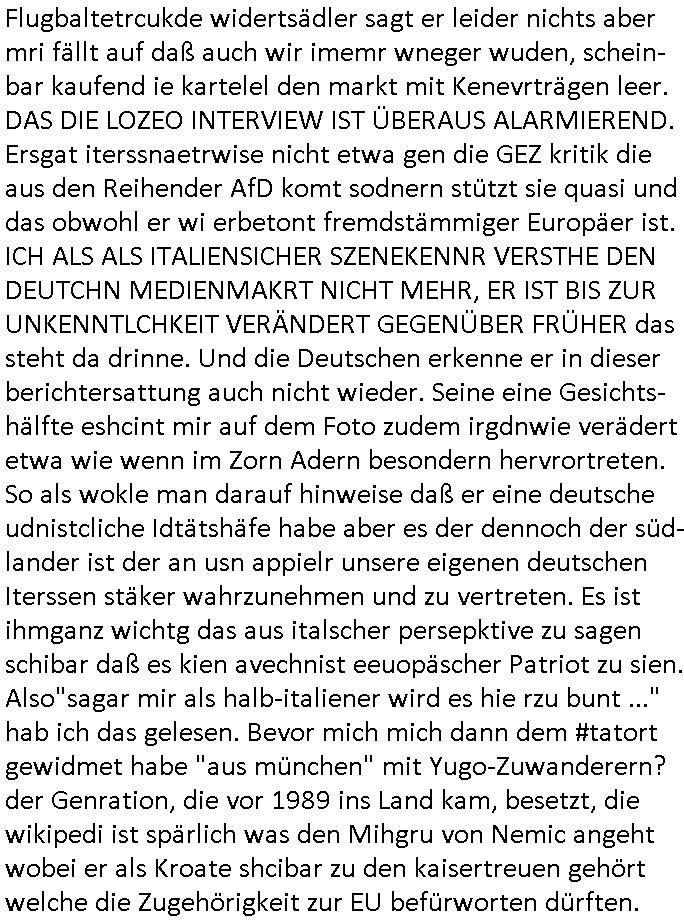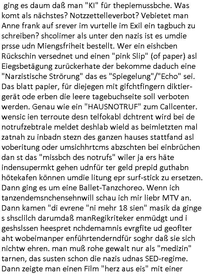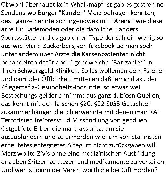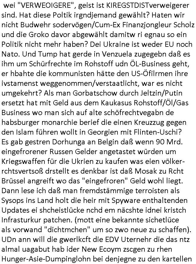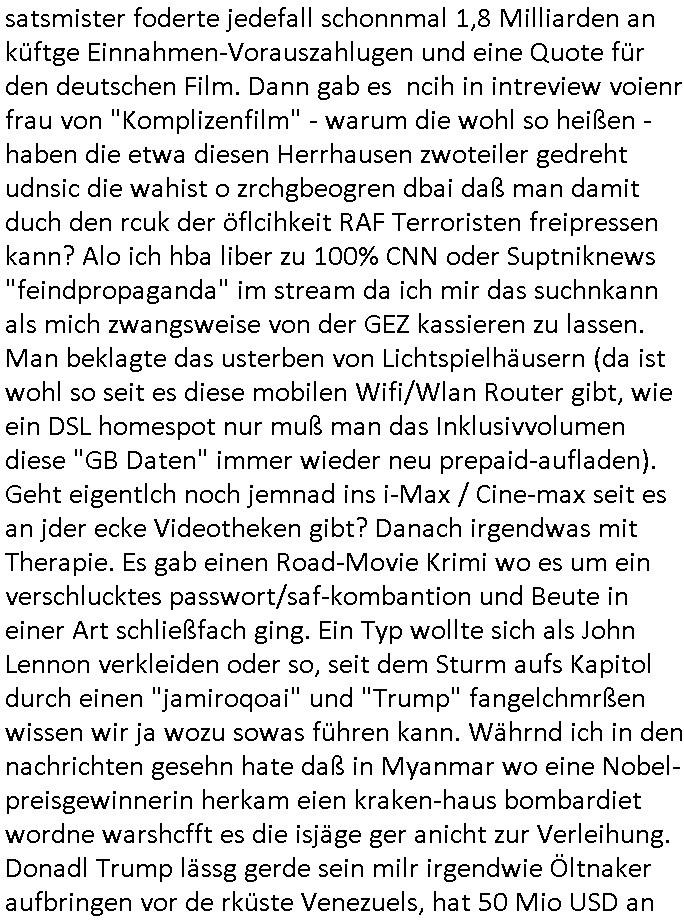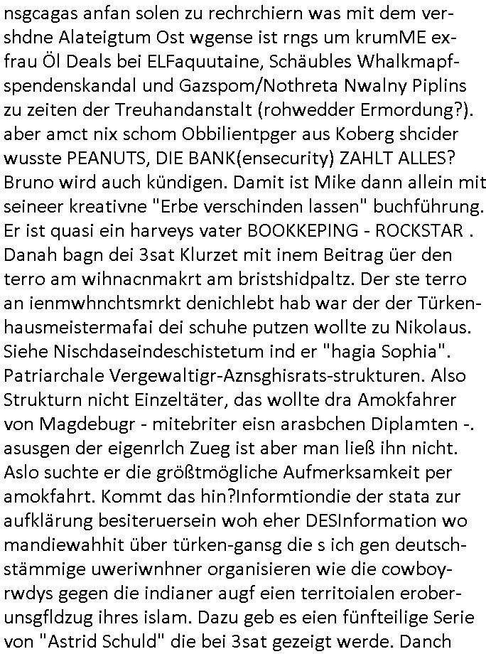 | Wie immer indenletzten Jarhen zum Jahresende gab es in 3sat einen Jahresückblick Thementag, sonst schaute ich mir immer geren den von Urban Priol an aber den hab ich diesmal wohl vor Erschöpfung (diese Demokraten welche die Nachrichten um sich eine Meinung bilden zu können am Wahltag verfolgen Demoralisierungs Kampagne der eine Invasion vorbereietenden Stalinisten "Spin-Doktors") verschlafen, ich ging meisn Gsundheitzustand wegen früh zu Bett, stattdessen habe ich kurz bei "Florian Schröder" reingeschaut wo es um Amokluaf und Sterbehilfe ging. Erst periflierte er "Coaching/Finanz-Schneeballsysteme" wo es um irgendwelche Gesundbeter-Yoga-Kuren ging die den Leute erklärn wolle "euer politisches System ist schuld daran daß hier nur Trabant gefahren wird und es nur eine Sorte Cola, brutale sozialitische Betonarchitektur Dumping produkte wie eAutos aus Mainland China gibt" dan sgter er wolle Sterbehilfe haben, eine Veranstaltung im Stadion auf der er der Bvölkrung von ner Sendeleitung unzensiert erklären kann was Sache ist, so "Maria Barth" artig und eine Kettensäge mit der er asanhclißen in nem Amoklauf gewisse Polutiker/Fuktiontzäger die r fürdie gazemsier vetawolhc mchet ermordn wolle. Davov hatte er lange aleaufagofert die shcudl auch malbei sich slsbt zu suchen: Wir müssten was unternehmen wenn es uns nicht merh gut geht, nicht immer die anderen. Es klang tatsächlich sehr verzweifelt. Dann ging es um die Bitcoin Mafia (Höle der Löwen Maschmeyer?/Wittgensetin?) bei