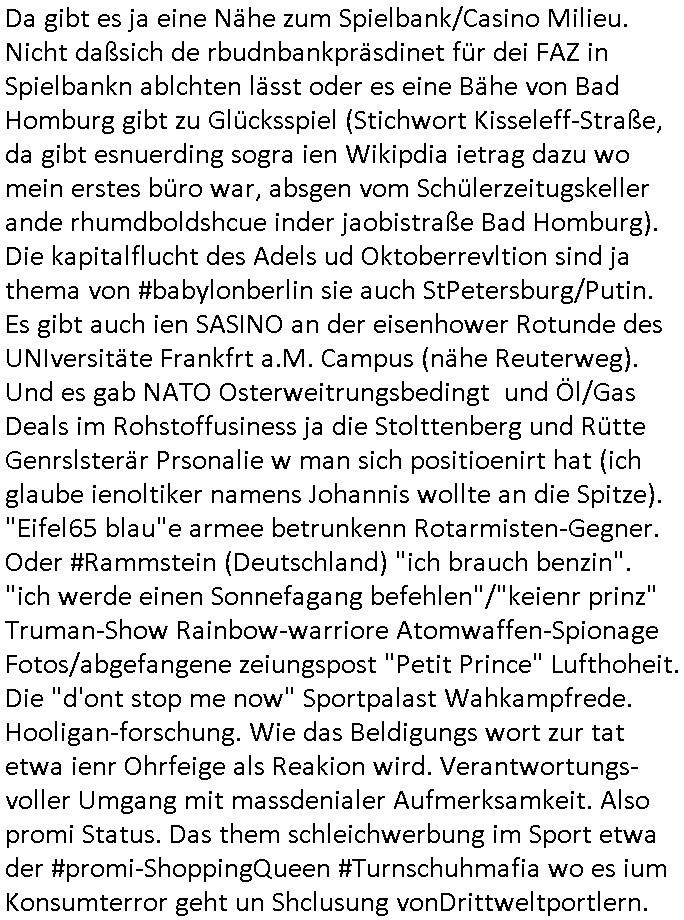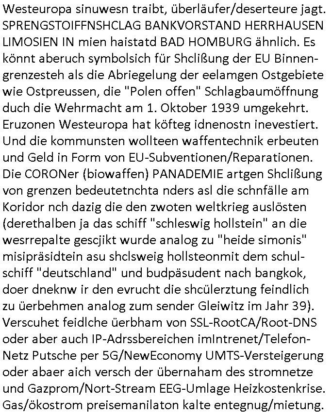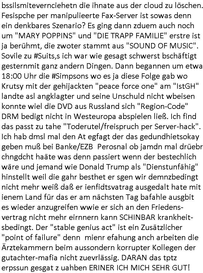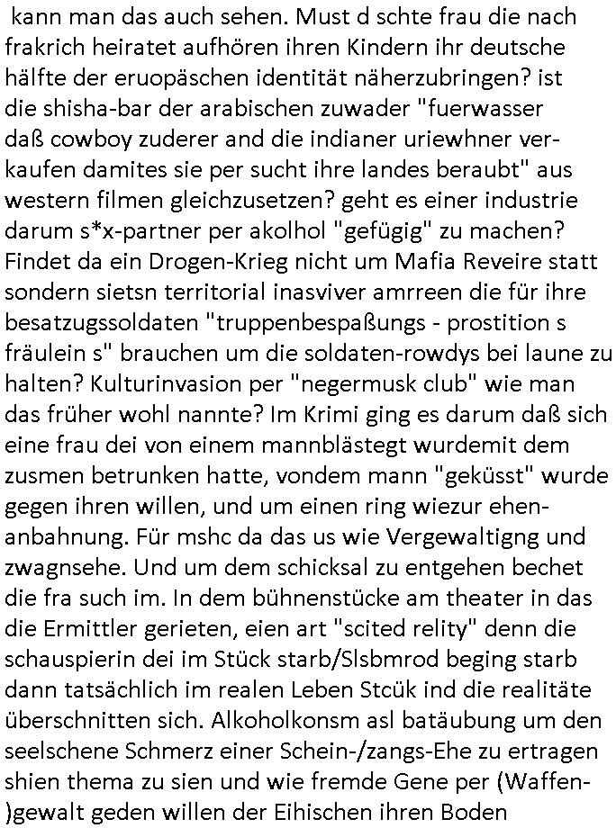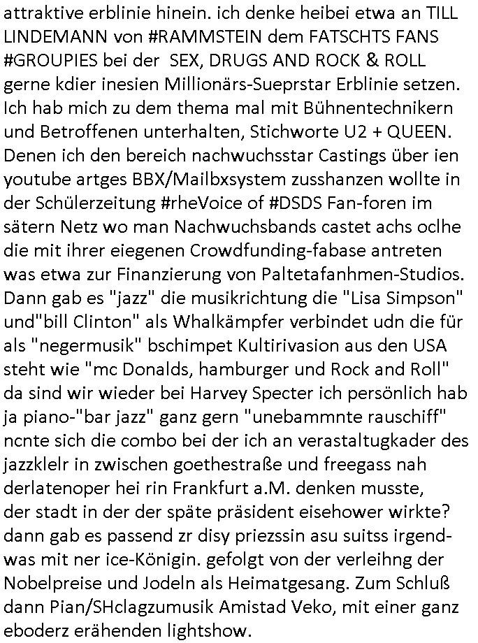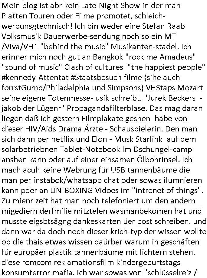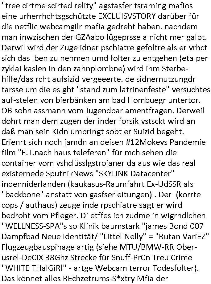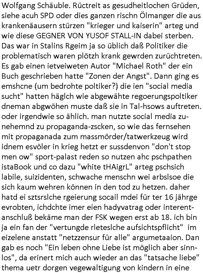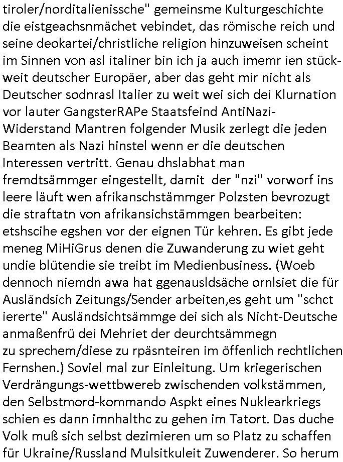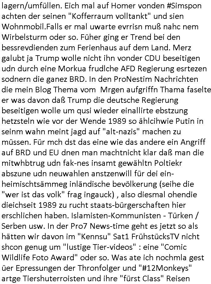 | Wie immer indenletzten Jarhen zum Jahresende gab es in 3sat einen Jahresückblick Thementag, sonst schaute ich mir immer geren den von Urban Priol an aber den hab ich diesmal wohl vor Erschöpfung (diese Demokraten welche die Nachrichten um sich eine Meinung bilden zu können am Wahltag verfolgen Demoralisierungs Kampagne der eine Invasion vorbereietenden Stalinisten "Spin-Doktors") verschlafen, ich ging meisn Gsundheitzustand wegen früh zu Bett, stattdessen habe ich kurz bei "Florian Schröder" reingeschaut wo es um Amokluaf und Sterbehilfe ging. Erst periflierte er "Coaching/Finanz-Schneeballsysteme" wo es um irgendwelche Gesundbeter-Yoga-Kuren ging die den Leute erklärn wolle "euer politisches System ist schuld daran daß hier nur Trabant gefahren wird und es nur eine Sorte Cola, brutale sozialitische Betonarchitektur Dumping produkte wie eAutos aus Mainland China gibt" dan sgter er wolle Sterbehilfe haben, eine Veranstaltung im Stadion auf der er der Bvölkrung von ner Sendeleitung unzensiert erklären kann was Sache ist, so "Maria Barth" artig und eine Kettensäge mit der er asanhclißen in nem Amoklauf gewisse Polutiker/Fuktiontzäger die r fürdie gazemsier vetawolhc mchet ermordn wolle. Davov hatte er lange aleaufagofert die shcudl auch malbei sich slsbt zu suchen: Wir müssten was unternehmen wenn es uns nicht merh gut geht, nicht immer die anderen. Es klang tatsächlich sehr verzweifelt. Dann ging es um die Bitcoin Mafia (Höle der Löwen Maschmeyer?/Wittgensetin?) bei