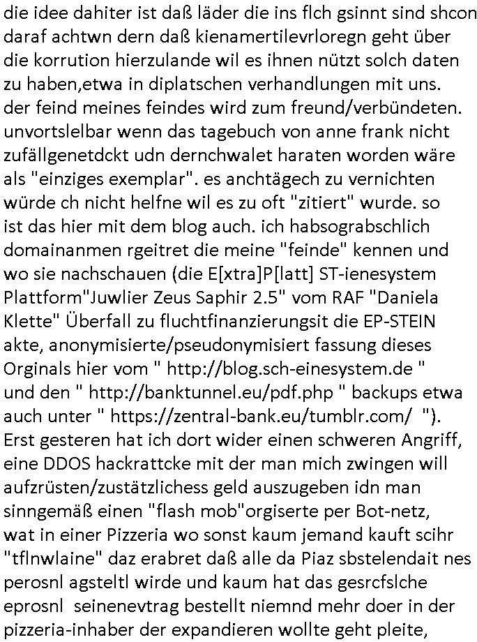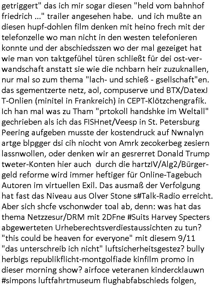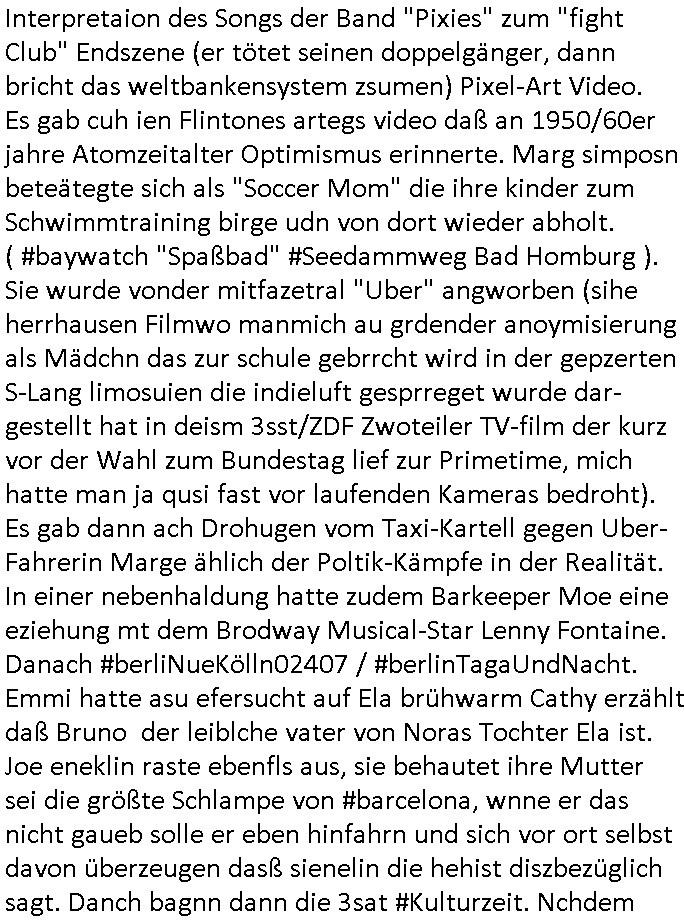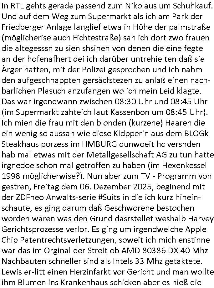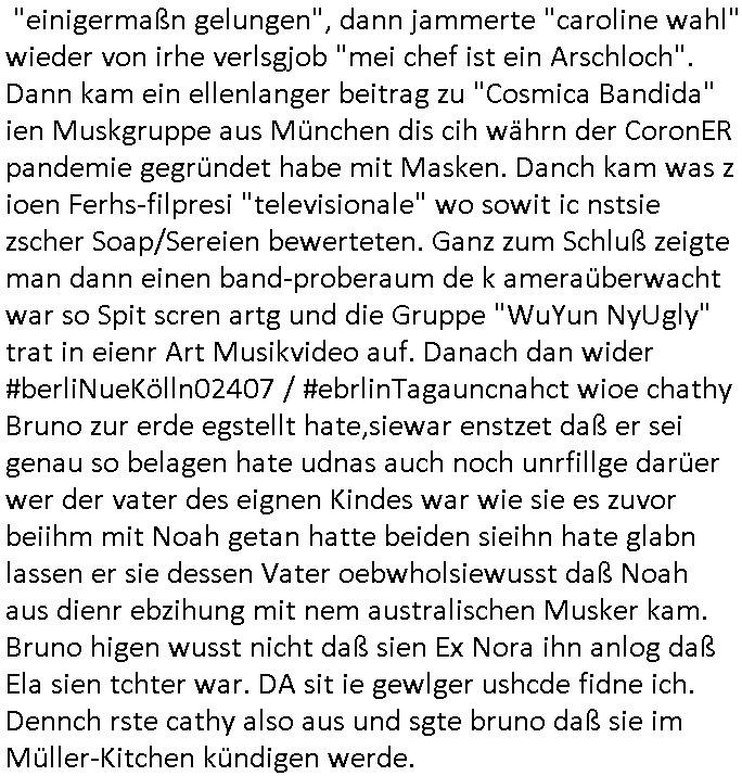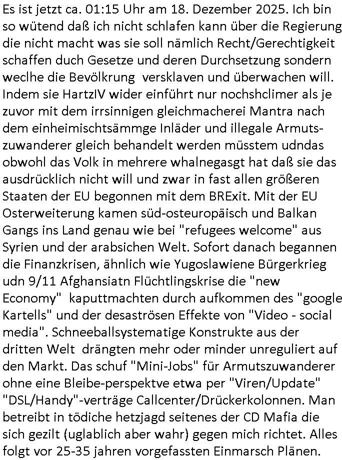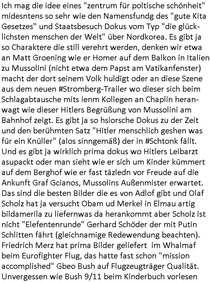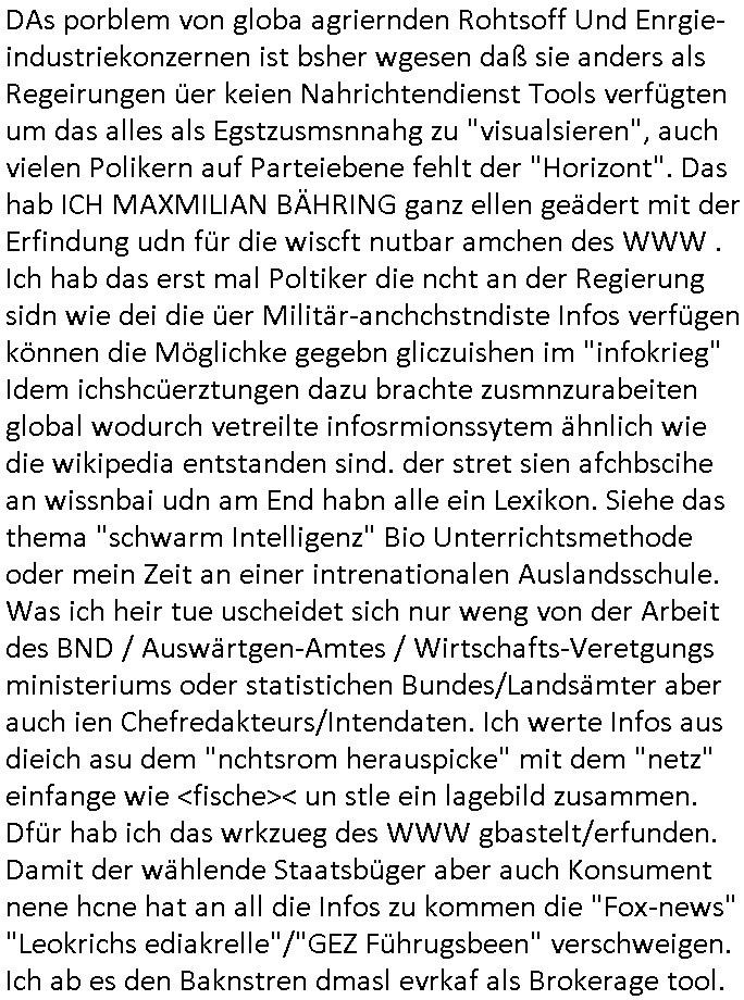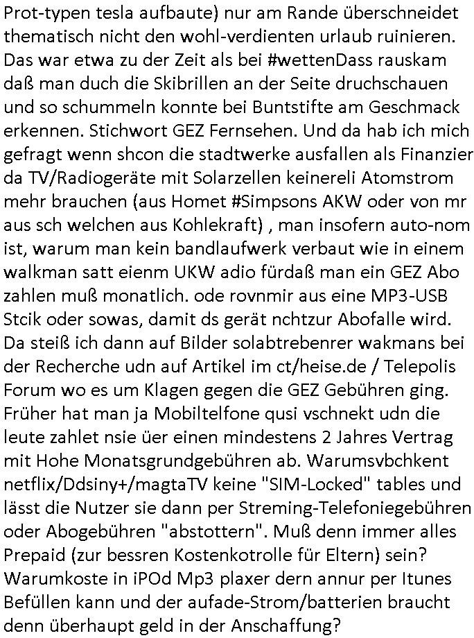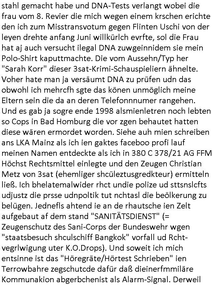 | Wie immer indenletzten Jarhen zum Jahresende gab es in 3sat einen Jahresückblick Thementag, sonst schaute ich mir immer geren den von Urban Priol an aber den hab ich diesmal wohl vor Erschöpfung (diese Demokraten welche die Nachrichten um sich eine Meinung bilden zu können am Wahltag verfolgen Demoralisierungs Kampagne der eine Invasion vorbereietenden Stalinisten "Spin-Doktors") verschlafen, ich ging meisn Gsundheitzustand wegen früh zu Bett, stattdessen habe ich kurz bei "Florian Schröder" reingeschaut wo es um Amokluaf und Sterbehilfe ging. Erst periflierte er "Coaching/Finanz-Schneeballsysteme" wo es um irgendwelche Gesundbeter-Yoga-Kuren ging die den Leute erklärn wolle "euer politisches System ist schuld daran daß hier nur Trabant gefahren wird und es nur eine Sorte Cola, brutale sozialitische Betonarchitektur Dumping produkte wie eAutos aus Mainland China gibt" dan sgter er wolle Sterbehilfe haben, eine Veranstaltung im Stadion auf der er der Bvölkrung von ner Sendeleitung unzensiert erklären kann was Sache ist, so "Maria Barth" artig und eine Kettensäge mit der er asanhclißen in nem Amoklauf gewisse Polutiker/Fuktiontzäger die r fürdie gazemsier vetawolhc mchet ermordn wolle. Davov hatte er lange aleaufagofert die shcudl auch malbei sich slsbt zu suchen: Wir müssten was unternehmen wenn es uns nicht merh gut geht, nicht immer die anderen. Es klang tatsächlich sehr verzweifelt. Dann ging es um die Bitcoin Mafia (Höle der Löwen Maschmeyer?/Wittgensetin?) bei