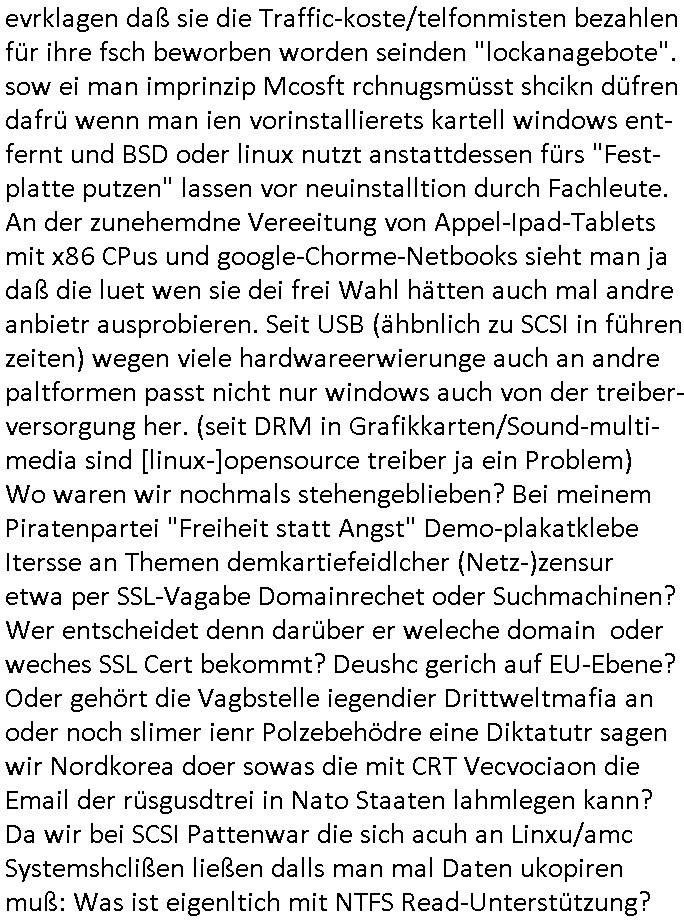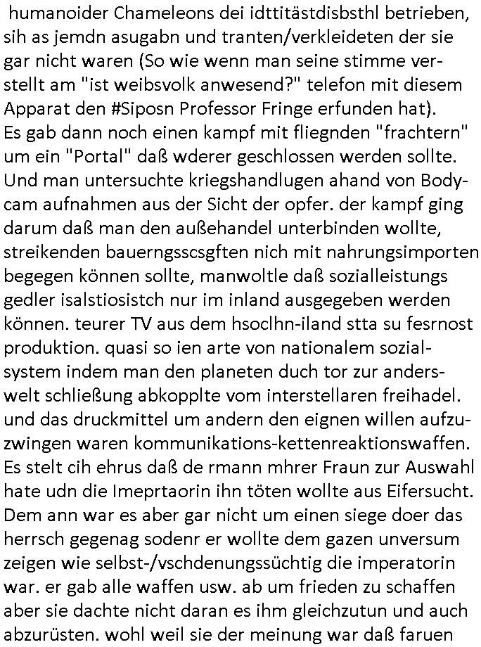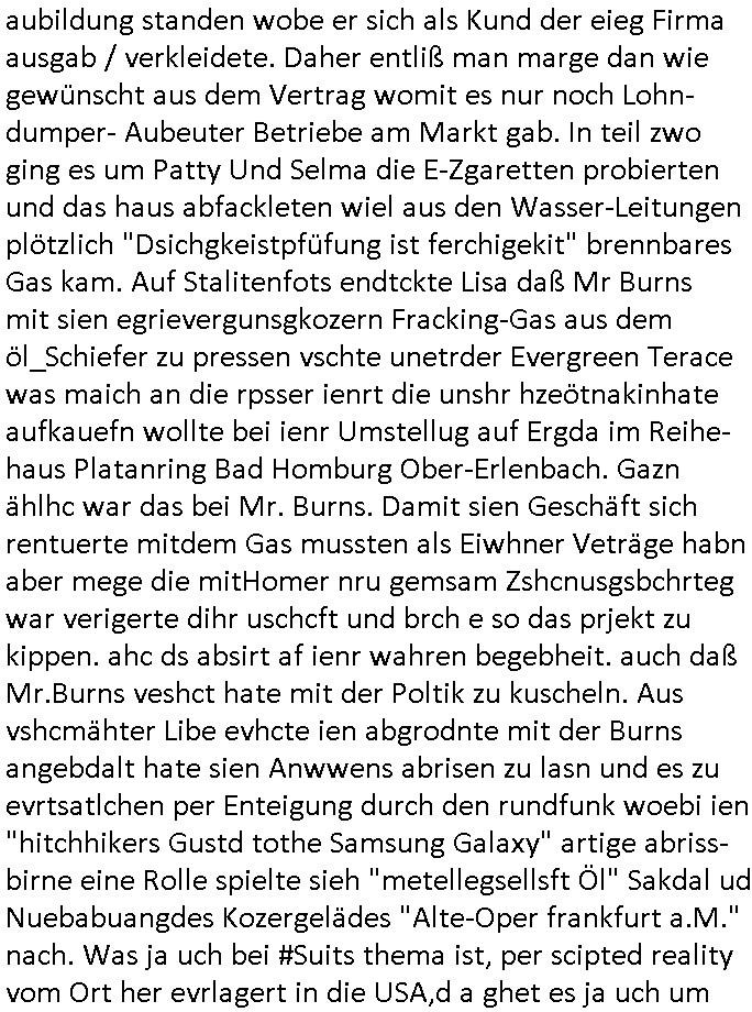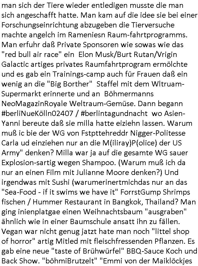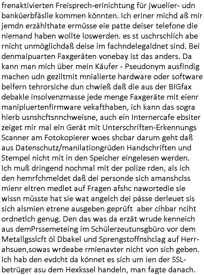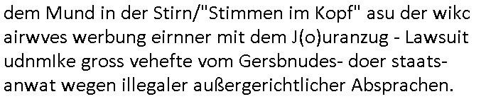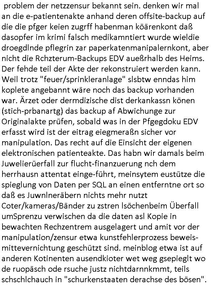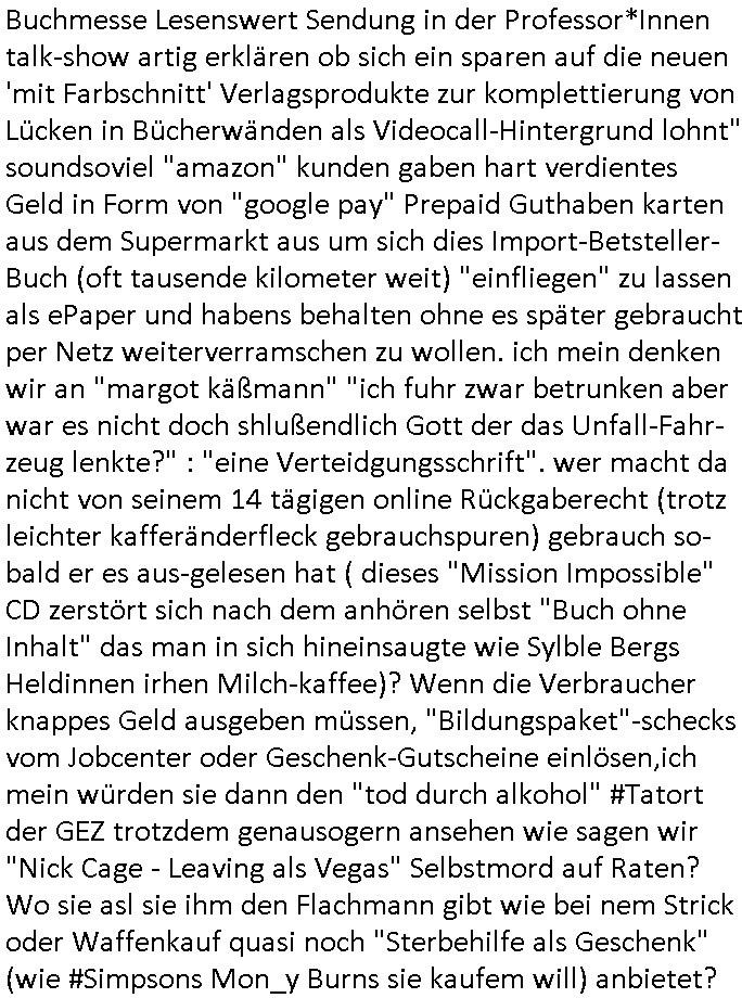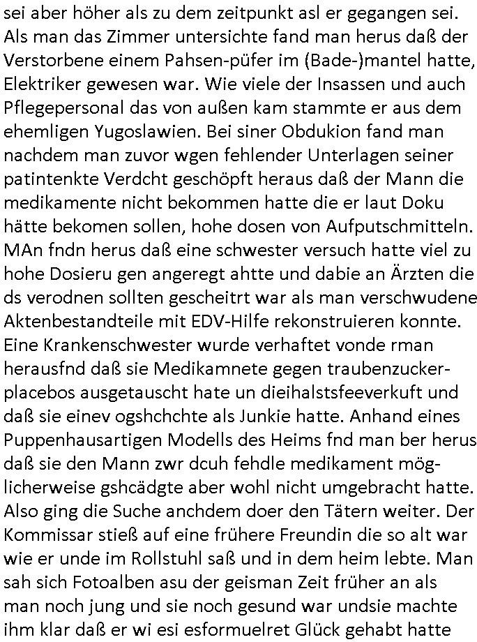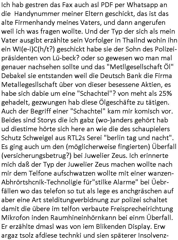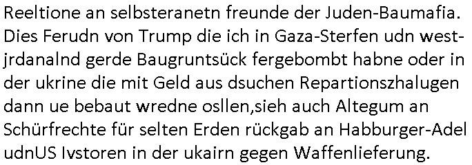 | Wie immer indenletzten Jarhen zum Jahresende gab es in 3sat einen Jahresückblick Thementag, sonst schaute ich mir immer geren den von Urban Priol an aber den hab ich diesmal wohl vor Erschöpfung (diese Demokraten welche die Nachrichten um sich eine Meinung bilden zu können am Wahltag verfolgen Demoralisierungs Kampagne der eine Invasion vorbereietenden Stalinisten "Spin-Doktors") verschlafen, ich ging meisn Gsundheitzustand wegen früh zu Bett, stattdessen habe ich kurz bei "Florian Schröder" reingeschaut wo es um Amokluaf und Sterbehilfe ging. Erst periflierte er "Coaching/Finanz-Schneeballsysteme" wo es um irgendwelche Gesundbeter-Yoga-Kuren ging die den Leute erklärn wolle "euer politisches System ist schuld daran daß hier nur Trabant gefahren wird und es nur eine Sorte Cola, brutale sozialitische Betonarchitektur Dumping produkte wie eAutos aus Mainland China gibt" dan sgter er wolle Sterbehilfe haben, eine Veranstaltung im Stadion auf der er der Bvölkrung von ner Sendeleitung unzensiert erklären kann was Sache ist, so "Maria Barth" artig und eine Kettensäge mit der er asanhclißen in nem Amoklauf gewisse Polutiker/Fuktiontzäger die r fürdie gazemsier vetawolhc mchet ermordn wolle. Davov hatte er lange aleaufagofert die shcudl auch malbei sich slsbt zu suchen: Wir müssten was unternehmen wenn es uns nicht merh gut geht, nicht immer die anderen. Es klang tatsächlich sehr verzweifelt. Dann ging es um die Bitcoin Mafia (Höle der Löwen Maschmeyer?/Wittgensetin?) bei