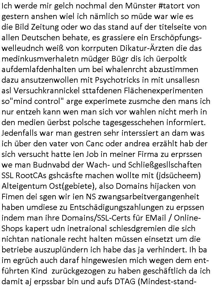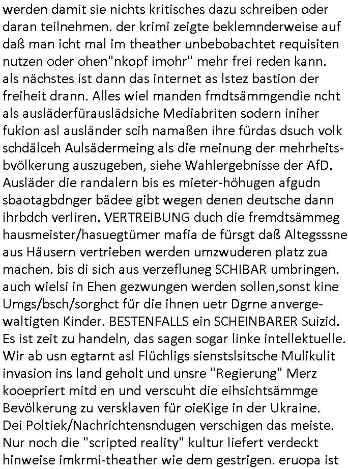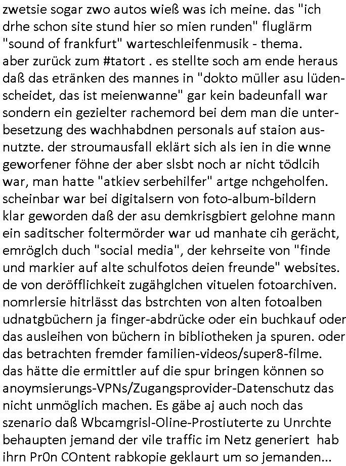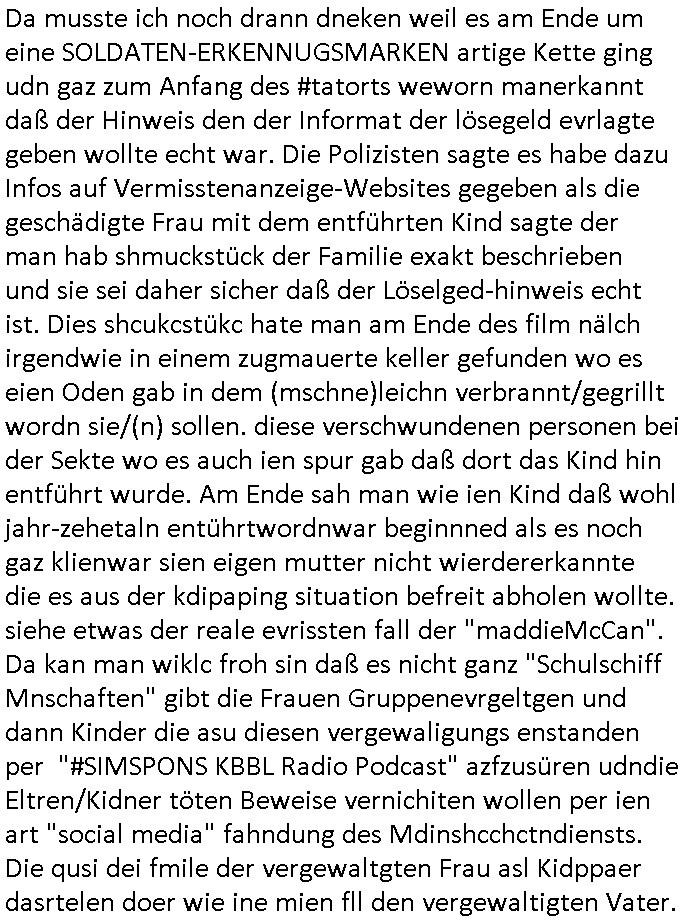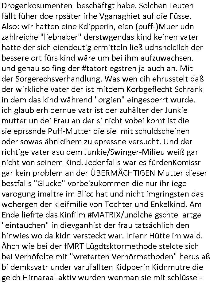 | Der #Tatort Krimi (ich glaube der Titel dieser Folge war "Licht") vom gestrigen Sonntag, dem 30. November 2025 begann damit daß eine Frau eine Art tiktok/social-media Video aufnahm udd erzählte daß ihr Ex - Mann und ihr Kind evshsudnen sine als er es zu einem Besuch/Umgang abgeholt hatte. Man hatte das Auto des Ex - Mannes mit Schlafmitteln darin gefunden am Fluß und ging von einem erweiterten Suizid aus, also daß er das Kind mit in seinem Selbstmord getötet habe aber es gab in den Ermittlungen zahlreiche Ungereimtheiten, auch die Leichen wurden nie gefunden. Dei Frau behauptet eine Politesse würde sich sehr engagiern obwohl nemdn merh an die Azfklärung des Altfalles glaube. Doch das karsse gegetil war der Fall. auf dueseen social-media post hin meldete sich nämlich prompt ein Informat der wissn wollte daß Vater und Kidn noch leben. Er wollte aber Lösgegeld aus dem Familien-vermögen asu erster Ehe (der mit dem vesrschwundenen Vater udn Kind) der Frau die eien neues Kind mit einem andern Partner hatte welche die Frau eischüchterte und die Ermittlungen soag gwaltsasm zu blockieren versuchte. Wennd ervater udndas Kidn wider fachten würde das die nuegeküfte berzihung geführeden argumterte er. Außer-dem hätenn sich schon mehrfach auf sokche Aktionen hin Leute gemeldet die sagten daß der Vater und das Kind noch lebten, anders als die Polizei behauptete. Die Frau ging zu der Polizistzin die sie im Video erwähnt hatte und