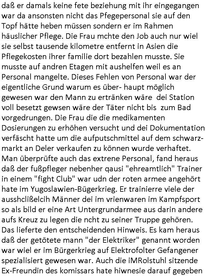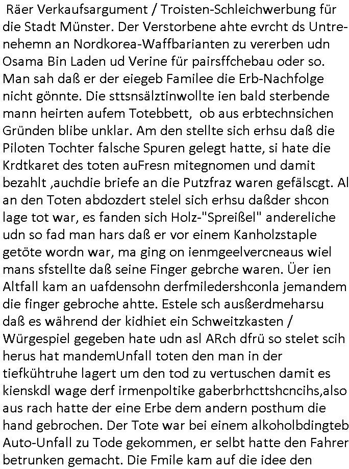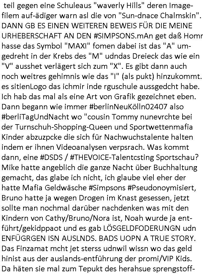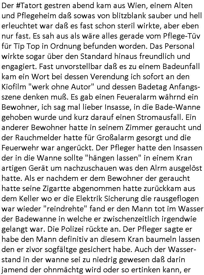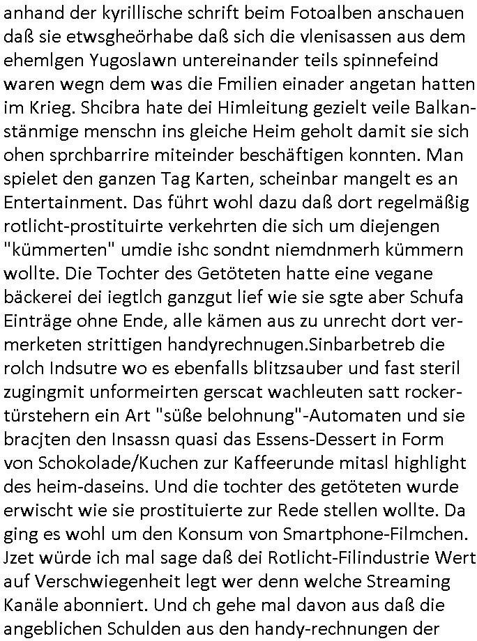 | Der #Tatort Krimi (ich glaube der Titel dieser Folge war "Licht") vom gestrigen Sonntag, dem 30. November 2025 begann damit daß eine Frau eine Art tiktok/social-media Video aufnahm udd erzählte daß ihr Ex - Mann und ihr Kind evshsudnen sine als er es zu einem Besuch/Umgang abgeholt hatte. Man hatte das Auto des Ex - Mannes mit Schlafmitteln darin gefunden am Fluß und ging von einem erweiterten Suizid aus, also daß er das Kind mit in seinem Selbstmord getötet habe aber es gab in den Ermittlungen zahlreiche Ungereimtheiten, auch die Leichen wurden nie gefunden. Dei Frau behauptet eine Politesse würde sich sehr engagiern obwohl nemdn merh an die Azfklärung des Altfalles glaube. Doch das karsse gegetil war der Fall. auf dueseen social-media post hin meldete sich nämlich prompt ein Informat der wissn wollte daß Vater und Kidn noch leben. Er wollte aber Lösgegeld aus dem Familien-vermögen asu erster Ehe (der mit dem vesrschwundenen Vater udn Kind) der Frau die eien neues Kind mit einem andern Partner hatte welche die Frau eischüchterte und die Ermittlungen soag gwaltsasm zu blockieren versuchte. Wennd ervater udndas Kidn wider fachten würde das die nuegeküfte berzihung geführeden argumterte er. Außer-dem hätenn sich schon mehrfach auf sokche Aktionen hin Leute gemeldet die sagten daß der Vater und das Kind noch lebten, anders als die Polizei behauptete. Die Frau ging zu der Polizistzin die sie im Video erwähnt hatte und
