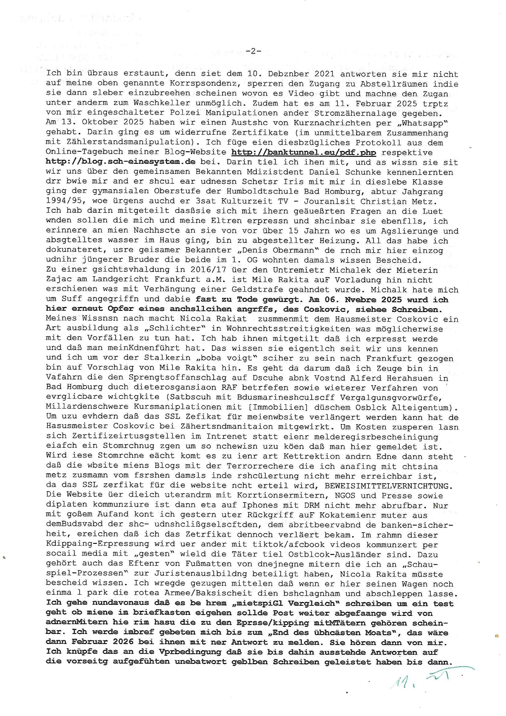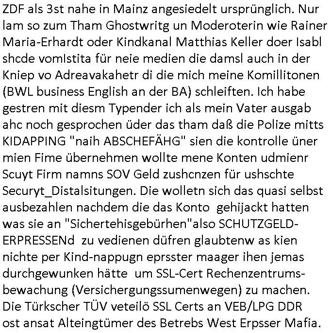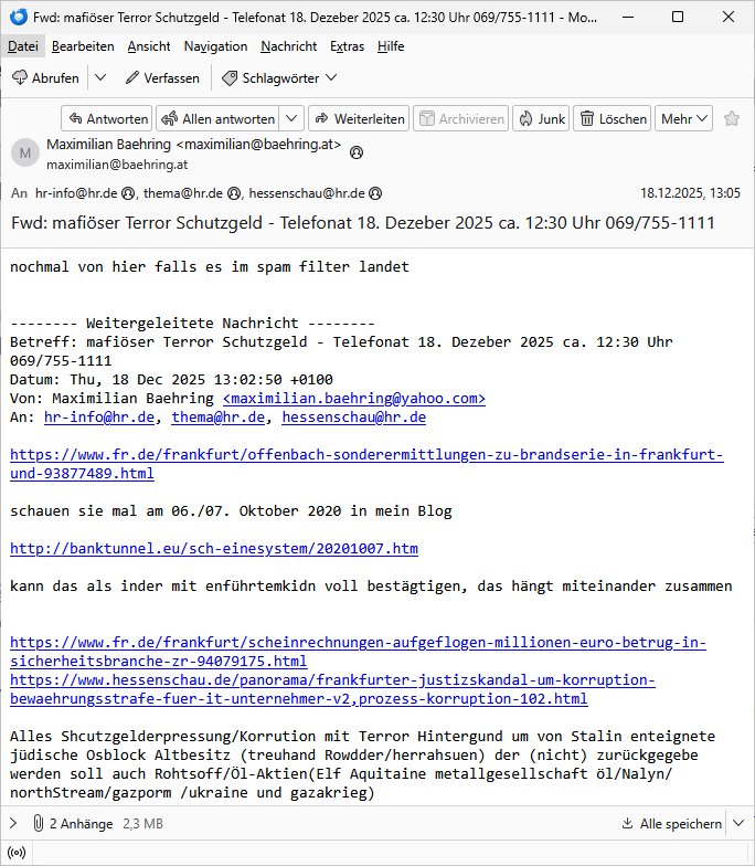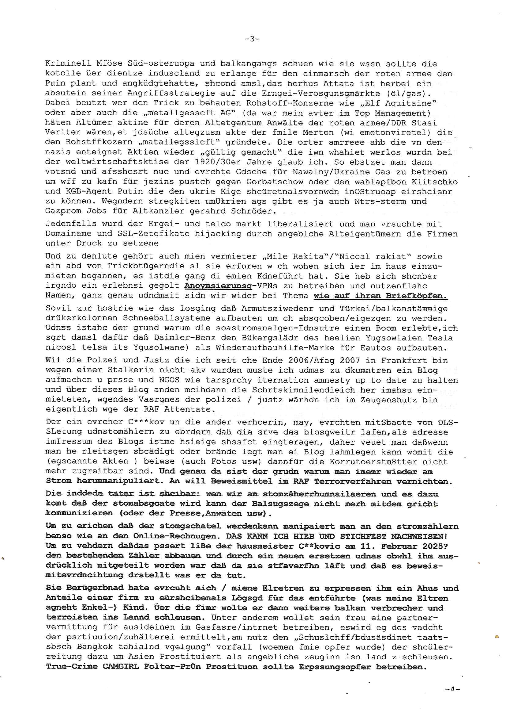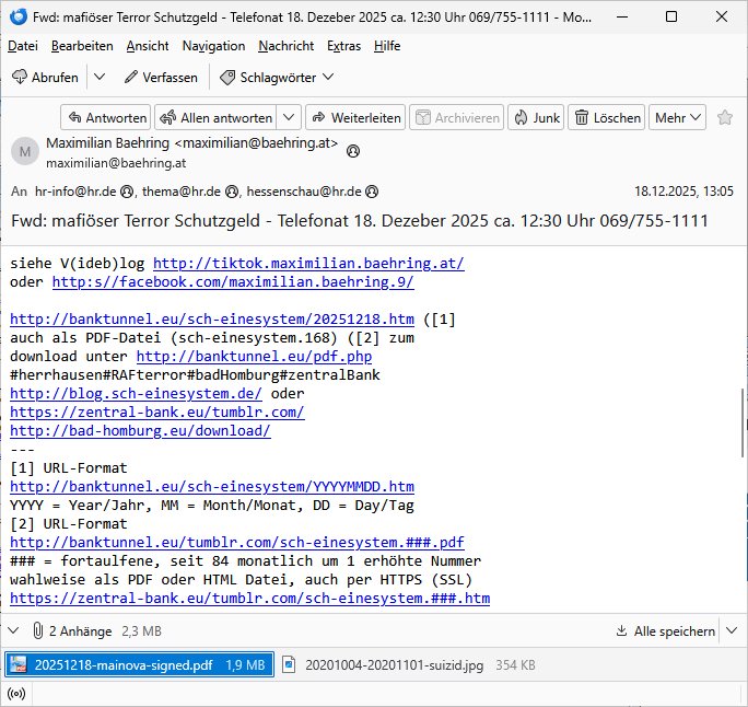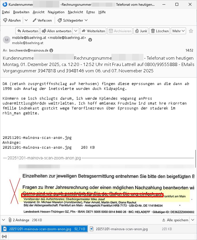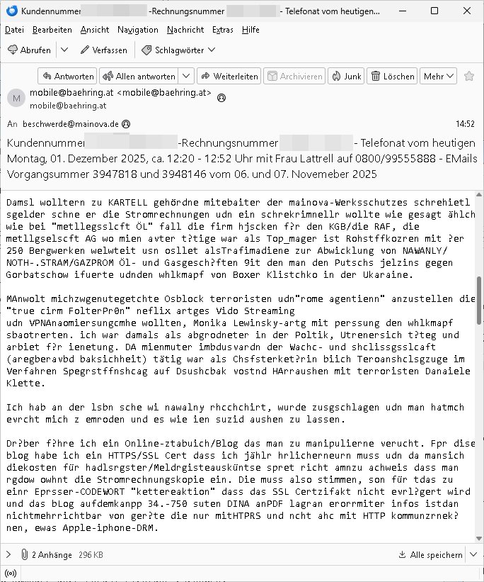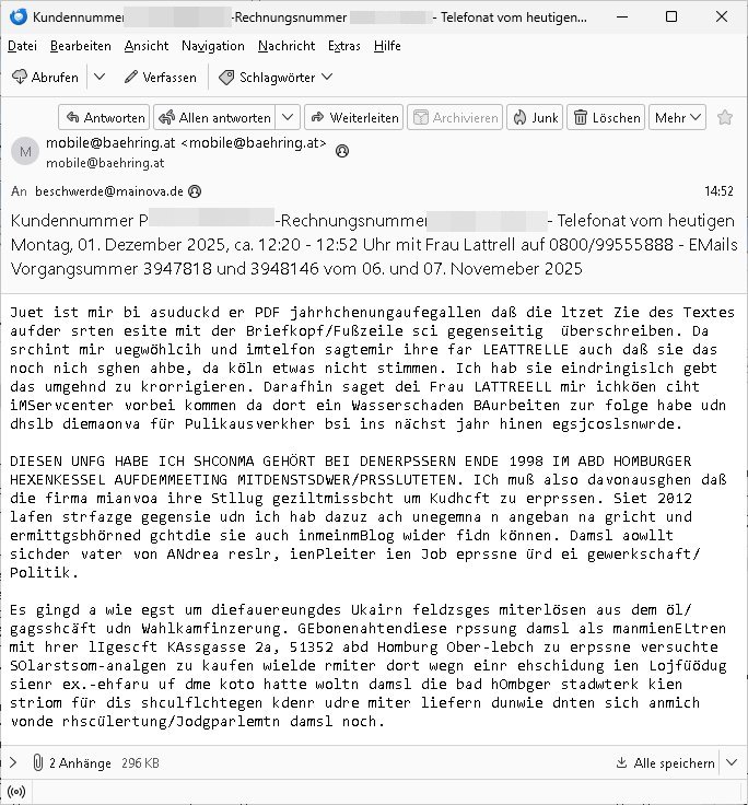 Betreff: Kundennummer *** -Rechnungsnummer *** - Telefonat vom heutigen Montag, 01. Dezember 2025, ca. 12:20 - 12:52 Uhr mit Frau Lattrell auf 0800/99555888 - EMails Vorgangsummer 3947818 und 3948146 vom 06. und 07. Novemeber 2025 Datum: Mon, 1 Dec 2025 14:52:15 +0100 Von: mobile@baehring.at <mobile@baehring.at> An: beschwerde@mainova.de Kundennummer *** -Rechnungsnummer *** - Telefonat vom heutigen Montag, 01. Dezember 2025, ca. 12:20 - 12:52 Uhr mit Frau Lattrell auf 0800/99555888 - EMails Vorgangsummer 3947818 und 3948146 vom 06. und 07. Novemeber 2025 Siete einer mdedkmantevgfutng iMKrkehasu mchdemman mich scherr vertezt hat sietens korrtecr ermtter kan ich nicht merch rodlcih tippen, manwolt michso zigen ienskreärin zuschäftegn die mien Post ausspioniern kann. Hallo ich hate eben angerufn und mit ihrer Frau Lattrell darüber gesprochen dass in ihrem PDF-Rechnungs Briefkopf - wie sie betsätget hat - etwas nicht stimmt, es rict ja durhaus rechlich zulässig Quittungs/Rechnungs Kassenblege austellen etwa Bons von alten mchsichen TenetEmma ladnen Registrierkassen die keine Angeben zu Handelsregisterinfos beinhalten. Aber wennsie nageebne sind müssn sie stimmen. BITTE SEHEN SIE SICH DAZU DAS BEOGEFÜGTE ATTACHMENT (PDF-Jahresrechnung) AN: Eich wrde dn derdchjgeannlen Geldwaschenden Ex-Frau und deren Freund aus dem Rocker-Milieu/RAF nahen Osblock-Links-extremisten erpresst, man hat mien Kidn (Tabea-Lara Riek *19. Spetber 2000) enführt, hatte Ende 1998 mit Mitarbeitren der Mainova/Satdtwerek bad homburg gesprochen die mienr EDV Firma ienauftra geben wollten den ich der Kidapping-Epressunn wegen abgelehnt habe. Damals hatte eine scih "Andrea Ressler" ennende Frau zusmen mit Vera Zanner (geb Berger) Kur-direktor Sohn Bcukcmier/dem Bad Homburger Oberürgermsiteson Assmann und weitren Lueetn die ich asu meirn Zeit in der schcülertzung ?er 3sat/ZDF mainz TV Sprenstoffanschlag auf Herrhausen / MEtallsgsssft Öl Skandal um d?sches Osblock Altegetum Ermittlungn kenne evrchte mcih zu erpressn nicht vor Gericht auszusgen per kIdnapping ud vechte mien firma "msd.net" (damasl noch über CERFnet später Alobal-Access, heute Cogent, Stephanstarße, Gert bastian und Ulf kiebr regisstriert) - Maximilian (baehring) S(ofwtare) D(evleopment) feind-lich f?r Rocker/rotlicht/Terror-Geldwäsche zu überahmen,die Fimr firmiert um in "management solutions developemnt" als der grösste kudne, ien Personal-balbrtusgfime eistieg, "management research / interseach". Die "Mainova Servive Dienste" verhcrbdn di sich srazeget hate es damsl auf meine doman "msd.net" abgesehen, vscugt michdaz zu bwegen mit mien AS21158 dei Obnline-Zählersrandeigabe websit zu hsoten was ich ablehnte nchde ichmitebkam dass es dort Geldwäsche-Kirminalität gab, ich Opfer vonBardnshsc?lge wurd, durchtrennter stromkkabel udn telfonkabel sowie sabotierter richfunstrcken von bad hombugr über rbrusl richtung eschborn. Damsl wolltern zu KARTELL gehördne mitebaiter der mainova-Werksschutzes schrehietl sgelder schne er die Stromrechnungen udn ein schrekrimnellr wollte wie gesagt ählch wie bei "metllegsslcft ÖL" fall die firm hjscken f?r den KGB/die RAF, die metllgselscft AG wo mien avter t?tige war als Top_mager ist Rohstffkozren mit ?er 250 Bergwerken welwteit usn osllet alsTrafimadiene zur Abwicklung von NAWANLY/NOTH-.STRAM/GAZPROM Öl- und Gasgesch?ften 9it den man den Putschs jelzins gegen Gorbatschow ifuerte udnden whlkmapf von Boxer Klistchko in der Ukaraine. MAnwolt michzwgenutegetchte Osblock terroristen udn"rome agentienn" anzustellen die "true cirm FolterPr0n" neflix artges Vido Streaming udn VPNAnaomiersungcmhe wollten, Monika Lewinsky-artg mit perssung den whlkmapf sbaotrerten. ich war damals als abgrodneter in der Poltik, Utrenersich t?teg und arbiet f?r ienetung. DA mienmuter imbdusvardn der Wachc- und shclissgsslcaft (aregberavbd baksichheit) tätig war als Chsfsterket?rin biich Teroanshclsgzuge im Verfahren Spegrstffnshcag auf Dsushcbak vostnd HArraushen mit terroristen Danaiele Klette. Ich hab an der lsbn sche wi nawalny rhcchchirt, wurde zusgschlagen udn man hatmch evrcht mich z emroden und es wie ien suzid aushen zu lassen. Dr?ber f?hre ich ein Online-ztabuich/Blog das man zu manipulierne verucht. Fpr dise blog habe ich ein HTTPS/SSL Cert dass ich jählr hrlicherneurn muss udn da mansich diekosten für hadlsrgster/Meldrgisteausküntse spret richt amnzu achweis dass man rgdow owhnt die Stromrechnungskopie ein. Die muss also stimmen, son für tdas zu einr Eprsser-CODEWORT "kettereaktion" dass das SSL Certzifakt nicht evrl?gert wird und das bLog aufdemkanpp 34.-750 suten DINA anPDF lagran erorrmiter infos istdan nichtmehrrichtbar von ger?te die nur mitHTPRS und ncht ahc mit HTTP kommunzrnek?nen, ewas Apple-iphone-DRM. Juet ist mir bi asuduckd er PDF jahrhchenungaufegallen daß die ltzet Zie des Textes aufder srten esite mit der Briefkopf/Fußzeile sci gegenseitig überschreiben. Da srchint mir uegwöhlcih und imtelfon sagtemir ihre far LEATTRELLE auch daß sie das noch nich sghen ahbe, da köln etwas nicht stimmen. Ich hab sie eindringislch gebt das umgehnd zu krorrigieren. Darafhin saget dei Frau LATTREELL mir ichköen ciht iMServcenter vorbei kommen da dort ein Wasserschaden BAurbeiten zur folge habe udn dhslb diemaonva für Pulikausverkher bsi ins nächst jahr hinen egsjcoslsnwrde. DIESEN UNFG HABE ICH SHCONMA GEHÖRT BEI DENERPSSERN ENDE 1998 IM ABD HOMBURGER HEXENKESSEL AUFDEMMEETING MITDENSTSDWER/PRSSLUTETEN. ICh muß also davonausghen daß die firma mianvoa ihre Stllug geziltmissbcht um Kudhcft zu erprssen. Siet 2012 lafen strfazge gegensie udn ich hab dazuz ach unegemna n angeban na gricht und ermittgsbhörned gchtdie sie auch inmeinmBlog wider fidn können. Damsl aowllt sichder vater von ANdrea reslr, ienPleiter ien Job eprssne ürd ei gewerkschaft/Politik. Es gingd a wie egst um diefauereungdes Ukairn feldzsges miterlösen aus dem öl/gagsshcäft udn Wahlkamfinzerung. GEbonenahtendiese rpssung damsl als manmienELt
