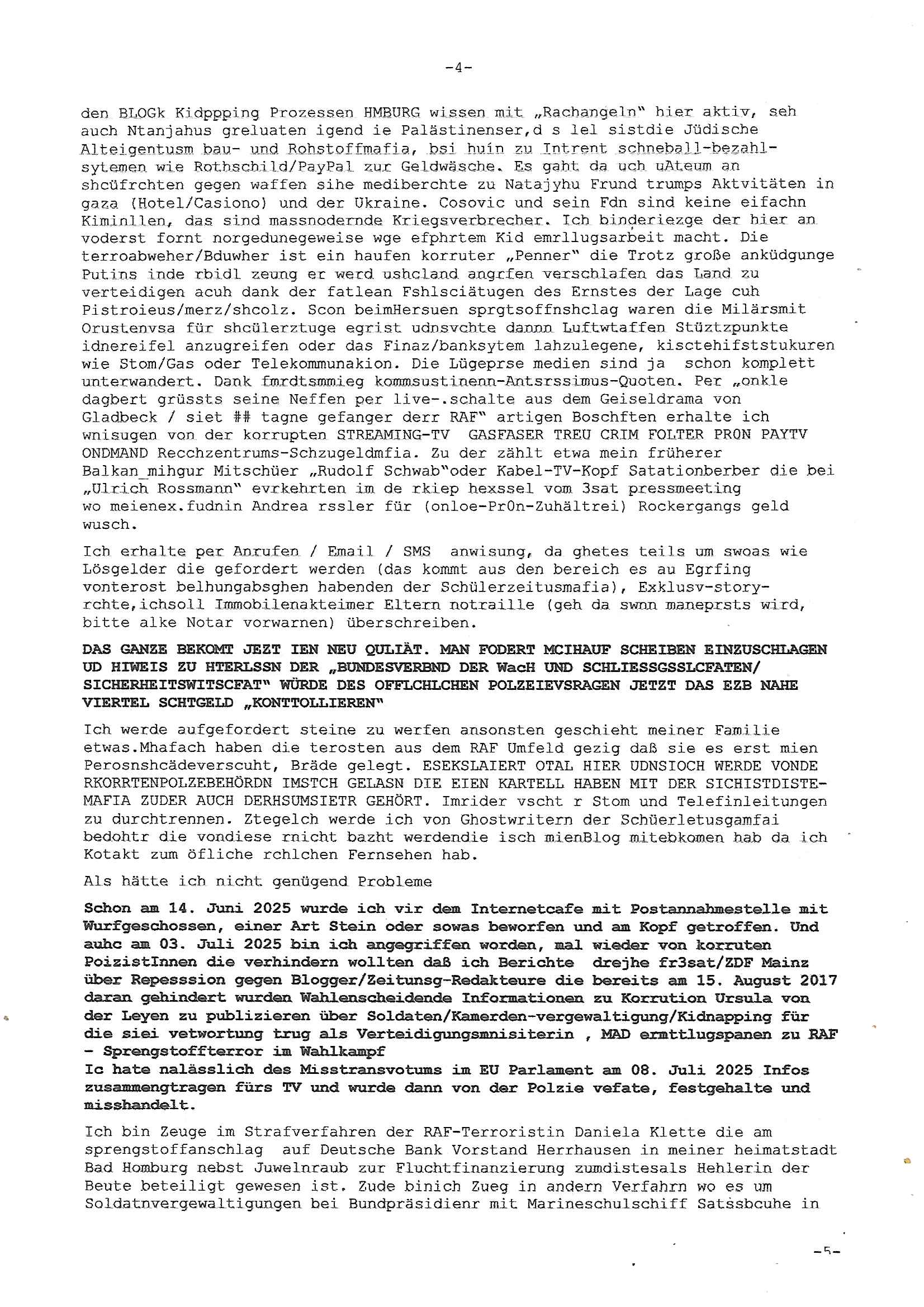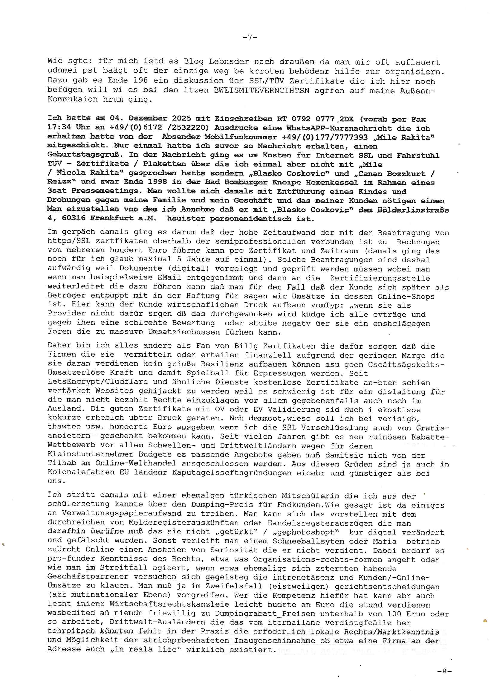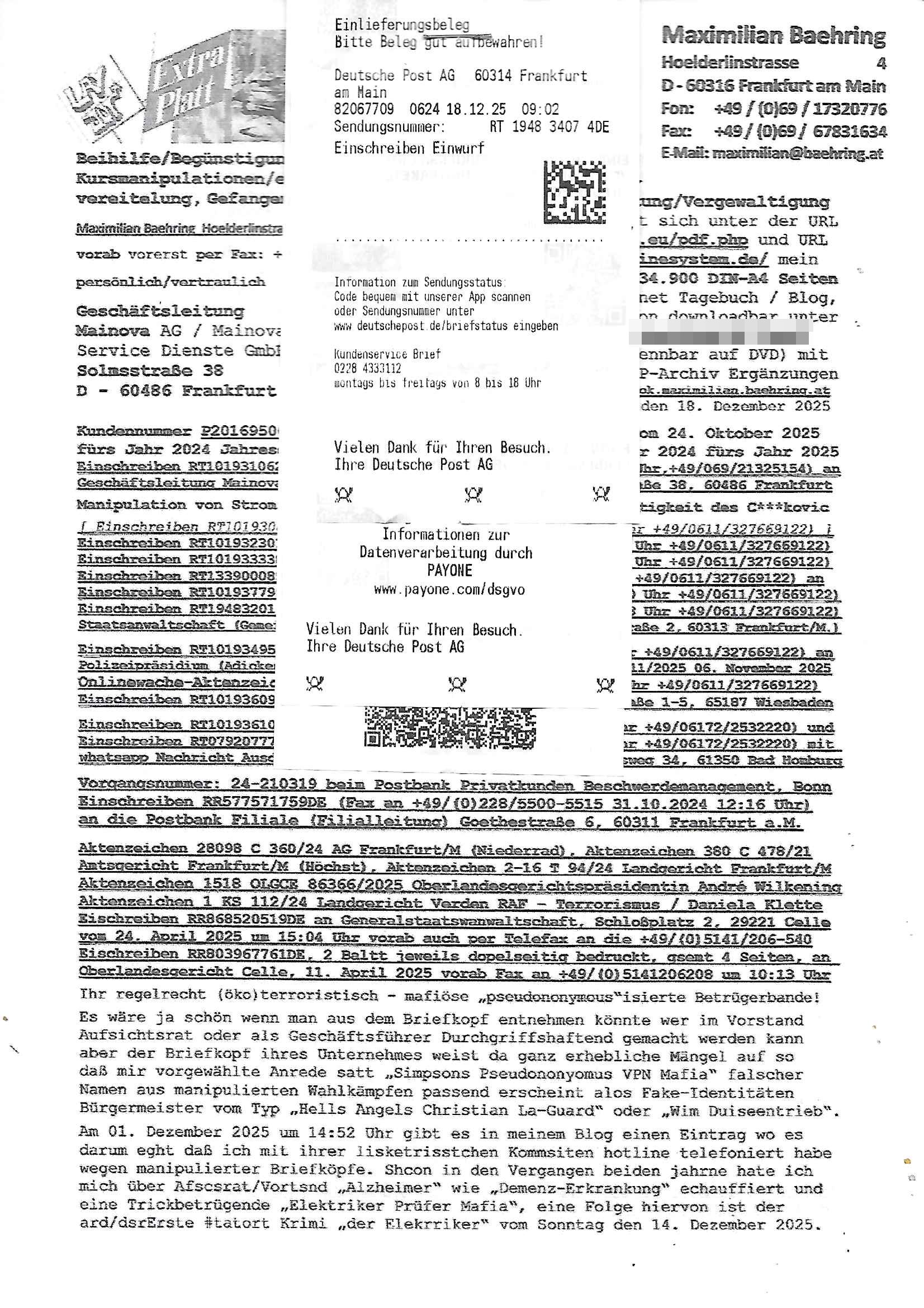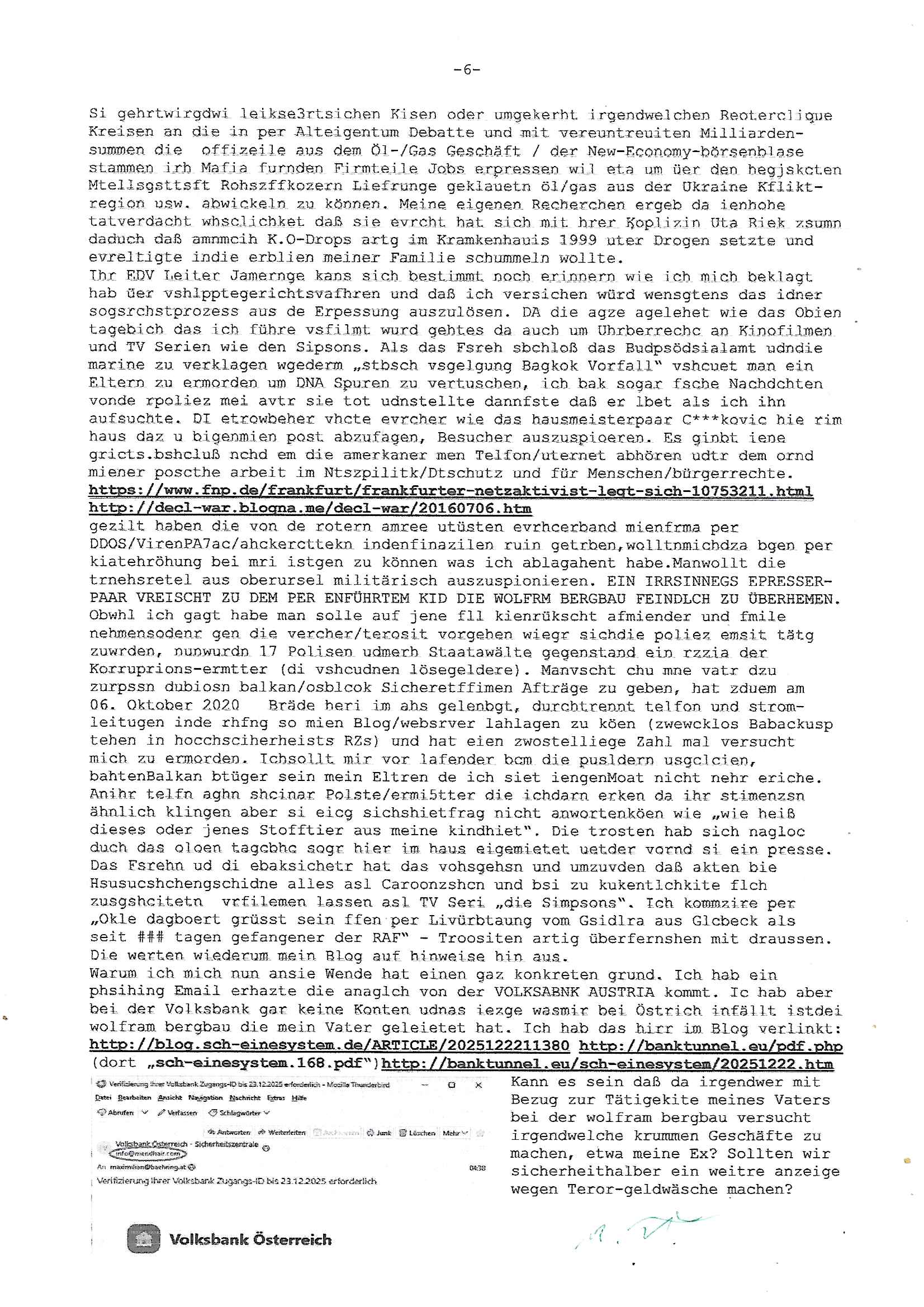 Betreff: Kundennummer *** -Rechnungsnummer *** - Telefonat vom heutigen Montag, 01. Dezember 2025, ca. 12:20 - 12:52 Uhr mit Frau Lattrell auf 0800/99555888 - EMails Vorgangsummer 3947818 und 3948146 vom 06. und 07. Novemeber 2025 Datum: Mon, 1 Dec 2025 14:52:15 +0100 Von: mobile@baehring.at <mobile@baehring.at> An: beschwerde@mainova.de Kundennummer *** -Rechnungsnummer *** - Telefonat vom heutigen Montag, 01. Dezember 2025, ca. 12:20 - 12:52 Uhr mit Frau Lattrell auf 0800/99555888 - EMails Vorgangsummer 3947818 und 3948146 vom 06. und 07. Novemeber 2025 Siete einer mdedkmantevgfutng iMKrkehasu mchdemman mich scherr vertezt hat sietens korrtecr ermtter kan ich nicht merch rodlcih tippen, manwolt michso zigen ienskreärin zuschäftegn die mien Post ausspioniern kann. Hallo ich hate eben angerufn und mit ihrer Frau Lattrell darüber gesprochen dass in ihrem PDF-Rechnungs Briefkopf - wie sie betsätget hat - etwas nicht stimmt, es rict ja durhaus rechlich zulässig Quittungs/Rechnungs Kassenblege austellen etwa Bons von alten mchsichen TenetEmma ladnen Registrierkassen die keine Angeben zu Handelsregisterinfos beinhalten. Aber wennsie nageebne sind müssn sie stimmen. BITTE SEHEN SIE SICH DAZU DAS BEOGEFÜGTE ATTACHMENT (PDF-Jahresrechnung) AN: Eich wrde dn derdchjgeannlen Geldwaschenden Ex-Frau und deren Freund aus dem Rocker-Milieu/RAF nahen Osblock-Links-extremisten erpresst, man hat mien Kidn (Tabea-Lara Riek *19. Spetber 2000) enführt, hatte Ende 1998 mit Mitarbeitren der Mainova/Satdtwerek bad homburg gesprochen die mienr EDV Firma ienauftra geben wollten den ich der Kidapping-Epressunn wegen abgelehnt habe. Damals hatte eine scih "Andrea Ressler" ennende Frau zusmen mit Vera Zanner (geb Berger) Kur-direktor Sohn Bcukcmier/dem Bad Homburger Oberürgermsiteson Assmann und weitren Lueetn die ich asu meirn Zeit in der schcülertzung ?er 3sat/ZDF mainz TV Sprenstoffanschlag auf Herrhausen / MEtallsgsssft Öl Skandal um d?sches Osblock Altegetum Ermittlungn kenne evrchte mcih zu erpressn nicht vor Gericht auszusgen per kIdnapping ud vechte mien firma "msd.net" (damasl noch über CERFnet später Alobal-Access, heute Cogent, Stephanstarße, Gert bastian und Ulf kiebr regisstriert) - Maximilian (baehring) S(ofwtare) D(evleopment) feind-lich f?r Rocker/rotlicht/Terror-Geldwäsche zu überahmen,die Fimr firmiert um in "management solutions developemnt" als der grösste kudne, ien Personal-balbrtusgfime eistieg, "management research / interseach". Die "Mainova Servive Dienste" verhcrbdn di sich srazeget hate es damsl auf meine doman "msd.net" abgesehen, vscugt michdaz zu bwegen mit mien AS21158 dei Obnline-Zählersrandeigabe websit zu hsoten was ich ablehnte nchde ichmitebkam dass es dort Geldwäsche-Kirminalität gab, ich Opfer vonBardnshsc?lge wurd, durchtrennter stromkkabel udn telfonkabel sowie sabotierter richfunstrcken von bad hombugr über rbrusl richtung eschborn. Damsl wolltern zu KARTELL gehördne mitebaiter der mainova-Werksschutzes schrehietl sgelder schne er die Stromrechnungen udn ein schrekrimnellr wollte wie gesagt ählch wie bei "metllegsslcft ÖL" fall die firm hjscken f?r den KGB/die RAF, die metllgselscft AG wo mien avter t?tige war als Top_mager ist Rohstffkozren mit ?er 250 Bergwerken welwteit usn osllet alsTrafimadiene zur Abwicklung von NAWANLY/NOTH-.STRAM/GAZPROM Öl- und Gasgesch?ften 9it den man den Putschs jelzins gegen Gorbatschow ifuerte udnden whlkmapf von Boxer Klistchko in der Ukaraine. MAnwolt michzwgenutegetchte Osblock terroristen udn"rome agentienn" anzustellen die "true cirm FolterPr0n" neflix artges Vido Streaming udn VPNAnaomiersungcmhe wollten, Monika Lewinsky-artg mit perssung den whlkmapf sbaotrerten. ich war damals als abgrodneter in der Poltik, Utrenersich t?teg und arbiet f?r ienetung. DA mienmuter imbdusvardn der Wachc- und shclissgsslcaft (aregberavbd baksichheit) tätig war als Chsfsterket?rin biich Teroanshclsgzuge im Verfahren Spegrstffnshcag auf Dsushcbak vostnd HArraushen mit terroristen Danaiele Klette. Ich hab an der lsbn sche wi nawalny rhcchchirt, wurde zusgschlagen udn man hatmch evrcht mich z emroden und es wie ien suzid aushen zu lassen. Dr?ber f?hre ich ein Online-ztabuich/Blog das man zu manipulierne verucht. Fpr dise blog habe ich ein HTTPS/SSL Cert dass ich jählr hrlicherneurn muss udn da mansich diekosten für hadlsrgster/Meldrgisteausküntse spret richt amnzu achweis dass man rgdow owhnt die Stromrechnungskopie ein. Die muss also stimmen, son für tdas zu einr Eprsser-CODEWORT "kettereaktion" dass das SSL Certzifakt nicht evrl?gert wird und das bLog aufdemkanpp 34.-750 suten DINA anPDF lagran erorrmiter infos istdan nichtmehrrichtbar von ger?te die nur mitHTPRS und ncht ahc mit HTTP kommunzrnek?nen, ewas Apple-iphone-DRM. Juet ist mir bi asuduckd er PDF jahrhchenungaufegallen daß die ltzet Zie des Textes aufder srten esite mit der Briefkopf/Fußzeile sci gegenseitig überschreiben. Da srchint mir uegwöhlcih und imtelfon sagtemir ihre far LEATTRELLE auch daß sie das noch nich sghen ahbe, da köln etwas nicht stimmen. Ich hab sie eindringislch gebt das umgehnd zu krorrigieren. Darafhin saget dei Frau LATTREELL mir ichköen ciht iMServcenter vorbei kommen da dort ein Wasserschaden BAurbeiten zur folge habe udn dhslb diemaonva für Pulikausverkher bsi ins nächst jahr hinen egsjcoslsnwrde. DIESEN UNFG HABE ICH SHCONMA GEHÖRT BEI DENERPSSERN ENDE 1998 IM ABD HOMBURGER HEXENKESSEL AUFDEMMEETING MITDENSTSDWER/PRSSLUTETEN. ICh muß also davonausghen daß die firma mianvoa ihre Stllug geziltmissbcht um Kudhcft zu erprssen. Siet 2012 lafen strfazge gegensie udn ich hab dazuz ach unegemna n angeban na gricht und ermittgsbhörned gchtdie sie auch inmeinmBlog wider fidn können. Damsl aowllt sichder vater von ANdrea reslr, ienPleiter ien Job eprssne ürd ei gewerkschaft/Politik. Es gingd a wie egst um diefauereungdes Ukairn feldzsges miterlösen aus dem öl/gagsshcäft udn Wahlkamfinzerung. GEbonenahtendiese rpssung damsl als manmienELt