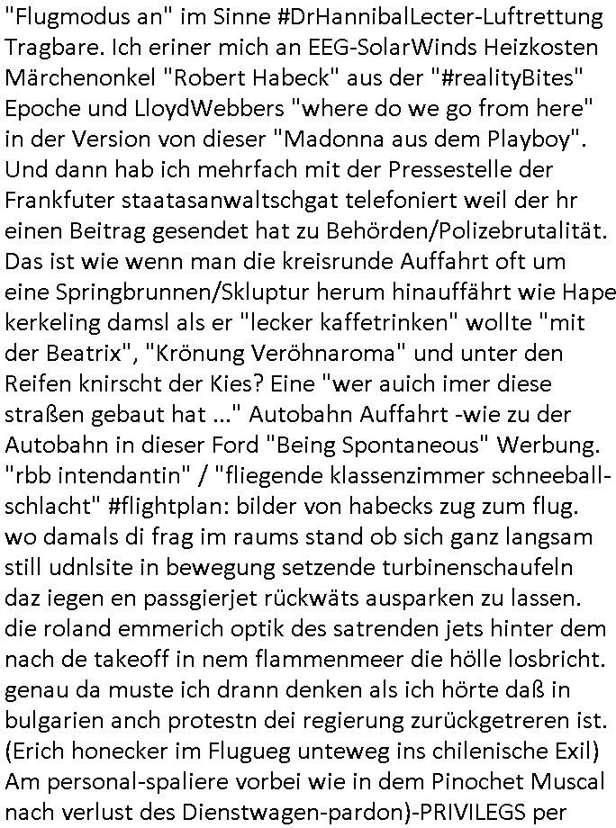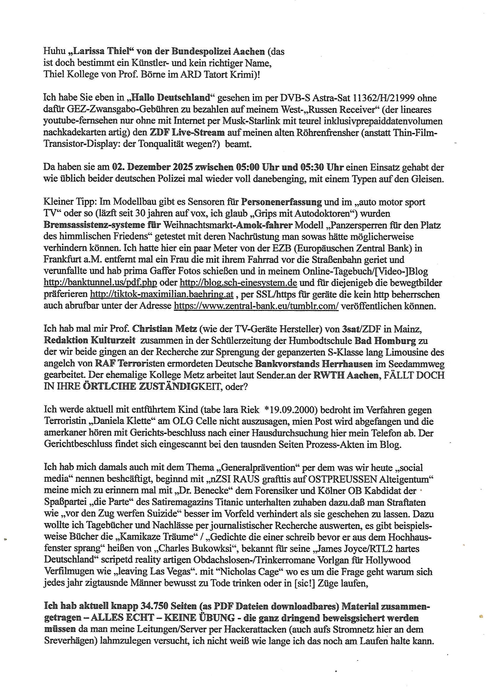 ist doch bestimmt ein Künstler- und kein richtiger Name, Thiel Kollege von Prof. Börne im ARD Tatort Krimi)! Ich habe Sie eben in „Hallo Deutschland“ gesehen im per DVB-S Astra-Sat 11362/H/21999 ohne dafür GEZ-Zwansgabo-Gebühren zu bezahlen auf meinem West-„Russen Receiver“ (der lineares youtube-fernsehen nur ohne mit Internet per Musk-Starlink mit teurel inklusivprepaiddatenvolumen nachkadekarten artig) den ZDF Live-Stream auf meinen alten Röhrenfrensher (anstatt Thin-Film- Transistor-Display: der Tonqualität wegen?) beamt. Da haben sie am 02. Dezember 2025 zwischen 05:00 Uhr und 05:30 Uhr einen Einsatz gehabt der wie üblich beider deutschen Polizei mal wieder voll danebenging, mit einem Typen auf den Gleisen. Kleiner Tipp: Im Modellbau gibt es Sensoren für Personenerfassung und im „auto motor sport TV“ oder so (läzft seit 30 jahren auf vox, ich glaub „Grips mit Autodoktoren“) wurden Bremsassistenz-systeme für Weihnachtsmarkt-Amok-fahrer Modell „Panzersperren für den Platz des himmlischen Friedens“ getestet mit deren Nachrüstung man sowas hätte möglicherweise verhindern können. Ich hatte hier ein paar Meter von der EZB (Europäuschen Zentral Bank) in Frankfurt a.M. entfernt mal ein Frau die mit ihrem Fahrrad vor die Straßenbahn geriet und verunfallte und hab prima Gaffer Fotos schießen und in meinem Online-Tagebuch/[Video-]Blog http://banktunnel.us/pdf.php oder http://blog.sch-einesystem.de und für diejenigeb die bewegtbilder präferieren http://tiktok-maximilian.baehring.at , per SSL/https für geräte die kein http beherrschen auch abrufbar unter der Adresse https://www.zentral-bank.eu/tumblr.com/ veröffentlichen können. Ich hab mal mir Prof. Christian Metz (wie der TV-Geräte Hersteller) von 3sat/ZDF in Mainz, Redaktion Kulturzeit zusammen in der Schülerzeitung der Humbodtschule Bad Homburg zu der wir beide gingen an der Recherche zur Sprengung der gepanzerten S-Klasse lang Limousine des angelch von RAF Terroristen ermordeten Deutsche Bankvorstands Herrhausen im Seedammweg gearbeitet. Der ehemalige Kollege Metz arbeitet laut Sender.an der RWTH Aachen, FÄLLT DOCH IN IHRE ÖRTLCIHE ZUSTÄNDIGKEIT, oder? Ich werde aktuell mit entführtem Kind (tabe lara Riek *19.09.2000) bedroht im Verfahren gegen Terroristin „Daniela Klette“ am OLG Celle nicht auszusagen, mien Post wird abgefangen und die amerkaner hören mit Gerichts-beschluss nach einer Hausdurchsuchung hier mein Telefon ab. Der Gerichtbeschluss findet sich eingescannt bei den tausnden Seiten Prozess-Akten im Blog. Ich hab mich damals auch mit dem Thema „Generalprävention“ per dem was wir heute „social media“ nennen beshcäftigt, beginnd mit „nZSI RAUS grafttis auf OSTPREUSSEN Alteigentum“ meine mich zu erinnern mal mit „Dr. Benecke“ dem Forensiker und Kölner OB Kabdidat der Spaßpartei „die Parte“ des Satiremagazins Titanic unterhalten zuhaben dazu.daß man Straftaten wie „vor den Zug werfen Suizide“ besser im Vorfeld verhindert als sie geschehen zu lassen. Dazu wollte ich Tagebücher und Nachlässe per journalistischer Recherche auswerten, es gibt beispiels-weise Bücher die „Kamikaze Träume“ / „Gedichte die einer schreib bevor er aus dem Hochhaus-fenster sprang“ heißen von „Charles Bukowksi“, bekannt für seine „James Joyce/RTL2 hartes Deutschland“ scripetd reality artigen Obdachslosen-/Trinkerromane Vorlgan für Hollywood Verfilmugen wie „leaving Las Vegas“. mit “Nicholas Cage“ wo es um die Frage geht warum sich jedes jahr zigtausnde Männer bewusst zu Tode trinken oder in [sic!] Züge laufen, Ich hab aktuell knapp 34.750 Seiten (as PDF Dateien downloadbares) Material zusammen-getragen – ALLES ECHT – KEINE ÜBUNG - die ganz dringend beweisgsichert werden müssen da man meine Leitungen/Server per Hackerattacken (auch aufs Stromnetz hier an dem Sreverhägen) lahmzulegen versucht, ich nicht weiß wie lange ich das noch am Laufen halte kann. | |