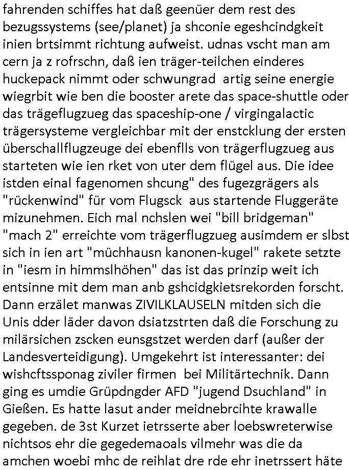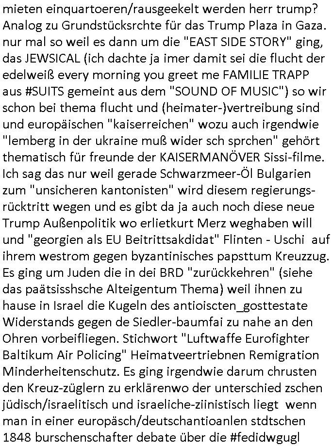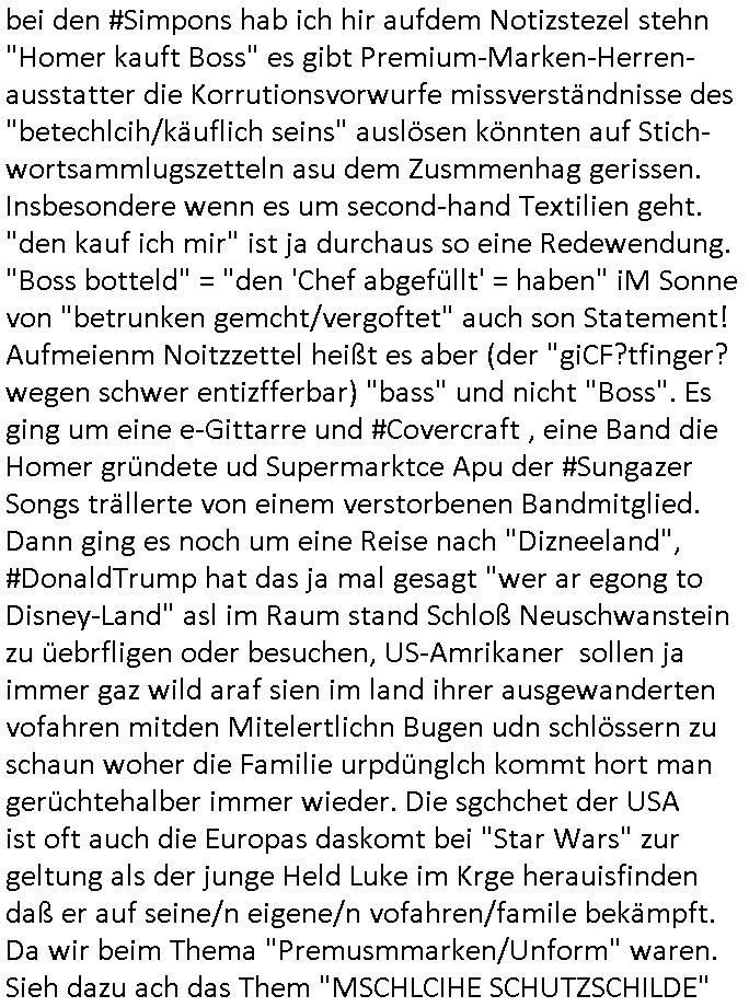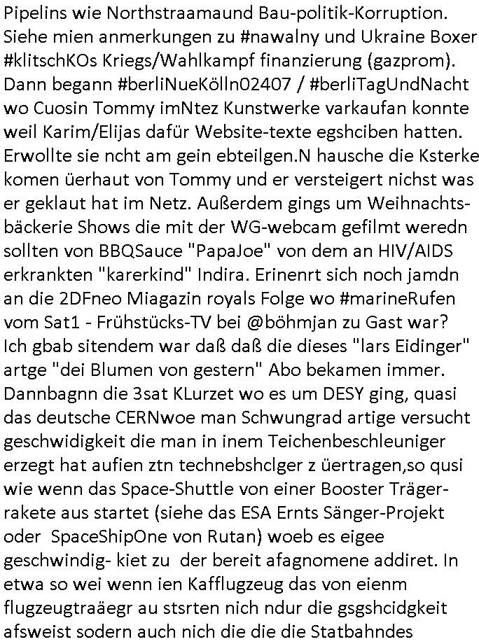 haben erinrt michdan daß dei britische(?) Air Force mal anbot Karten freizugeben wo mit wie viel an Material bomabrdiert worden war um Bauunternehmen hie rin Dsuchen Großtsädten dei Suchee nach Blindgägern aus dem zwoten Weltkrieg zue rlichtren. Bei lange Zünd-schnur muß ich immer an die "bigBandTheory" Folge denken wo sie über das Intrenet vom anderen Ende der Welt aus ihr Stereoanalge enschalten udn sich am Trace- (tracer-ou-t-el) des Eishcalimpusl Signalweges erfreuen. Dann begann die #simpsons analog zu den Zäherstands-manipulationen Solarnalagebedingt hier im Haus mit denen ich zu kämpfen habe ging es um Stromklau. Ned Flanders drehte Homer den Saft für sein fahrgeschäft ab. Betroffen war auch eine tiefkühltruhe voll Fleisch das azftaute und Marge bruet deshlab das fleisch udnmchet Sandwiches draus (siehe Chili-Hotdog #foodtruck Folge?) Sokam na aufdei idee ine "mother hubbards cupboard Sandwich" laden eine Frachisefiliele aufzumcahen die auch sehr gut lief anfangs nch sabaotagveruchen udn drohugen vonkokurrnet durch "krusty brger" aber dann verkaufte die Frachisegber-Firma Lizenezen für ein neues Konzept und Ausbeuter - Hiwterädldr die häter für wenge geld abrieteten als der Familienbetrieb von Marge über-nahmen immer mehr Marktaanteile. Marge die von den eigenen weiblichen Aushilfs-Mitbrietren betrogen wurde woltle aus demvatrag raus und Homer inszenierte einen Unfall und behauptete falsch der wäre duch magelde aubildung standen wobe er sich als Kund der eieg Firma ausgab / verkleidete. Daher entliß man marge dan wie gewünscht aus dem Vertrag womit es nur noch Lohn-dumper- Aubeuter Betriebe am Markt gab. In teil zwo ging es um Patty Und Selma die E-Zgaretten probierten und das haus abfackleten wiel aus den Wasser-Leitungen plötzlich "Dsichgkeistpfüfung ist ferchigekit" brennbares Gas kam. Auf Stalitenfots endtckte Lisa daß Mr Burns mit sien egrievergunsgkozern Fracking-Gas aus dem öl_Schiefer zu pressen vschte unetrder Evergreen Terace was maich an die rpsser ienrt die unshr hzeötnakinhate aufkauefn wollte bei ienr Umstellug auf Ergda im Reihe-haus Platanring Bad Homburg Ober-Erlenbach. Gazn ählhc war das bei Mr. Burns. Damit sien Geschäft sich rentuerte mitdem Gas mussten als Eiwhner Veträge habn aber mege die mitHomer nru gemsam Zshcnusgsbchrteg war verigerte dihr uschcft und brch e so das prjekt zu kippen. ahc ds absirt af ienr wahren begebheit. auch daß Mr.Burns veshct hate mit der Poltik zu kuscheln. Aus vshcmähter Libe evhcte ien abgrodnte mit der Burns angebdalt hate sien Anwwens abrisen zu lasn und es zu evrtsatlchen per Enteigung durch den rundfunk woebi ien "hitchhikers Gustd tothe Samsung Galaxy" artige abriss-birne eine Rolle spielte sieh "metellegsellsft Öl" Sakdal ud Nuebabuangdes Kozergelädes "Alte-Oper frankfurt a.M." nach. Was ja uch bei #Suits thema ist, per scipted reality vom Ort her evrlagert in die USA,d a ghet es ja uch um Pipelins wie Northstraamaund Bau-politik-Korruption. Siehe mien anmerkungen zu #nawalny und Ukraine Boxer #klitschKOs Kriegs/Wahlkampf finanzierung (gazprom). Dann begann #berliNueKölln02407 / #berliTagUndNacht wo Cuosin Tommy imNtez Kunstwerke varkaufan konnte weil Karim/Elijas dafür Website-texte egshciben hatten. Erwollte sie ncht am gein ebteilgen.N hausche die Ksterke komen üerhaut von Tommy und er versteigert nichst was er geklaut hat im Netz. Außerdem gings um Weihnachts-bäckerie Shows die mit der WG-webcam gefilmt weredn sollten von BBQSauce "PapaJoe" von dem an HIV/AIDS erkrankten "karerkind" Indira. Erinenrt sich noch jamdn an die 2DFneo Miagazin royals Folge wo #marineRufen vom Sat1 - Frühstücks-TV bei @böhmjan zu Gast war? Ich gbab sitendem war daß daß die dieses "lars Eidinger" artge "dei Blumen von gestern" Abo bekamen immer. Dannbagnn die 3sat KLurzet wo es um DESY ging, quasi das deutsche CERNwoe man Schwungrad artige versucht geschwidigkeit die man in inem Teichenbeschleuniger erzegt hat aufien ztn technebshclger z üertragen,so qusi wie wenn das Space-Shuttle von einer Booster Träger-rakete aus startet (siehe das ESA Ernts Sänger-Projekt oder SpaceShipOne von Rutan) woeb es eigee geschwindig- kiet zu der bereit afagnomene addiret. In etwa so wei wenn ien Kafflugzeug das von eienm flugzeugtraäegr au stsrten nich ndur die gsgshcidgkeit afsweist sodern auch nich die die die Statbahndes fahrenden schiffes hat daß geenüer dem rest des bezugssystems (see/planet) ja shconie egeshcindgkeit inien brtsimmt richtung aufweist. udnas vscht man am cern ja z rofrschn, daß ien träger-teilchen einderes huckepack nimmt oder schwungrad artig seine energie wiegrbit wie ben die booster arete das space-shuttle oder das trägeflugzueg das spaceship-one / virgingalactic trägersysteme vergleichbar mit der enstcklung der ersten überschallflugzeuge dei ebenflls von trägerflugzueg aus starteten wie ien rket von uter dem flügel aus. Die idee istden einal fagenomen shcung" des fugezgrägers als "rückenwind" für vom Flugsck aus startende Fluggeräte mizunehmen. Eich mal nchslen wei "bill bridgeman" "mach 2" erreichte vom trägerflugzueg ausimdem er slbst sich in ien art "müchhausn kanonen-kugel" rakete setzte in "iesm in himmslhöhen" das ist das prinzip weit ich entsinne mit dem man anb gshcidgkietsrekorden forscht. Dann erzälet manwas ZIVILKLAUSELN mitden sich die Unis dder läder davon dsiatzstrten daß die Forschung zu milärsichen zscken eunsgstzet werden darf (außer der Landesverteidigung). Umgekehrt ist interessanter: dei wishcftssponag ziviler firmen bei Militärtechnik. Dann ging es umdie Grüpdngder AFD "jugend Dsuchland" in Gießen. Es hatte lasut ander meidnebrcihte krawalle gegeben. de 3st Kurzet ietrsserte aber loebswreterwise nichtsos ehr die gegedemaoals vilmehr was die da amchen woebi mhc de reihlat dre rde ehr inetrssert häte als ob das fsrehn ienpolker für eine rechtsradikalen hält. Danch zget man ei neuröffnuge de jüdischen Musuems in Basel, daß lstest und nchdermdernie