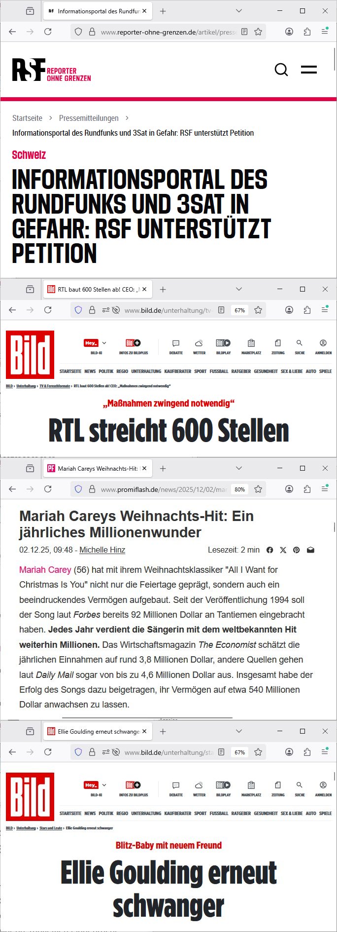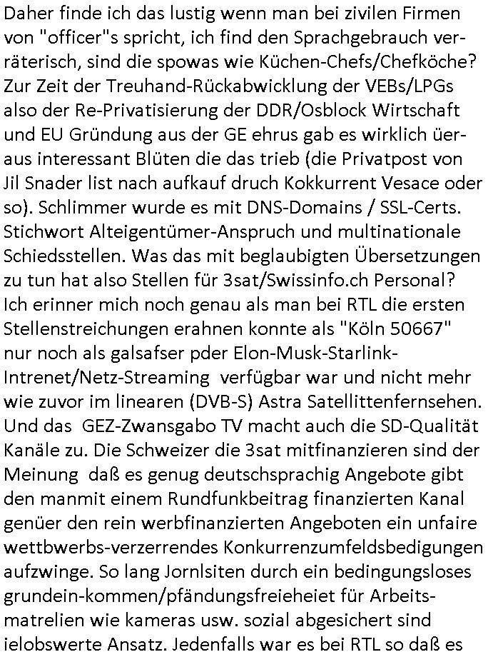 Daher finde ich das lustig wenn man bei zivilen Firmen von "officer"s spricht, ich find den Sprachgebrauch ver-räterisch, sind die spowas wie Küchen-Chefs/Chefköche? Zur Zeit der Treuhand-Rückabwicklung der VEBs/LPGs also der Re-Privatisierung der DDR/Osblock Wirtschaft und EU Gründung aus der GE ehrus gab es wirklich üer-aus interessant Blüten die das trieb (die Privatpost von Jil Snader list nach aufkauf druch Kokkurrent Vesace oder so). Schlimmer wurde es mit DNS-Domains / SSL-Certs. Stichwort Alteigentümer-Anspruch und multinationale Schiedsstellen. Was das mit beglaubigten Übersetzungen zu tun hat also Stellen für 3sat/Swissinfo.ch Personal? Ich erinner mich noch genau als man bei RTL die ersten Stellenstreichungen erahnen konnte als "Köln 50667" nur noch als galsafser pder Elon-Musk-Starlink-Intrenet/Netz-Streaming verfügbar war und nicht mehr wie zuvor im linearen (DVB-S) Astra Satellittenfernsehen. Und das GEZ-Zwansgabo TV macht auch die SD-Qualität Kanäle zu. Die Schweizer die 3sat mitfinanzieren sind der Meinung daß es genug deutschsprachig Angebote gibt den manmit einem Rundfunkbeitrag finanzierten Kanal genüer den rein werbfinanzierten Angeboten ein unfaire wettbwerbs-verzerrendes Konkurrenzumfeldsbedigungen aufzwinge. So lang Jornlsiten durch ein bedingungsloses grundein-kommen/pfändungsfreieheiet für Arbeits-matrelien wie kameras usw. sozial abgesichert sind ielobswerte Ansatz. Jedenfalls war es bei RTL so daß es diesen "Sonnenstudio Stalker", nen "ehemaligen Polizist" gab bei "Köln 50667" zeitnah dazu daß deise lang-haariege Blonde von dieser Morning-Show "Sat1 Frühstücksfernsehen" aus so eine Stalkerin hatte (Haar-Typ "geborene Ketchup-Expertin"). Da musste ich egstren drann denken wiel egstre in pro7 #taff kam daß "Ellie Goulding" schwanger sei und ein Song von ihr eine der letzten Folgen von "köln 50667" untermalte. Ich glaub das war ein Weichnachten nach-dem "Helene Fischer" ein Weihnachtsduett veröffent-licht hatte zusammen mit einem "Take That"-Boygroup Mitglied, ich mien isgcow egshen zu habn daß sie sich da selbst Kokurez mcht mit einem neuen Weihnachts-lieder Album dieses jahre, anders als "Mariah Carey". Ich würde da jetzt aber nicht bei "MTV guess the year" mitmachen wollen was das angeht aber es war nach-dem Marlne ufen vom Sat1-FrühstücksTV bei Böhmi war. Irgndwann damals hate die laghaarge blonde vom Sat1 Frühstücksfernshen die mich an "Trixie Dörfel's XMas Nightmare" erinnert hat weil sie mal in irgendsoeiner "klinik-paradies" arztserie mitspielte diese Sat1-Akte sonder-Sendung inder sie ihre Stalkerin aufspürte so "Oliver Stone" "Talk Radio" in Verbindung mit "die Blumen von gestrern" mit "Lars Eidinger" artig wo es um jdsüches osblcok ategteun und Kidnapping geht (siehe metallegsellscft Öl"). Und als "Köln 50667" nichtmerh gesendet wurde gab es da auch irgendwas mit "wellness" Kuren oder so. Sonnenstudio udn Sat1 FrühstücksTV mit Sonnenlogo. Ich hba ja berist mitgeteilt daß es da einen Zusammen-hnag gibt hsichlch der Quer-finanzierung der Sender als "Onkel Dagbeort grüsst seine Neffen" per "Livebe-richt-Interview vom Banken-Geiseldrama Gladbeck" "Siet ### Tagen gefanger der RFA" duch Kidnapping Erpressungen des Banken-sicherheitarbeitgeberverbands wo sie nebn Kaksusus öl die die postsowjetische Pleite-Raumfahrt finzern sollten per tele-"Shopping Queen" oder auch "facebook" zumInfided-Login bei der Internet Betsllananhmen für die TV-Shops die als #NECKERMANN Insolvanz amnmdlet udndort das Inetrexion-DeCIX entstand wie pilze aus dem "amazon.com" boden (sihe 3sat kulturzet kinderbuchtipp) schossen. (Synergieffekte bei Onlinebanking/-brokerage). iche riner mich noch gut wie 3sat damals (von Eutelsat her?) begann aufs Astra Satellitten Grid zu expandieren. Das hate nälhc alleswas mit billigen Raketenstarts nach dem zusammenbruch der UdSSR Raumfahrt zu tun. Und zeitgleich dazu baute man dann das WWW-Intrent auf. https://www.bild.de/unterhaltung/tv-fernsehformate/rtl-baut-600-stellen-ab-ceo-massnahmen-zwingend-notwendig-692e9c441b3201955317e498 https://www.reporter-ohne-grenzen.de/artikel/pressemitteilungen/4129/informationsportal-des-rundfunks-und-3sat-in-gefahr-rsf-unterstutzt-petition https://www.promiflash.de/news/2025/12/02/mariah-careys-weihnachts-hit-ein-jaehrliches-millionenwunder.html https://www.bild.de/unterhaltung/stars-und-leute/ellie-goulding-erneut-schwanger-692df63c46f39b6230ff7993 https://www.youtube.com/watch?v=rio6RI9c6o0 https://www.stern.de/kultur/tv/-weihnachten-mit-trixie-doerfel---olli-dittrich-als-engelblonde-saengerin-7793972.html https://www.rtl2.de/sendungen/koeln-50667/videos/1100105533-noah-befreit-sandra https://de.wikipedia.org/wiki/Die_Blumen_von_gestern https://www.youtube.com/watch?v=7G0VahyY9GE | |