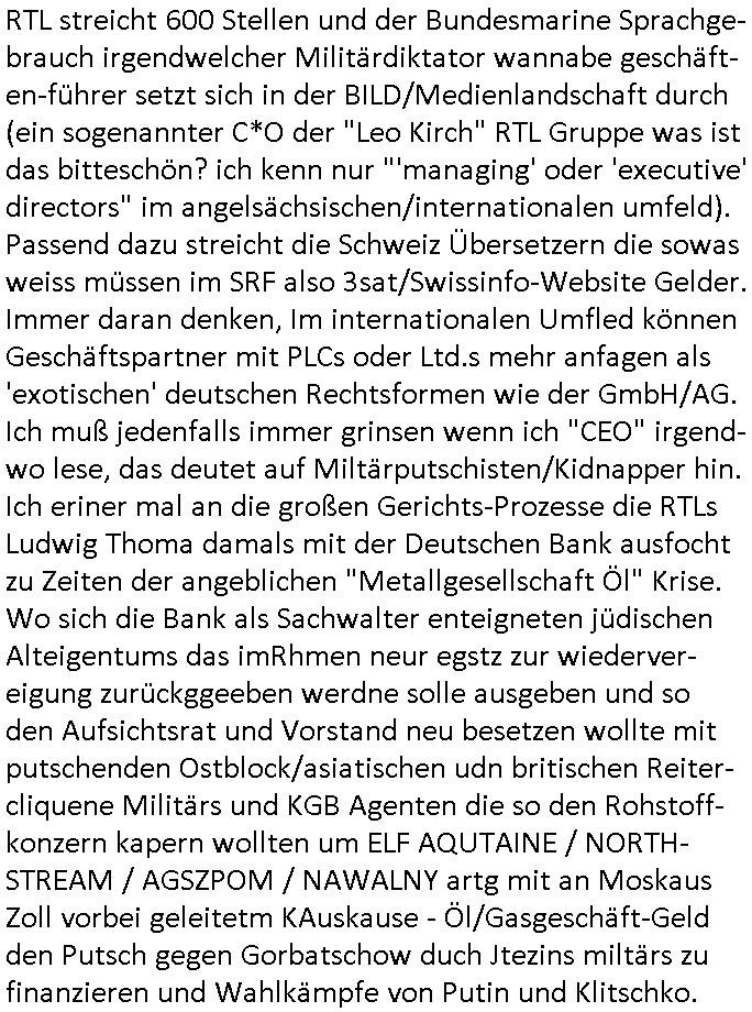 | RTL streicht 600 Stellen und der Bundesmarine Sprachge-brauch irgendwelcher Militärdiktator wannabe geschäft-en-führer setzt sich in der BILD/Medienlandschaft durch (ein sogenannter C*O der "Leo Kirch" RTL Gruppe was ist das bitteschön? ich kenn nur "'managing' oder 'executive' directors" im angelsächsischen/internationalen umfeld). Passend dazu streicht die Schweiz Übersetzern die sowas weiss müssen im SRF also 3sat/Swissinfo-Website Gelder. Immer daran denken, Im internationalen Umfled können Geschäftspartner mit PLCs oder Ltd.s mehr anfagen als 'exotischen' deutschen Rechtsformen wie der GmbH/AG. Ich muß jedenfalls immer grinsen wenn ich "CEO" irgend-wo lese, das deutet auf Miltärputschisten/Kidnapper hin. Ich eriner mal an die großen Gerichts-Prozesse die RTLs Ludwig Thoma damals mit der Deutschen Bank ausfocht zu Zeiten der angeblichen "Metallgesellschaft Öl" Krise. Wo sich die Bank als Sachwalter enteigneten jüdischen Alteigentums das imRhmen neur egstz zur wiederver-eigung zurückggeeben werdne solle ausgeben und so den Aufsichtsrat und Vorstand neu besetzen wollte mit putschenden Ostblock/asiatischen udn britischen Reiter-cliquene Militärs und KGB Agenten die so den Rohstoff-konzern kapern wollten um ELF AQUTAINE / NORTH-STREAM / AGSZPOM / NAWALNY artg mit an Moskaus Zoll vorbei geleitetm KAuskause - Öl/Gasgeschäft-Geld den Putsch gegen Gorbatschow duch Jtezins miltärs zu finanzieren und Wahlkämpfe von Putin und Klitschko.