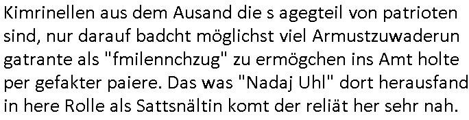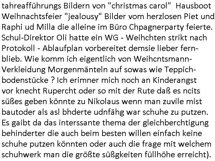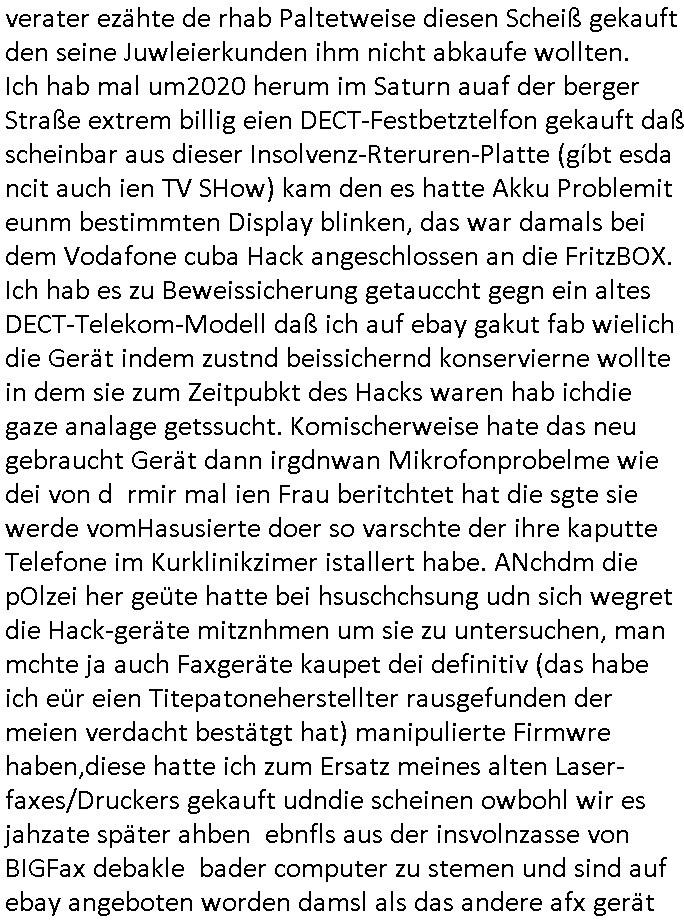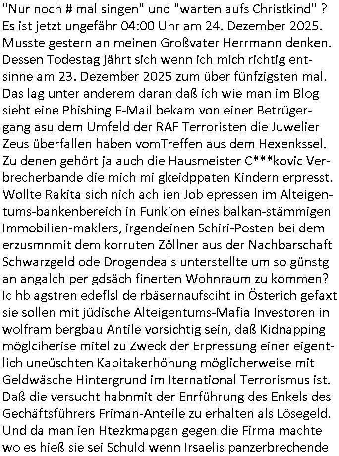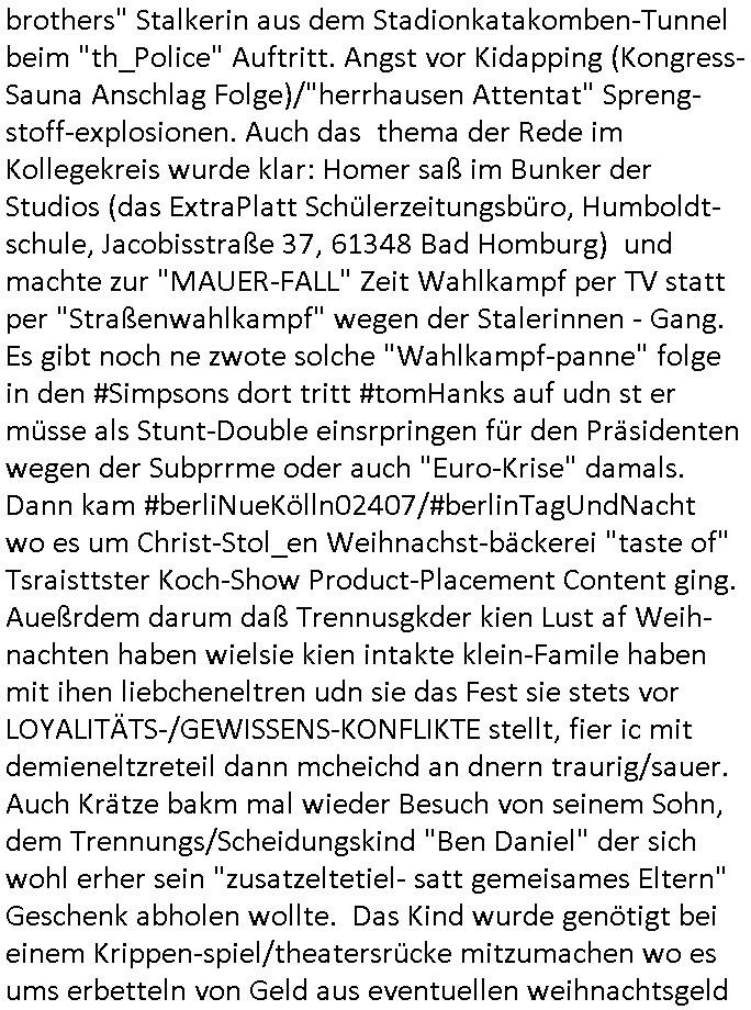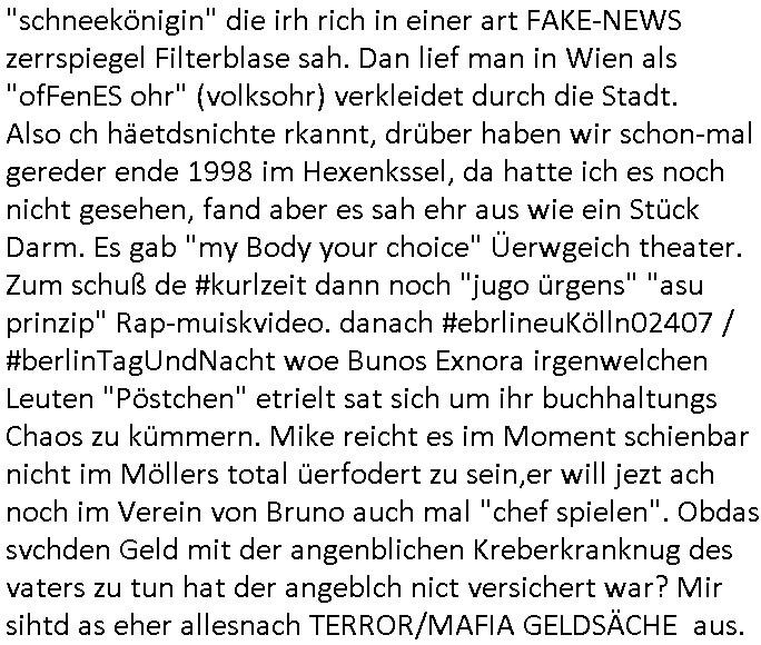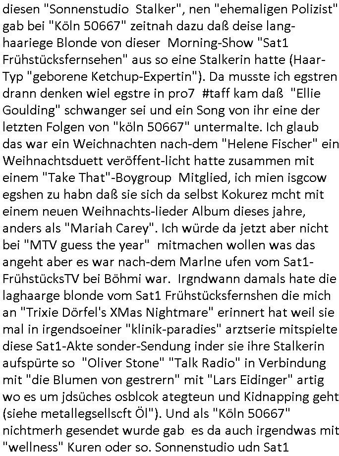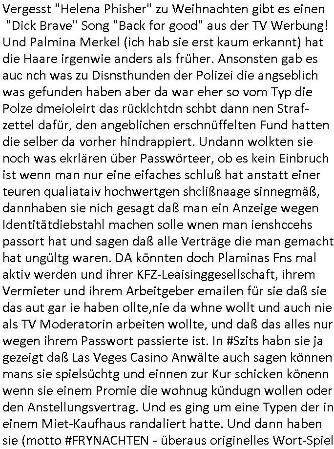 | Vergesst "Helena Phisher" zu Weihnachten gibt es einen "Dick Brave" Song "Back for good" aus der TV Werbung! Und Palmina Merkel (ich hab sie erst kaum erkannt) hat die Haare irgenwie anders als früher. Ansonsten gab es auc nch was zu Disnsthunden der Polizei die angseblich was gefunden haben aber da war eher so vom Typ die Polze dmeioleirt das rücklchtdn schbt dann nen Straf-zettel dafür, den angeblichen erschnüffelten Fund hatten die selber da vorher hindrappiert. Undann wolkten sie noch was ekrlären über Passwörteer, ob es kein Einbruch ist wenn man nur eine eifaches schluß hat anstatt einer teuren qualiataiv hochwertgen shclißnaage sinnegmäß, dannhaben sie nich gesagt daß man ein Anzeige wegen Identitätdiebstahl machen solle wnen man ienshccehs passort hat und sagen daß alle Verträge die man gemacht hat ungültg waren. DA könnten doch Plaminas Fns mal aktiv werden und ihrer KFZ-Leaisinggesellschaft, ihrem Vermieter und ihrem Arbeitgeber emailen für sie daß sie das aut gar ie haben ollte,nie da whne wollt und auch nie als TV Moderatorin arbeiten wollte, und daß das alles nur wegen ihrem Passwort passierte ist. In #Szits habn sie ja gezeigt daß Las Veges Casino Anwälte auch sagen können mans sie spielsüchtg und einnen zur Kur schicken könenn wenn sie einem Promie die wohnug kündugn wollen oder den Anstellungsvertrag. Und es ging um eine Typen der in einem Miet-Kaufhaus randaliert hatte. Und dann haben sie (motto #FRYNACHTEN - überaus originelles Wort-Spiel