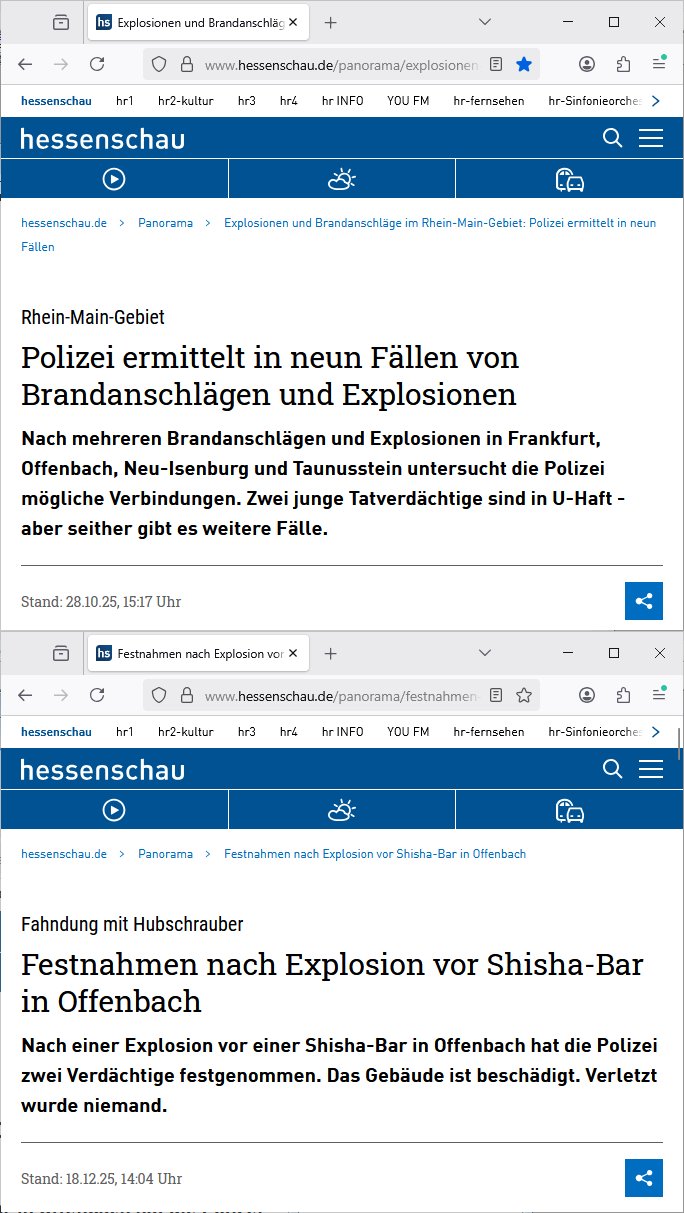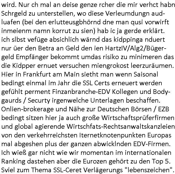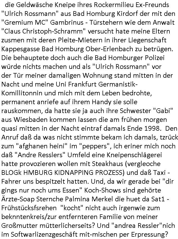 | Großstörung im Onlinebanking deutscher Kreditinstitute von Frankfurt (wo Deutschlands größter Netzknoten sitzt) aus rchtung Bakntümer/Börse Frankfurt und zwar richtig die ganz großen geschäftsbanken mit Millionen Kunden. Und Postsendungen an die Terrorabwehr werden falsch berechnet so daß man noch den Unschalg tauschen und ein paar Seiten dazuschummeln kann ohe daß es auffällt. Da geht es inhaltich um Sprengstoffanschläge auch udn explizet gegen die vond er Störung betroffenen Banken. Als ich nachfragen will ob wenigstens meine Telefaxe durchgehen werde ich als Hustbesltunsgzge verarscht amanshcluss des grichts, eine nebestelle die ein Telefon sein soll laut f+r Teerowawer setsanzlcih zustöder GStA nimmt plötzlich keine Sprachanrufe mehr sondern dem pipsennche Telefaxe entgegen. Ob das an den Korruptions Problemen bei der EDV/IT Beschaffung liegt? Zeitnah werden an der Uni Klinik Gießen/Marburg wo ja die Polizei/Justz Äzrteshcft ihre zentrale hat Patienten er-schossen. Dann veröfflicht der hr auf der hessenschau website ienartikel zum Tatrot Kirm gestren wonach Fälle in Sorgerechtschen plötzlich am Landgericht verandelt werden. Das ist aber als Instanz gar nicht zuständig. Ls ich das nochmal nachschlage habe ich auch ein deja vu hin-sichtlich der seit 1945 geäderte eigenstädgkeit des OLG in Vorkriegsendezeit unde der OLG Zweigtselle in Kassel. Das sihe as als habe irgndwer ganz gezielt Verfahren an sich gezogen (da könnte es um Vermögenssorge gehen).