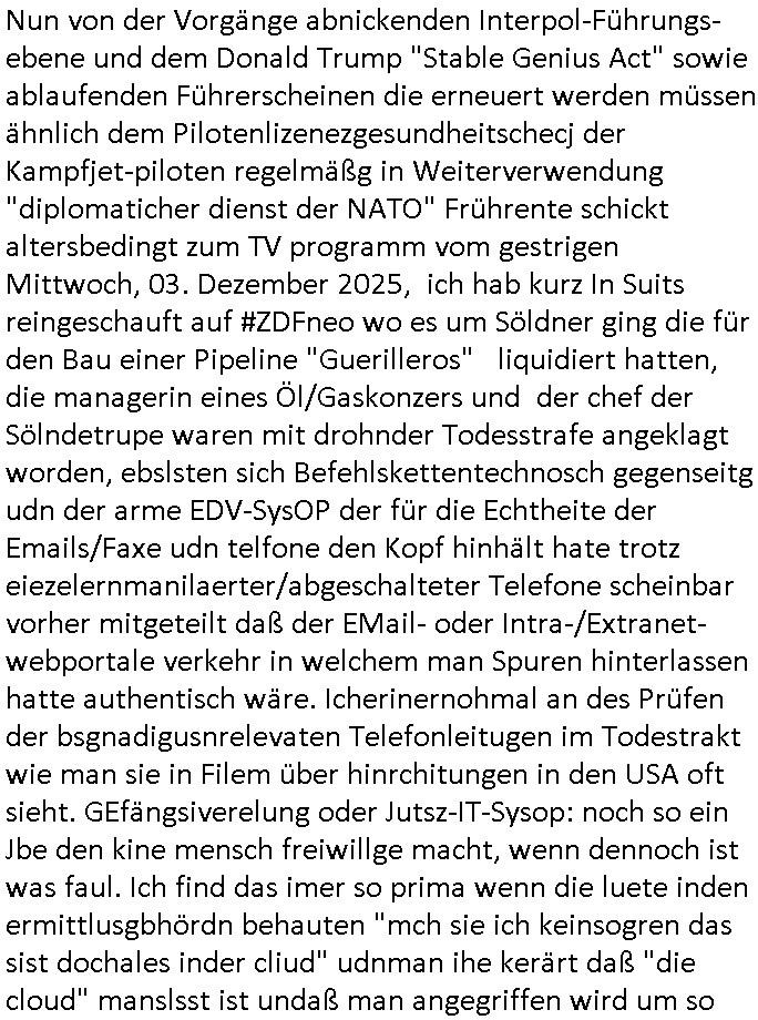 | Von der #Turnschuh Sat-TV- Mafia nun zur ZDFneo #Suits Pipeline/Greenwashing und "Prinz Harry" Gattin "Vegan Makler" Weddingplaner/Müsliriegel Immobilienanwalt Mafia. Ging es bei #Suits nicht #Simpsons-COACHKoRUPT artg auch um Basketball-Mannschaftskauf-Senderechte? Ich hatte da ein "deja vu", glabe dies Folgen vonegstren hatte ich vor kurzer Zeit schonmal geshen/kommentiert. Daher schaltete ich dann auch irgnennschen 17:00 uhr und vor 18:00 Uhr als ich die pro7 Nachrichten sehen wollte #taff ien wos um Elli Goulding und Mariah Carey ging. Eußerdem noch eine Geldwäscher-/Menschensch-leuser-Armtszuderer-Familiennnachugs-Schellebslsytem-kartell Streaming Koch-Show aus der Türkei die mri des-hslb in Erinmerung blieb wiel die Dme so hieß wie die (echten?) türkischen Polizistin (fahrzeug WI-HP 5732) vom samsta dem 18. Noveber 2025 in der Mähe dieses seltsamen (illlegael?) "paralleljustz" Hauses am Kiosk gegenüner dem thai Restraunt mit der pinken Flamingo Leuchtreklame Kioks an der Ecke. An der Ecke wo auch der Hebammen Kiosk von "melanie Boss" der Frudnin von 3sat Kutlurzet "chistian metz" der mit mir ander shcule war ina bd homburg ist. ÖZCAN, so ähnlich wie der türkiceh Poltiker ÖZALAN. Wir erinnern uns: man entführte dscuhte Kidner um sie muslimisch aufziehen. Da die tage irgendwas von gottschalks krebserkrankung am harnlieter lgaluch ich im vobegehen gelsne zu ahben in der bIld Zeitung stand fällt mir dazu noch ein daß ich