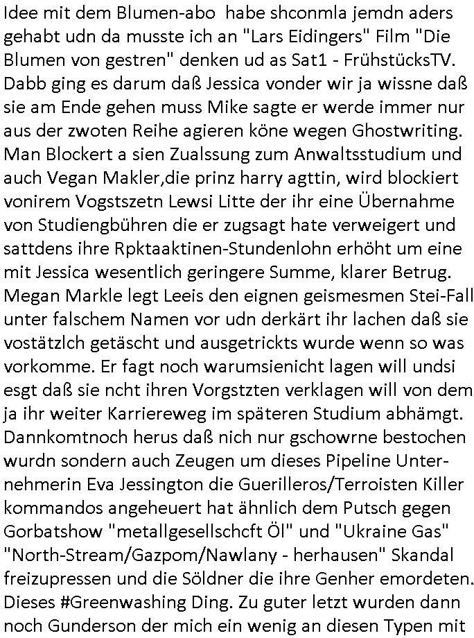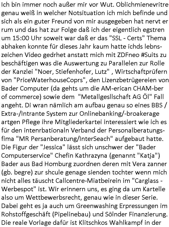 | Von "#hurraDeutschland" oder wie diese Sendung hieß die vor dem Sat1 - FrühstücksTV #Screenshot lief im 2DF gab es gestern auch Quotenfrauen auf 2DFneo in #Suits mit Prinz Harry Gattin Vegan Makler. Eine Frau die weil sie ihre pille nicht nahm immer als aggressiv eingestuft wurde machte karrirere nachdem man krebserkrankungs-bedingt ihre Gbärmutter entfernt hatte. Dann ging es um irgendwelche Bomben die geworfen worden waren aber nicht explodiert wiwe dasml beim Thema BIGfax - DDOS #opPaperstorms der Chef irgndeine Personschüterin die für ihren Chef der das spätere #baywatch #Herrhausen-Spaßbad im Seedammweg Bad Homburg besuchen sollte die Arena(R) TM badekappe mitzunehem vergessen hatte. Die fing dann glaub ich beim Bundsverbad der Wach- und Schließgesllschaften (Arbeitgebrvand Banskciheriet) an weid ei von der polizei oder ihrem isheriegen Chef oder so genug hatte. Fischliebhaber Max Raabe "Handkse mit Musik" artig. "kiss my as", sagt der Engländer glaub ich. Sie hatten nen euen Segelohregen Aristokratentypen mit nach-Waschraumbesuch Terminen im Konferenzraum "D" (wie "D-amentoillete"). Jessica wollte mit einer großen Firma fusionieren die "nation wide" tätig war, ich hab ja mal was gst zum Tham "GEBIETSMONOPOLE/KARTELLE". Aber der Inahber/Gründungspartenr ahte was dagegen. Das war alles was ich von #Suits mitbekommen habe gestren, das mit den Bomben die eine lange zündschnur