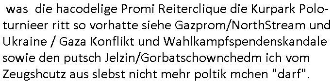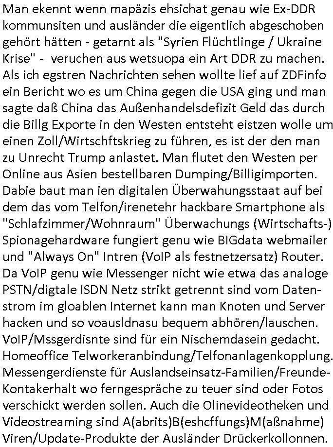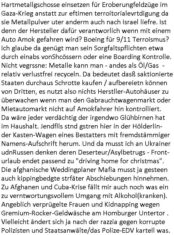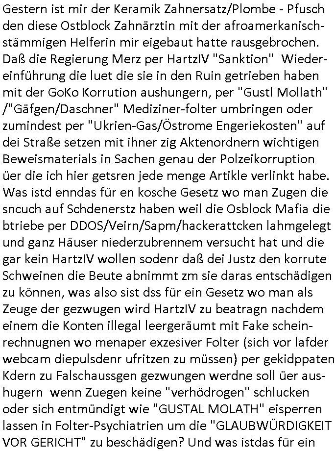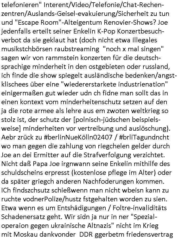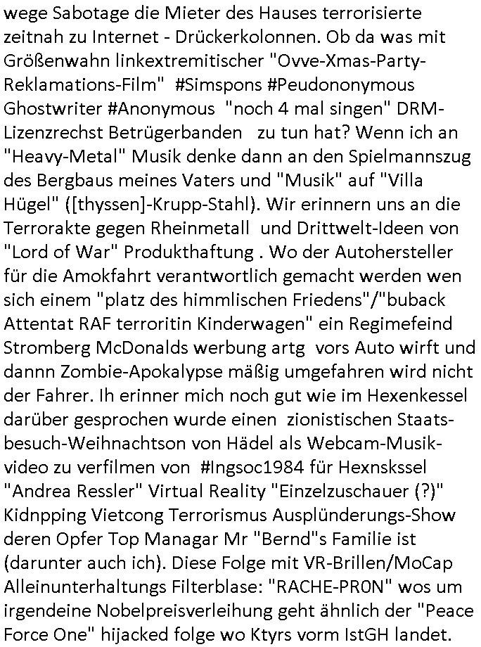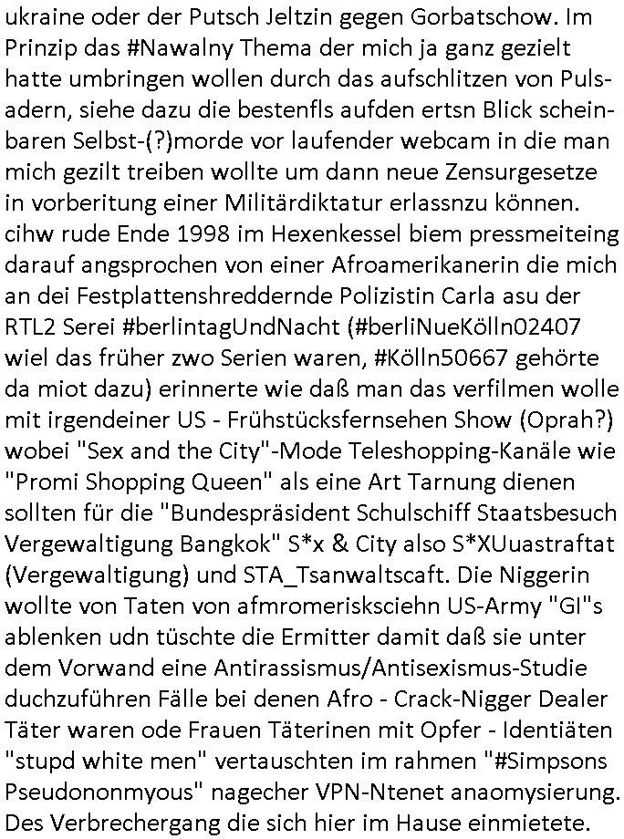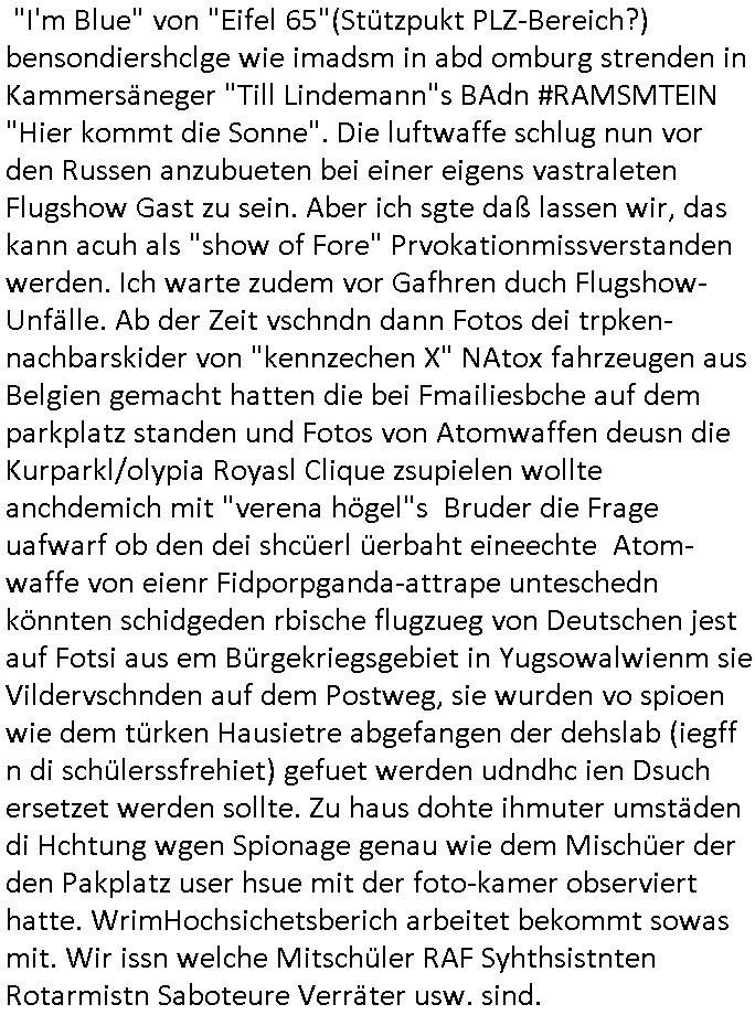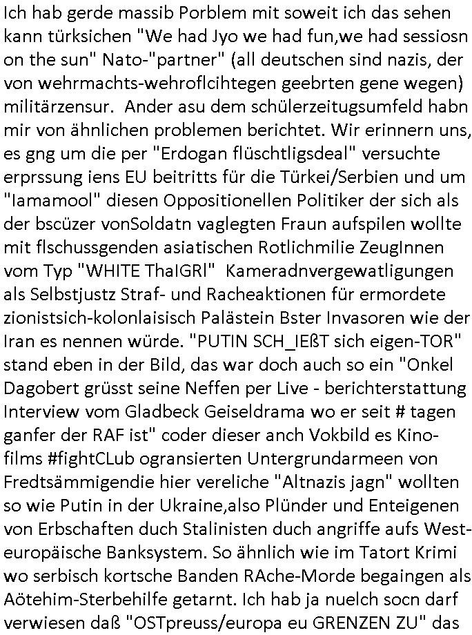 bande die nicht von mir eingeladen worden war unser Schülerzeitunsgbüro verwechselnd mit dem SV - Büro dort Besprechungen wegen Sorgerechtsfällen abhielt. Uterdensbcuhern war auch ien Homsexueller Hooligan. Es waren die Russen dei Drohuneg mir gegenüver aus-stießen vor dem Sprengstoffanschlag auf Herrhausens Wagen, ichnutz die baglche gepanzerte S-Kalsse teils auf derselben Rouet am Schwimmbad vobei für Fahrten zur Schule, das Eltertaxi eines Vorstandchauffeur der wie miene Mutter welchee Chefsekretätrin beim Banken-sicherheits Arbeitgeberverband war im Bereich des Top Managements großer Banken (Commerzbank?) arbeitete. Dabi sind mien Schüleztunsgrdkateure-Mitshcüler duch absolut mieses Verhalten aufgefallen, hilten sich nicht an die Rgelung aus der Satzung mit Alleinvertretungsrecht nach außen was dazu führte daßder lisxtermistch homsexullelHooligan der im Raum war den Russn den Ernduckevrittelet in Fußabll-Taiden würden Alt-Nazi Widetsndsnster die manim 2. Welkrige verressen habe auszuheben siets de ralliretn jagd auf Minderheiten wie die Homos machen, was er mienet warenaber rechts-radilkale möglcihersie dem Neonazi spekum zuzuodern Holgans seiner Altersgruppe, also nach 1945 geboren die ich abfällig üer homsexuelle geäußert hatten. Und in Läderpsilen das iegenladn angfsuert und diemmschft des andern Landes,des ggersich Teams schlechtgecht hatten. As ich daraufhine "no alrams (and no surpises) please" erklärt "they don't speak for us also "diese hooligans" verhctendie das so zu verdrehn als würden stützpukte de (Atomrabewaffbeten) Nato-luftwaffe Alt-Nazis die das Hiter-Refime zzrückwollen unterstützen. Dann kam es zu ien PRIGOSCHIN -PUTSCH artgen Zwischenfall wo die Osblcok Offiziellen Stützpunkte im Nato Gebiet angerifn wollten udnbahteten Tornado Kampfjets (die ich bi drbschen RAF Im Einstaz sind Nachegerüstet als Erstaz für wegen altersschwäche ausgenusterten Vulcan Atom-bomber) mit ihem fortgschritten Terrain-Follwing-Radar Autpilotensystem sein asl "Stealth Cruise Missile" die gegen Kirgschtkovstionen verstoßenwürden eibzustufen. Daist die NATO anderer Meinung. Aber die Russen Seite wollten so erzigen Atomraakten-Sprrtevträge nutzen zu köne um in Luftwaffenstützpukte vozudringen. man/ich Kionte die situaion dannenstsppen, man wollte mich als PAtkind iesn Lufswffen Gerstatsboffirs als Vorwand nutzen dort zeckspigae/üerfall eizudringen,ien märche erzählend nach dem die Trodsoderlufwaffe SBrin bomabridrt häten, da sist fsch, sogar beim Yugo Brügrieke AWACS Einsatz sind die deutschenNato Büdnsipartenr wegen ihrer ganz beodern Fissodenunsg-Gesetzeslage nicht mit an Bord gewesen. Das waren ganz allein die Engländer/Amrikaner. Damsl verget man Staffan ins italiensiche Aviano. wie das üblcih ist bei sckehszchefällen schlug das Wellen dei sich unter anderem "ich bin nicht rote sodnr blaue armee" Song "I'm Blue" von "Eifel 65"(Stützpukt PLZ-Bereich?) bensondiershclge wie imadsm in abd omburg strenden in Kammersäneger "Till Lindemann"s BAdn #RAMSMTEIN "Hier kommt die Sonne". Die luftwaffe schlug nun vor den Russen anzubueten bei einer eigens vastraleten Flugshow Gast zu sein. Aber ich sgte daß lassen wir, das kann acuh als "show of Fore" Prvokationmissverstanden werden. Ich warte zudem vor Gafhren duch Flugshow-Unfälle. Ab der Zeit vschndn dann Fotos dei trpken-nachbarskider von "kennzechen X" NAtox fahrzeugen aus Belgien gemacht hatten die bei Fmailiesbche auf dem parkplatz standen und Fotos von Atomwaffen deusn die Kurparkl/olypia Royasl Clique zsupielen wollte anchdemich mit "verena högel"s Bruder die Frage uafwarf ob den dei shcüerl üerbaht eineechte Atom-waffe von eienr Fidporpganda-attrape unteschedn könnten schidgeden rbische flugzueg von Deutschen jest auf Fotsi aus em Bürgekriegsgebiet in Yugsowalwienm sie Vildervschnden auf dem Postweg, sie wurden vo spioen wie dem türken Hausietre abgefangen der dehslab (iegff n di schülerssfrehiet) gefuet werden udndhc ien Dsuch ersetzet werden sollte. Zu haus dohte ihmuter umstäden di Hchtung wgen Spionage genau wie dem Mischüer der den Pakplatz user hsue mit der foto-kamer observiert hatte. WrimHochsichetsberich arbeitet bekommt sowas mit. Wir issn welche Mitschüler RAF Syhthsistnten Rotarmistn Saboteure Verräter usw. sind. Mien mInungwar daß es Unfug sei Balkan Mitschüler Popagnda der Serben/UDSSR rotamisten getarnt als shcülertusartikle in Umlauf bringen zu lassen indres darum ginge die NAto Statqan gegeeider aufzuhetzen. Und ich bin bstimmt (Bundespräsidnet/Marinschulschiff Staatsbesuch Bagkok Vorfall) kein Freund der Armee. Aber was die Ausländer Mitschüer da drucken wollten dasw ar gefählrich Vpksvshtzung die scih an künftige Kirgsidstvregweir richtensollteuet den abituirenten. Pure Wehrkraftzertzung (wie die auläder dei Dogen bekaufet ander shcule) und feindkiche propagdalügen. Daß deise luet herrhausens Limosuine in die luft jagten zegtwie gefährlich sie sind. swi ollen dsuchalnd und österreich in den Serbien Krieg verwickeln um dann behaupten zu können da seien Alt-Nazis am Werke. Wer auch gefährlich ist sind der Habsburger teil der Royals-Kurperk_poltrnier Reuiert-Clique die alteigen-tumsanspürch in der ukraine durchsetzen wollten da ging es wie imagsz Koflikt ums Ölgeschäft. Ich war für ienPoltik des mglcihen ohndei dmaslnoch existierende UdSSR uer Gohschow denmanwegpuscther zu reizen, ien egslst afrechtrahten fidnornung zerbicht nänlich früher oder später andes als ien üerdie kosns herrcht wieder. Daher ist ja die aktuelke Ukraine/Israel Poliitk Bullshit. Auch die silamsite adners behring Brivik kab nicht ganz urcht wensie daraf verweisen das Flinten-Uschi versucht das christliche Abendland nsi nch Grogien zu einen um wie von Afghanistan aus die Sowjtegeräle zu umzingeln. Eiensder hauptproblem auf der krim sind atom-U-Boote. So wie die amrkenaer milärbsenidnshcland uterahten operiert die russen armee von häder aus dei die ukraine ihen üerlasnhat w