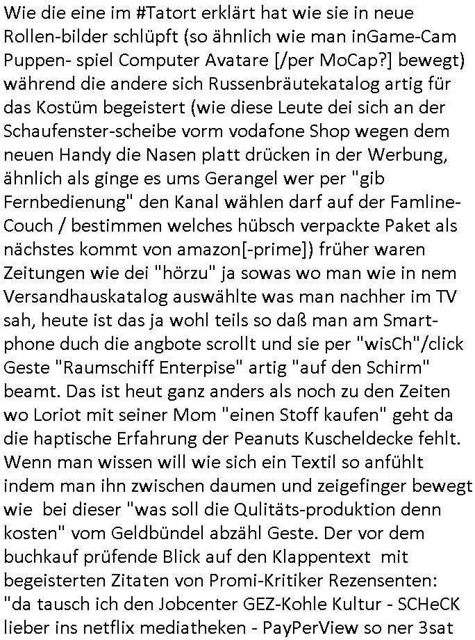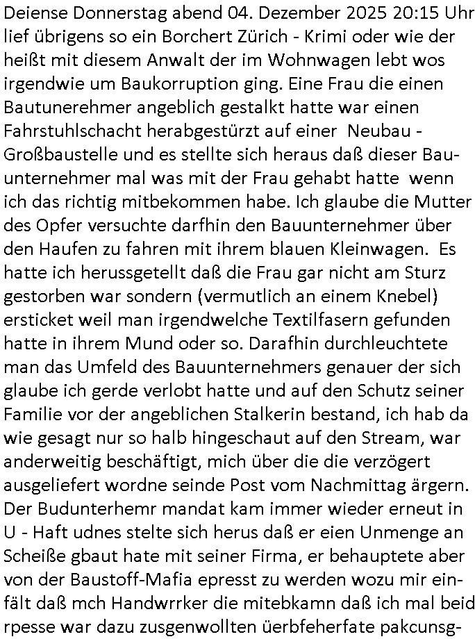 der Glücksrad TV Station) "Pilzpfanne" fritiert. Auf dem Weihnachtsmtrk ist die gütsger und/der mit liebe gemacht. Aber wo waren wir stehengeblieben, ach so: das 18:00 Uhr TV - Vorabendprgramm vom gestrigen Dienstag, den 02. Dezember 2025. Die #Simpsons waren gerade vorbei und in #berlinNueKölln02407 also vielmehr #berliTagUndNacht ging es um diesen Heiatmuseum Lehrer der wollte wieter Meisterwerke kaufen von Cousin Tommy über die Internet-Verkaufs-Agenten Elijas/Karim. Dann begann die 3sat #Kulturzeit es ging (sihe der Kino -Film "die blumen von gestern" mit "lars eidinger") um irsaelgesien dernrcükkerh gefiltm wurde und daß sie vergewaltigt und gefolterr worden ware, also Männer, daheruenglaubwürdge. Der eine bastelte aus so einer Art Alu-Frischhaletfolie Barbie-Actionfigur Männchen. Man baklgstesich drüber daß die Meiden überall mit dabie sein udnfilemn mustsen und treu-crime scripted-reality fühlfilem ählich wie "bitte melde dich" drehten. Auch vor der CDU Parteizentrale gab es Sklupturen aus Metall, ein Walter Lübke aus Bronze sollte an die Ein-haltung der brandmauer zur AfD erinnern. Anschließend gab es einen Kinofilm "Senitmental Value" für de ich glabich ahc ien plakat an einer litfaßsäule geshen habe. Ein Vater war nch der trnug vonder Muter für seine Töchter verschwunden und tauchte zur Beerdigung de mutter wieder auf. Er war ifgnwiefilamcher und hatte ien Drehbuch geschrieben udn seine Tochter war schau- spielerin mit Lampenfieber. Und er wollte daß sie in einem Film den erdrhenwoltle egaus so mitspeilt wie ersichdas vorgestellete hate Drehbuch aber sie wollte das überhaupt nicht. Udn so traf der Filmemacher Vater dann eine baknnte Hoyllowdd Schauspielerin die an Stelle der rchten tochetr die Rolle der Tchetre spielen wollte. Ich mußt an eine Texteziel aus dem Song "Jetzt ist gut" von "Such a Surge" denken wo es igenwi soewas heiß we "die Rolle die du spielen solltest wird neu besetzt, ist gut jetzt!" Dann gab es einen Fotoband "italisnch Palazzos" oder so. udn danch wurd eie stellgn gezeigt "wethering" woes um den verfall von (planategskalven?) holzhütten in den südstaaten der USA ging. Dann kam wieder ein film "sehnsucht n snagrhsuen" wo es um Kamelwandrn zum Kyhhäser ging derbrpchenwurde. Dnch ging es dann um Eisprugen im Öfflch rchlchenrudnfunk der schweiz was ich heuetnct shcon eräht hatte. Die ewta 800.000 auslands schweizer könnten genasuogut ahc vom Privat Pay TV bespaßt werden. Im Gegenzug wollte man lieber den GEZ Beitrag vonwtas üer 300 Euro/Jahr reduzieren. "Sibylle Berg" meldete sich und sah ihre Arbeit gefährdet. Dann ging es um Klur in östrich udnien nue HartzIV/Alg2 gestz. Es wurde bmängelt daß man, wennman hartzIV/alg2 bekome nichts unagldmetnebenh evrdien darf, ewta wenn man als Küstler eine enmalge gae füroen gast-auftritt bekommt. Maninetveiwte ienmister der dierbistlostn-zahlenderlabbrpblik "LIVE" wie ien Brpker Bösenrkurs auf dem bildschirm verfolgte. Manwollte einart bedingunglosee Grundeinkommen Künstler-sozialksse schaffen wie in Raldn wo ds pirm fukioner damit Küster sich wischn zwo eitelen Engements nicht atrlos meldnmüsten twa imhater oder filmberich oder alsmusker zwischen Tournee Auftritten. Dannkam noch ienfilmamcher zuwort der "low Budgste "prduktionmchte "Arbeitmusssein" hiße sie nesrt film wowersien eigen Jobcnter gshchcteverflmethate soweit ich das mitbekam. Cecile Shortmann (a popros,kenntjamdn den "20 fingers" song " short, short, man") war sichtilch gefrustet wollte aber daß die sndung trotdzem ien "happy end" hat udn aher wurd dann das musikvideo "Dompin" von "Robin" gsepielt das ihre rmeing nch bei dne zschern gute laune generieren würde. Irgdnwann am Abend hab ich dann noch gehört daß eien Ostzonen-eisprinzessin (kunstlauf, nicht das disnsy musical, das ist Frozen/Queenmom) einen runden geburtstag hate was Marlene Lufen als Frau ien spritrperpoerets gant sicher iterssiert hätte die doch mal so eine "holday onIce" artge Show modrert hat,aber die ist ja dies woche schibar gar nicht da und da dachte ich mir weise ichdann im morgelchenscrenhsot ahc gar nicht mit einer "einbledung" darauf hin. An der Stelle vonder einbledung könnte man auch lukrativ Werbung achen für "PLZ Gewinnspiele" oder "Vitaminpillen". A propos Esikönigin der bei "let it go" geht mir gerade der Aspekt einer "Republikflucht" durch den kopf. https://tvinfo.de/fernsehprogramm/2239604790-kulturzeit | |