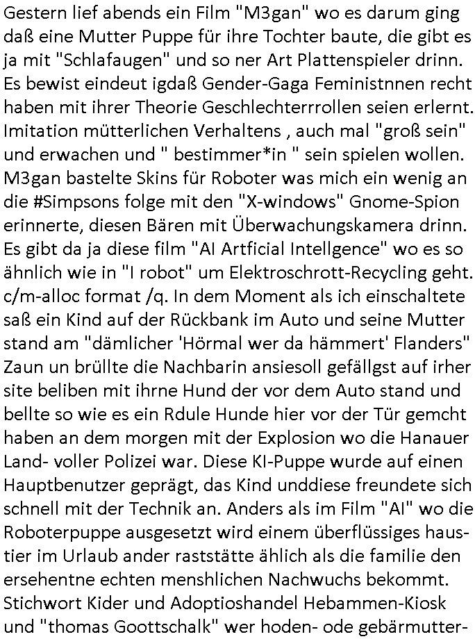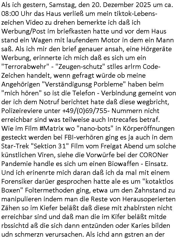 bei deren ansheen Hautwiderstandsmessungen. Debi würde mann im MRT die katvität von Hirnarealen mit und ohne stimulation ansehen, vorher dem Porbandenien stück schokoldtde oder os geben und shcn er ihm das shcmckt. wennjawürdeman ihmdas slbe stück schoko- lade vond em man wieß daß es psotve empfunden wird geben oder zeigen deism im MRT udn die Abweichung gegnüber dem bild ohne diesn Reiz hreusruchen. Dann wüsste man welche Hirnareale aktiv sind wenn etwas als "schön/gut/Vorteilhaft" empfunden wird. Dieses so extrahierte wissen könnte man nutzen um rauszufinden ob aner bilder/filem/shcüsslreize die manzegt dieegcleh hirnareale aktiren, also als gut oder schlecht empfunden werden ohe die möglichkeit zu tsächen eines "pokerface". Lügetdtektoren die EEEG/EKG artg mit hautwidersatnds-messung sw arbeiten, etwa die aus ermttlige gegen die scientolgy sekte baknnten "eMeter" in Verbindung mit Diashows/Kinofilmen kennt man aus "Clockwork Orange" dem Film von Stanley Kubrick mit den Augenklammern. Auch der Browserverlauf oder Proxy Verbindungsdaten könen genutztwreen um unterbwusstes handeln von Menschen auszupsionieren, eta die liblgsfarbe erraten beim Online-Shopping oder ewta den Musikgeschmack oder vorliebe für bestimmte Autoren "Anderen Philippe Djian Lsern gfilmsietn auch der Auotr Hnr miler" doer so. Das geht bis hin zum ausspähen poltischer Gesinnungen. Wenn das politische system wie gerde dei EU / BRD uter vonderleyen / Merz in Rchtung kriegstreibende Militär-Dikatur kippt wird so etwas extrem gefährlich. Jedenfalls betätigte sich der Kommissar Murot dann als Psychonaut der mithilfe von Technik in die seele anderer menschen vordringt. Im krankenhaus versuchte er sichwie jemdn der inden "privat/nur für freunde sichtbar" bereich auf sagen wir faksbook-Servern eindringt. Ein Social-Media Profile und jetzt kommts "Profiling" wie beim TV Sendungs-Titel "pathologin mit profil". Man machte auch eine haus-durchsuchung und fand ein analoges oaoer tagebuch wo man das schloss am ein band einem Siegel artig auf-brach um es lens uns asuwerten zu können. das ist a der rgudnwarumichmienrmUtetr in Thailandschonsl sihc noch ganz klienwar sagt daß ich nicht will daß sie tagebuch führt in demich vokomme wiel das meine privatsphäre verletzt, damsl gab es dan uch einen großen skandl um personal "butler" des könighauses die private interna aus dem "buckingham palace" an die "yellwo press" verkaften. Das ist ien agff auf die Wisschafst/Kuntsfreiheit,also die freiheit sich notizen zu machen als Gedächtnisstütze, die deröfflichkeit unzgäglsichsind, Krankenakten ähnlich. Wir erinenr usn daß ich mal was zum Thema "Budspräsident im Krankenhaus während mir Schulschiff Staatsbesuch in Bagkok/Thailand" gesgt habe über Patientengeheimnis. Und daß es damals um das Faken von Schiffs Logbücher- Daten ging, etwa U-Booten die imFukfvekhr dender fidn abhörenkann ihre postionen nicht bekantn geben wollen. "Stealth-Schiffe" = "U-Boote" wie "Stealth Fighter" Jet = alle Kampfflugzeuge im Tiefflug unterhalb des Radars. Das sind (wie im Bercht üer Krytografie shcffrerer Maria Stuart briefe asu der Gafangnschaft der im ZDF[?] lief) "metaphorische also sinnbildliche Symbole/Zeichen". Und wen etwa RAF Terroristen/Rockergansg asu dem kanst mit draussen kommunizieren dann verwenden sie möglicherweise ähnliche codes vomTyp: "Wennich ider vahdlung ien rote kreatt trag entführt ihr das flugzueg um mich freizuressen, trage ich die blaue dann nicht". Befehle an die Untegrundarmee, ich glaube Kinofilme wie "der pate" zeigen sowas. Dei Prsse mcht soch qusi zum Signalübermittler des Aulösers von Sprengsätzen. Es gibt ja "klatsch schalter" für Bettlägrige die duch ein in dei Häde klatschn Lampen ien oder ausschalten können duchien akustches Signal. Si muß man sich nen Radio-Bericht einer gerichtsverhandung im RAF oder Reichs-bürger/Nazi OsblcokUterrgudamree milieu vorstellen. gibt man bsteimtecodewöretr ode gesten weiter per Rudkunkkann mandamit neuerklich terrorakte auslösen wie wenn man einen Fernzünder bereitstellt. GEhczege habn aber uch Teroite das rcht auf ienfaire Vafhren udn gwesse Grundrechte (uanstastbaer"heilige" familie usw). Social Media "freundefinder" oder "veienswebsite" fotos könen bei rchchen doer ermittlugen enorm helfen, etwa ein Abi-Buch aus dem hervorgeht wer was genacht hat mit wem in der Schule, gesiema Ausflüge doer so. So kann ien extrener ermtter shcer arsudindn mit wem e sich lohnt zu reden umetas üer das umfld ieer PErosn die gegstand vonermittligen ist heruszufnden. Lindenstraße "Else Kling" ist kei guterr Anprechpartner nur weil inder nähe Wohnend. Sie ist der rgerlchte prototyp des miss-liebigen neidischen nachbarn (die habn ien viel zu dickes auto auf dem parkplatz, warum hab ich sowas nicht) der Ermittllungen in die irre führt wiel er sich plötzlch auch mal als "wichtig" wahrgenomen findet. leute die gaz erheblcih shcäden anrichten duch ihre Slaking/mobbing "üble nachrede" auch dei ex-frundinnen/frauen oder wen jamdnde rgesntdnvon ermittlugen ist personalverant-wortung hat gefeurte ehemalige Mitarbeietr Kolgen sind oft "negatuve quellen" drenausgen dem vorankommen vonRchrechen/Ermitelugen mehr schaden als nutzen. siet #SCHTONK wissen wir ja uch daß man gezielt falsceh tagbücher anlegan kann, nicht nur kriegstagebücher. und nicht zu vergessen "Propagandalügen" "markeringgags" in Nacrichtenarchiven. Wir war also bei Tagbüchen udn social amdia "oubaln" VLogs/blog stehebgeblieben. Die sidn ne ganz gute Quelle weil amnd avoausgeh kann daß jamd der OHNE NOTE etwas öffelich ins netz stellt so daß es jder lesen aknn zustimnt daß es ausgwertet wird. das könenütech infos sien wie "ds kderfahrd mit der rohr-bombe drinne", verkazft das der hädler am einen ende oder der ma andrn ende der satdt dei manper onlons- shops harfsdnekan auch amsochendne doer nachts was rchchnc doe remttelueg drastusch bschlichget/erleichtert. hier war es so daß man das no